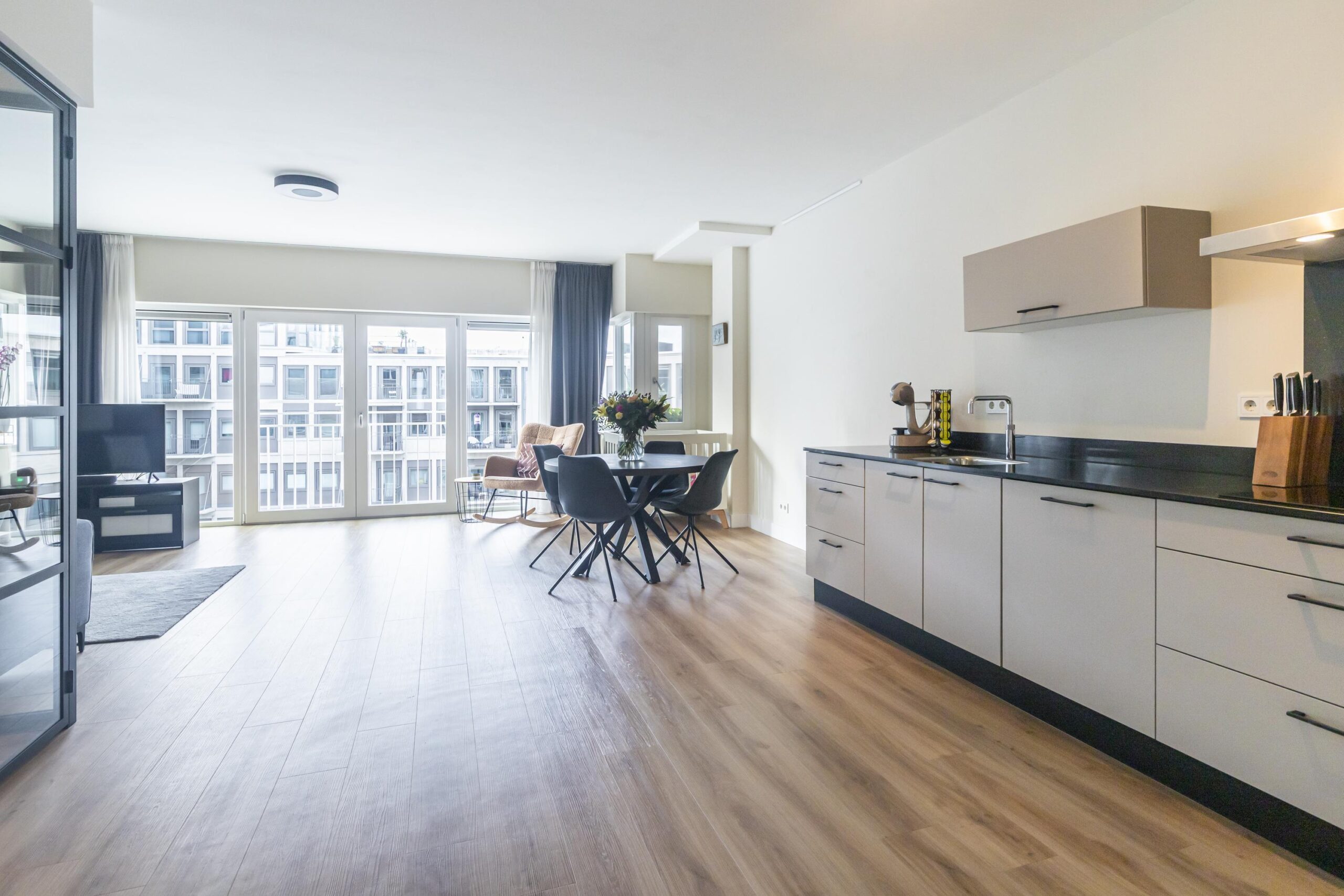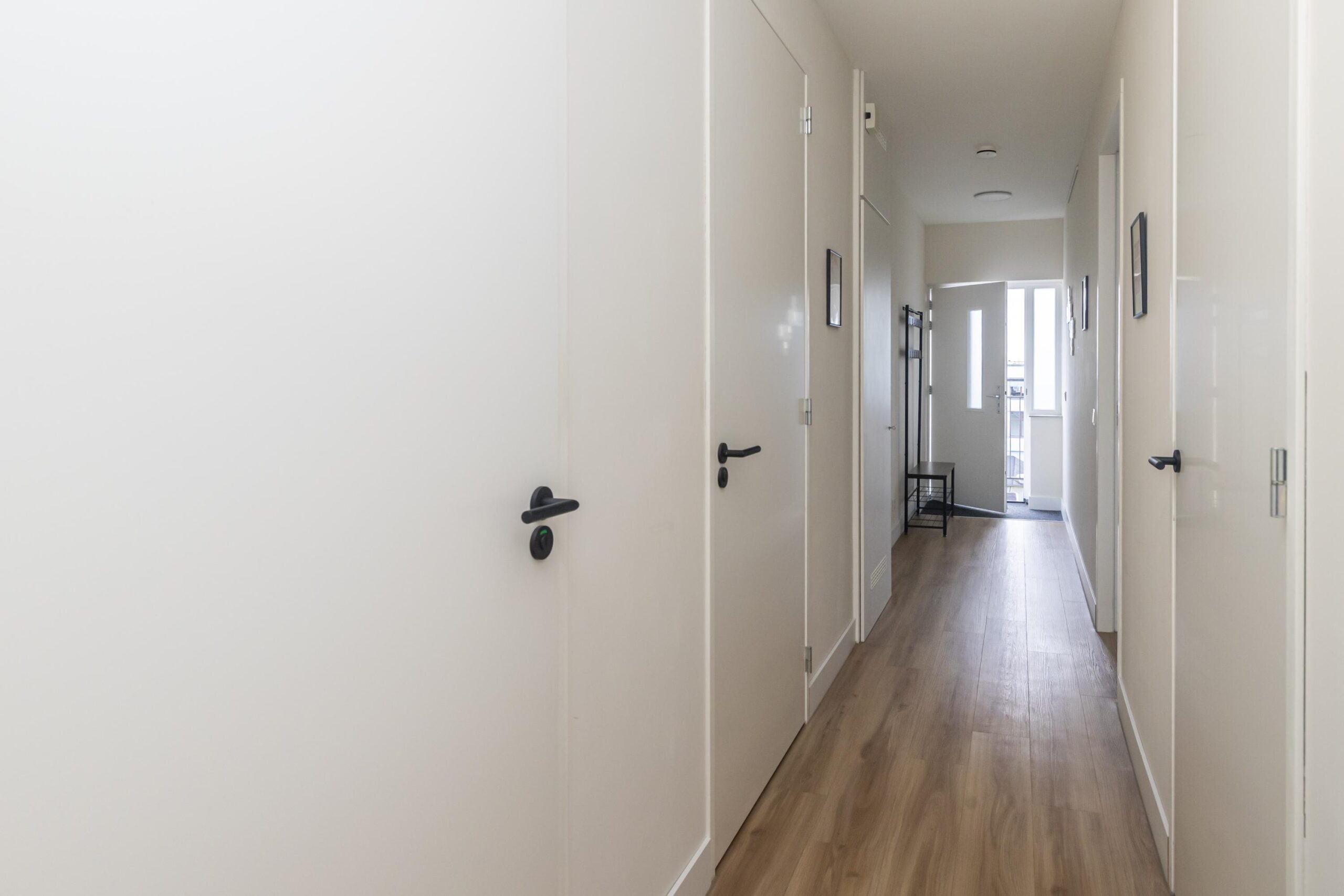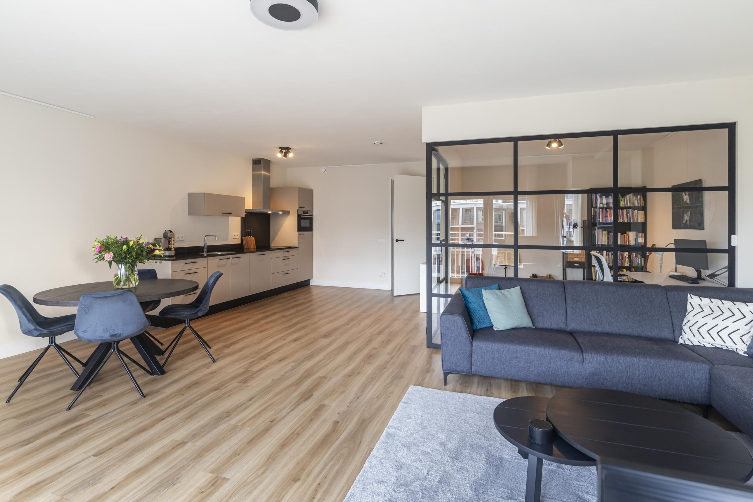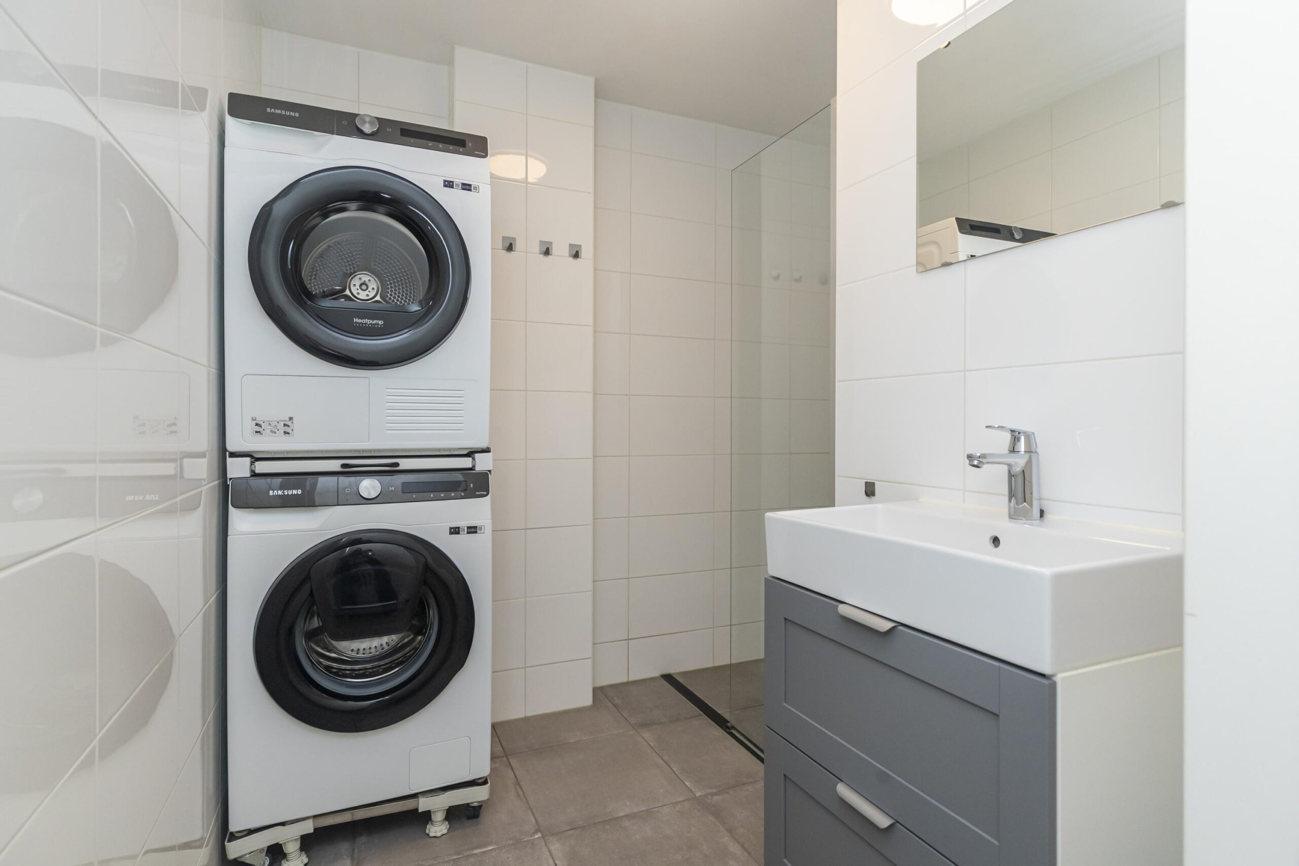 De ruime hal geeft toegang tot alle vertrekken en herbergt tevens de meterkast. Aan de voorzijde bevinden zich de royale hoofdslaapkamer en de tweede slaapkamer, die toegang biedt tot de C.V.-combiketel (Remeha, 2020) en de mechanische ventilatie-unit met vochtsensor. Het separate toilet is voorzien van een fonteintje, de moderne badkamer beschikt over een inloopdouche, een stijlvol wastafelmeubel en aansluitingen voor wasmachine en droger. Daarnaast is er een ruime inpandige berging met elektriciteit, ideaal voor voorraadopslag of het plaatsen van een extra koelkast of vriezer. De royale woonkamer geniet dankzij het op het zuidwesten gelegen Franse balkon van veel lichtinval. De luxe open keuken is uitgerust met hoogwaardige inbouwapparatuur, waaronder een combi-oven, vaatwasser, 4-pits inductiekookplaat, RVS recirculatiekap, Quooker en een koel-vriescombinatie.