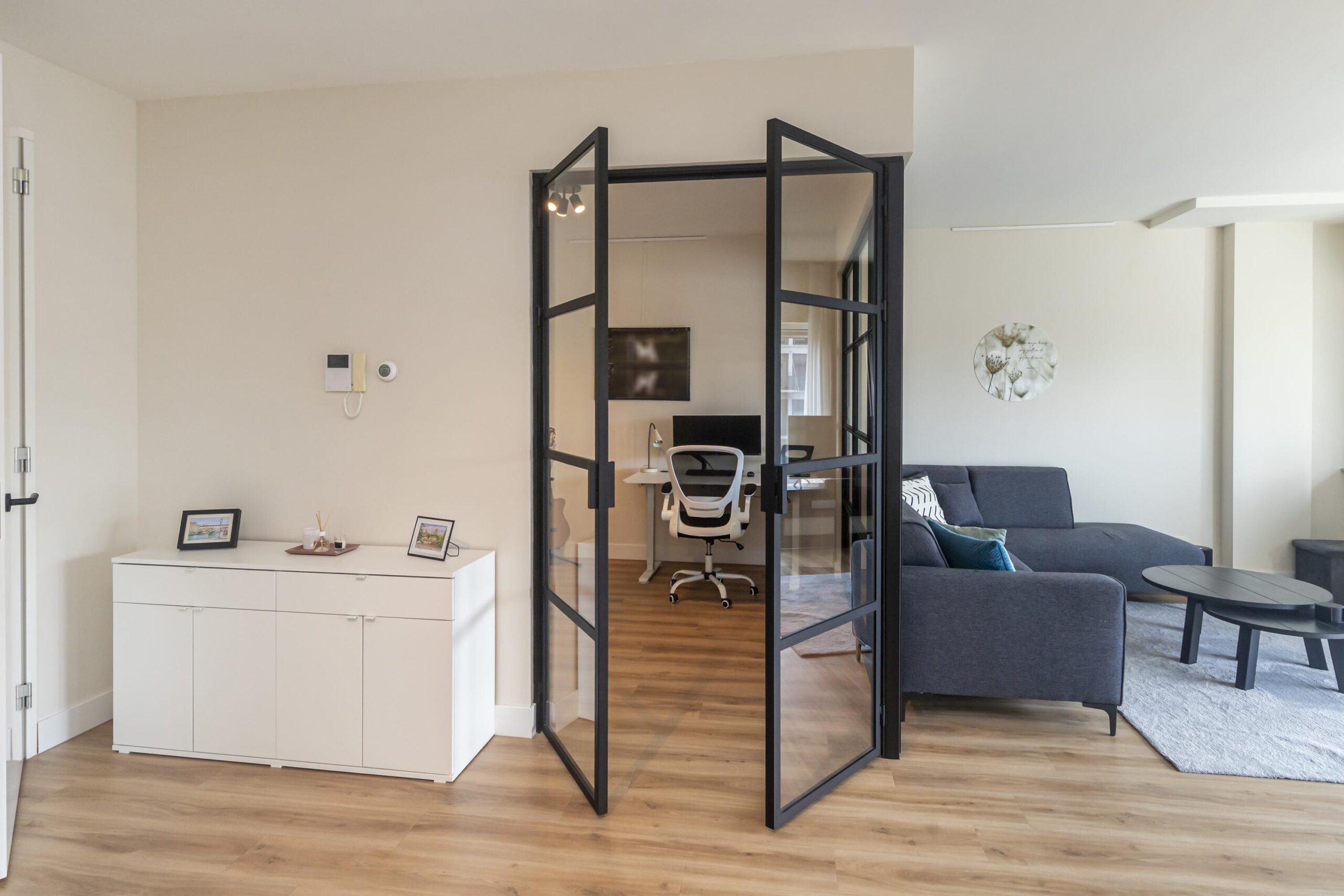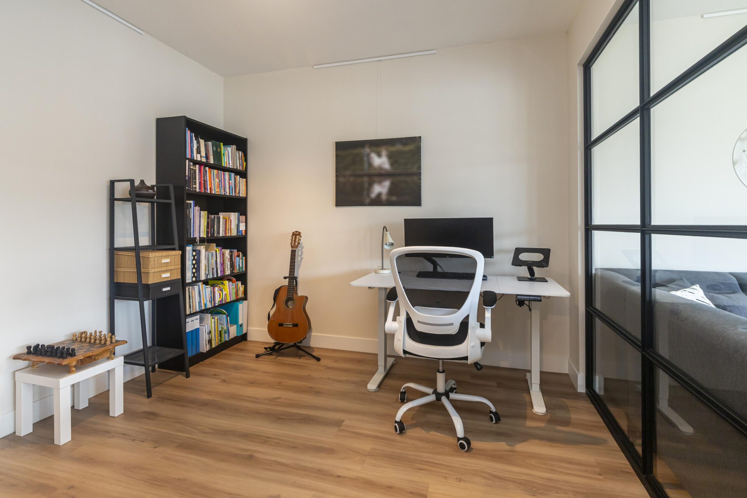 De werkkamer, voorzien van fraaie matzwarte stalen kozijnen, zorgt voor een moderne industriële uitstraling en biedt een prettige plek om vanuit huis te werken.
