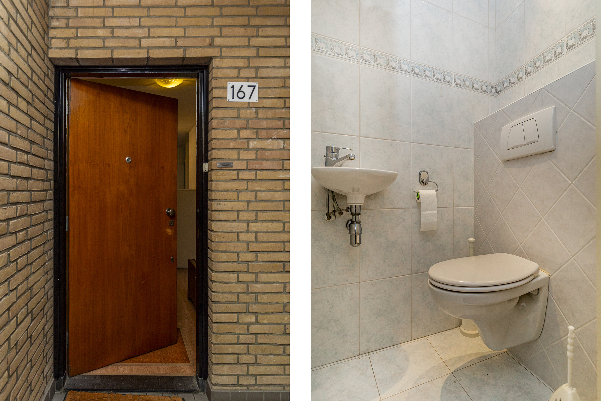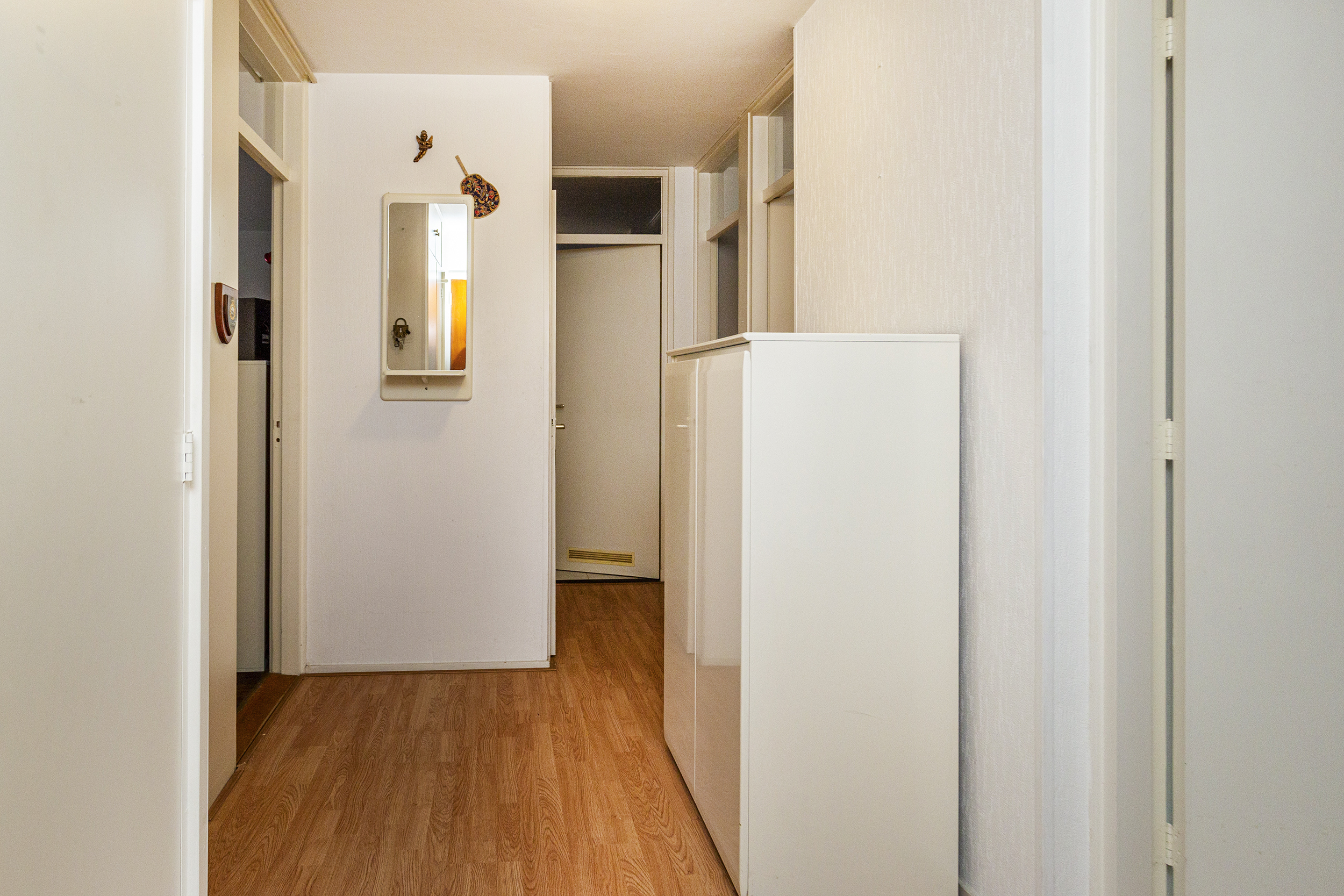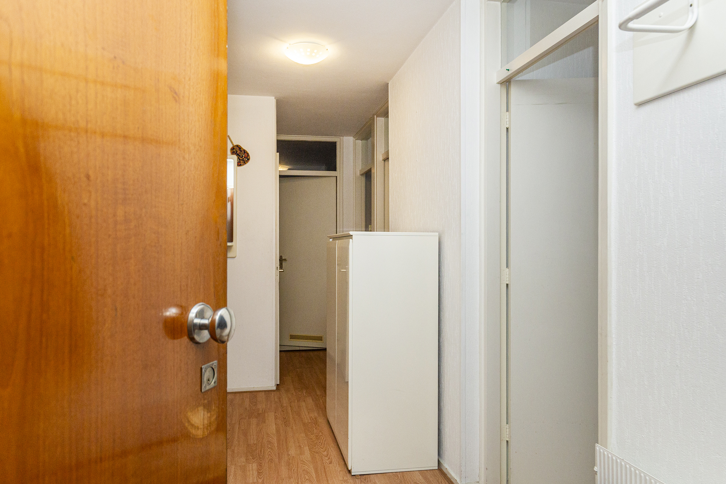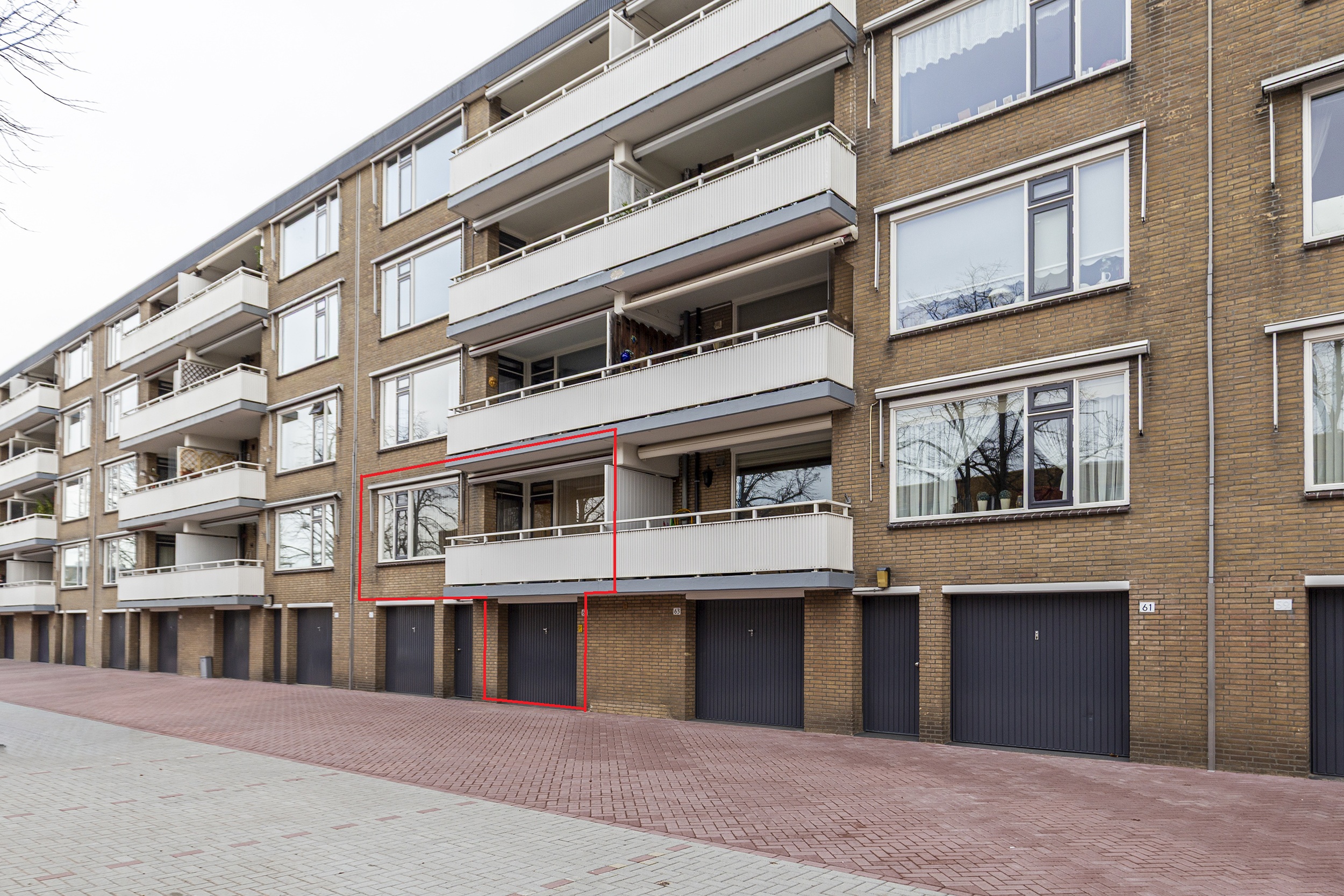 Op straatniveau is de centrale toegangshal met intercom en brievenbussen. Van hieruit kan je met de trap of met de lift naar de eerste verdieping. Hier is de entree van de woning. Achter de voordeur kom je in de hal die de verbinding vormt tussen de drie slaapkamers, de badkamer, het toilet (zwevend closet met fonteintje), de keuken en de woonkamer. De woonkamer heeft een deur naar het balkon en staat ook via een deur in direct contact met de keuken. Op het op het zuidwesten gelegen balkon geniet je van vroeg in de middag tot in de avond van de zon.