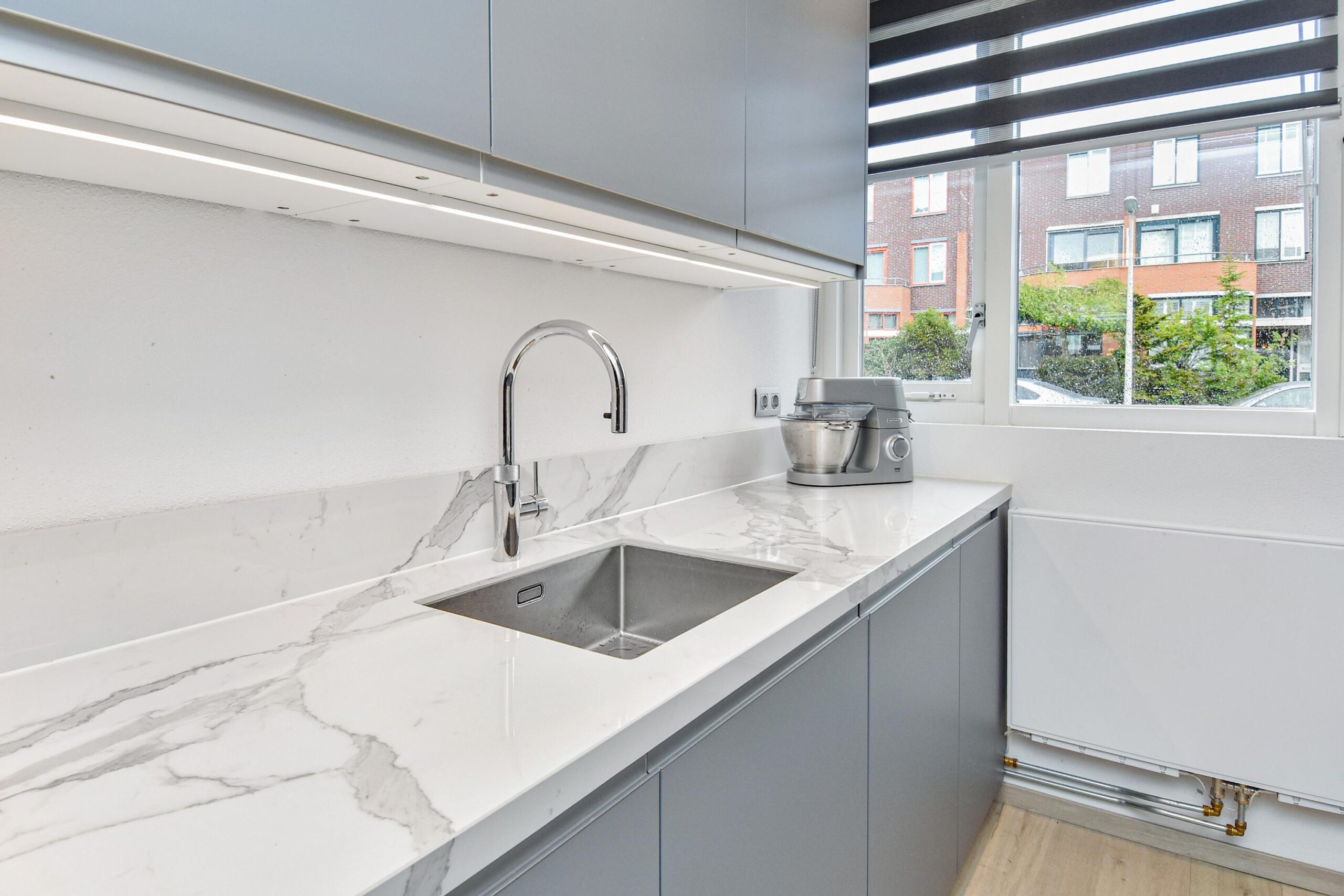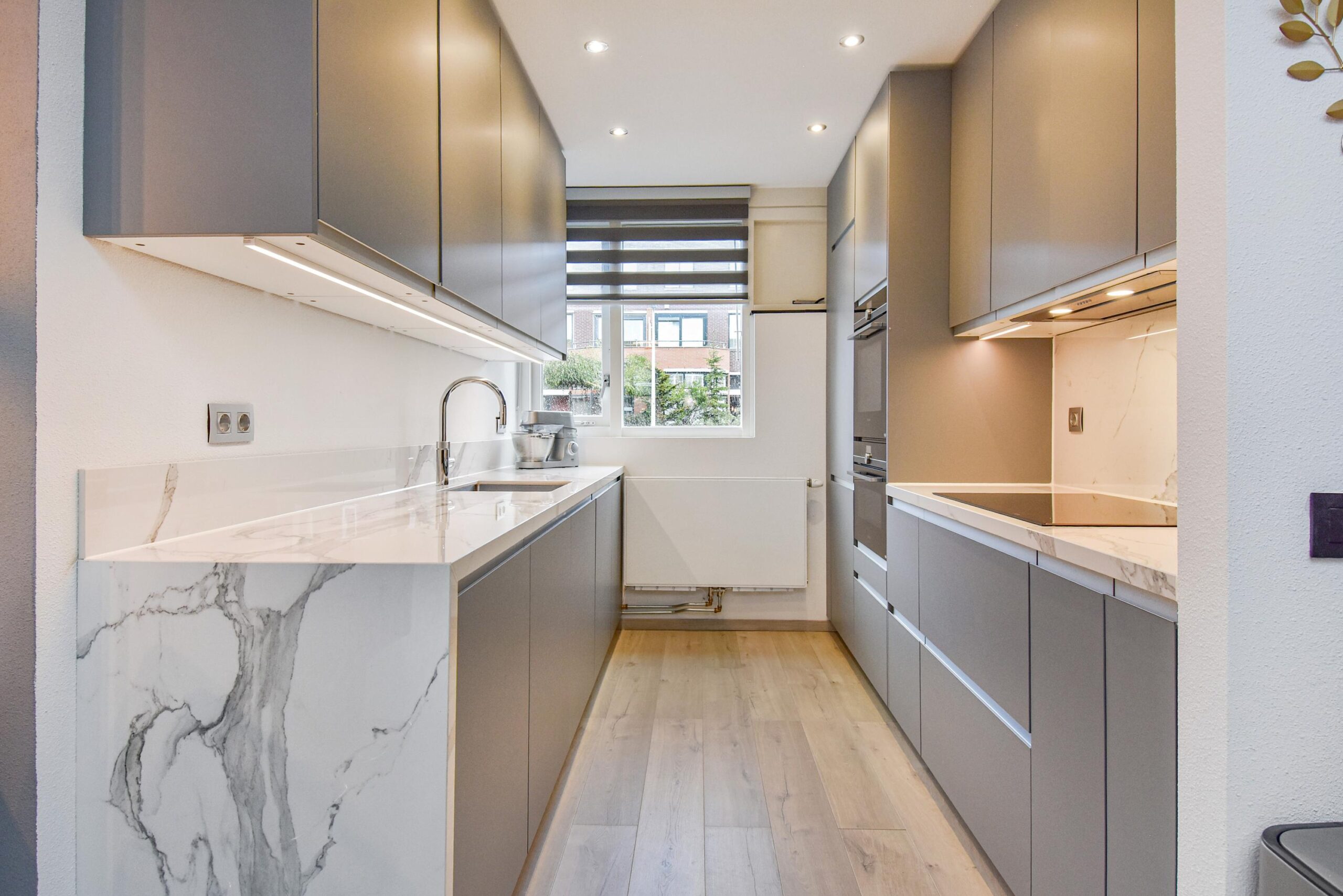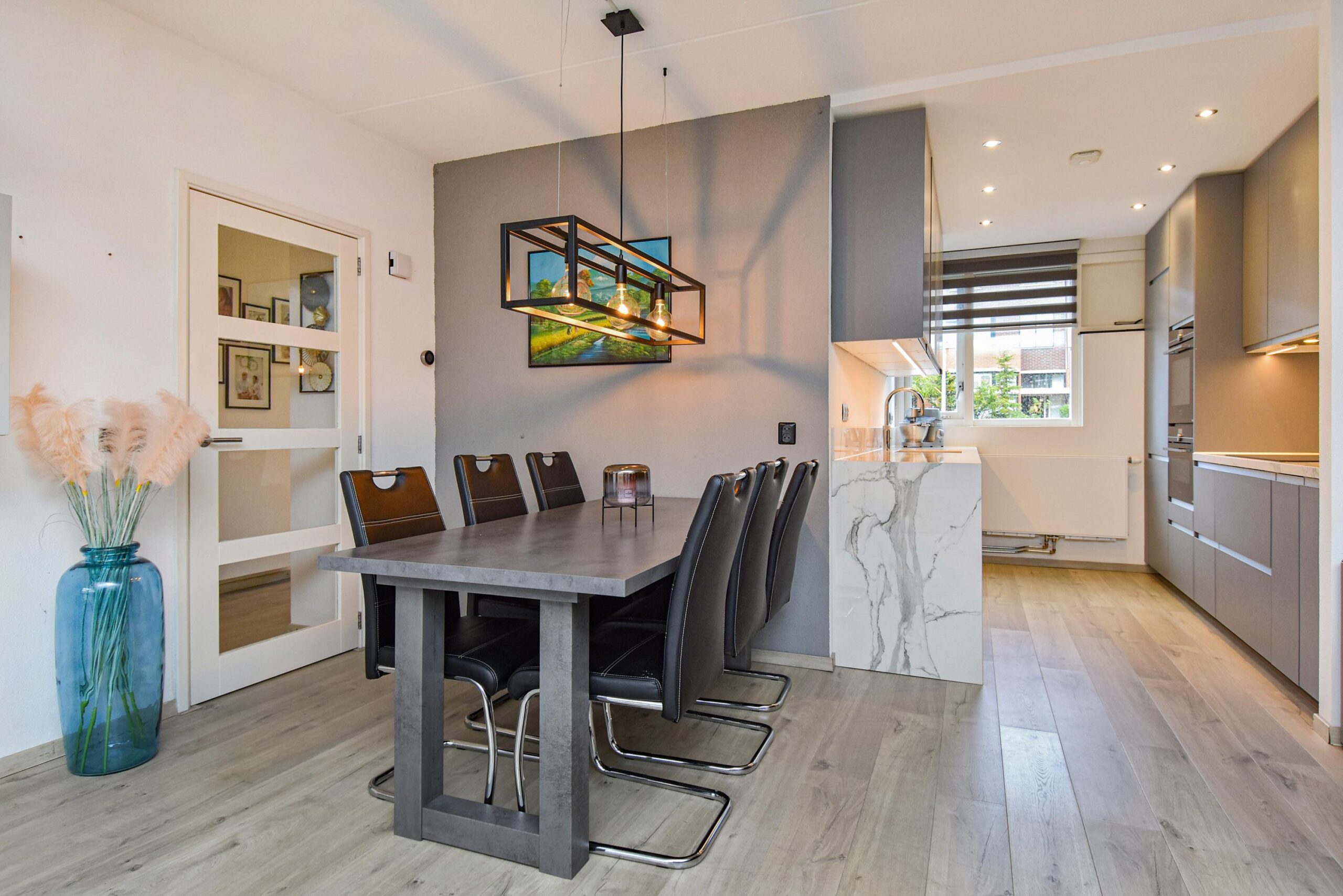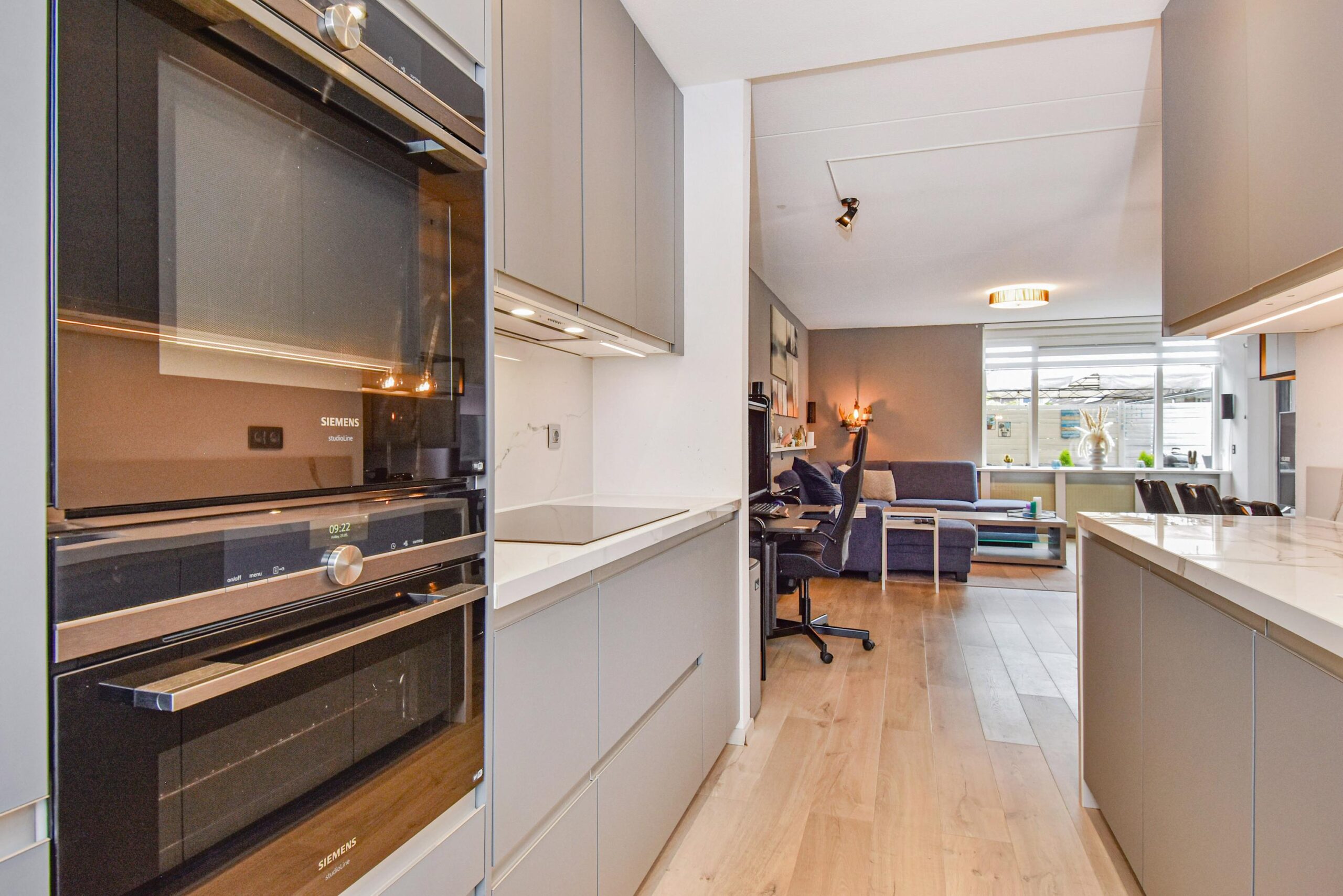 Wanneer je doorloopt betreed je de tuingerichte woonkamer , een fijne leefruimte voor zithoek en eetkamer en via de grote raampartijen zicht op de tuin. Aan voorzijde is de moderne open keuken (2024) , die perfect is geïntegreerd in de ruimte. Deze is volledig uitgerust met inbouwapparatuur zoals een Quooker kraan, inductiekookplaat, oven-magnetron combi, (stoom)-oven, afzuigkap, koelkast en vriezer. De keuken heeft een eigentijdse uitstraling dankzij de matte lichtgrijze kasten en het chique keramische werkblad met marmerlook afwerking.