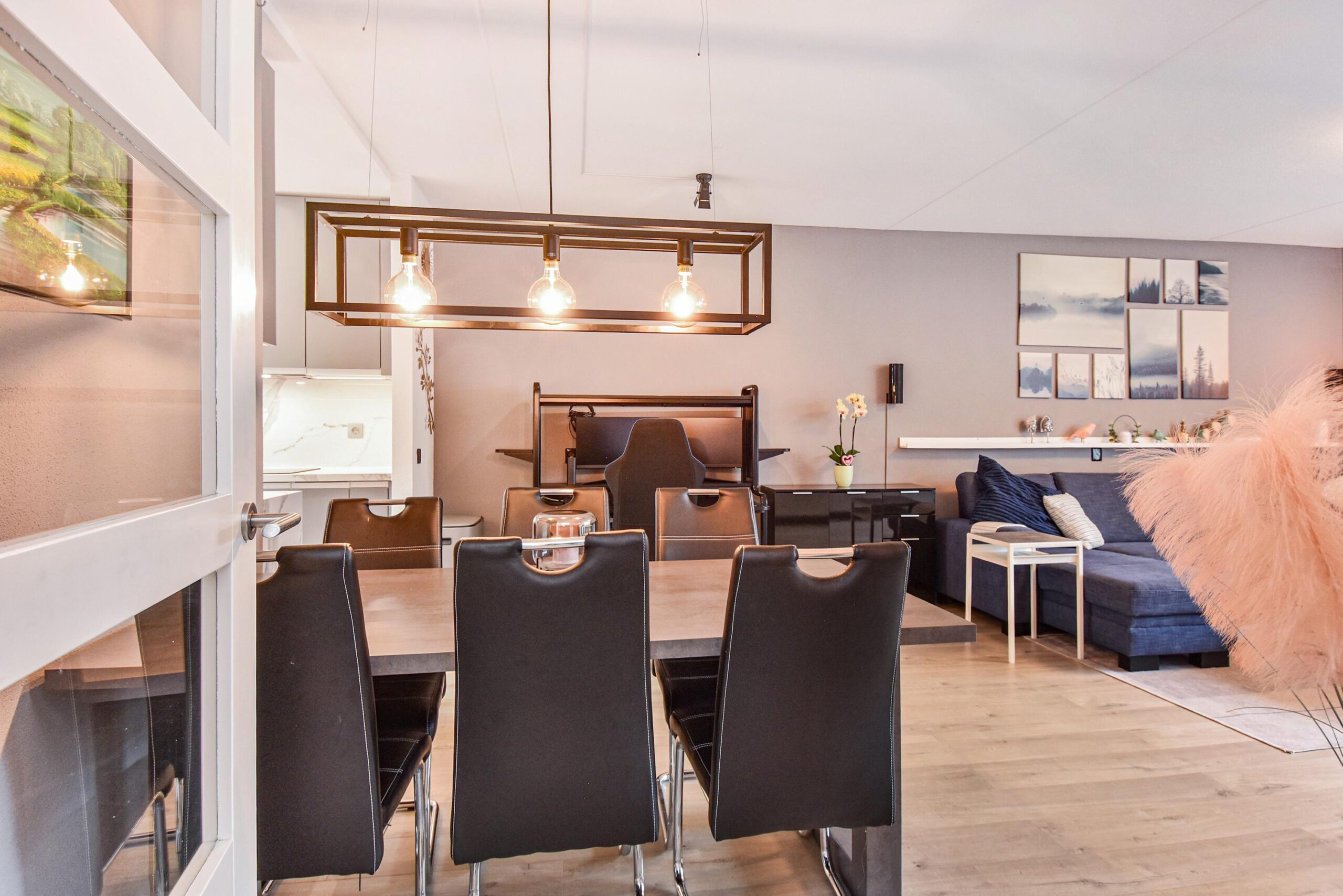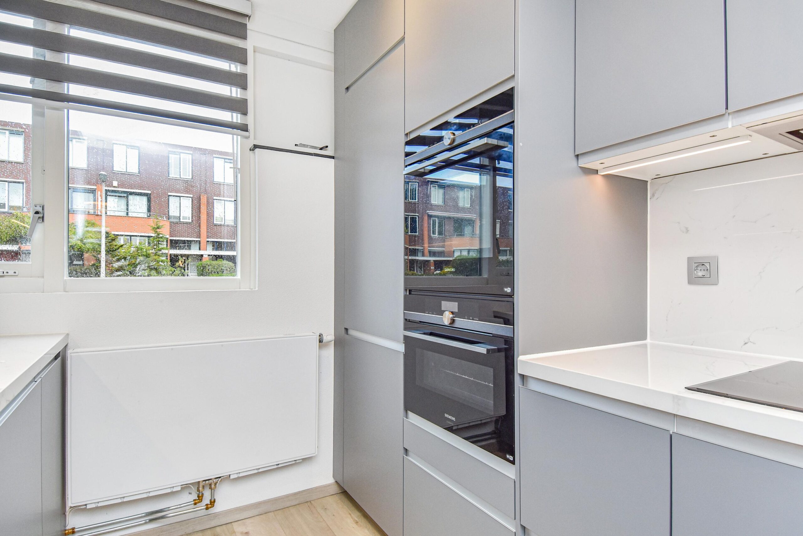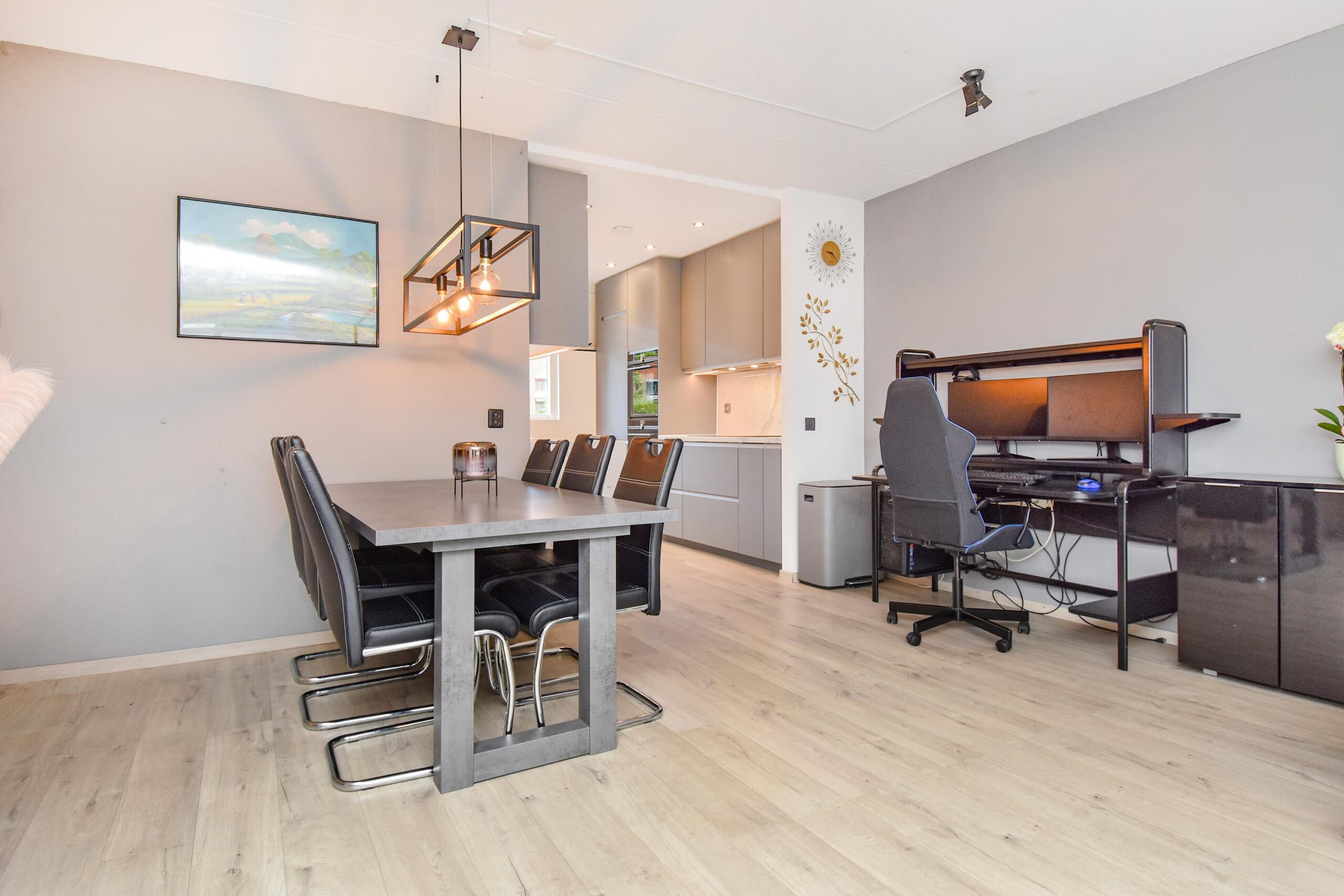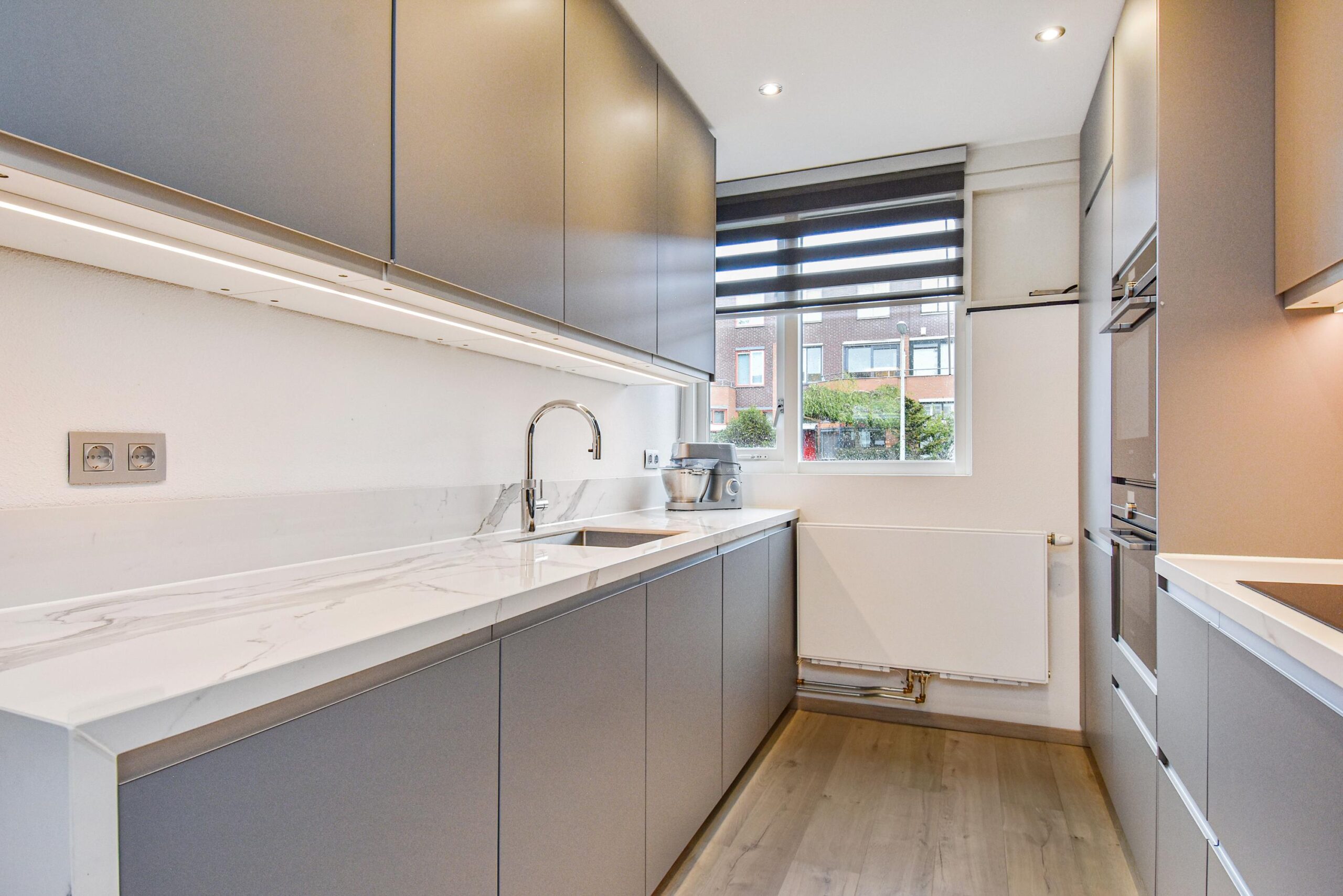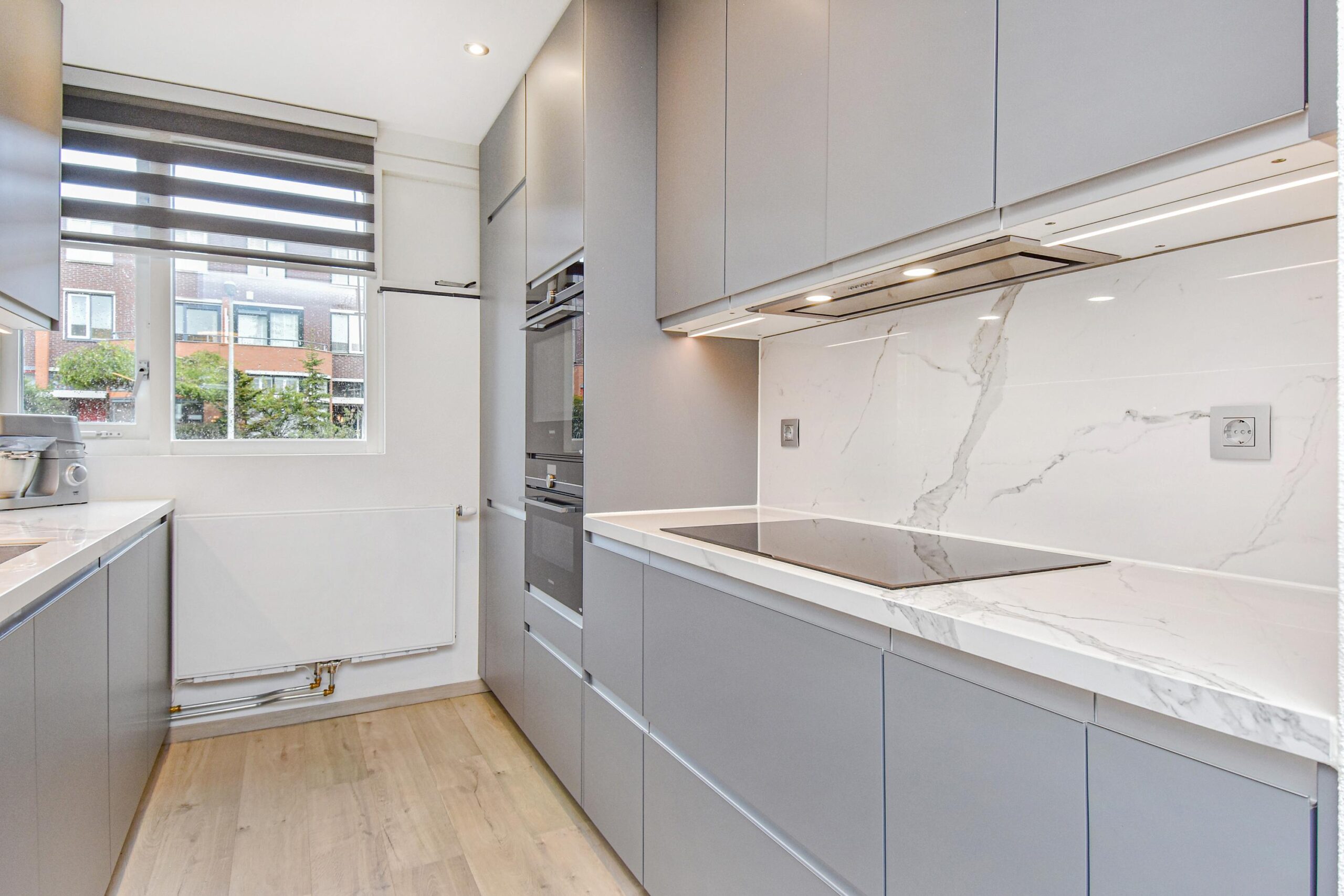 Wanneer je doorloopt betreed je de tuingerichte woonkamer , een fijne leefruimte voor zithoek en eetkamer en via de grote raampartijen zicht op de tuin. Aan voorzijde is de moderne open keuken (2024) , die perfect is geïntegreerd in de ruimte. Deze is volledig uitgerust met inbouwapparatuur zoals een Quooker kraan, inductiekookplaat, oven-magnetron combi, (stoom)-oven, afzuigkap, koelkast en vriezer. De keuken heeft een eigentijdse uitstraling dankzij de matte lichtgrijze kasten en het chique keramische werkblad met marmerlook afwerking.
