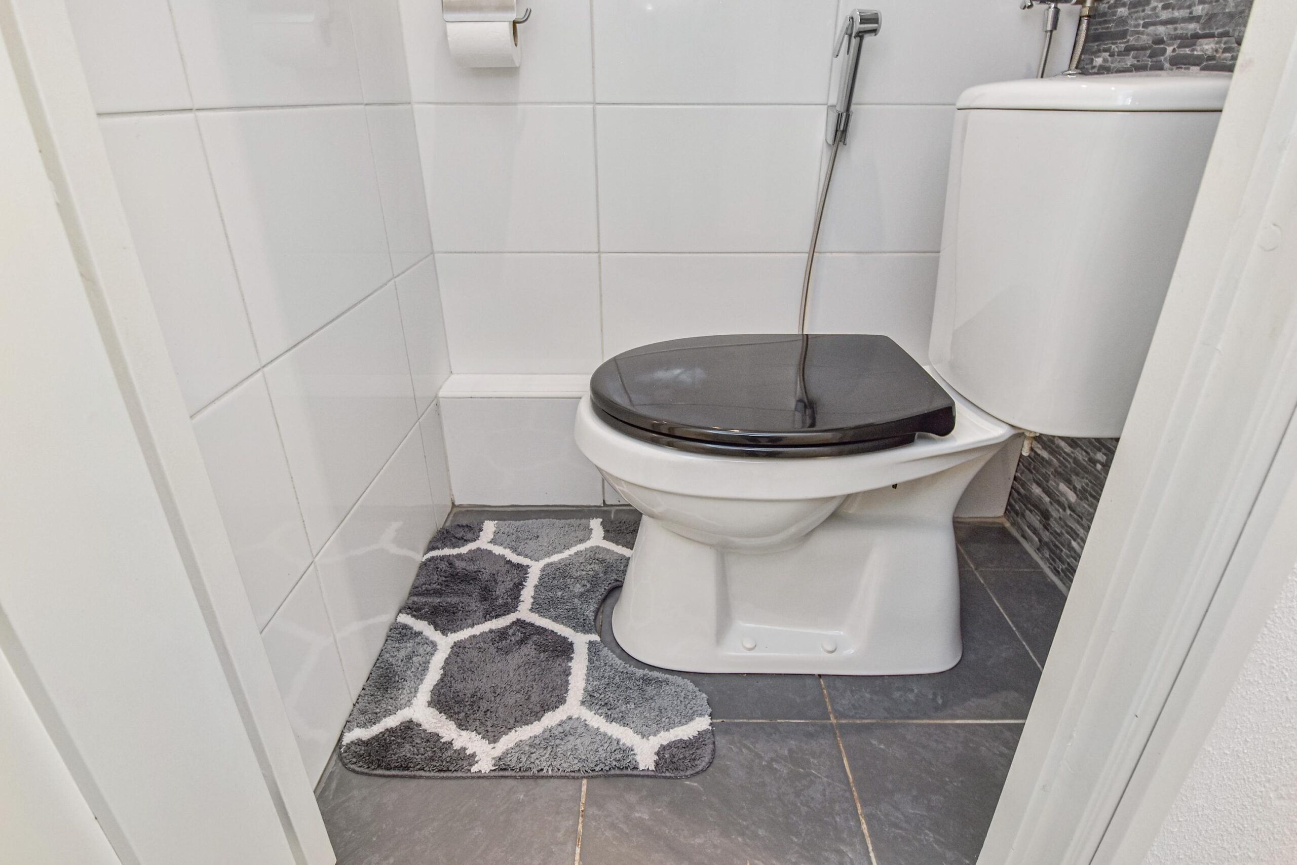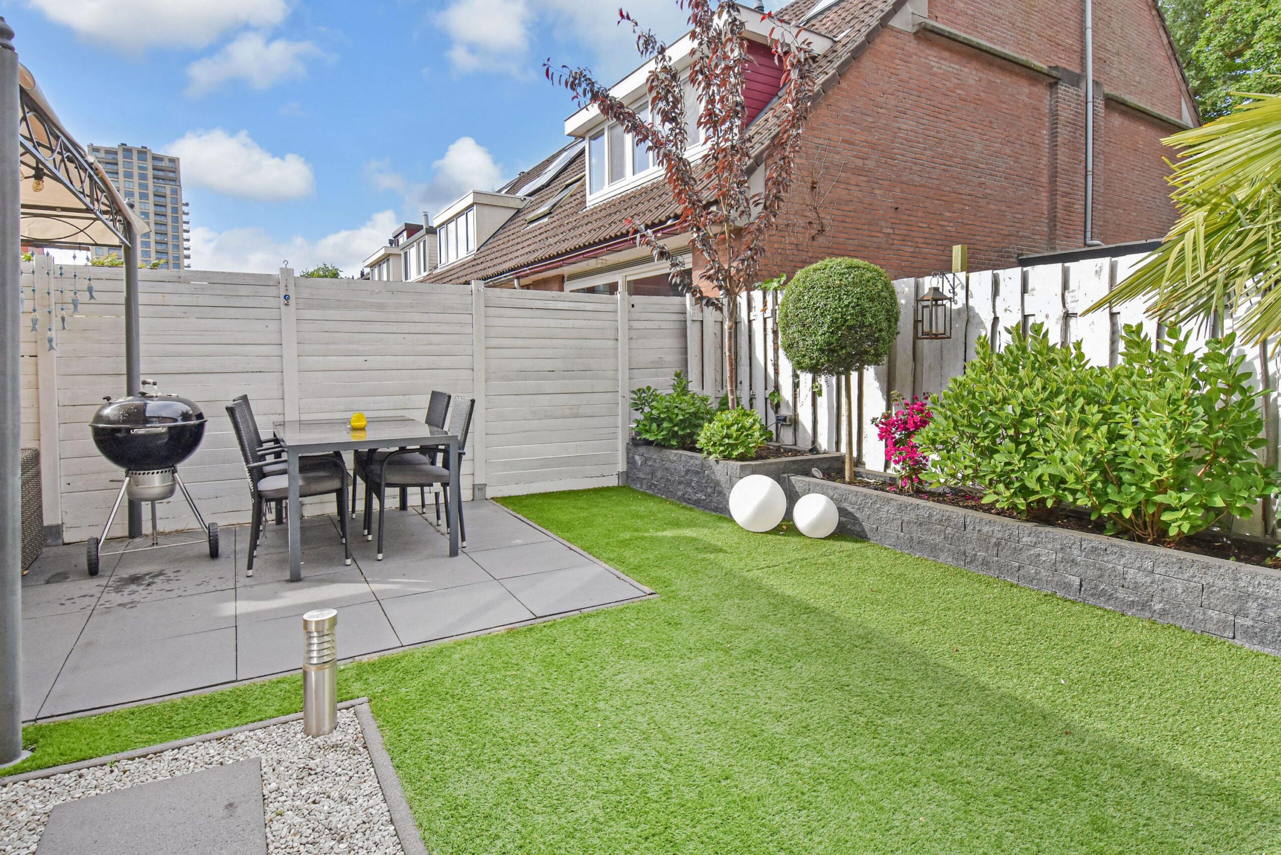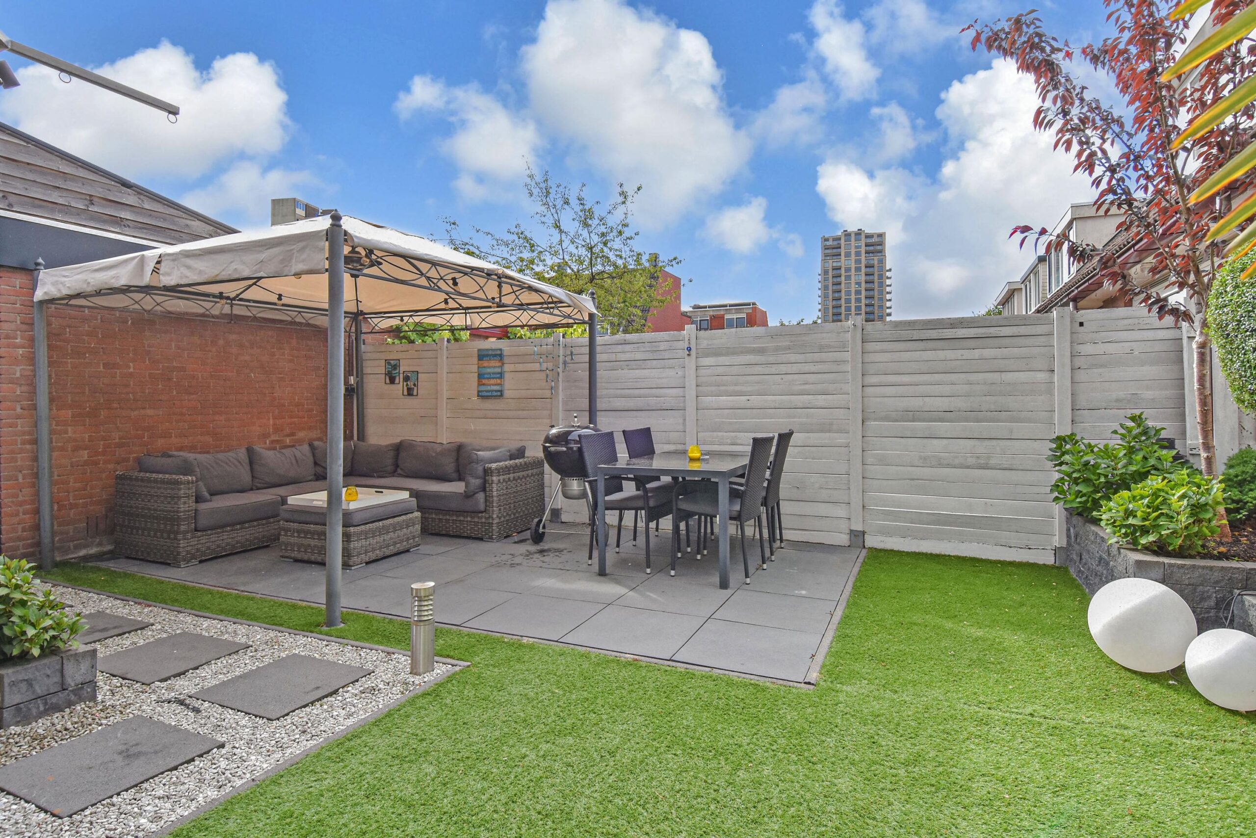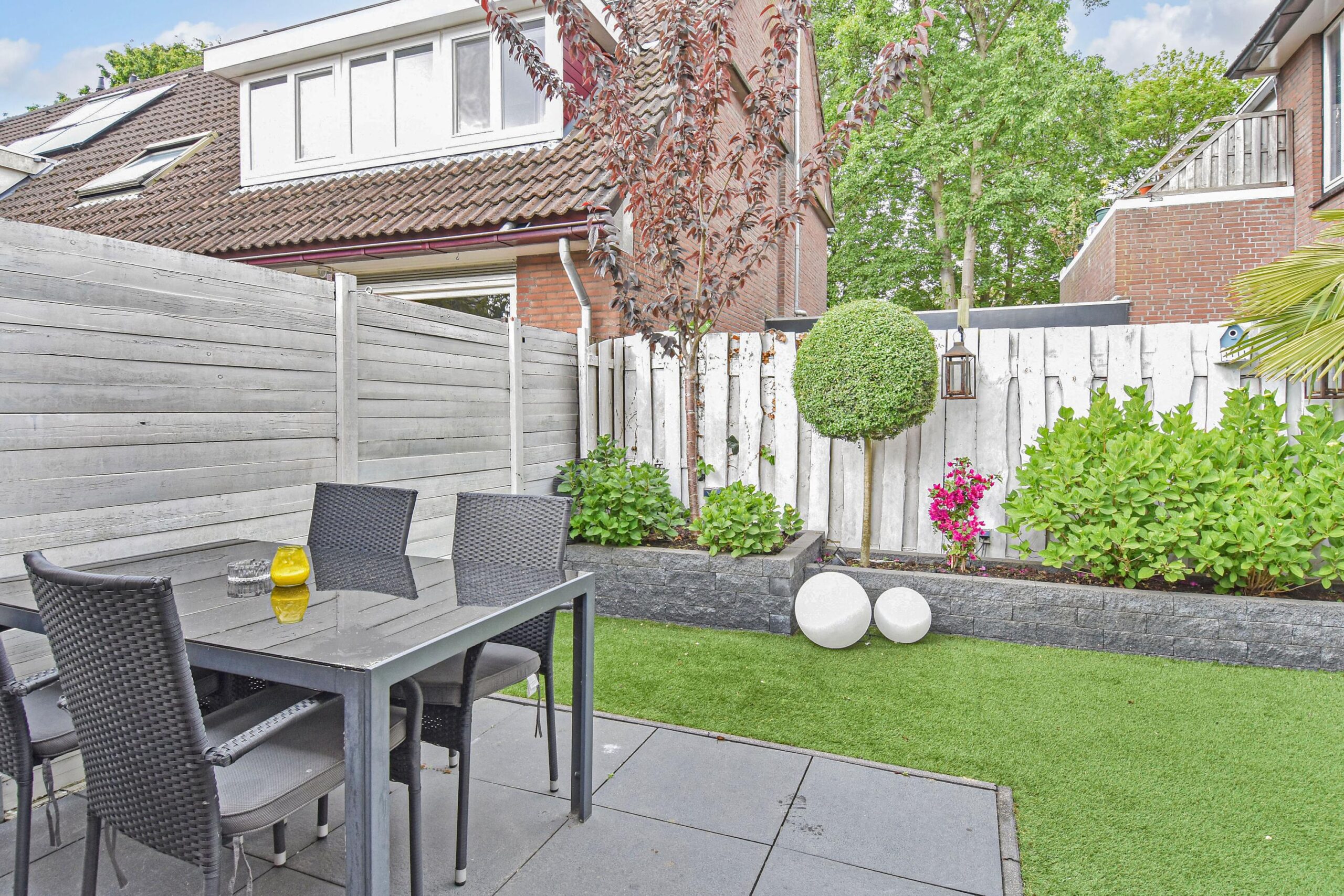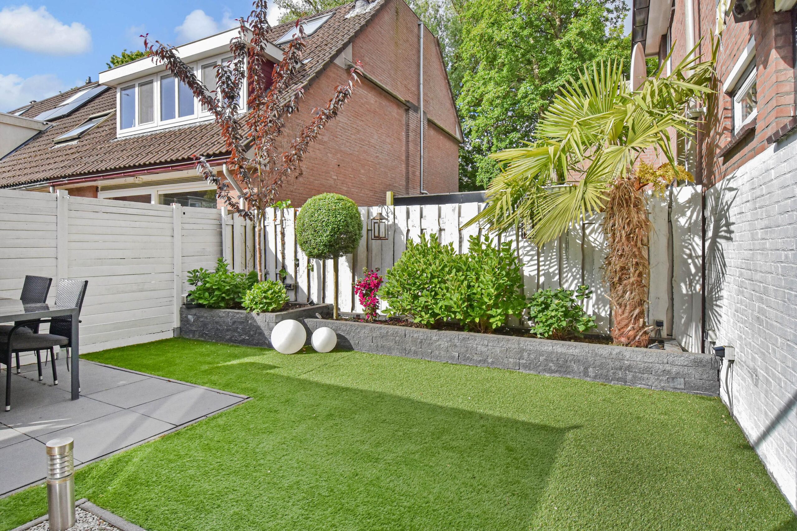 Vanuit de woonkamer stap je zo de keurig aangelegde tuin in. De combinatie van kunstgras en grote tegels zorgt voor een onderhoudsvriendelijke en strakke uitstraling. In de tuin vind je een berging, bereikbaar via het betegelde pad en met doorgang naar de straat, eigen toegang. Daarnaast is er een gezellig hoek ingericht als zitgedeelte: perfect om van de zon te genieten of buiten te dineren. En door de ligging is er zomers de gehele dag, tot eind van de middag de zon in de tuin