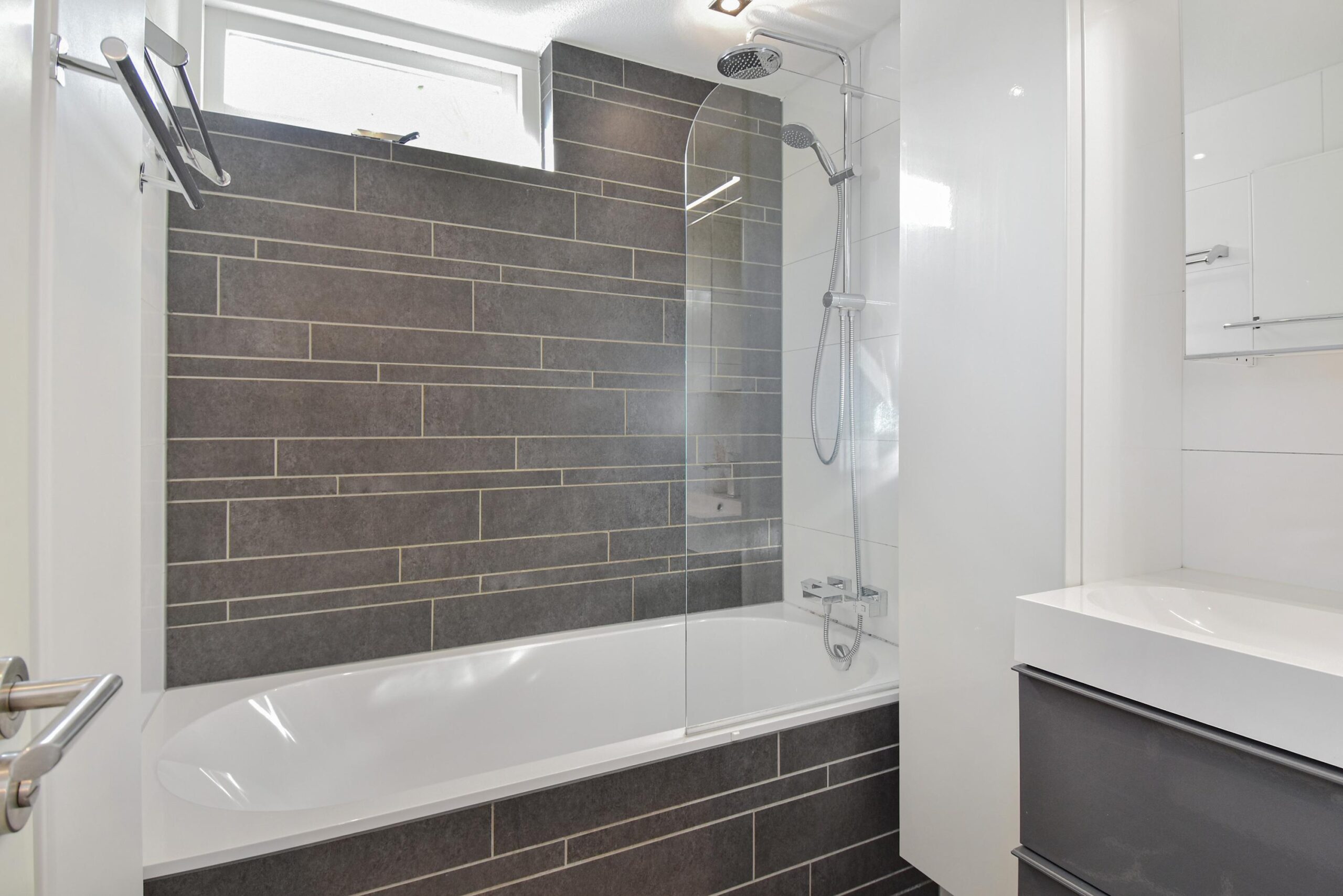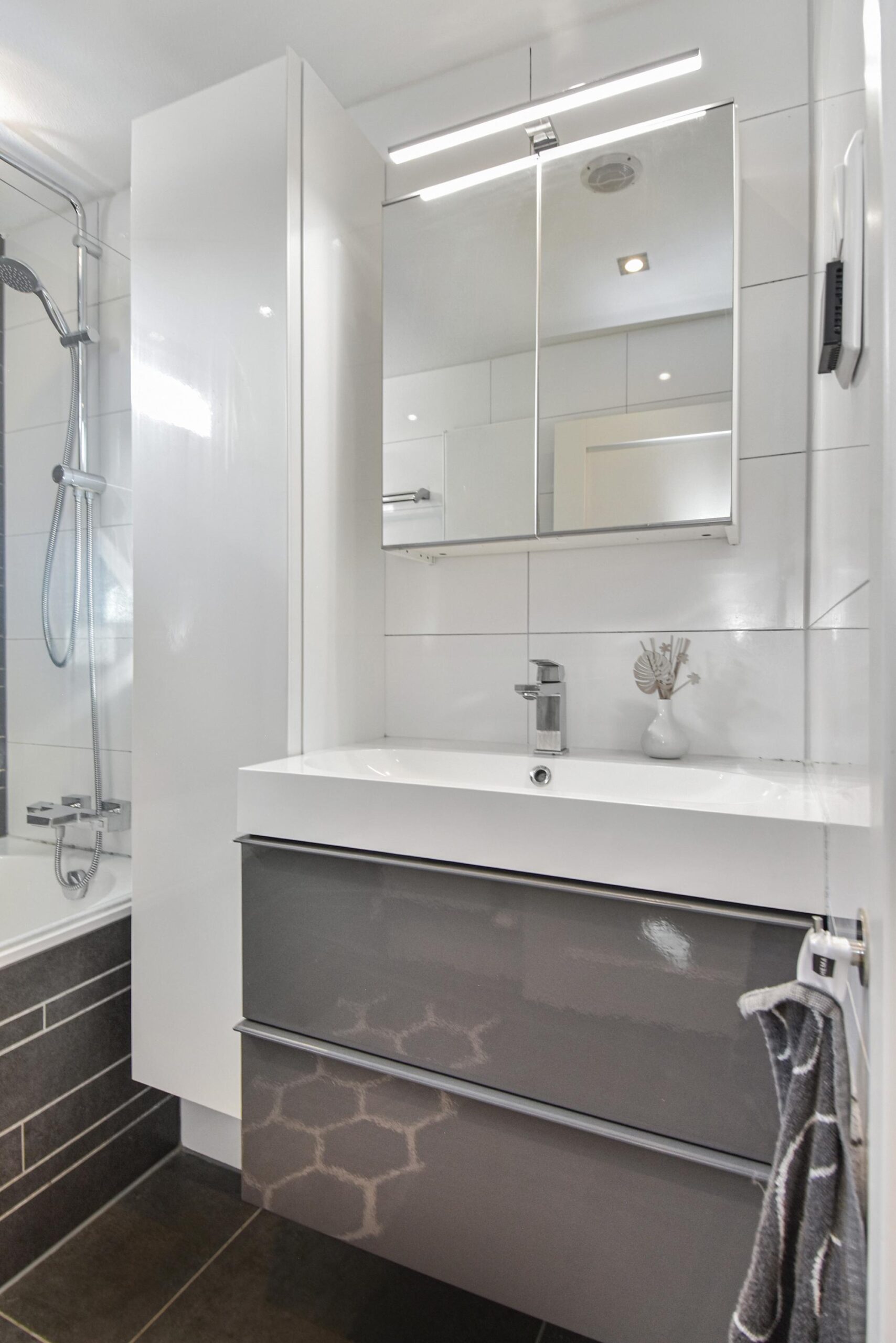 De moderne badkamer is uitgevoerd met fraaie grijze tegels en heeft een ligbad met douche, een brede wastafel met twee royale opberglades én een hoge kast. Het toilet bevindt zich in een aparte ruimte, direct naast de badkamer.