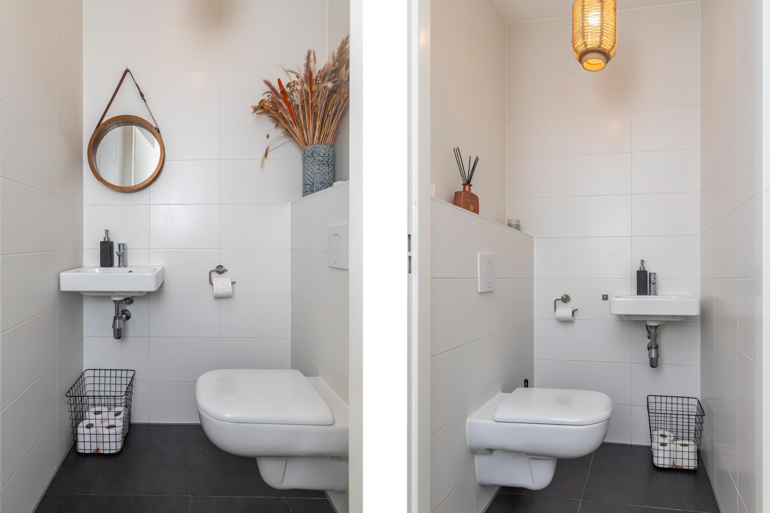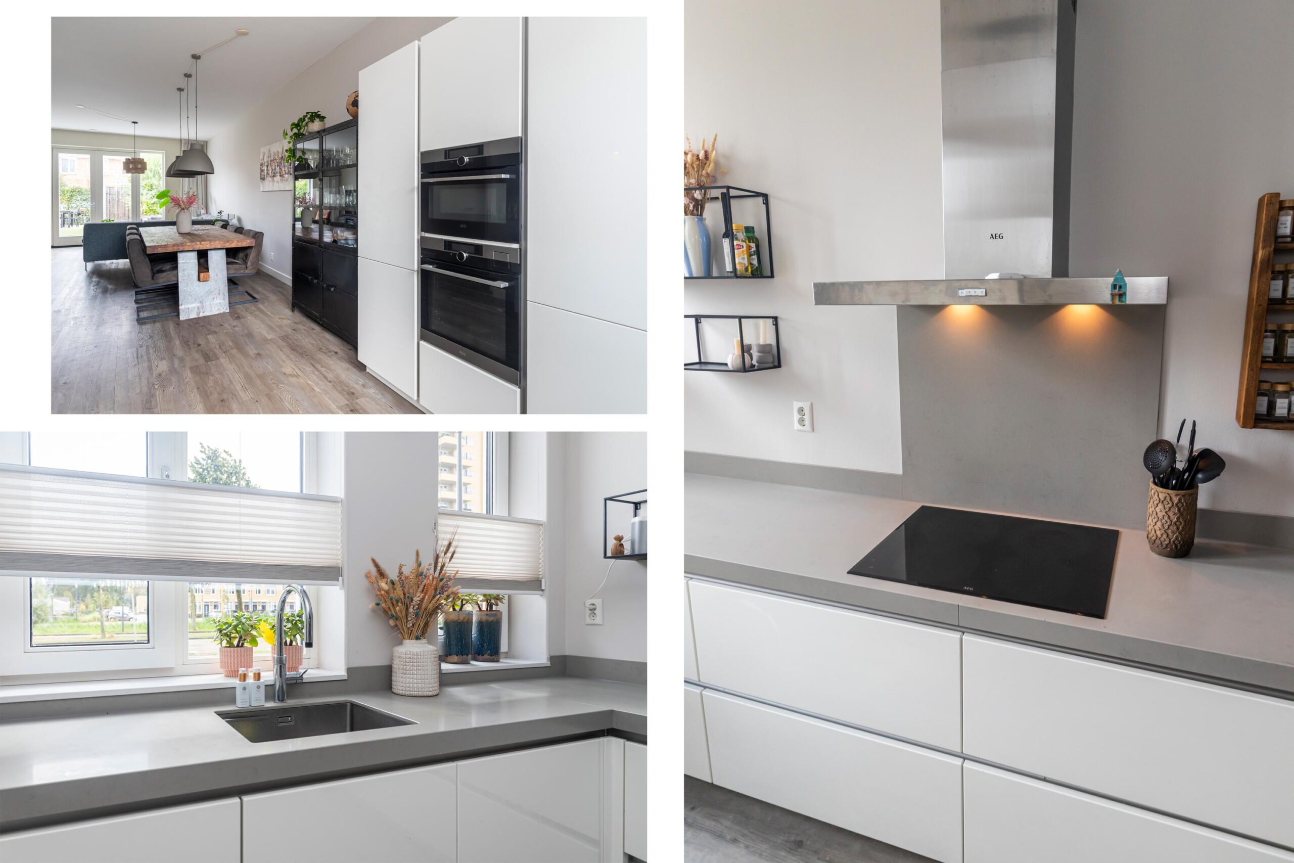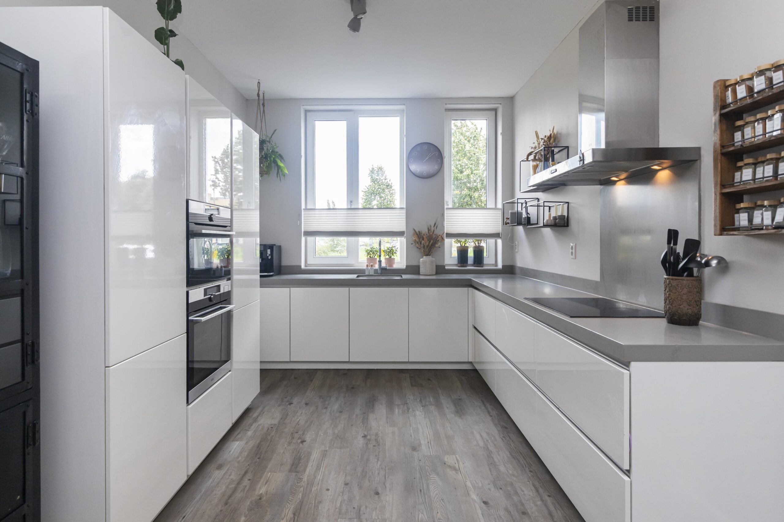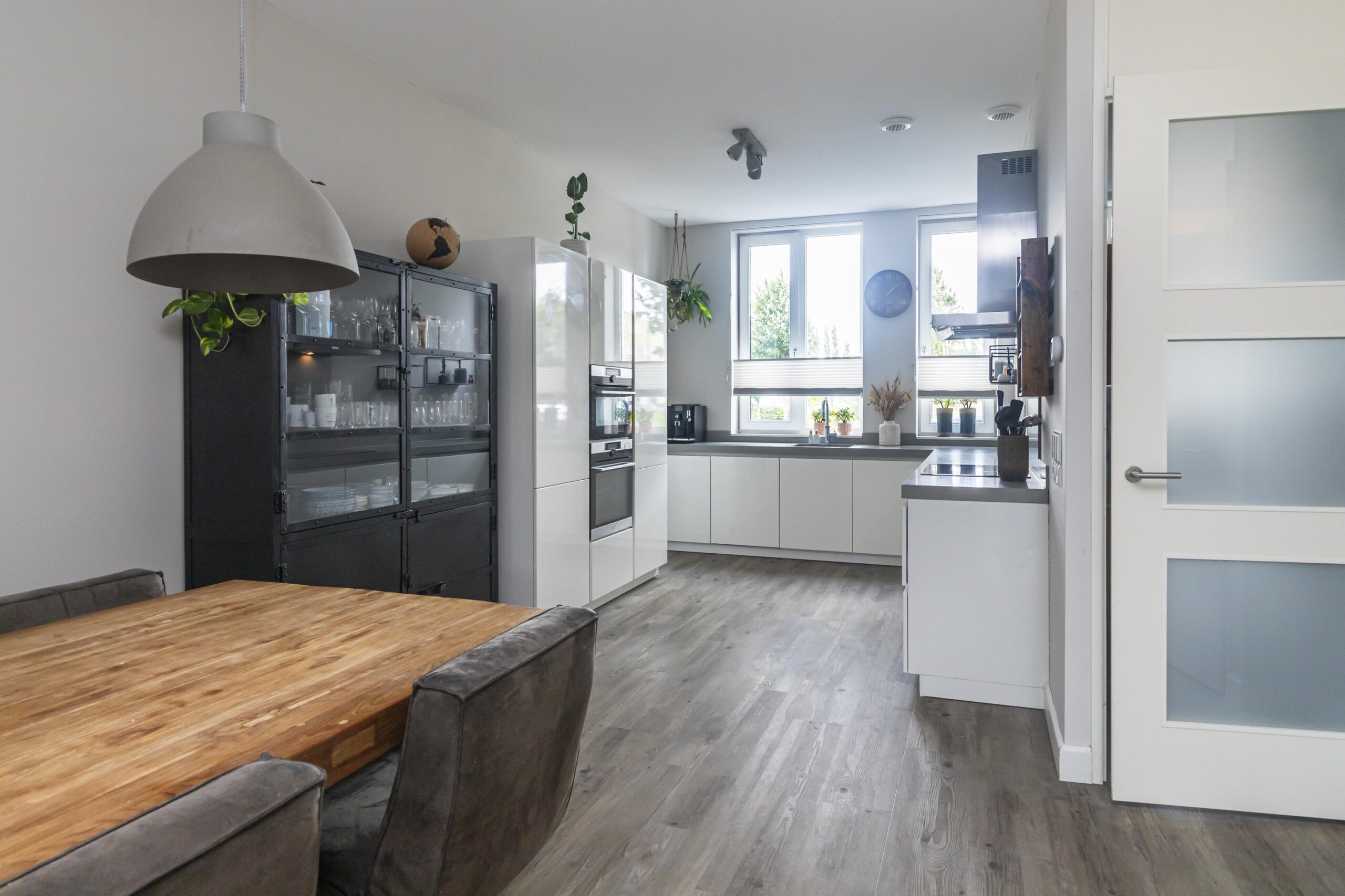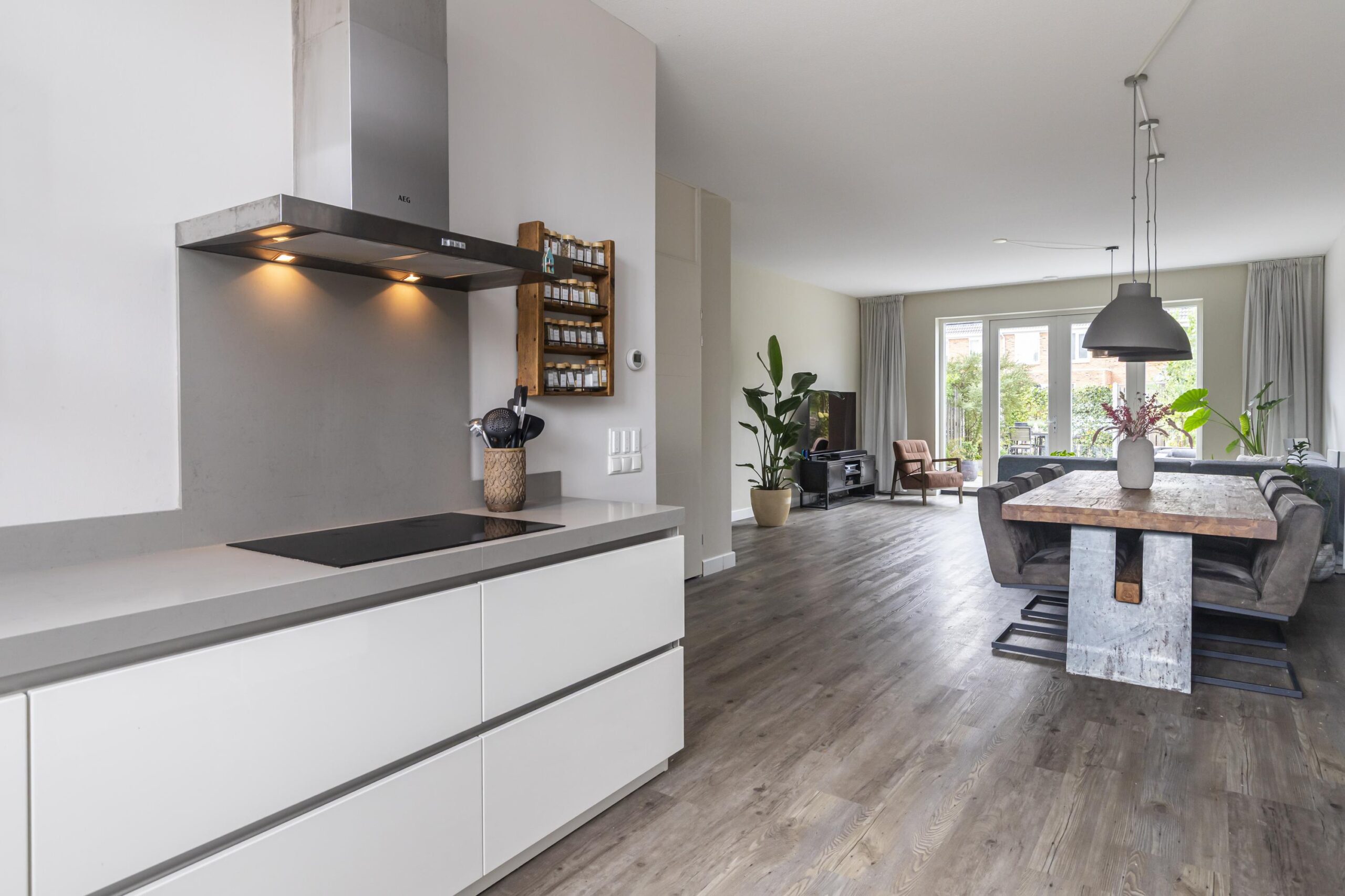 Entree via de hal, met meterkast, modern toilet en trap naar de 1e verdieping. Woonkamer met luxe ruime open keuken, welke is voorzien van diverse inbouwapparatuur zoals een vaatwasser, combi-oven, oven, inductie kookplaat met recirculatiekap, quoocker, grote koelkast (2024) en een grote vrieskast (2024). Ruime en sfeervolle woonkamer voorzien van een pvc houtlook vloer met vloerverwarming en koeling. Tevens is er in de woonkamer een ruime vaste kast, onder de trap. Via de woonkamer is er toegang tot de diepe achtertuin gelegen op noordwesten. Via de achtertuin is er toegang tot de parkeerplaats en berging.