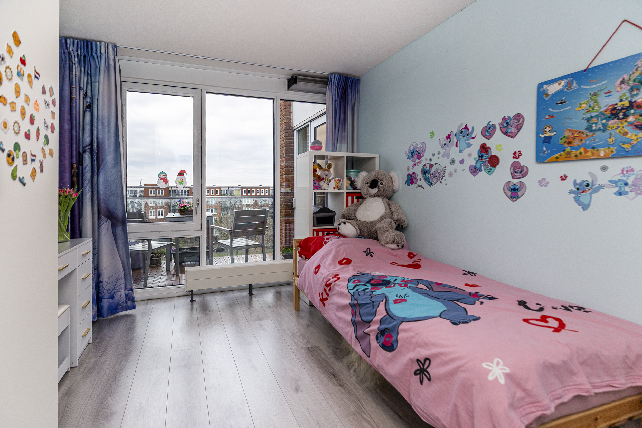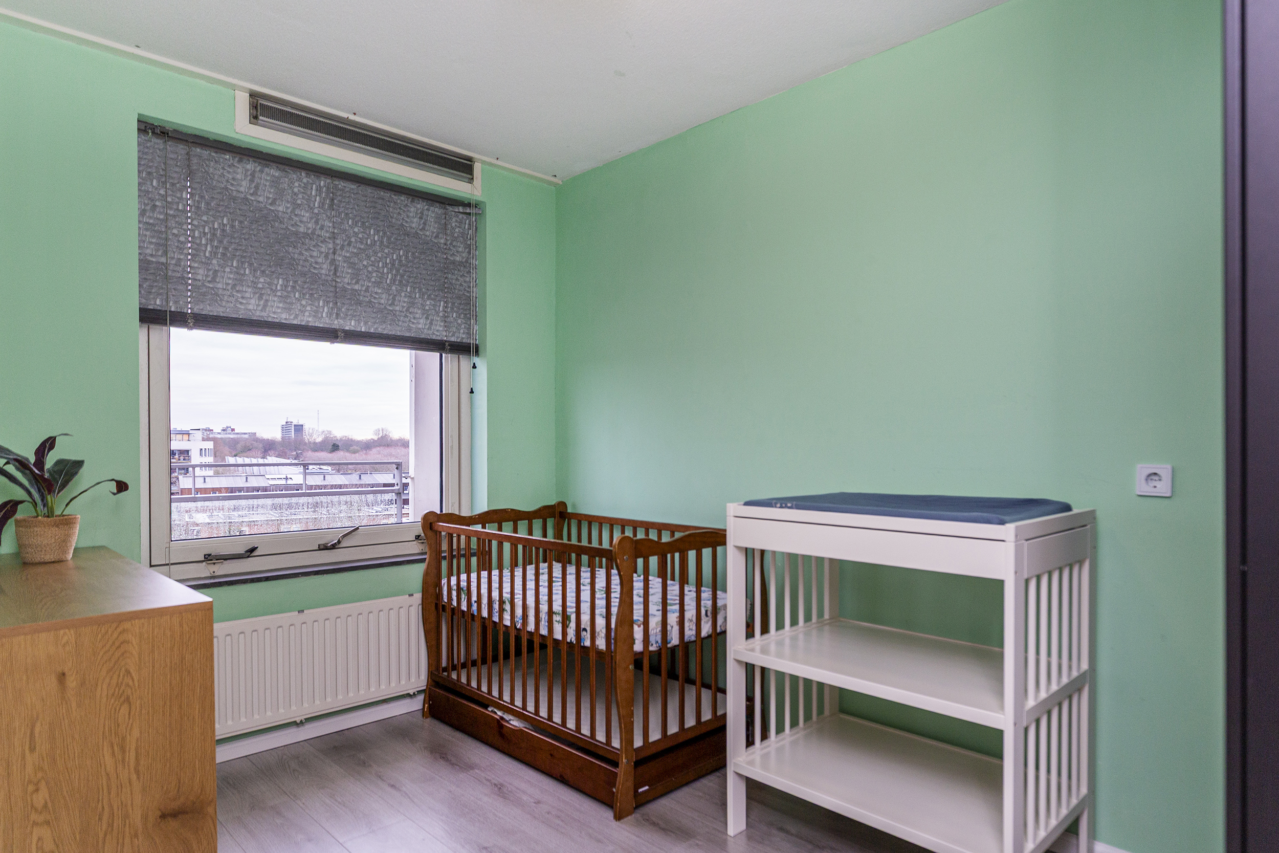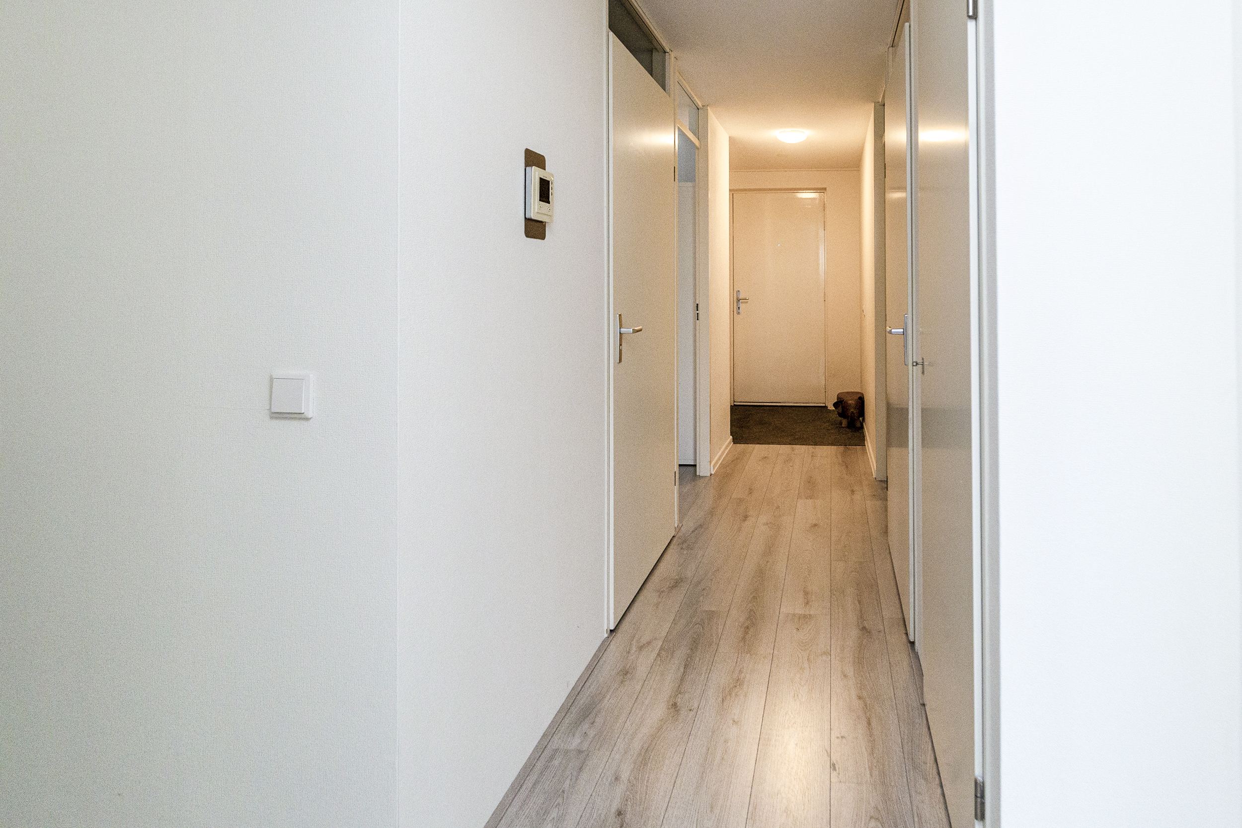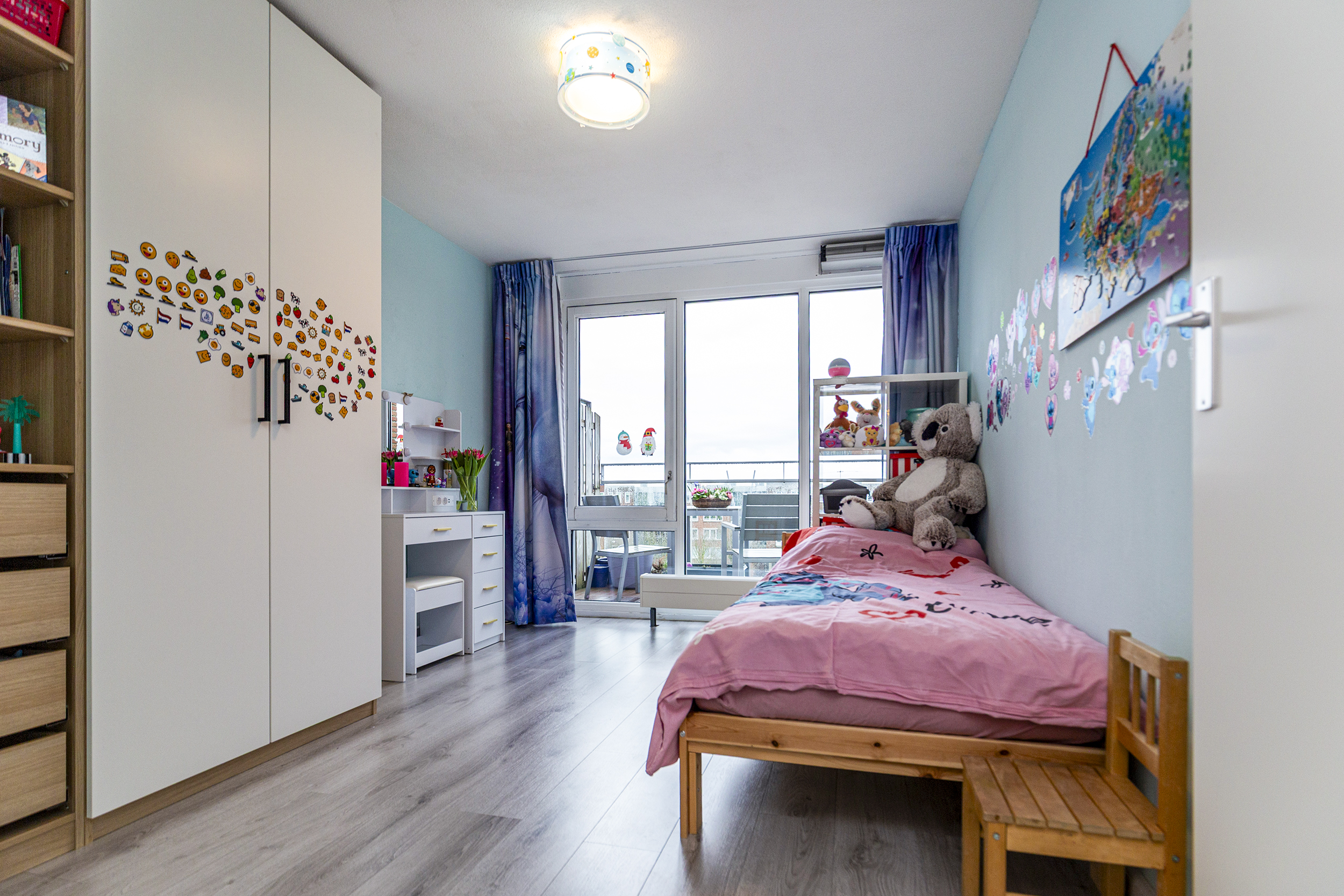 Op de vierde verdieping bereik je het appartement via de galerij. In de hal is de meterkast en vanuit de gang loop je naar alle kamers. De woon- en eetkamer is licht en prettig ingedeeld. Grote ramen en overal hetzelfde nette laminaat. Via de woonkamer is het balkon bereikbaar gelegen op het westen: een fijne plek voor je eerste koffie of een drankje aan het einde van de dag.