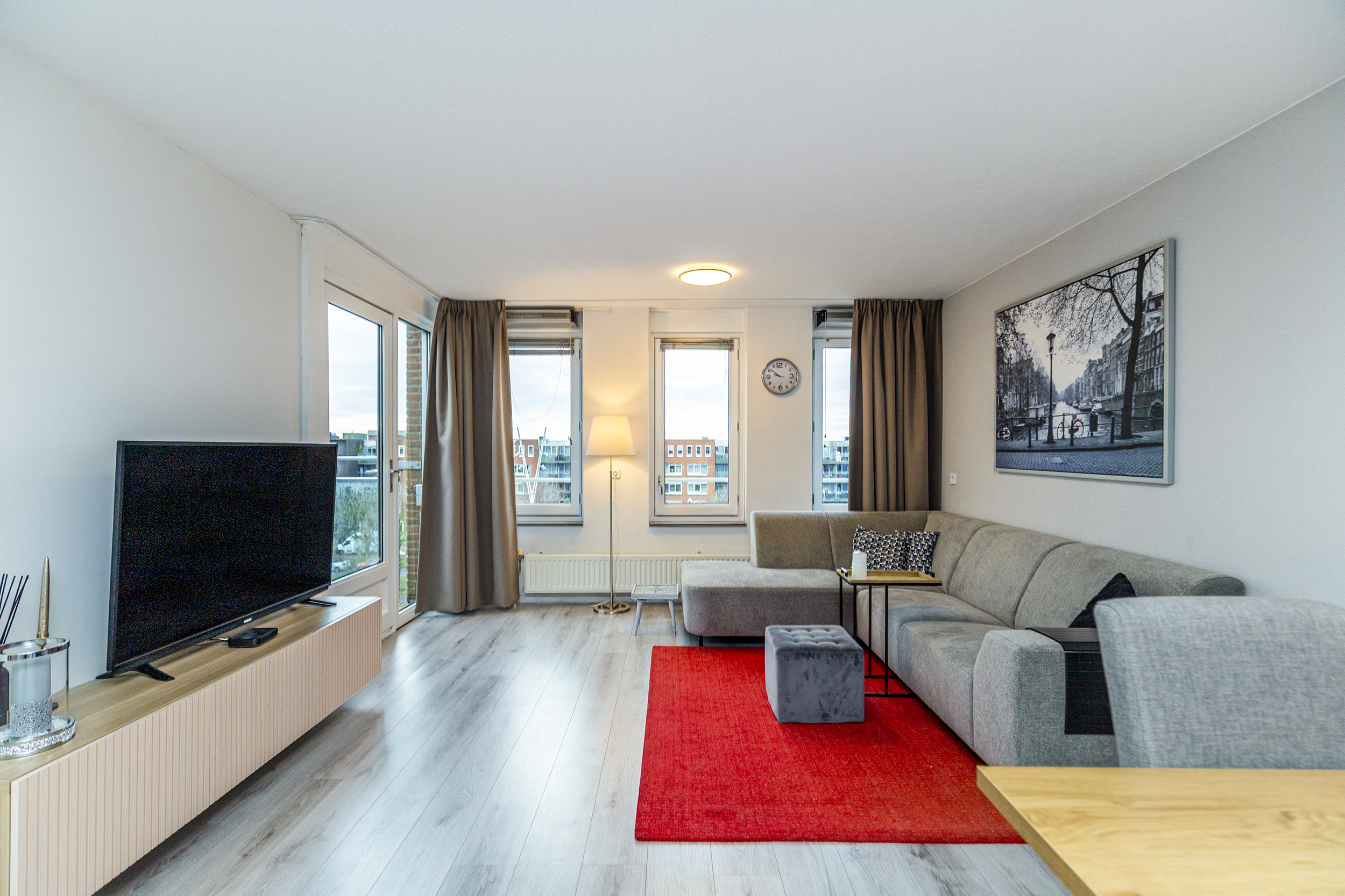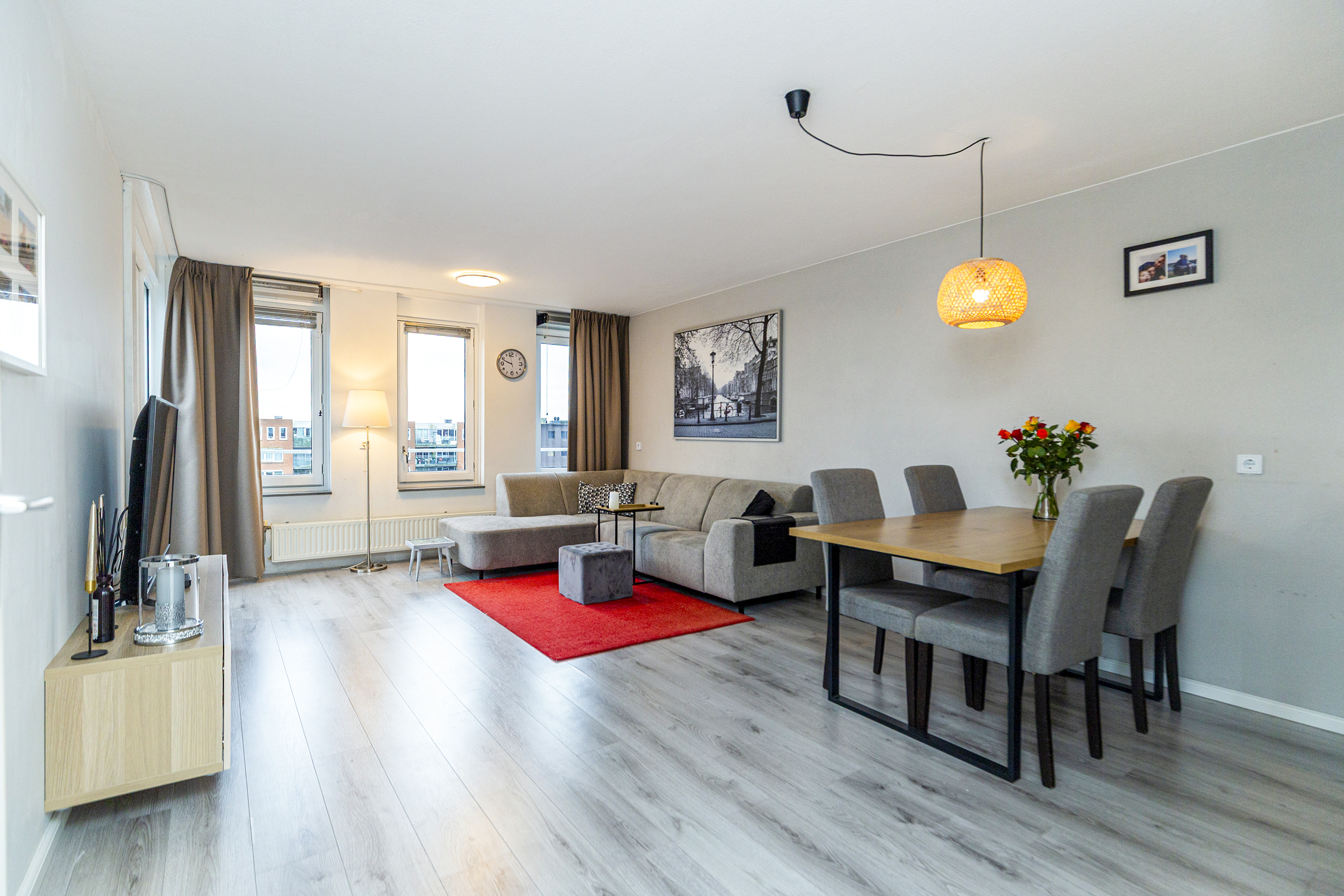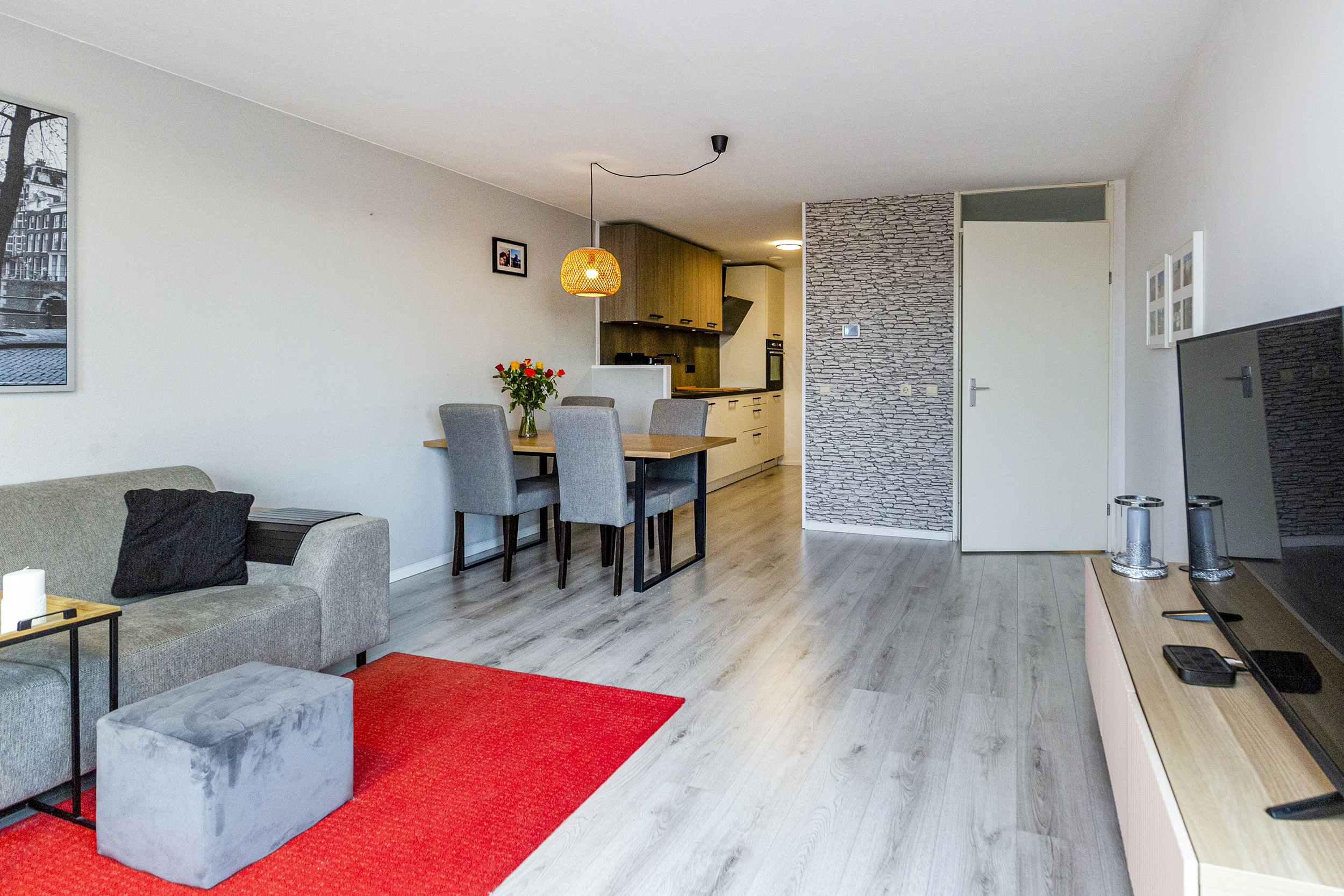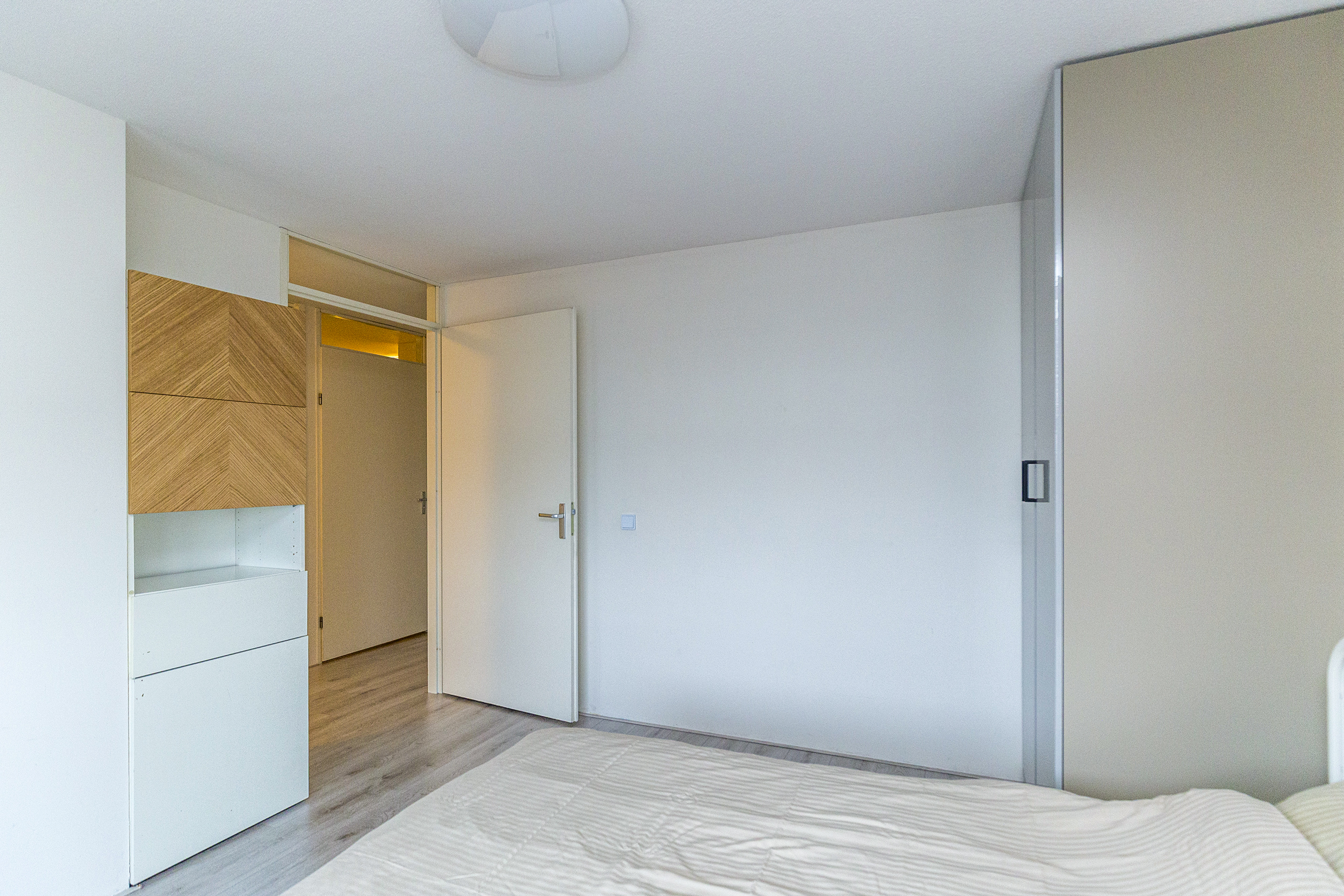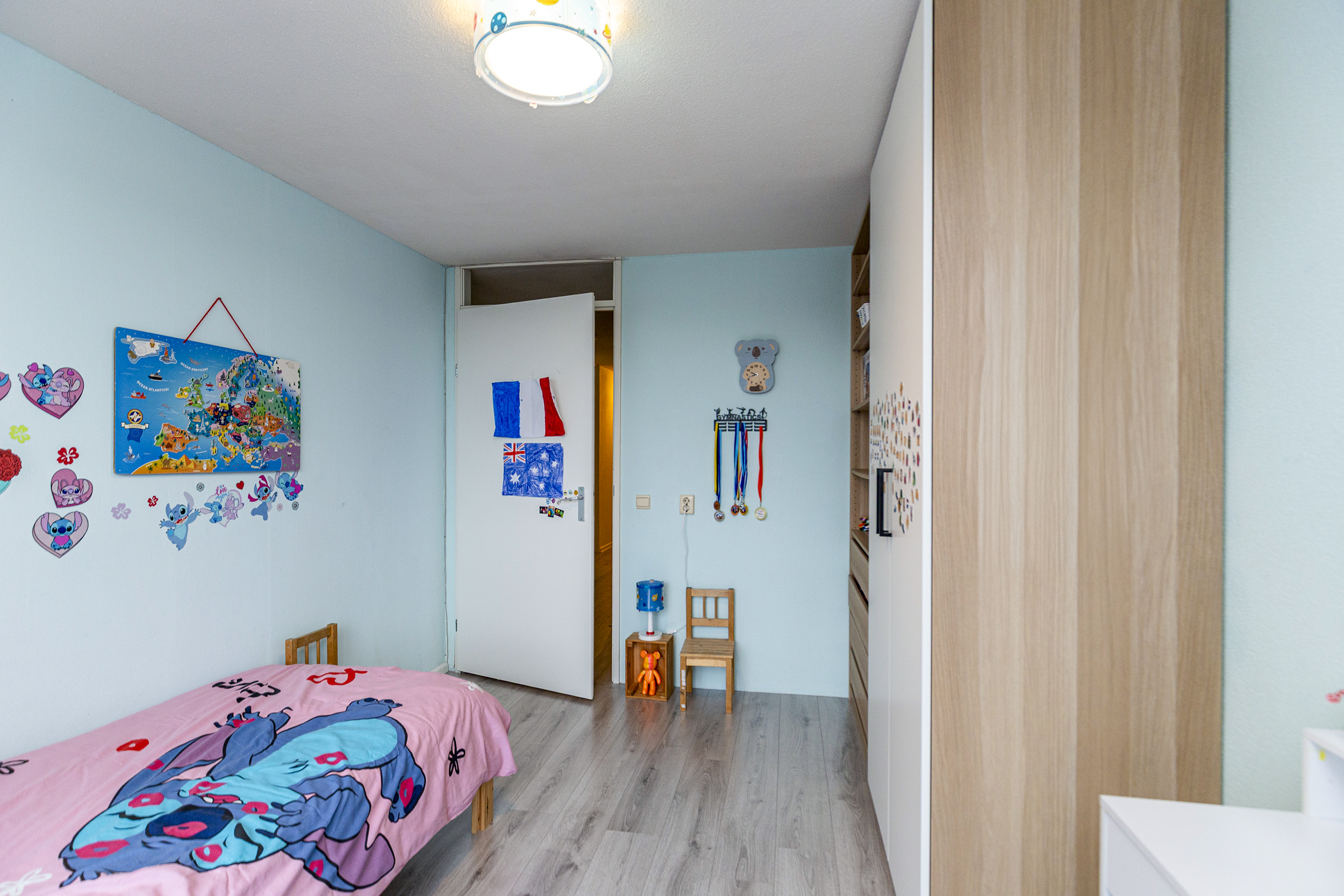 Op de vierde verdieping bereik je het appartement via de galerij. In de hal is de meterkast en vanuit de gang loop je naar alle kamers. De woon- en eetkamer is licht en prettig ingedeeld. Grote ramen en overal hetzelfde nette laminaat. Via de woonkamer is het balkon bereikbaar gelegen op het westen: een fijne plek voor je eerste koffie of een drankje aan het einde van de dag.