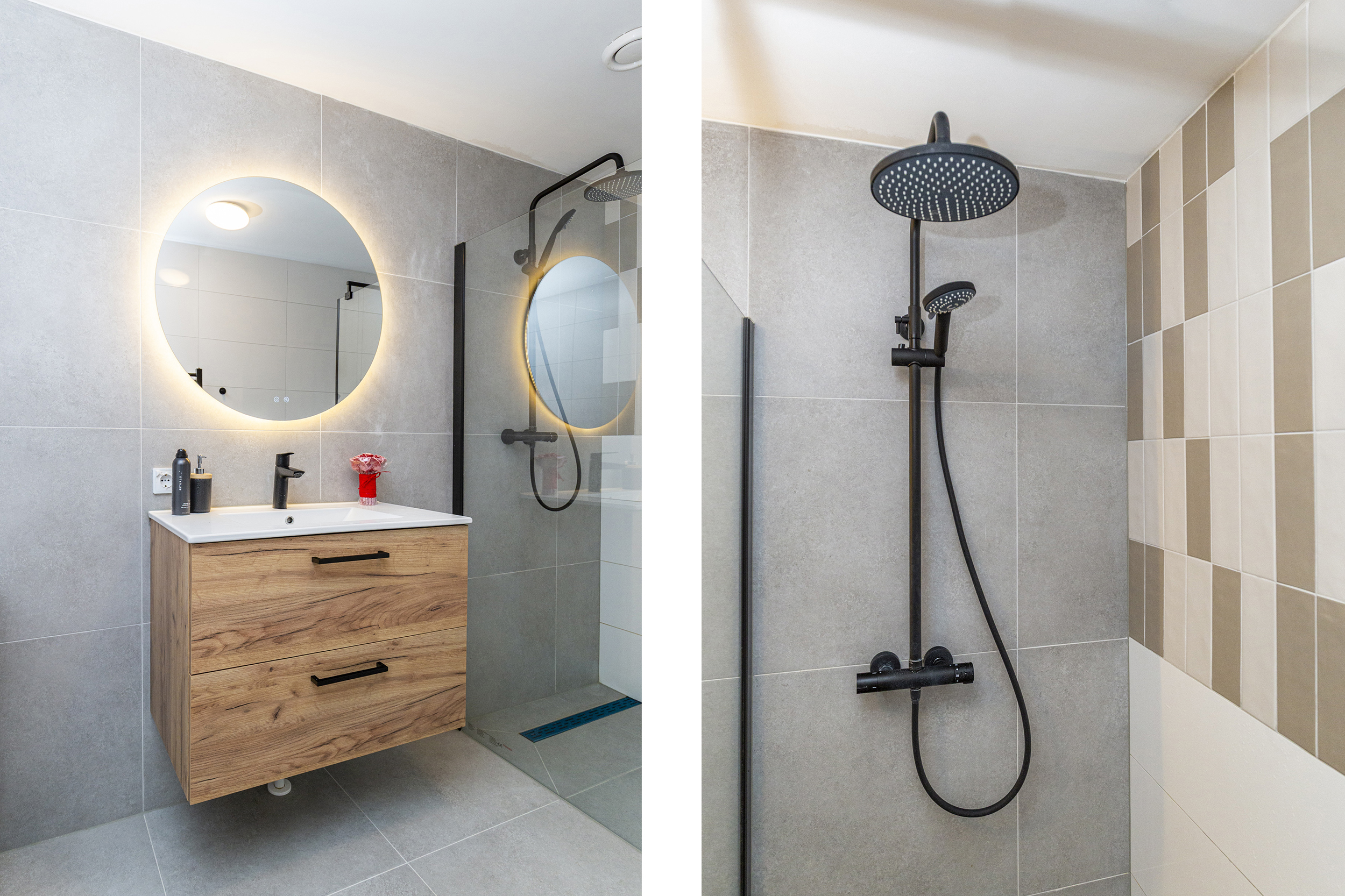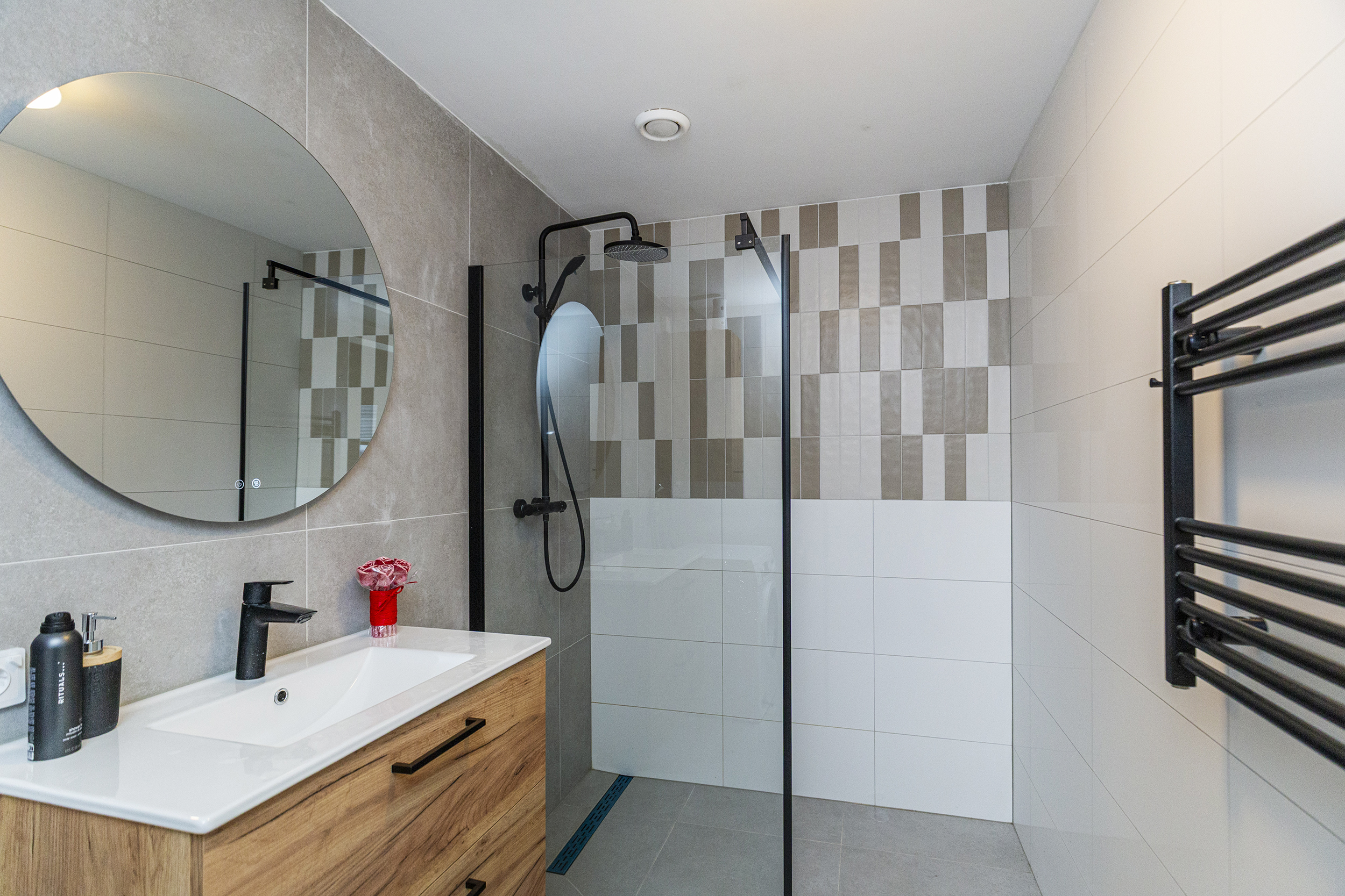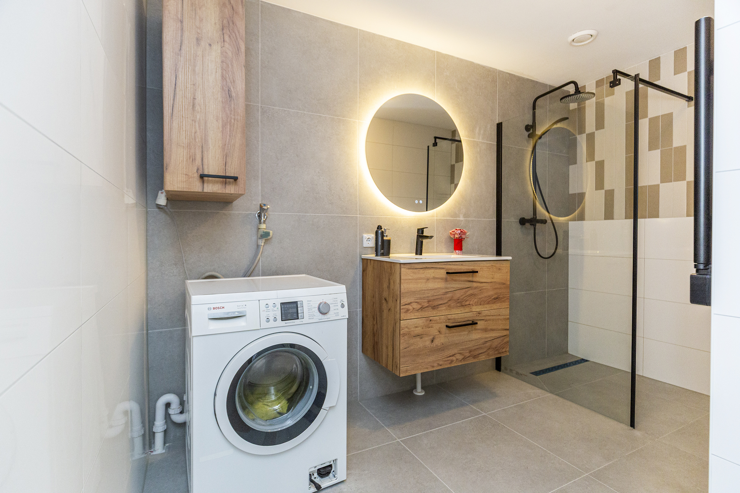- Badkamervoorzieningen Wastafelmeubel, inloopdouche, wasmachineaansluiting