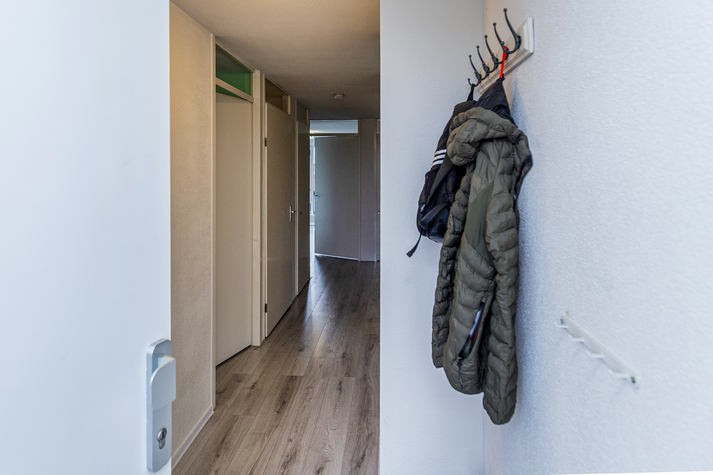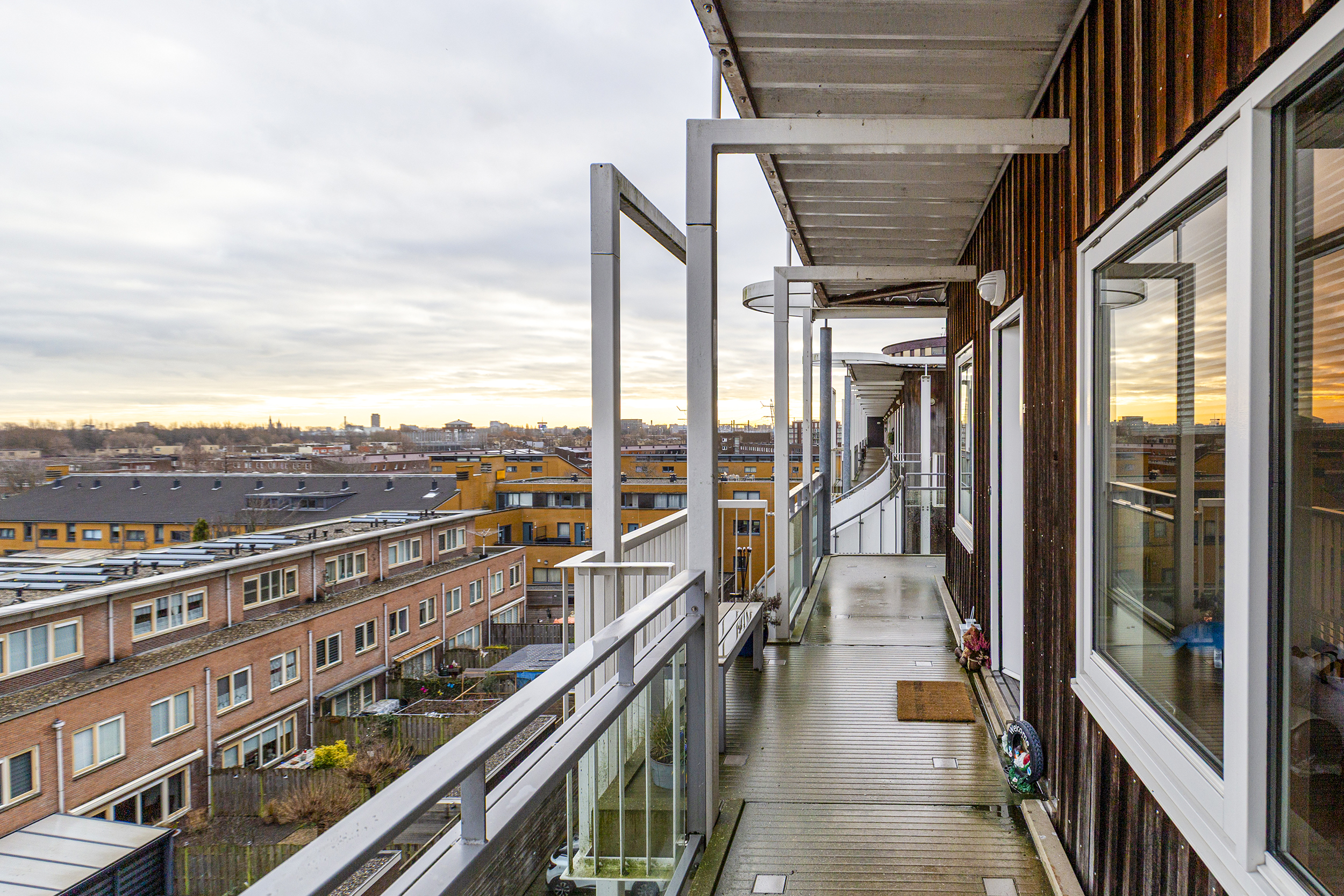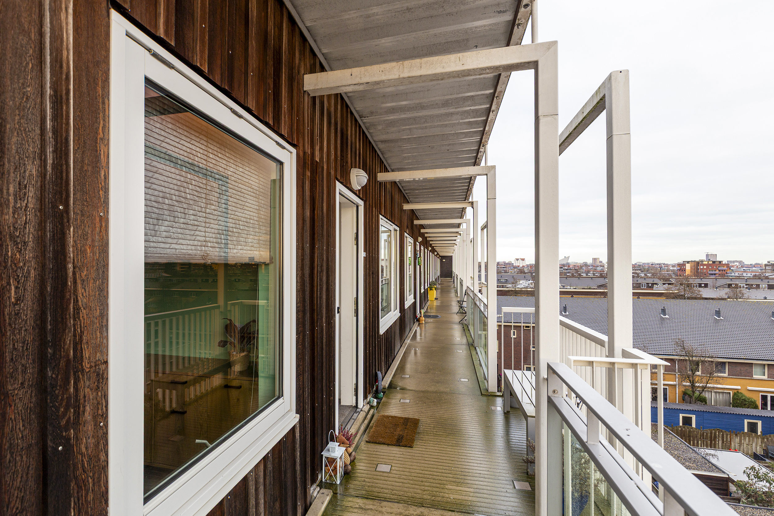 Hier woon je op de vierde verdieping, helemaal aan het einde van de galerij. Rustig…