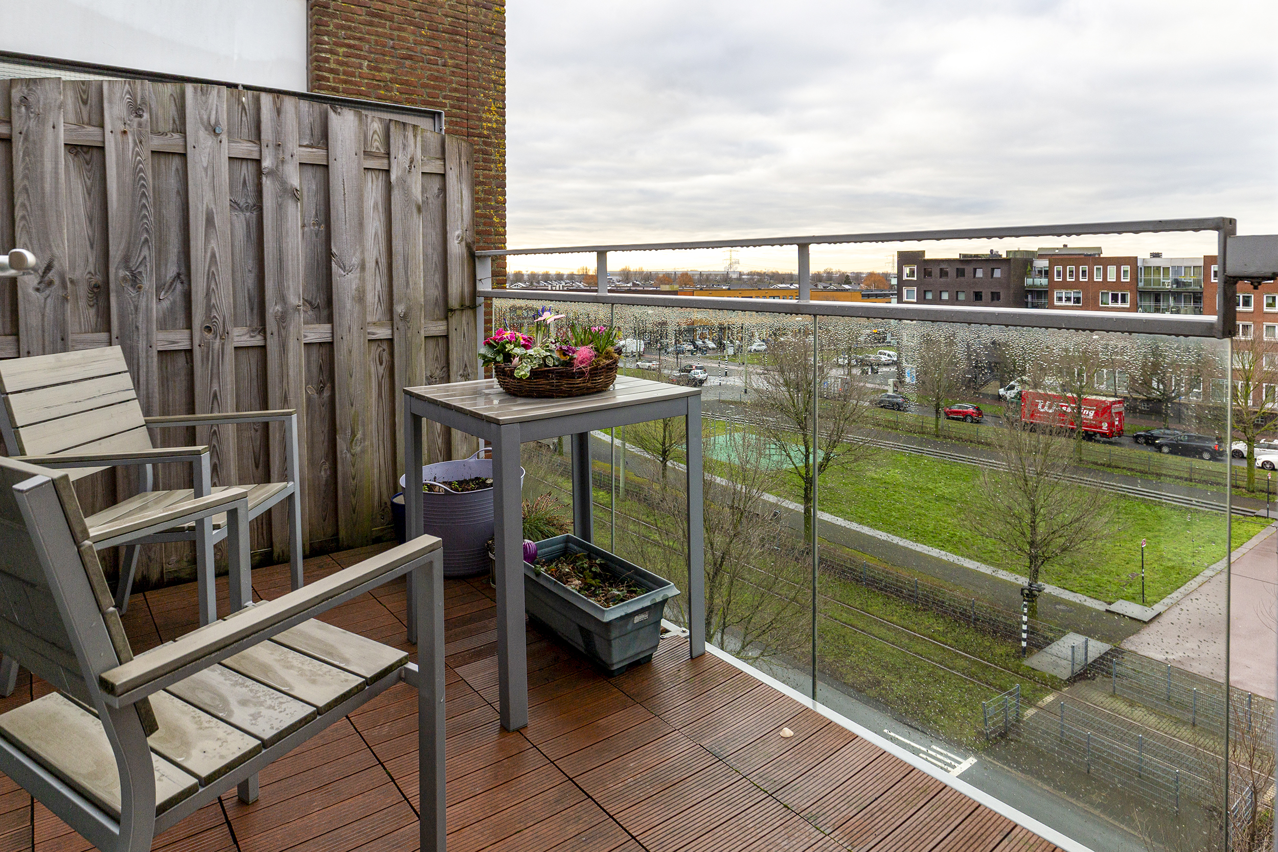 Een heerlijk balkon op het westen. Eigen parkeerplaats en berging op de begane grond.
