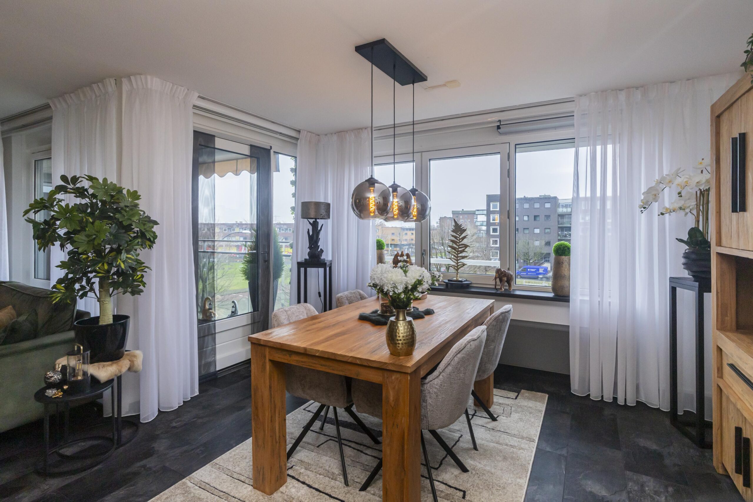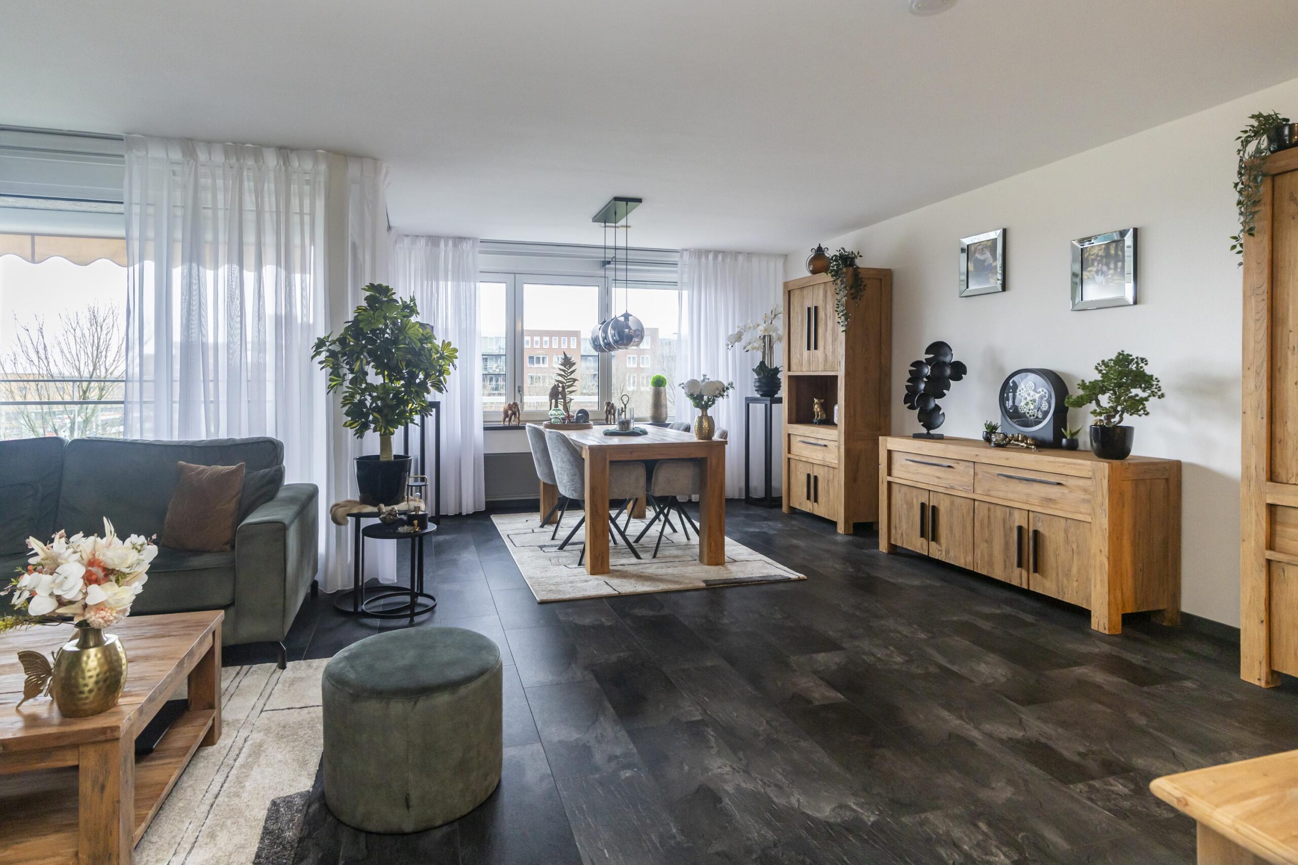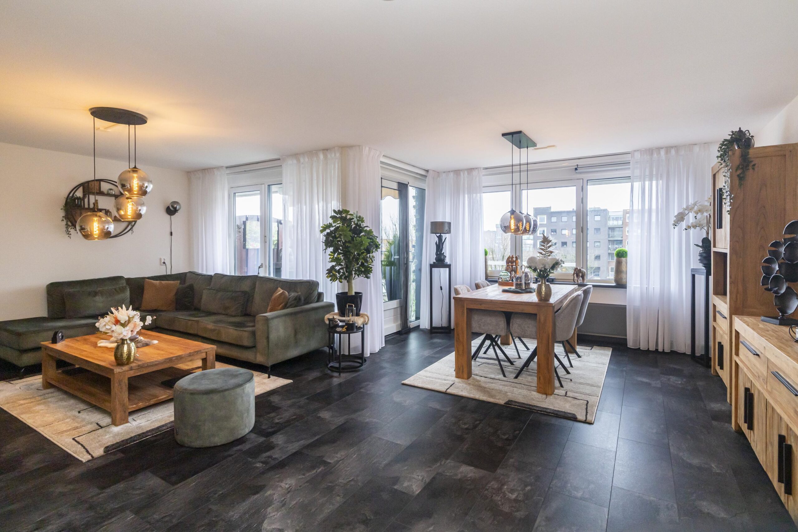 Woon-/eetkamer met grote ramen en prettige lichtinval. Aansluitend het balkon met zonnescherm.