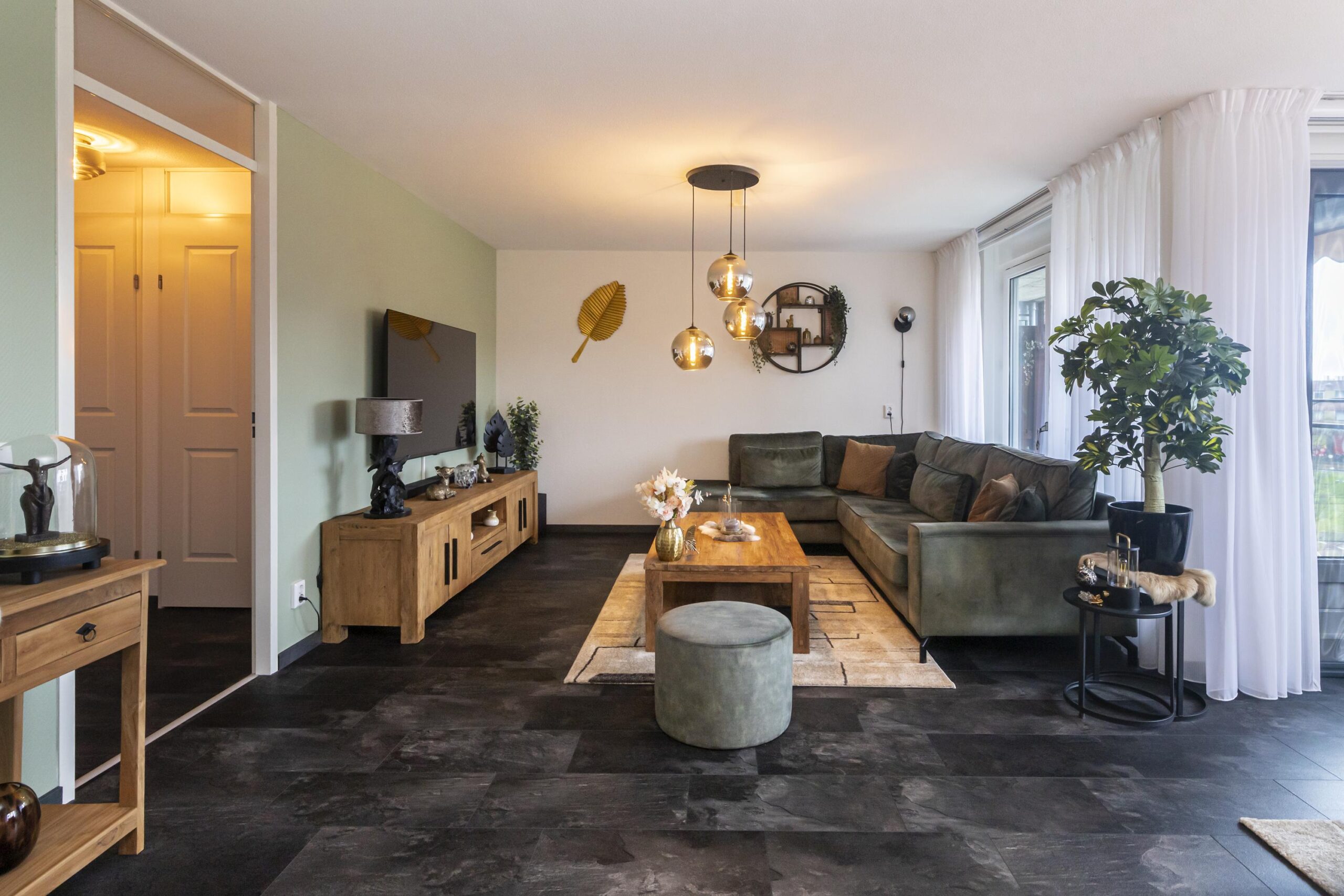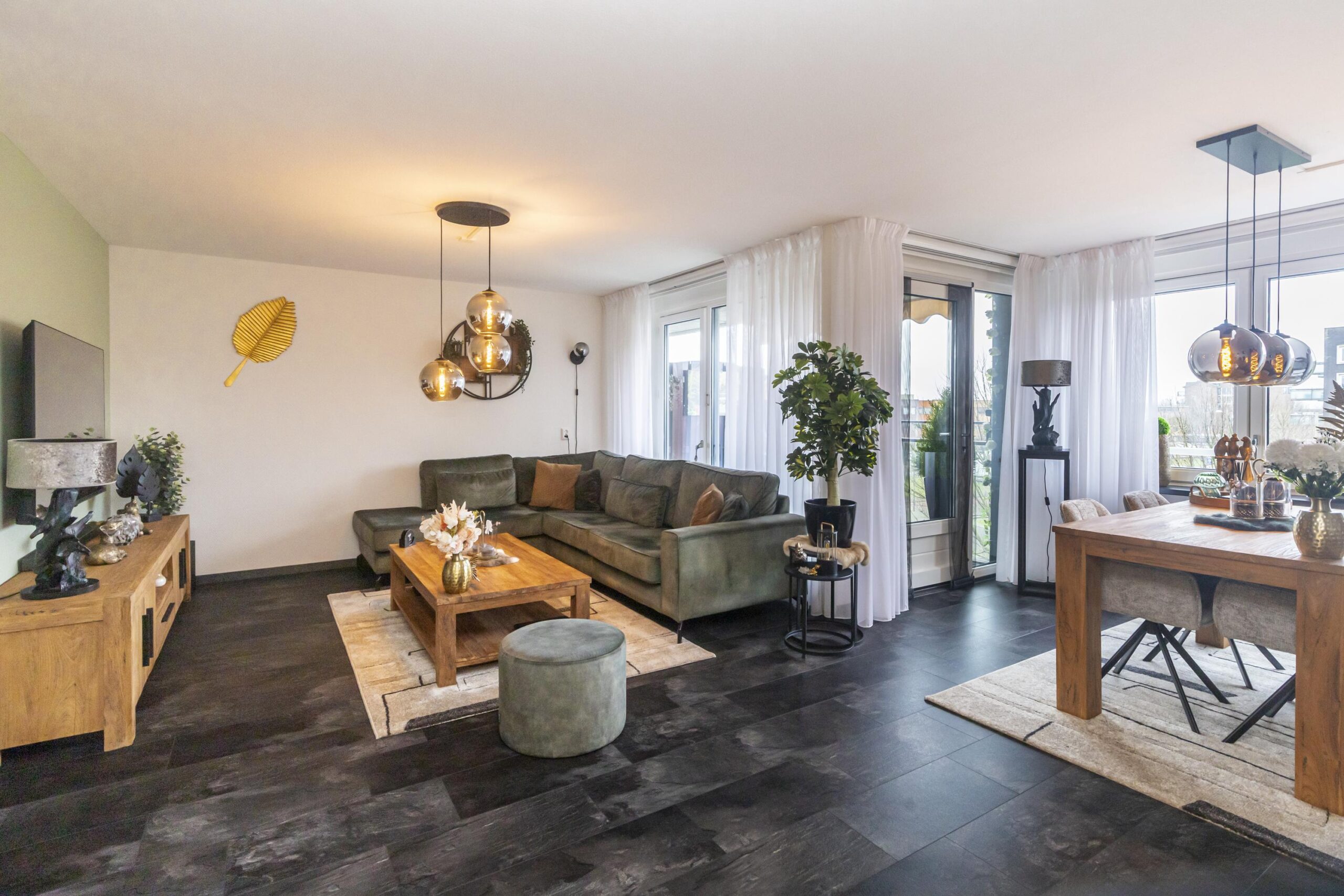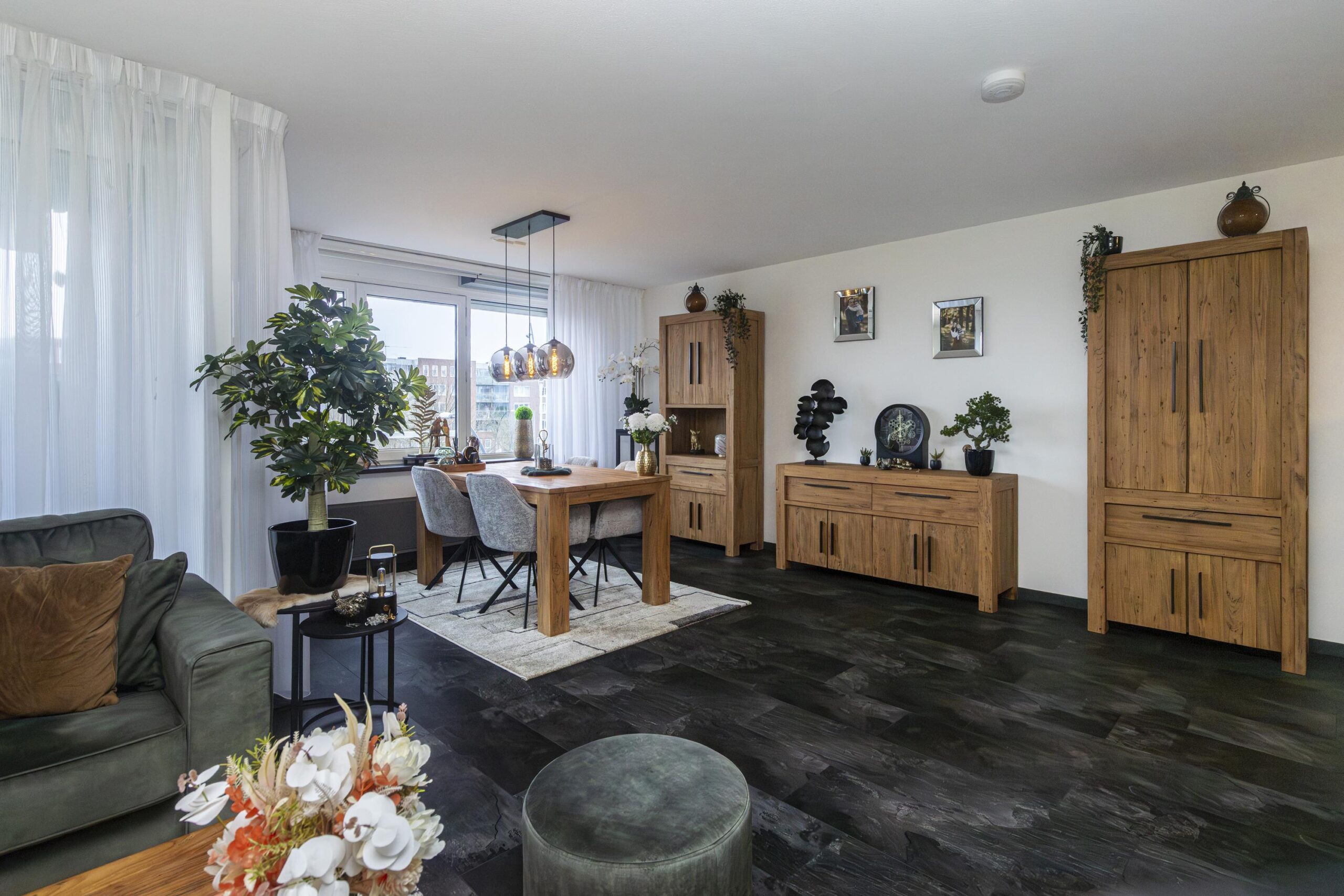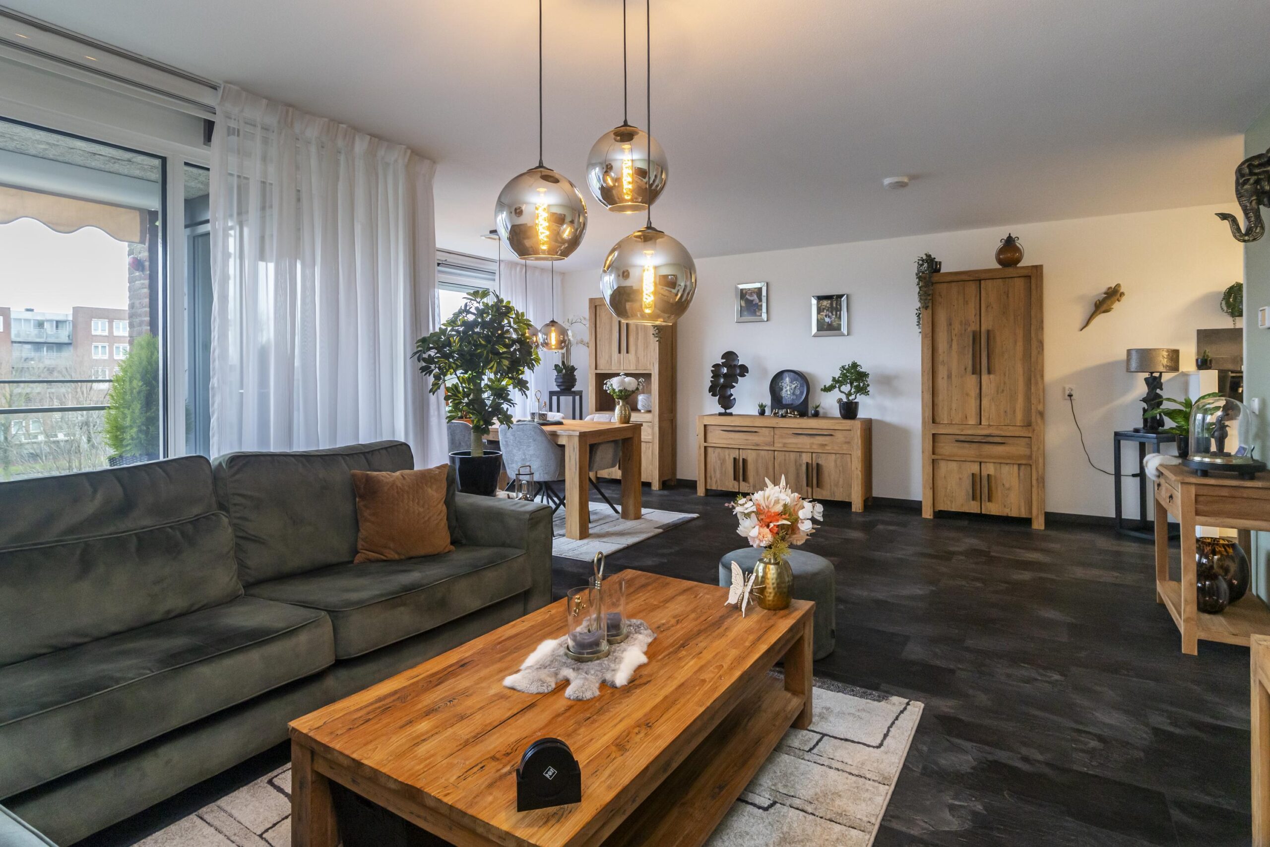 Woon-/eetkamer met grote ramen en prettige lichtinval. Aansluitend het balkon met zonnescherm.