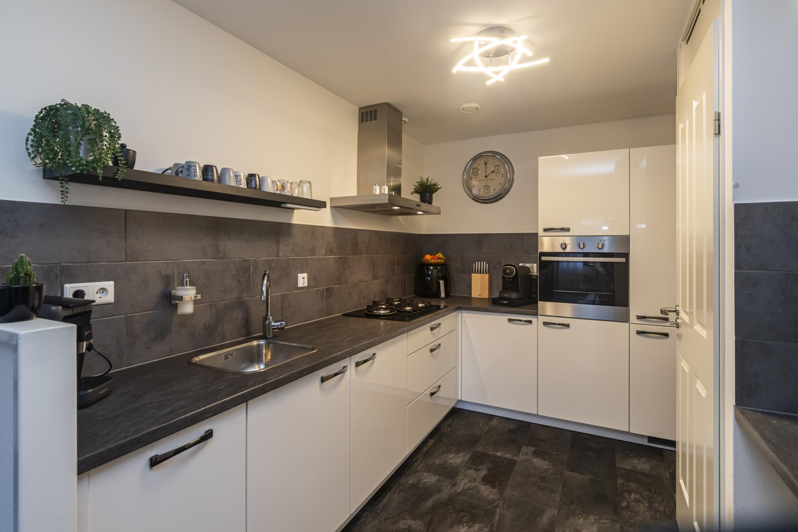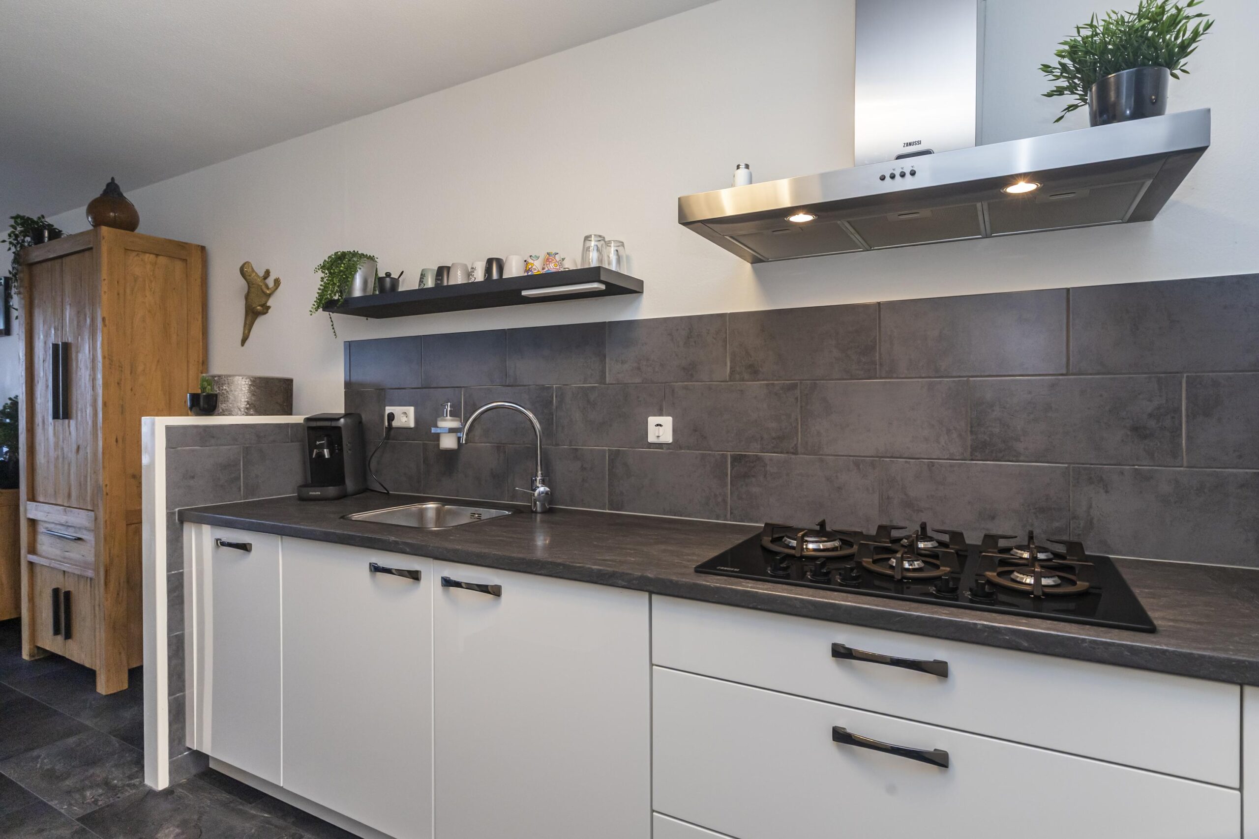 Open keuken voorzien van 5-pits gaskookplaat, rvs-schouw, oven, koel-/vriescombinatie en een kleine vaatwasser.