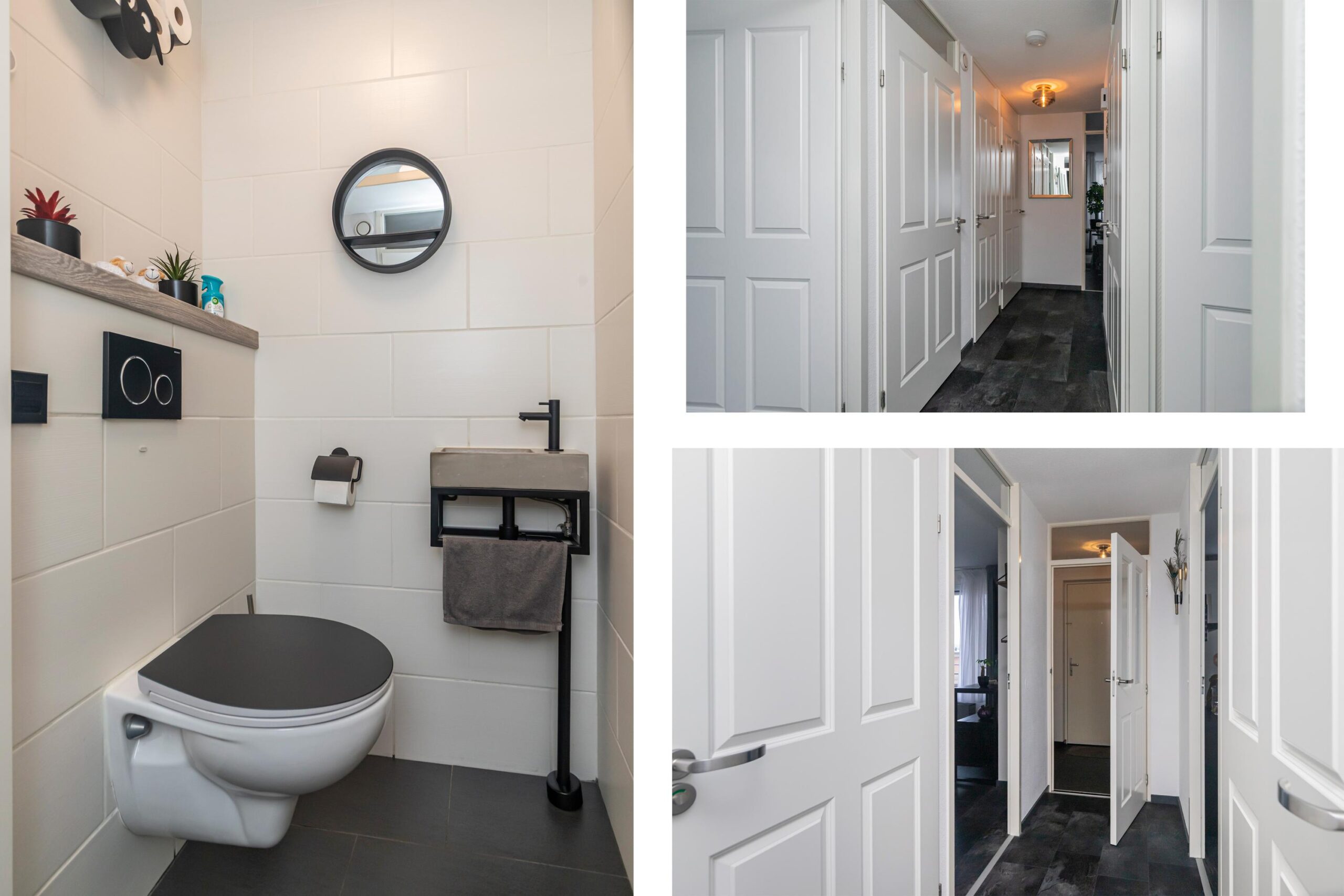 Entree met tochtportaal. Hal met vaste kast, meterkast, kast met cv en mechanische ventilatie. Apart toilet met wandcloset en fonteintje.