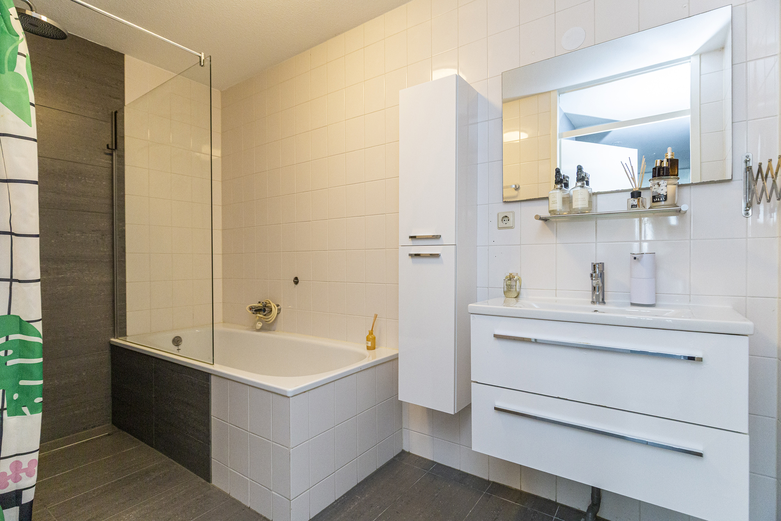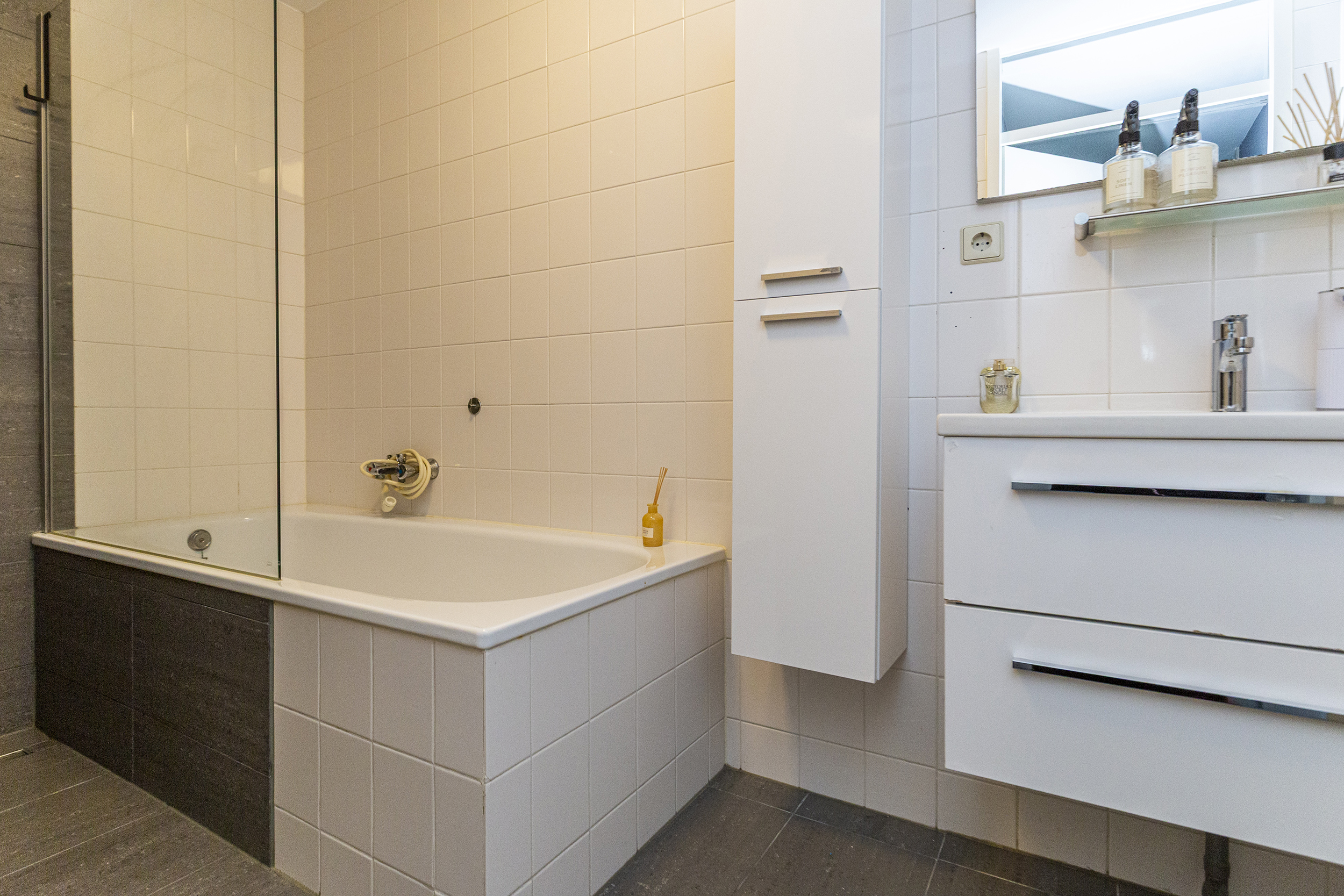 Via de hal bereik je de hoofdslaapkamer en een tweede slaapkamer. De volledig betegelde badkamer beschikt over een ligbad, een douche en een wastafelmeubel.
