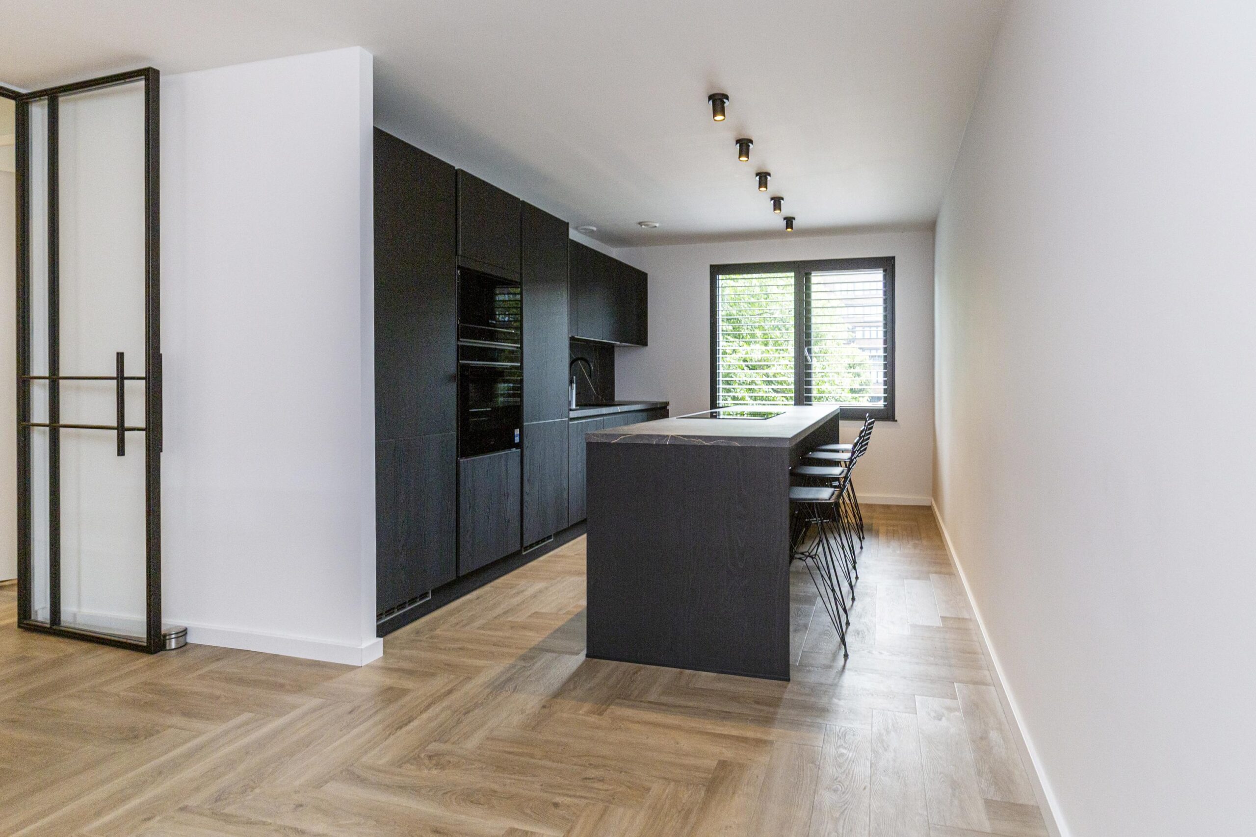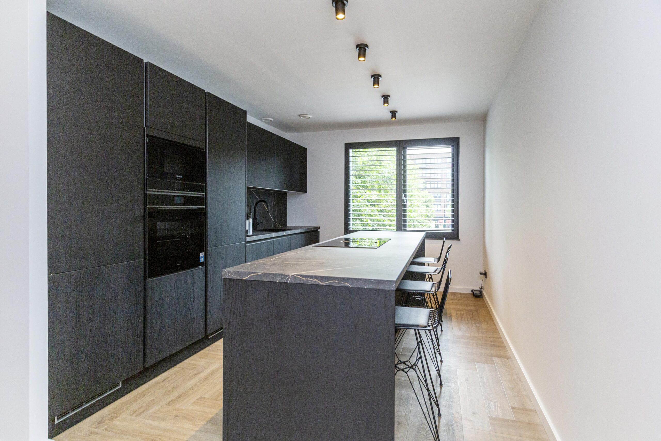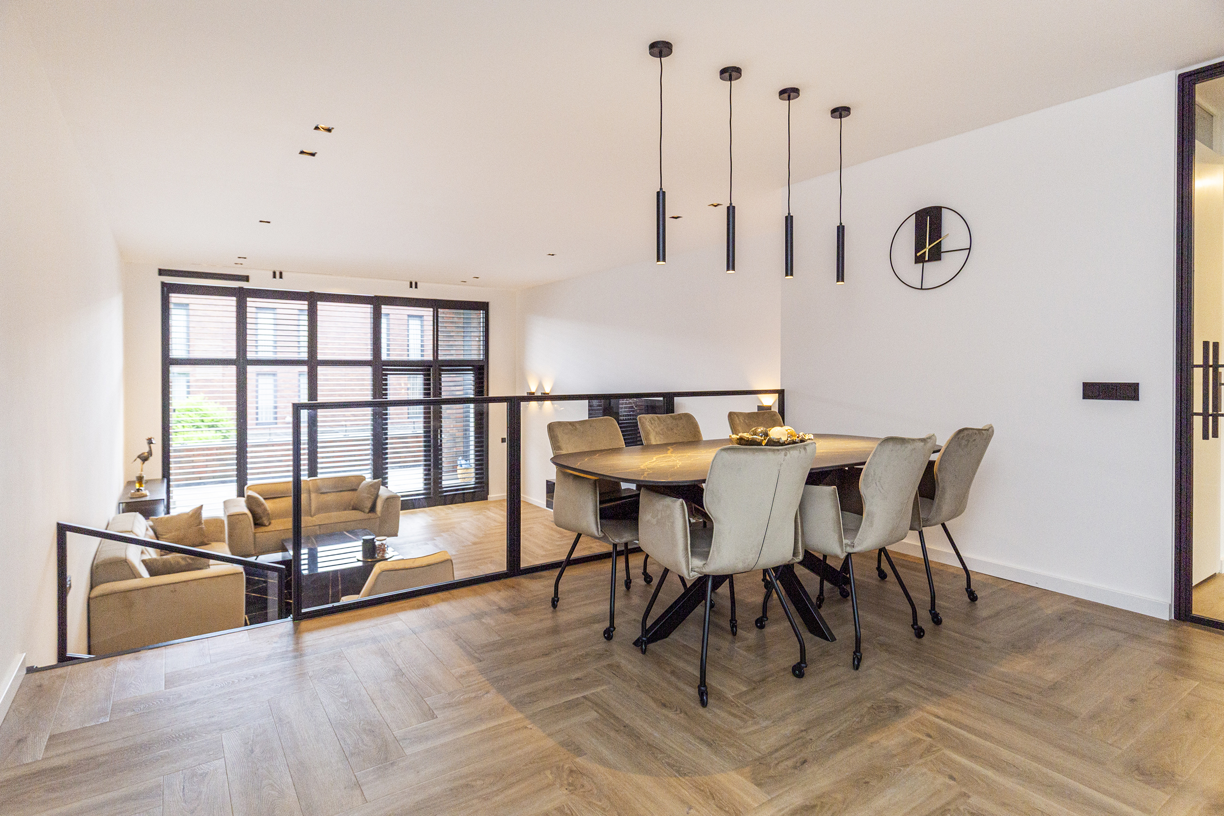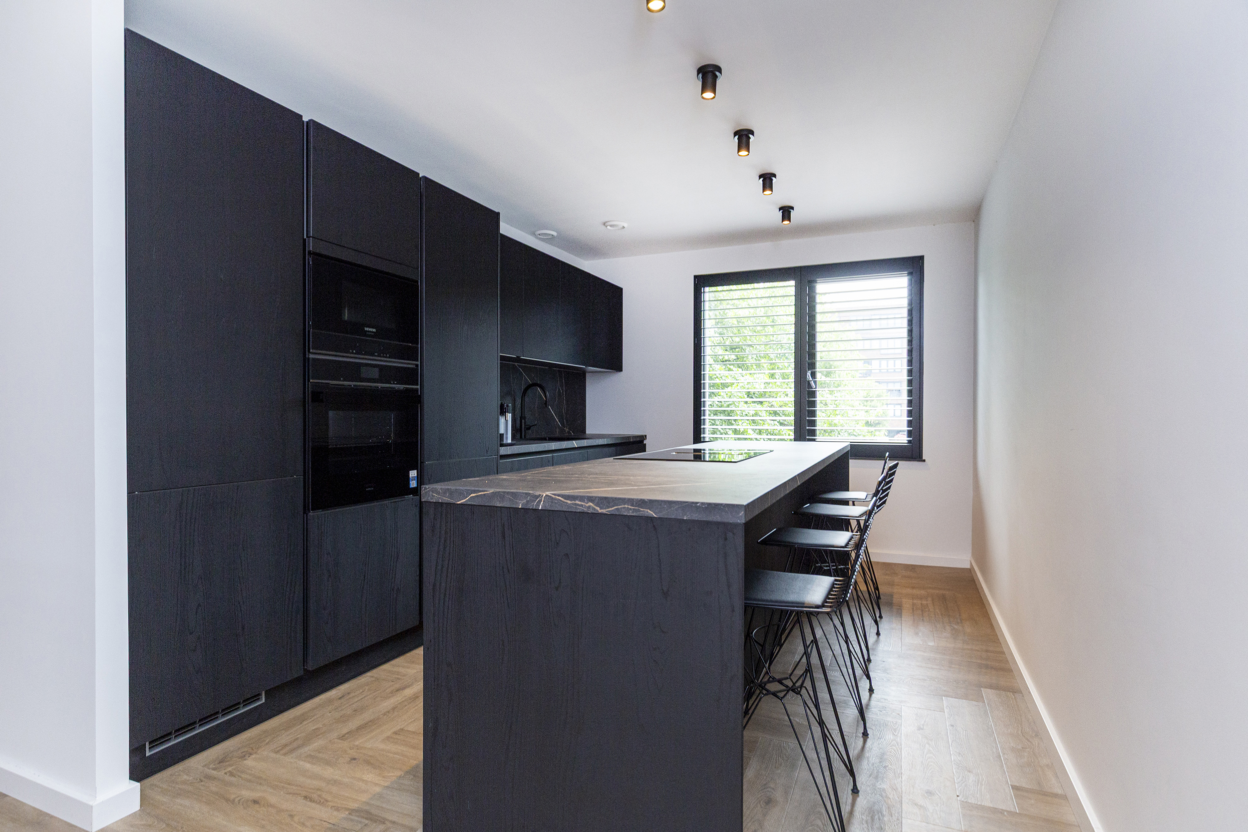 Vanuit de hal heeft u toegang tot de eetkamer. De open keuken is luxe afgewerkt met Siemens inbouwapparatuur, waaronder een combi oven-magnetron, vaatwasser, Quooker en inductiekookplaat met afzuiging geïntegreerd in de kookplaat. Het kookeiland met barretje biedt een gezellige plek om te koken en te ontspannen. De woonkamer is een opvallend ruime en lichte ruimte, dankzij de riante raampartijen. Het verlaagde plafond is voorzien van inbouwspots en moderne railverlichting. De woning is verder luxe afgewerkt met shutters in zowel de woonkamer als de keuken, wat de sfeer van het geheel versterkt.