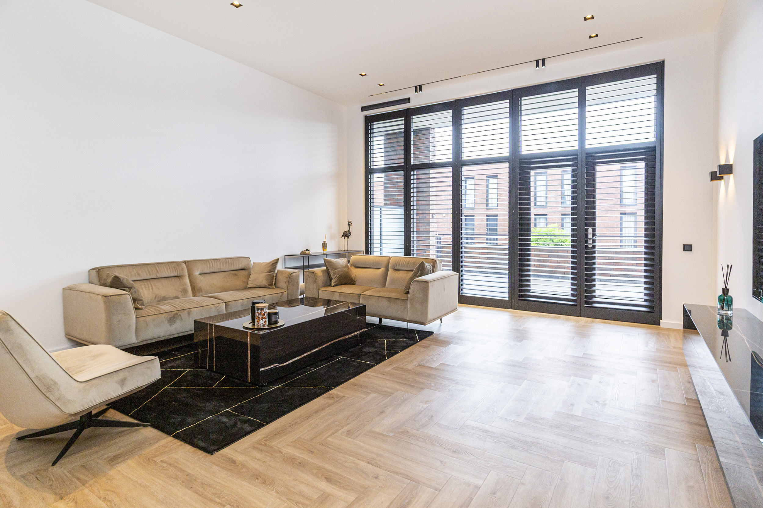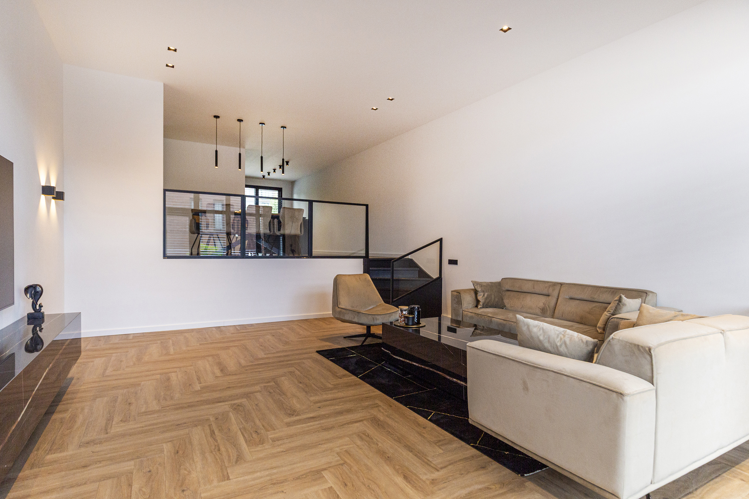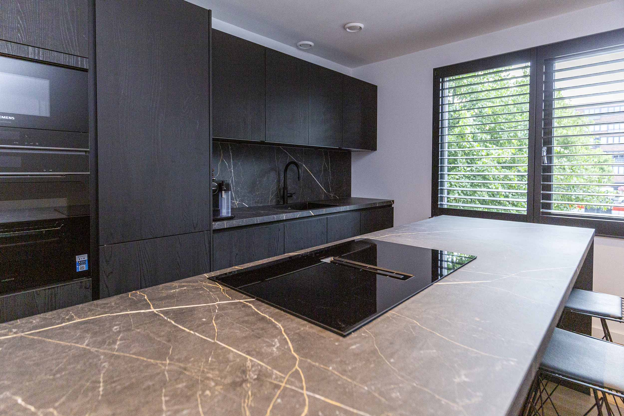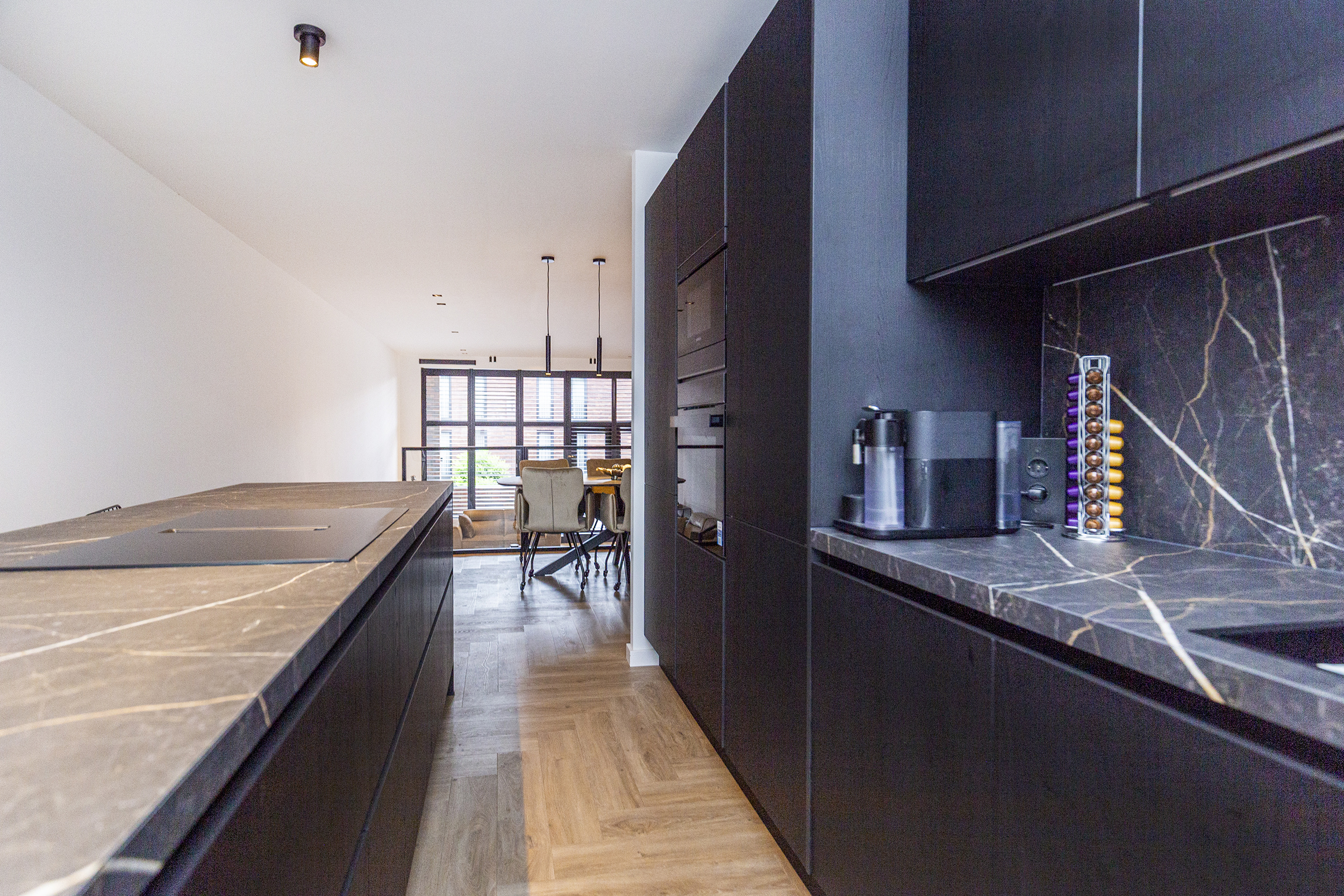 Vanuit de hal heeft u toegang tot de eetkamer. De open keuken is luxe afgewerkt met Siemens inbouwapparatuur, waaronder een combi oven-magnetron, vaatwasser, Quooker en inductiekookplaat met afzuiging geïntegreerd in de kookplaat. Het kookeiland met barretje biedt een gezellige plek om te koken en te ontspannen. De woonkamer is een opvallend ruime en lichte ruimte, dankzij de riante raampartijen. Het verlaagde plafond is voorzien van inbouwspots en moderne railverlichting. De woning is verder luxe afgewerkt met shutters in zowel de woonkamer als de keuken, wat de sfeer van het geheel versterkt.