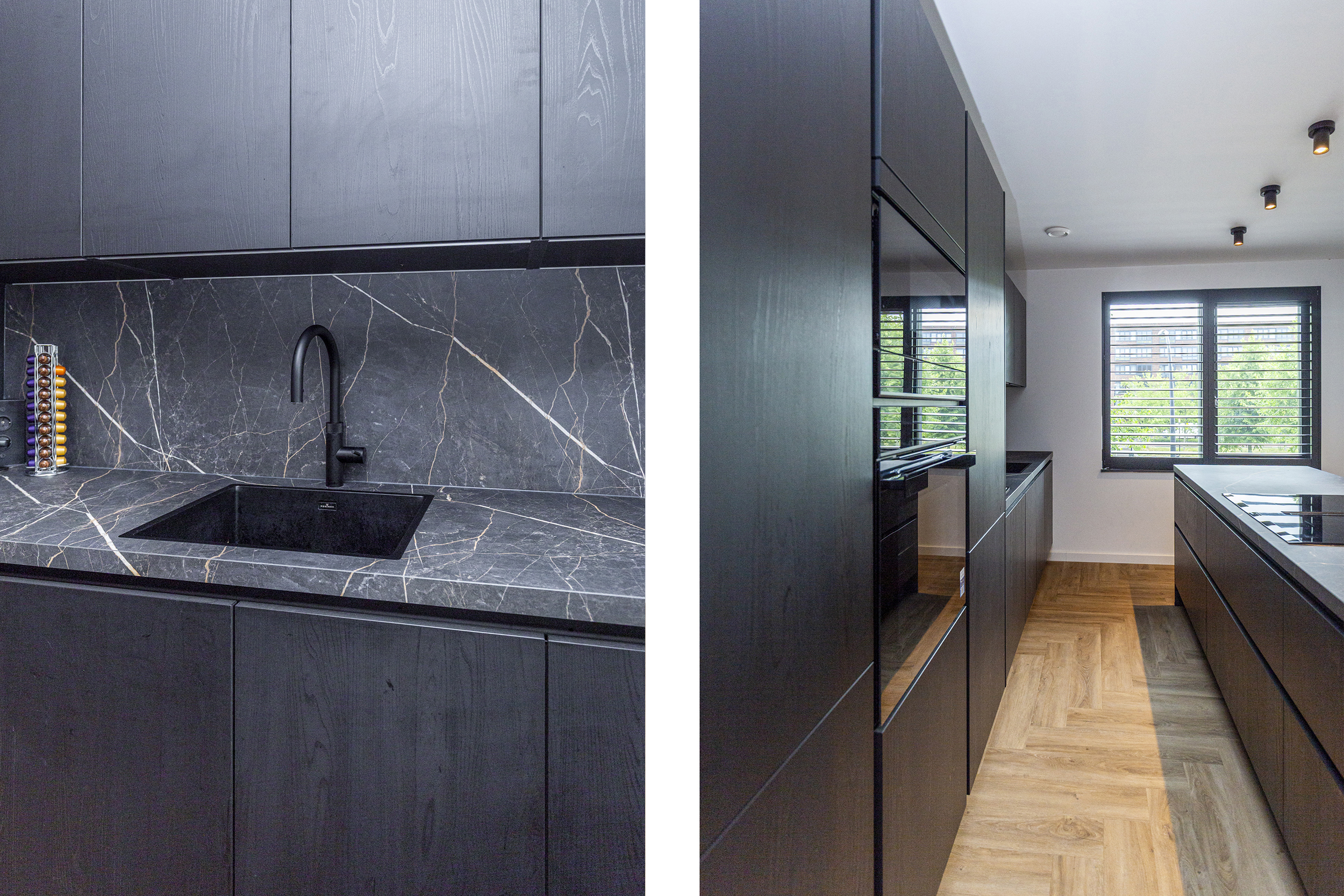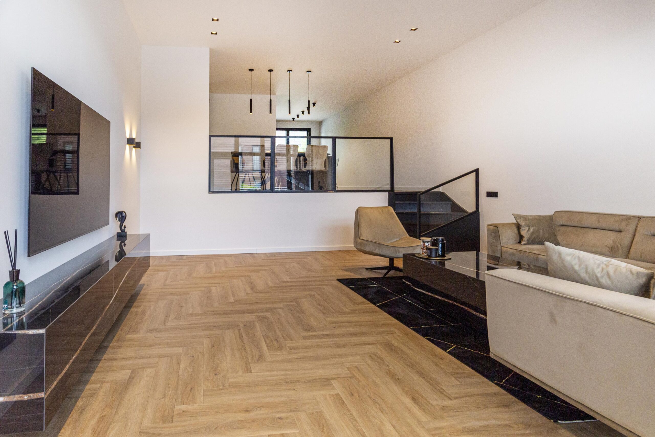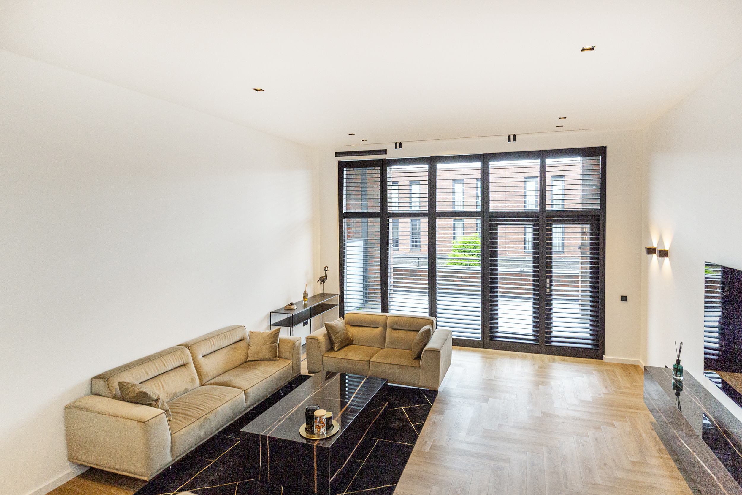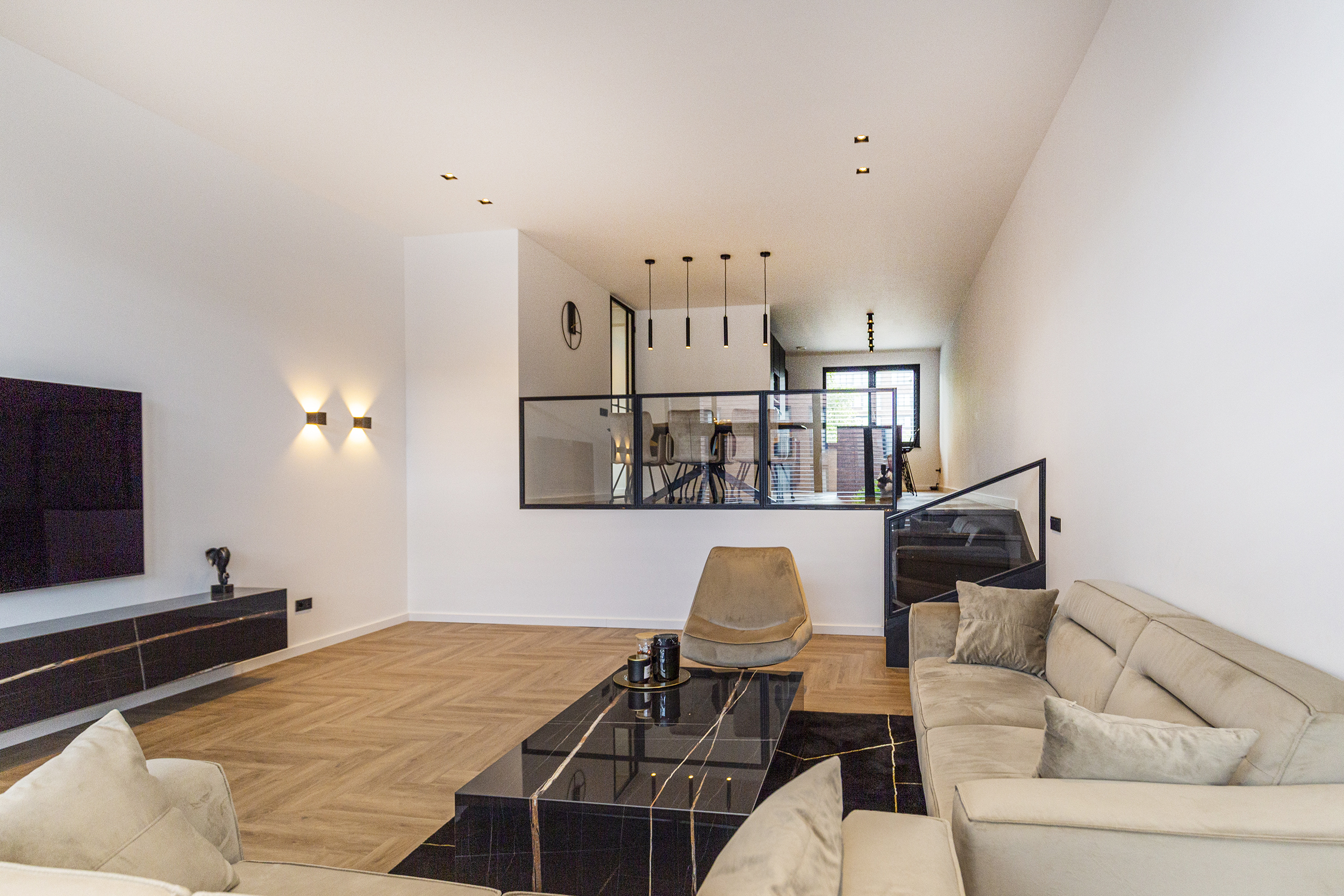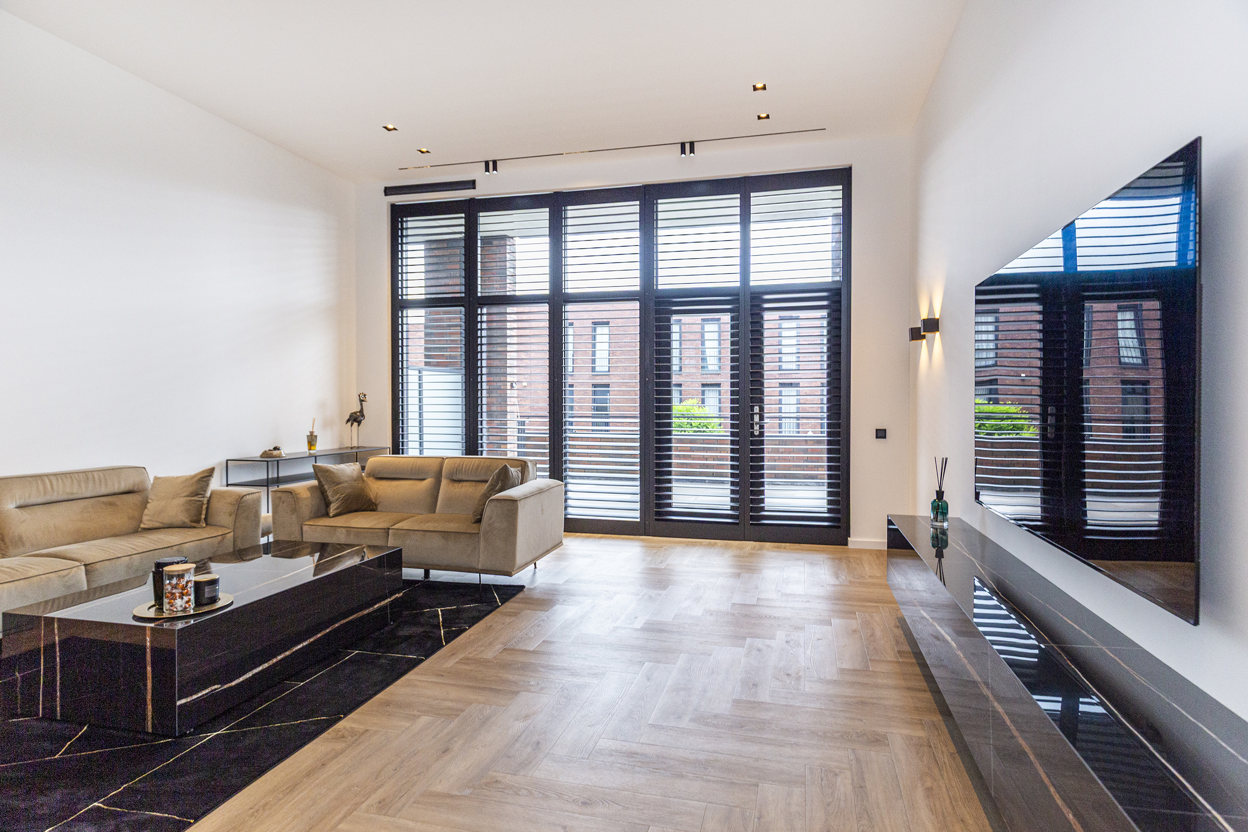 Vanuit de hal heeft u toegang tot de eetkamer. De open keuken is luxe afgewerkt met Siemens inbouwapparatuur, waaronder een combi oven-magnetron, vaatwasser, Quooker en inductiekookplaat met afzuiging geïntegreerd in de kookplaat. Het kookeiland met barretje biedt een gezellige plek om te koken en te ontspannen. De woonkamer is een opvallend ruime en lichte ruimte, dankzij de riante raampartijen. Het verlaagde plafond is voorzien van inbouwspots en moderne railverlichting. De woning is verder luxe afgewerkt met shutters in zowel de woonkamer als de keuken, wat de sfeer van het geheel versterkt.