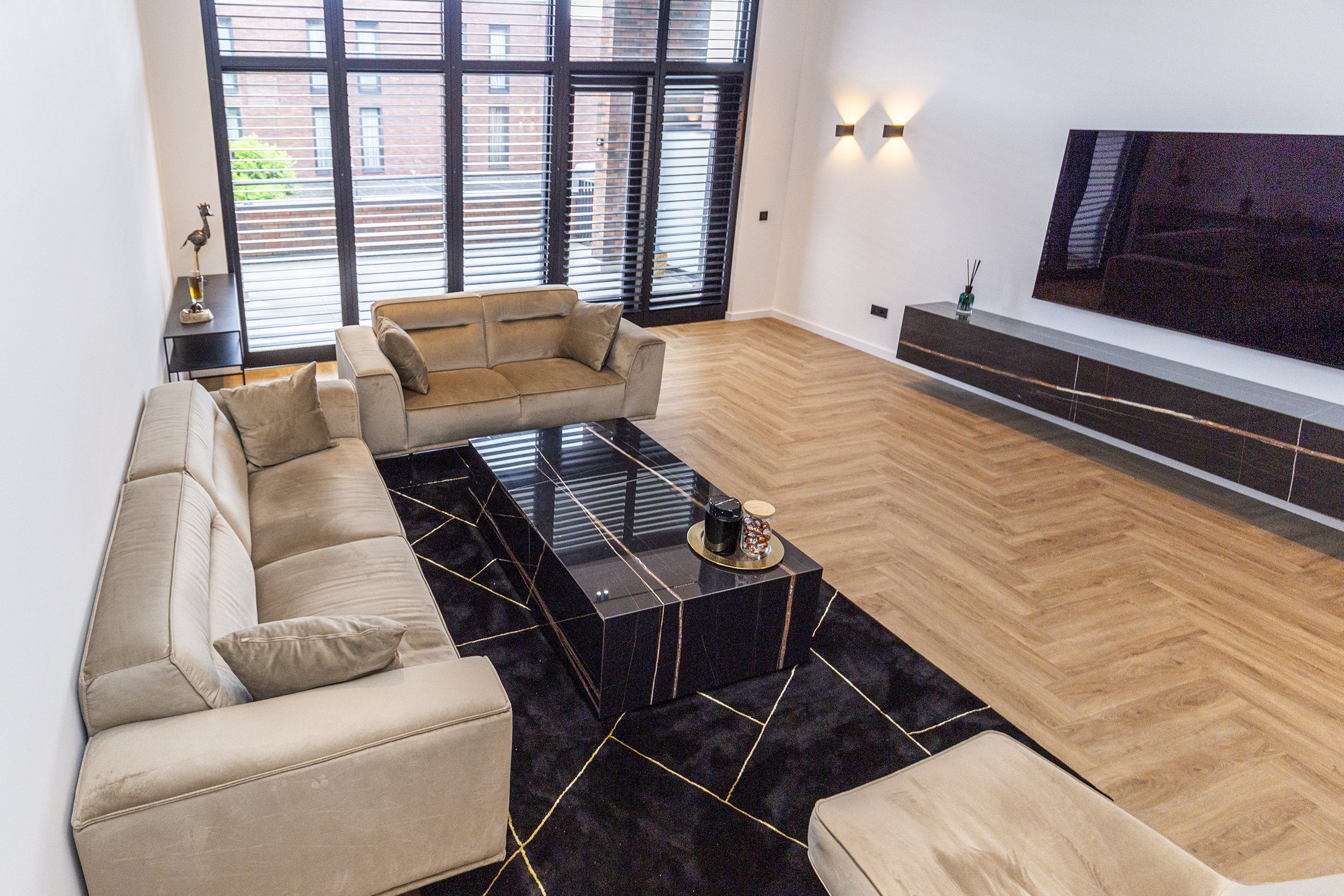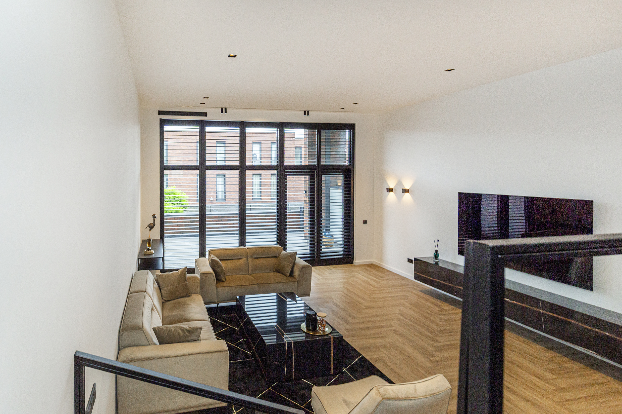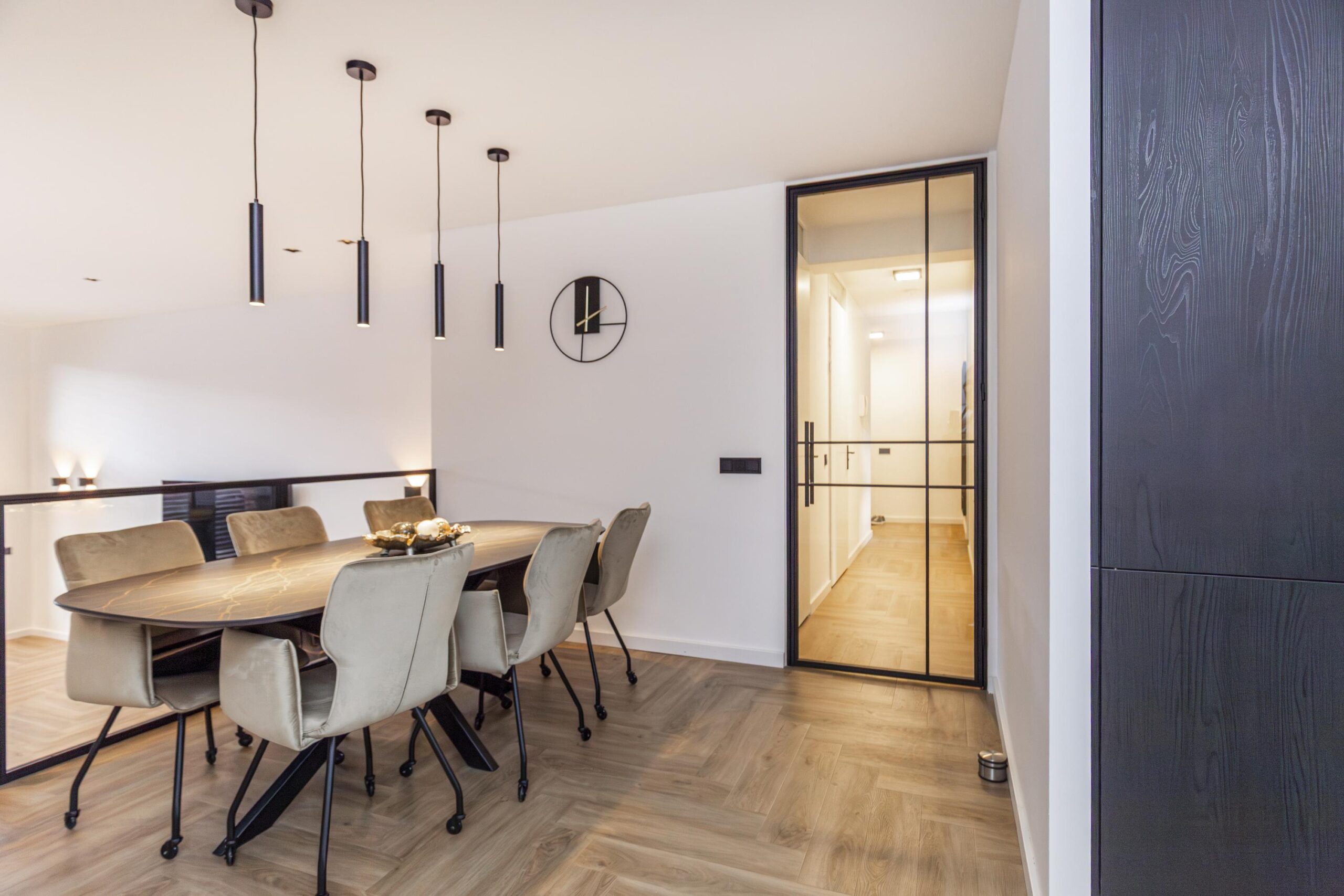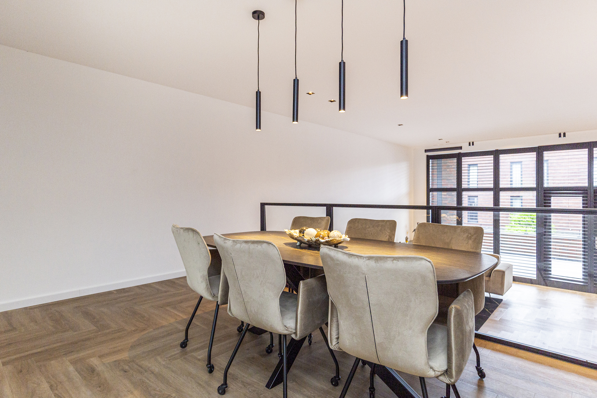 Vanuit de hal heeft u toegang tot de eetkamer. De open keuken is luxe afgewerkt met Siemens inbouwapparatuur, waaronder een combi oven-magnetron, vaatwasser, Quooker en inductiekookplaat met afzuiging geïntegreerd in de kookplaat. Het kookeiland met barretje biedt een gezellige plek om te koken en te ontspannen. De woonkamer is een opvallend ruime en lichte ruimte, dankzij de riante raampartijen. Het verlaagde plafond is voorzien van inbouwspots en moderne railverlichting. De woning is verder luxe afgewerkt met shutters in zowel de woonkamer als de keuken, wat de sfeer van het geheel versterkt.