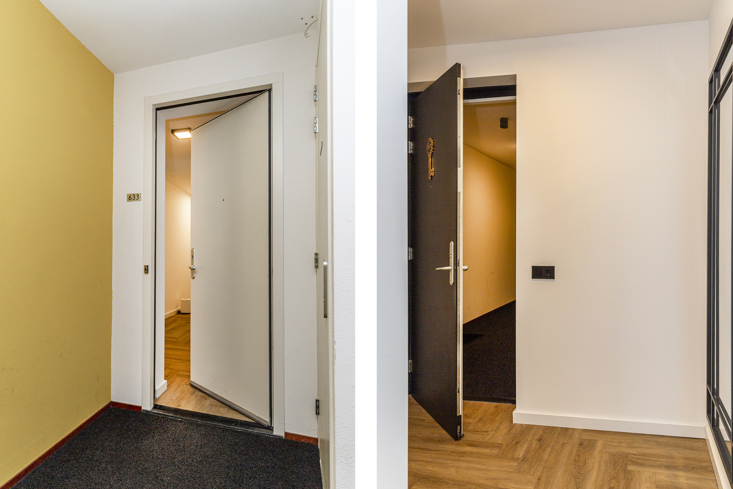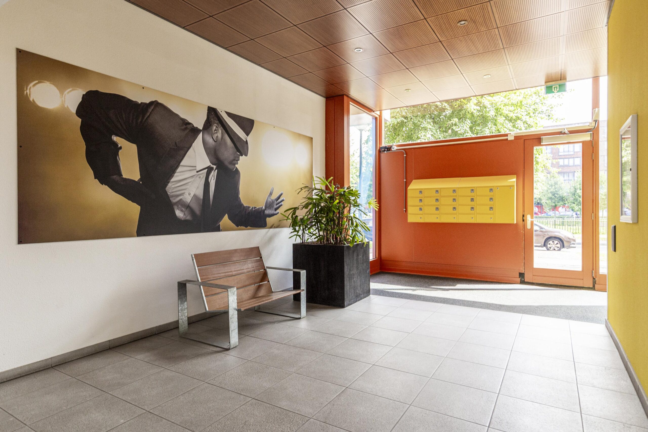 Bij binnenkomst in de centrale hal bevindt zich het bellentableau en heeft u de keuze om via de trap of de lift naar de eerste verdieping te gaan.
