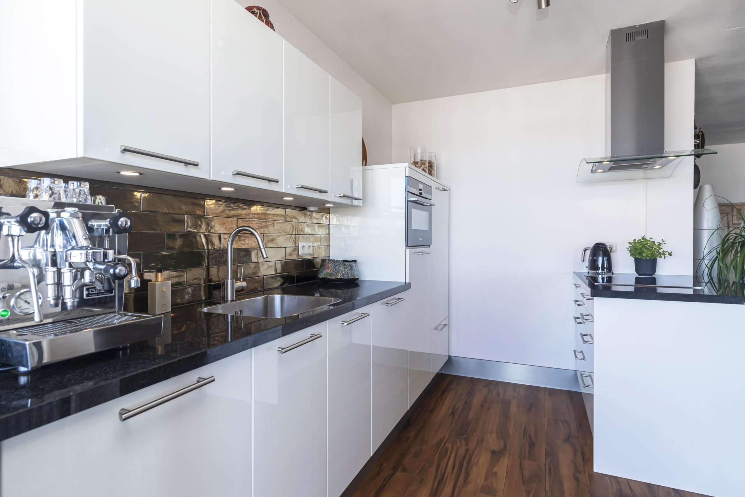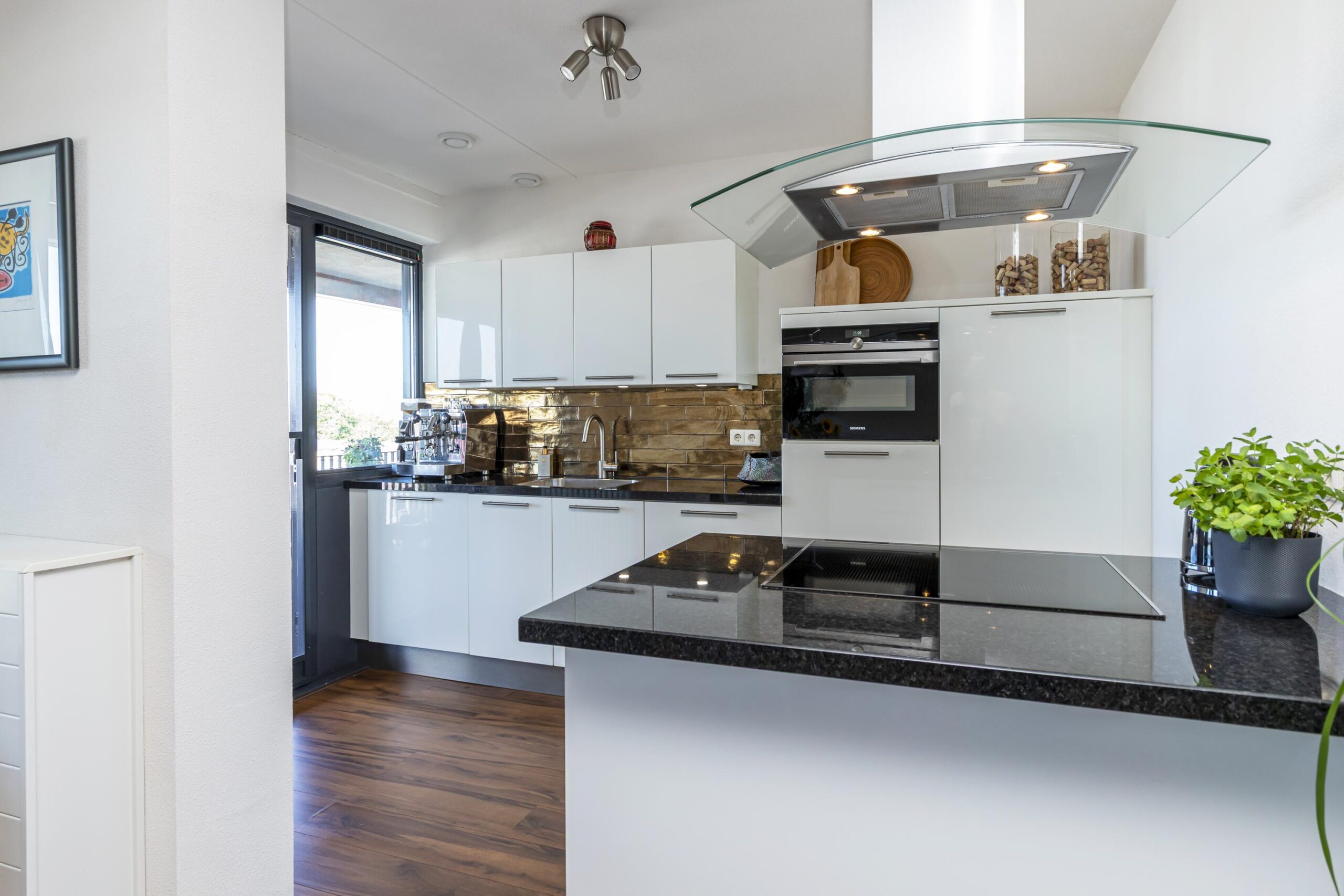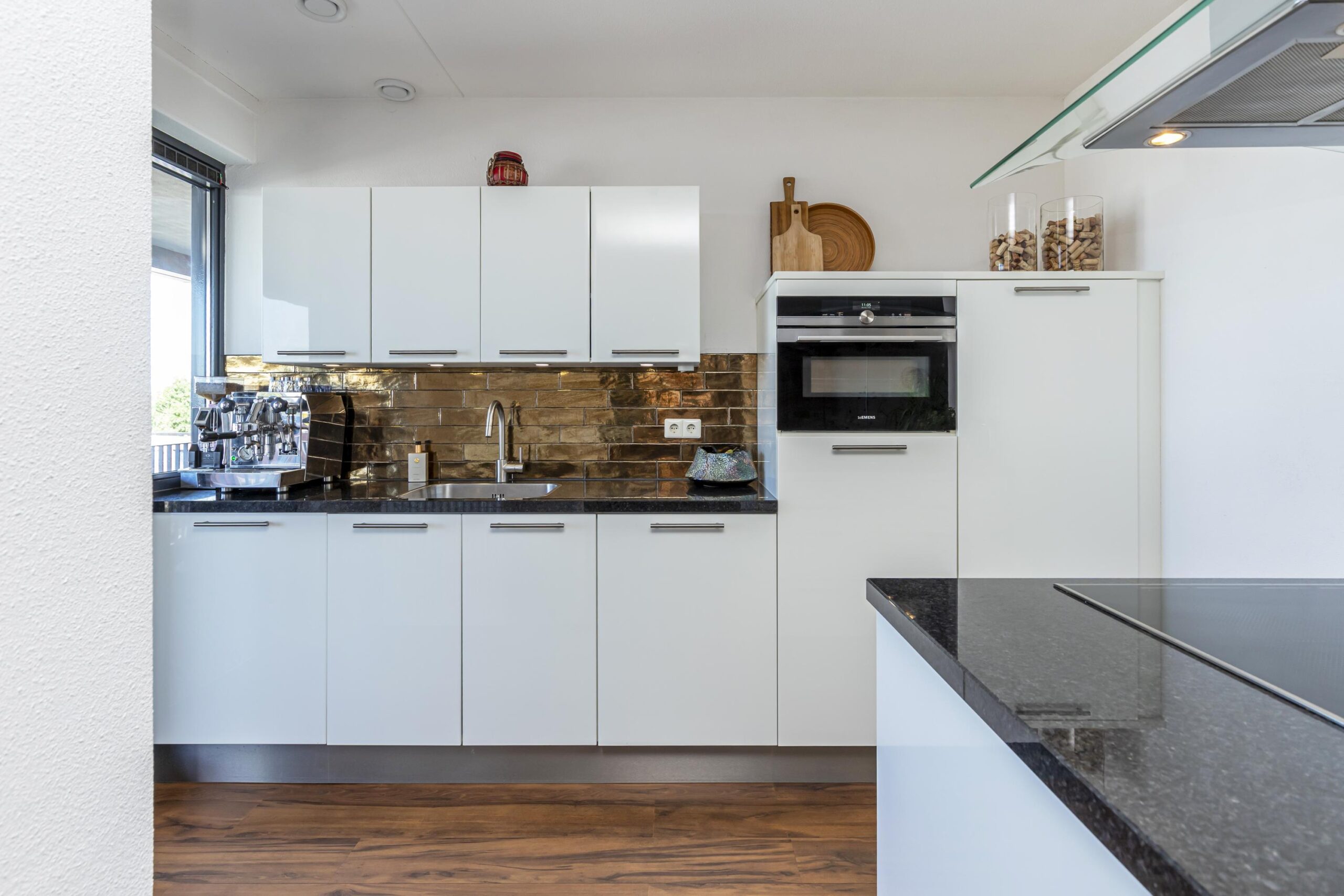 Via de entree stap je binnen in een ruime hal met toegang tot de meterkast, een modern toilet met fontein en een praktische bergkast. Vervolgens kom je in de lichte woon- en eetkamer met open keuken. De keuken is uitgerust met een natuurstenen werkblad en diverse inbouwapparatuur, waaronder een inductiekookplaat, vaatwasser, koelkast en vriezer. Vanuit de keuken bereik je het royale balkon. De woonkamer biedt genoeg plek voor zowel een ruime zithoek als een grote eettafel.