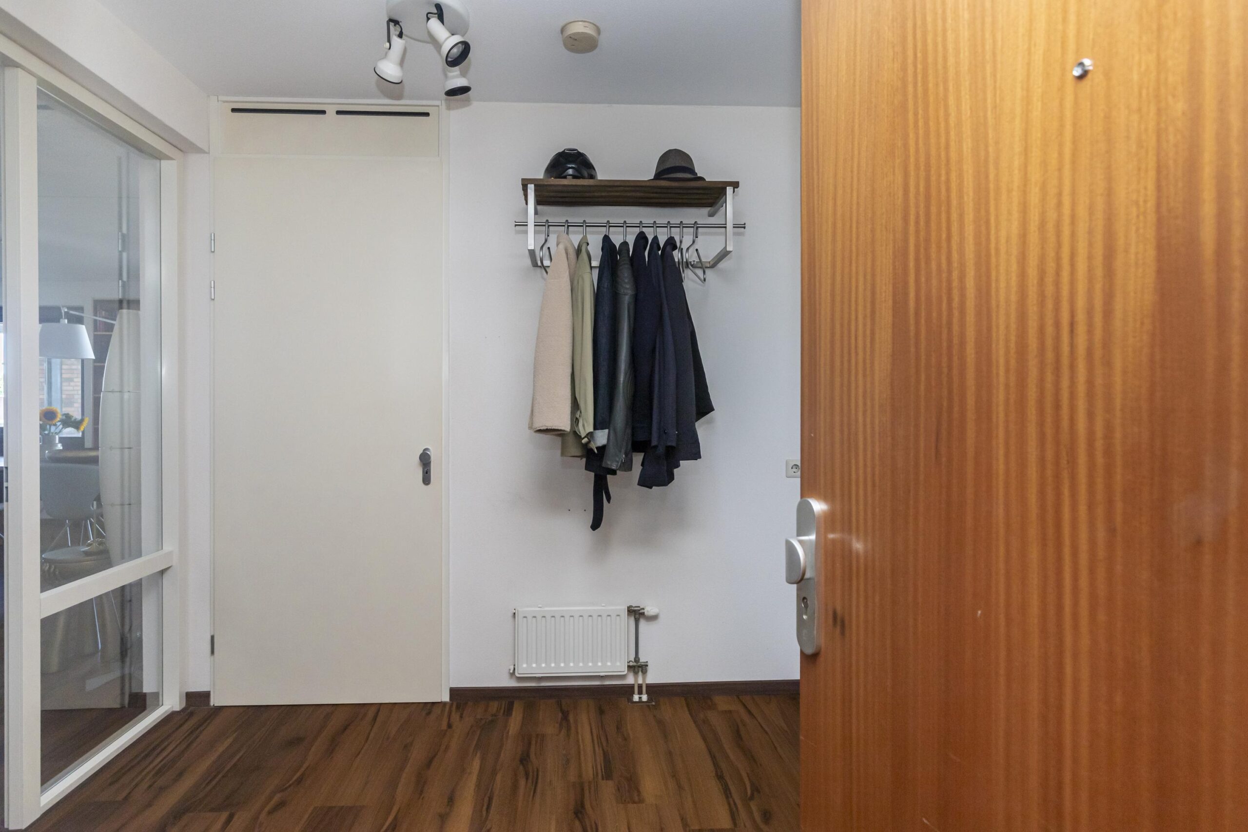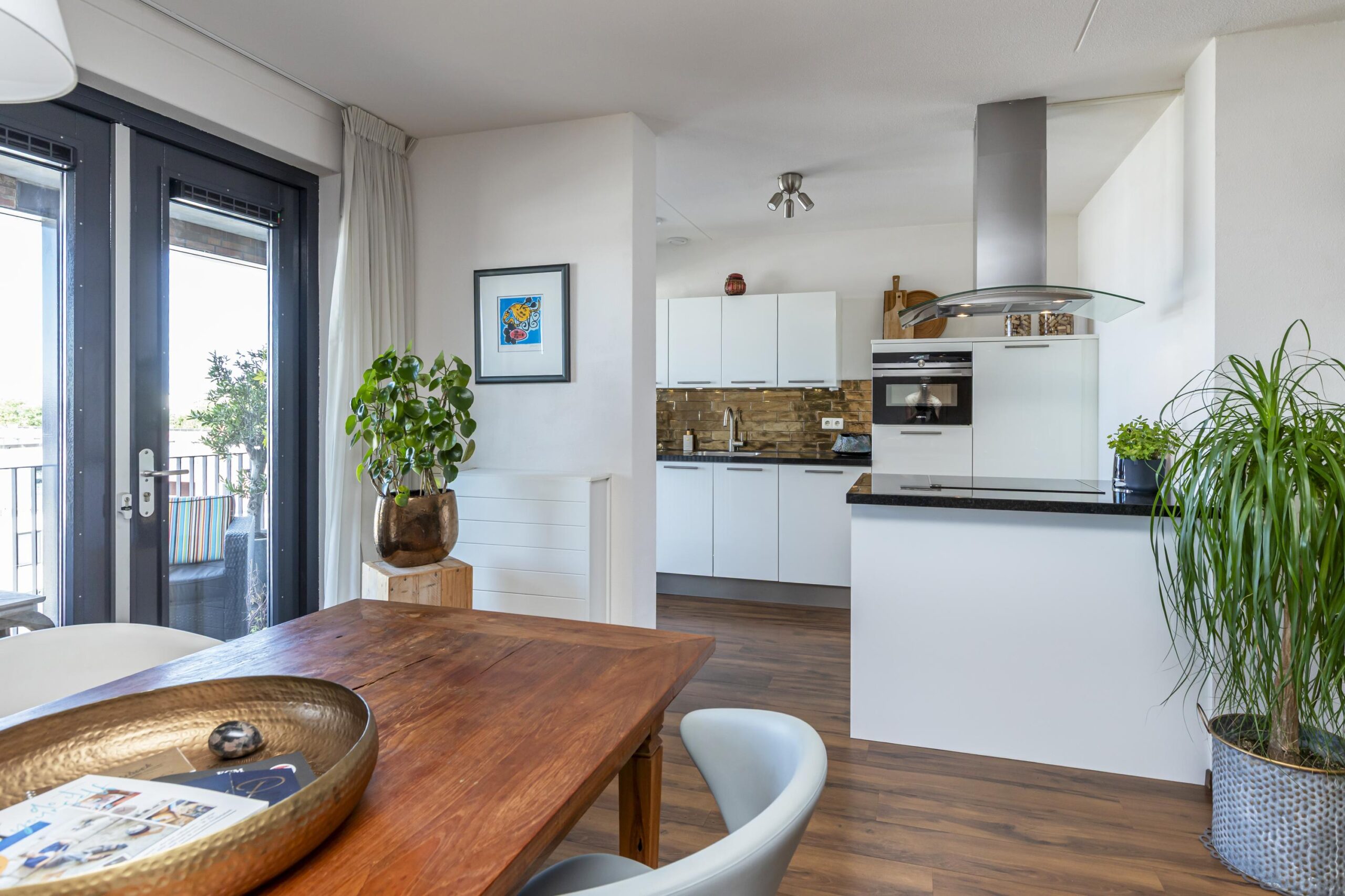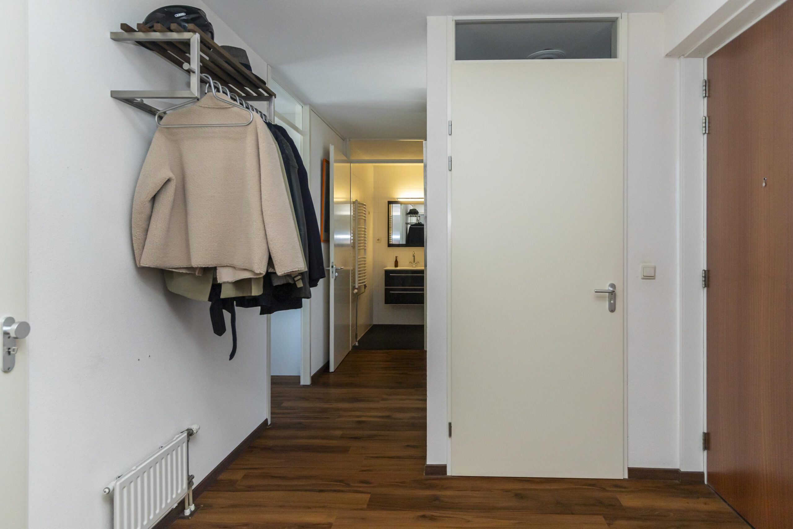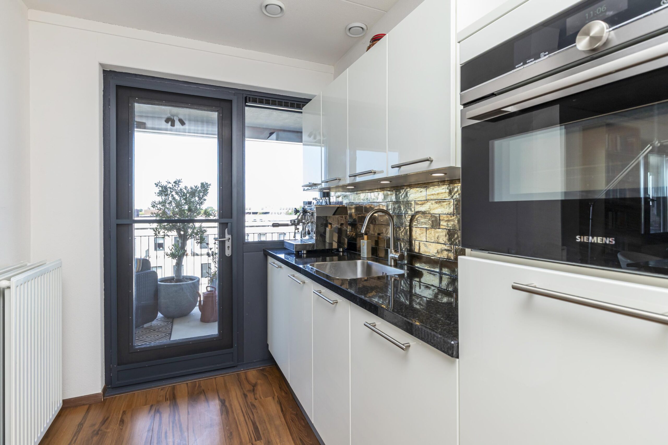 Via de entree stap je binnen in een ruime hal met toegang tot de meterkast, een modern toilet met fontein en een praktische bergkast. Vervolgens kom je in de lichte woon- en eetkamer met open keuken. De keuken is uitgerust met een natuurstenen werkblad en diverse inbouwapparatuur, waaronder een inductiekookplaat, vaatwasser, koelkast en vriezer. Vanuit de keuken bereik je het royale balkon. De woonkamer biedt genoeg plek voor zowel een ruime zithoek als een grote eettafel.