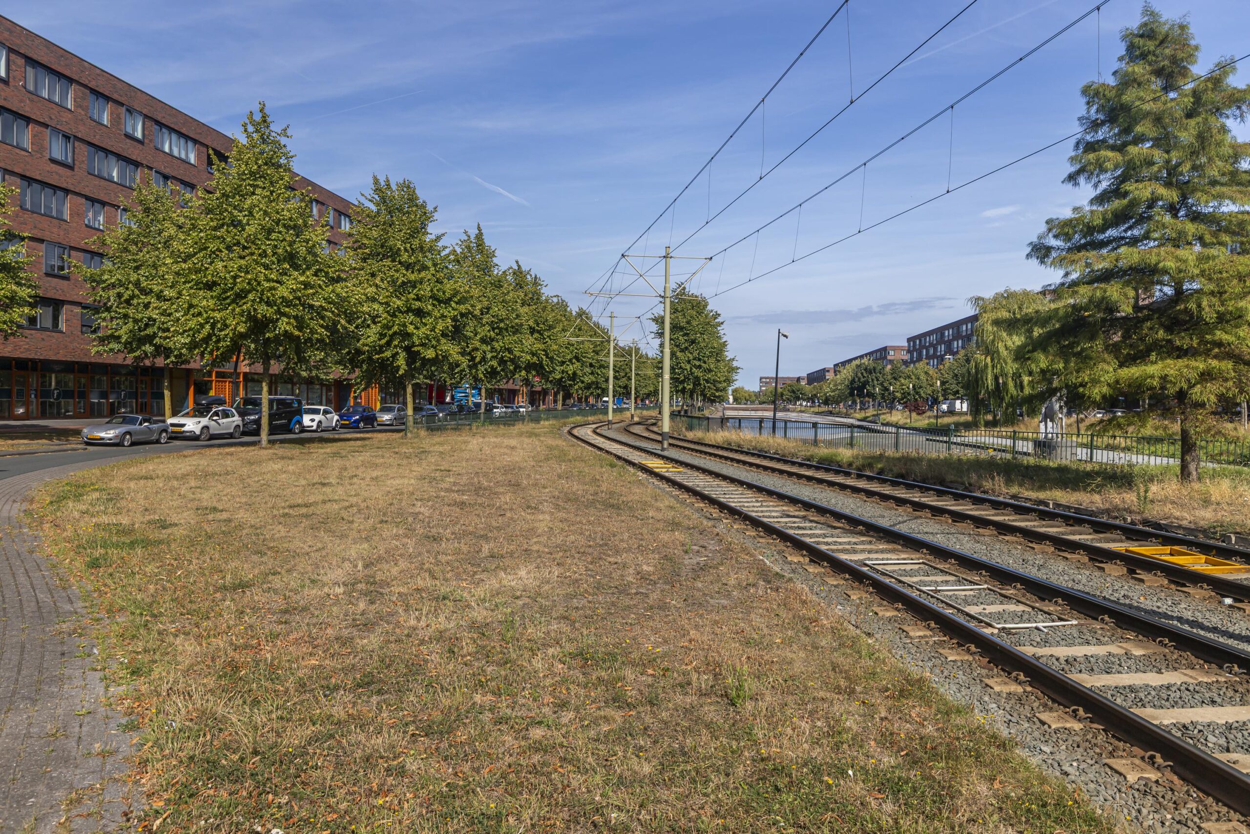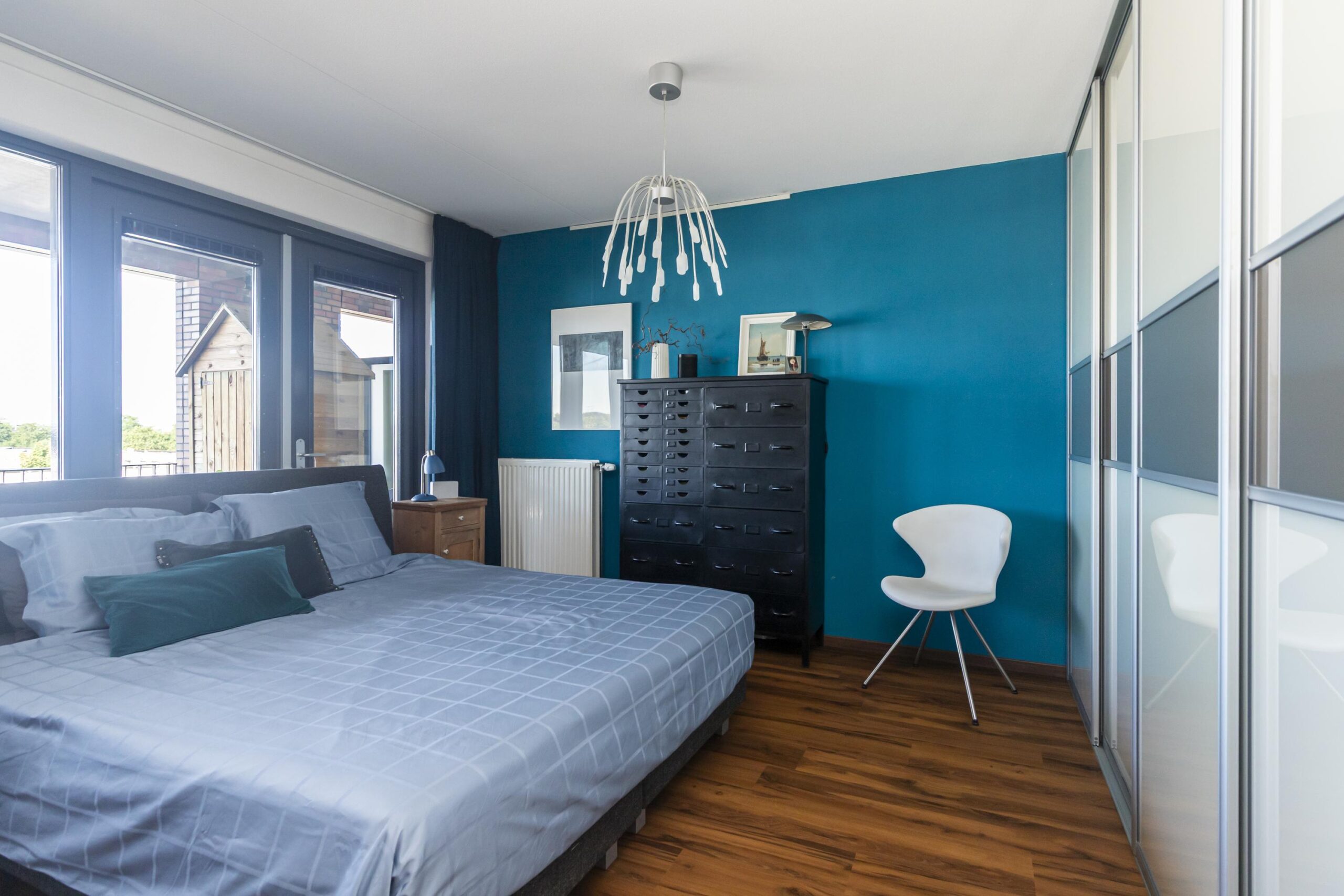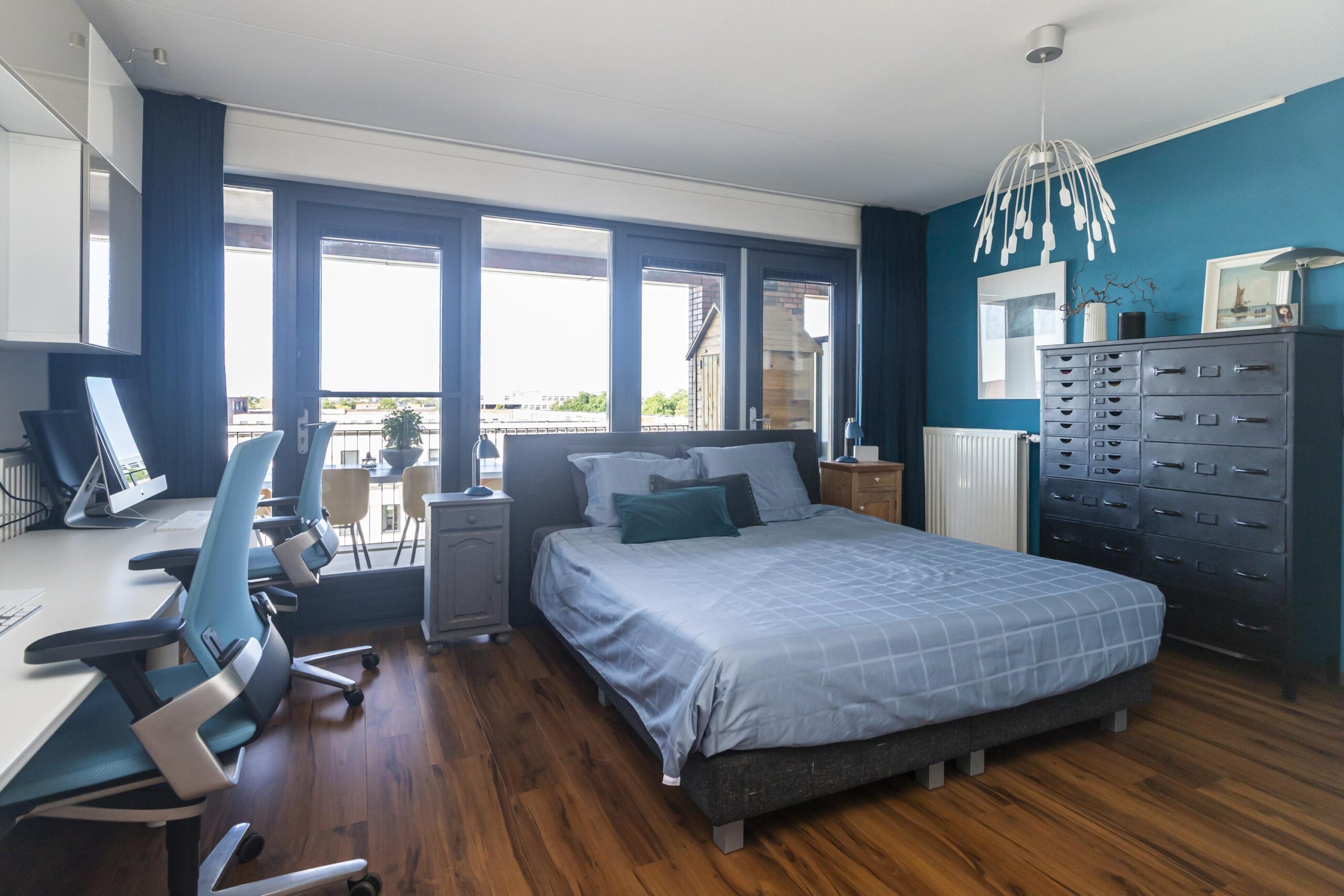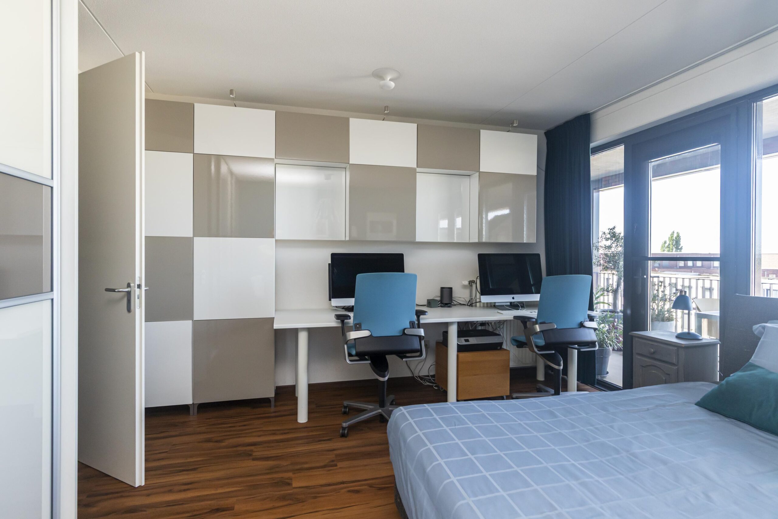 De slaapkamer bevindt zich aan de achterzijde en beschikt over een werkplek en een vaste kastenwand. Wil je een gescheiden werkplek? Dan kun je de kamer eenvoudig opdelen met bijvoorbeeld een glazen wand, zodat er een fijne werkhoek ontstaat zonder verlies van licht.