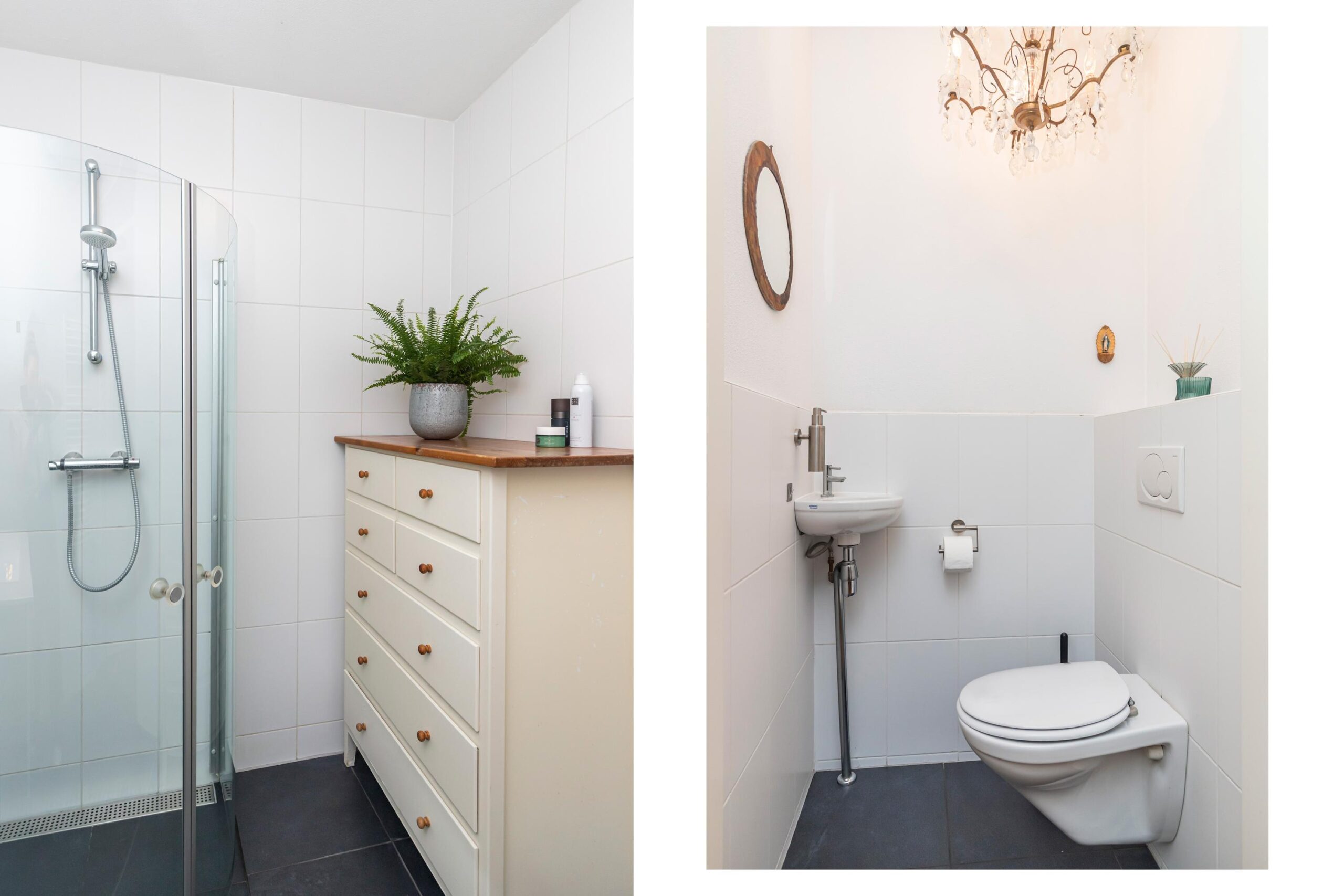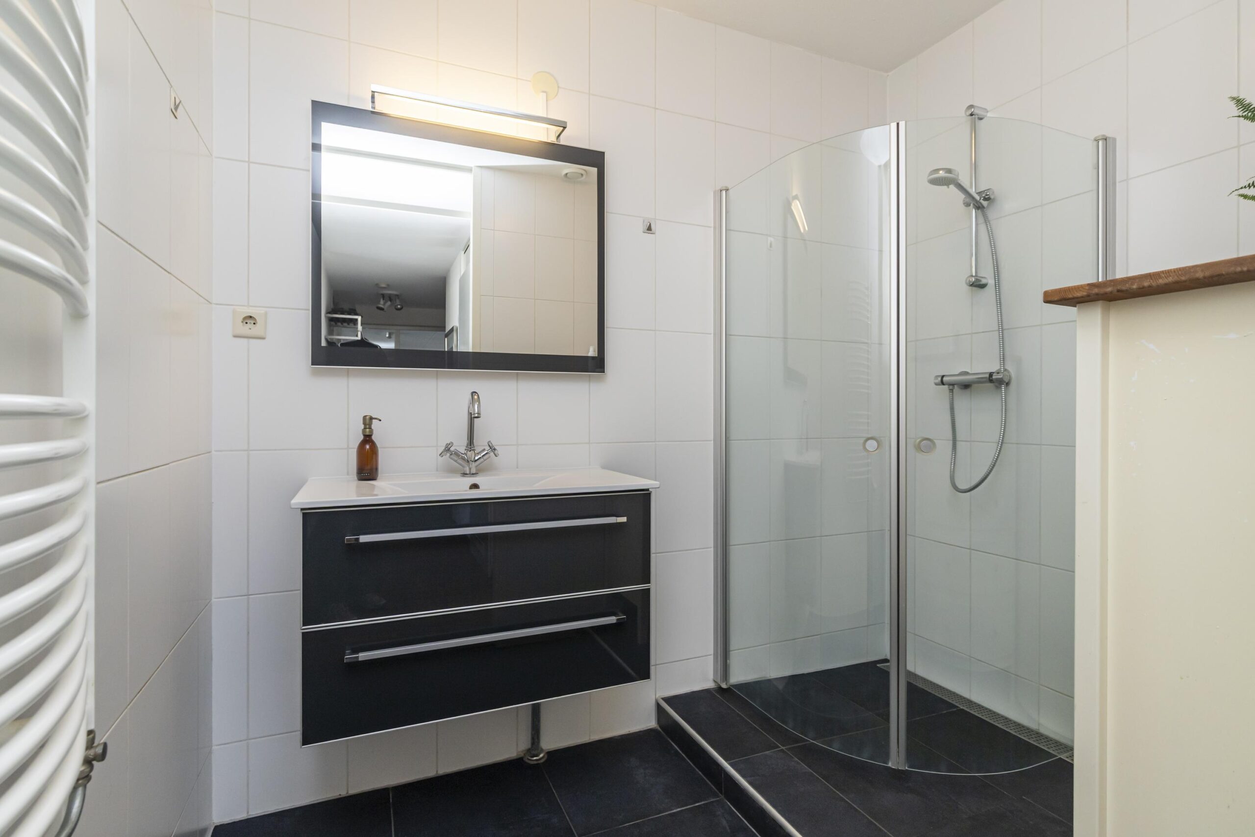 De badkamer is netjes afgewerkt en voorzien van een douche, wastafelmeubel en radiator. Ook is er een aparte ruimte voor wasmachine, droger en mechanische ventilatie.