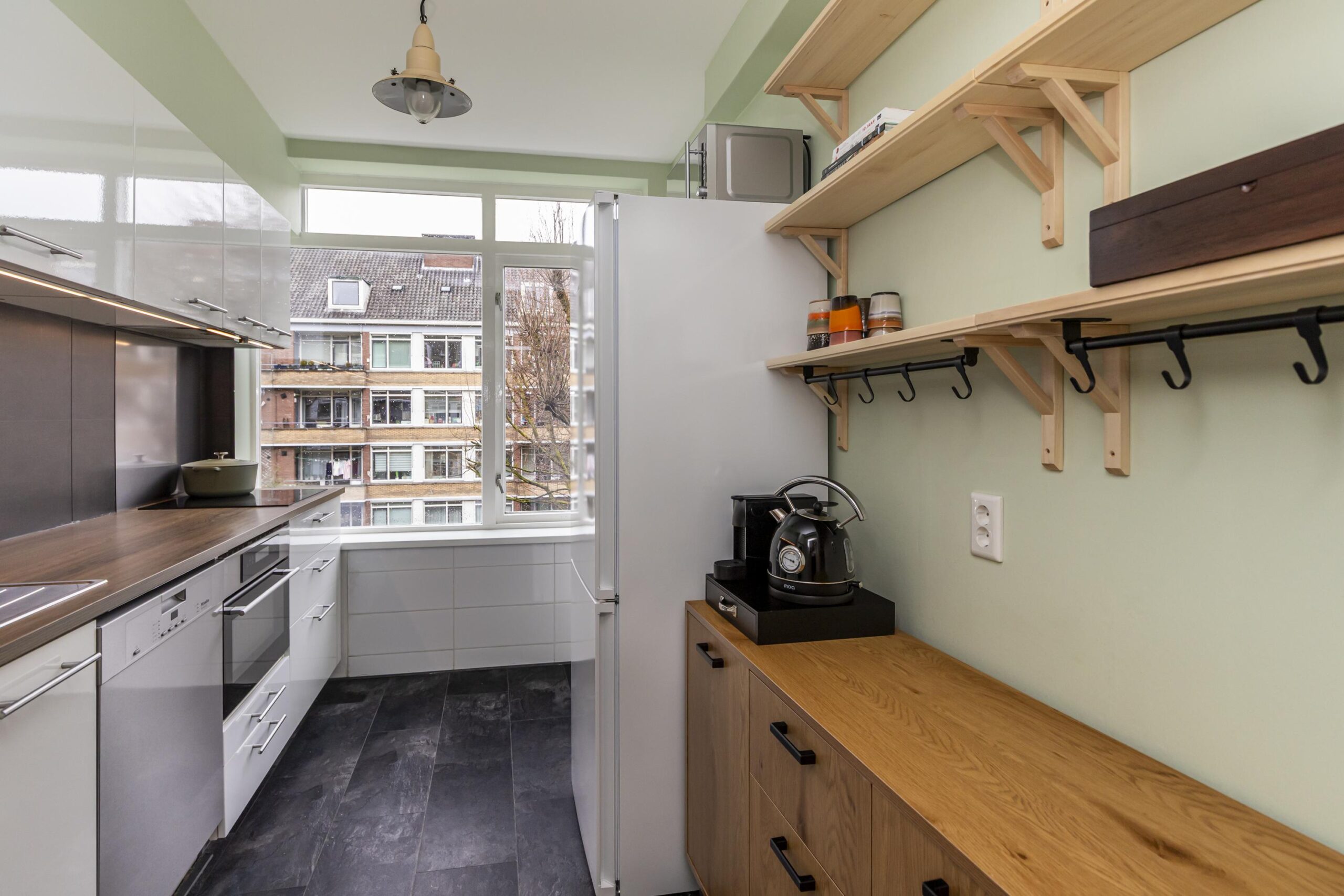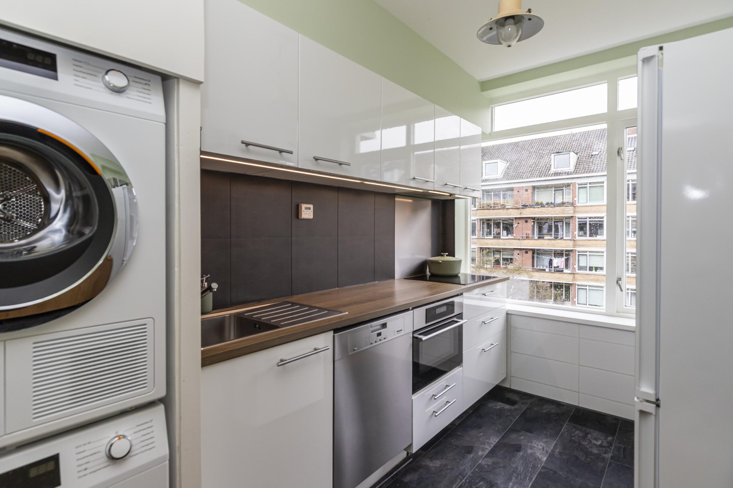 De moderne keuken is voorzien van inbouwapparatuur als een 4 pits inductie kookplaat, vaatwasser en een combi-oven. Tevens vindt u de opstelplaats voor de wasmachine en droger keurig weggewerkt in de keuken, zodat u hier geen hinder van ervaart. Het balkon aan de achterzijde van de woning is toegankelijk vanuit de keuken.