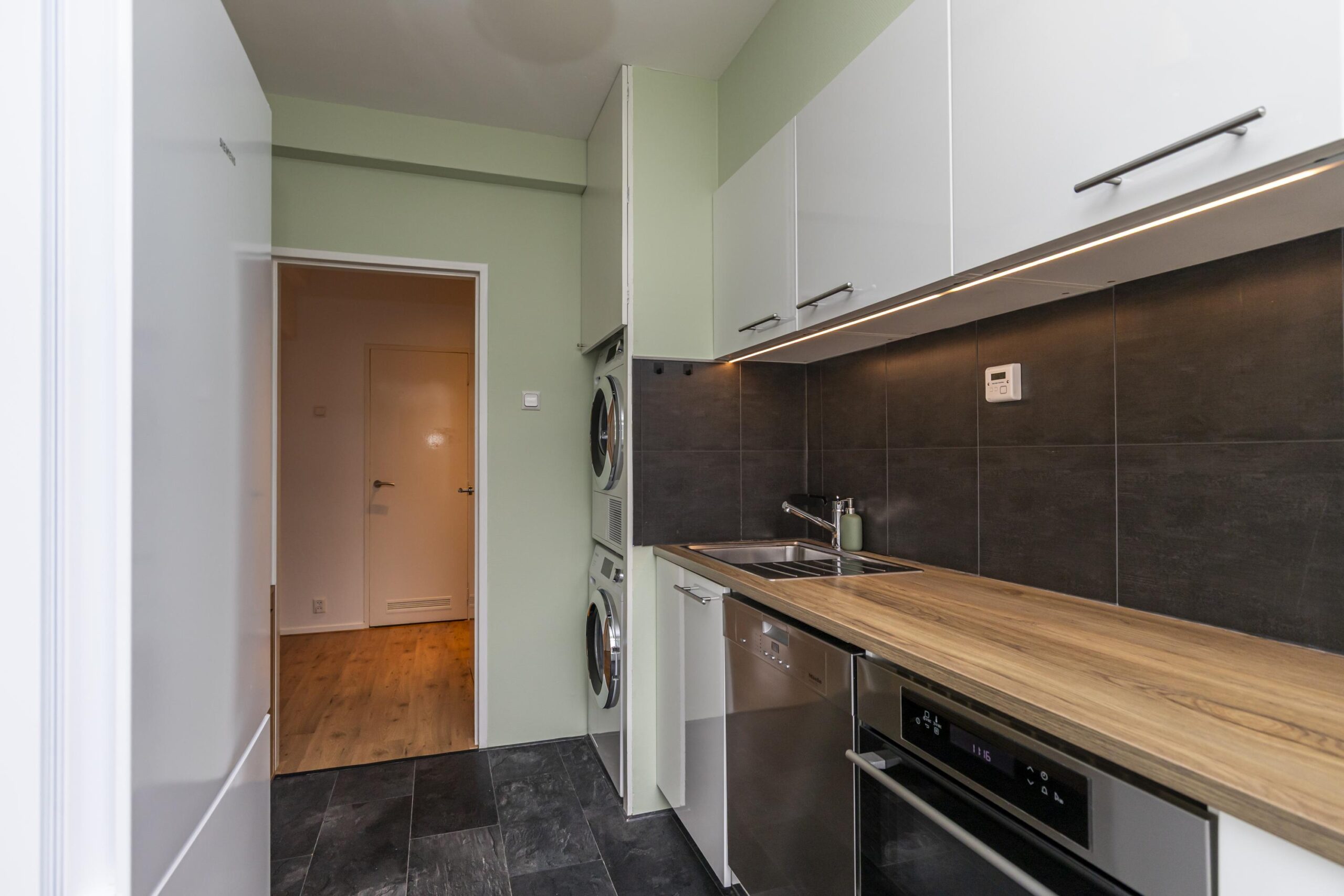 The modern kitchen is equipped with built-in appliances such as a 4-burner induction hob, dishwasher and combination oven. The washing machine and dryer are neatly hidden in the kitchen, so you won't be bothered by them. The balcony at the rear of the house can be accessed from the kitchen.