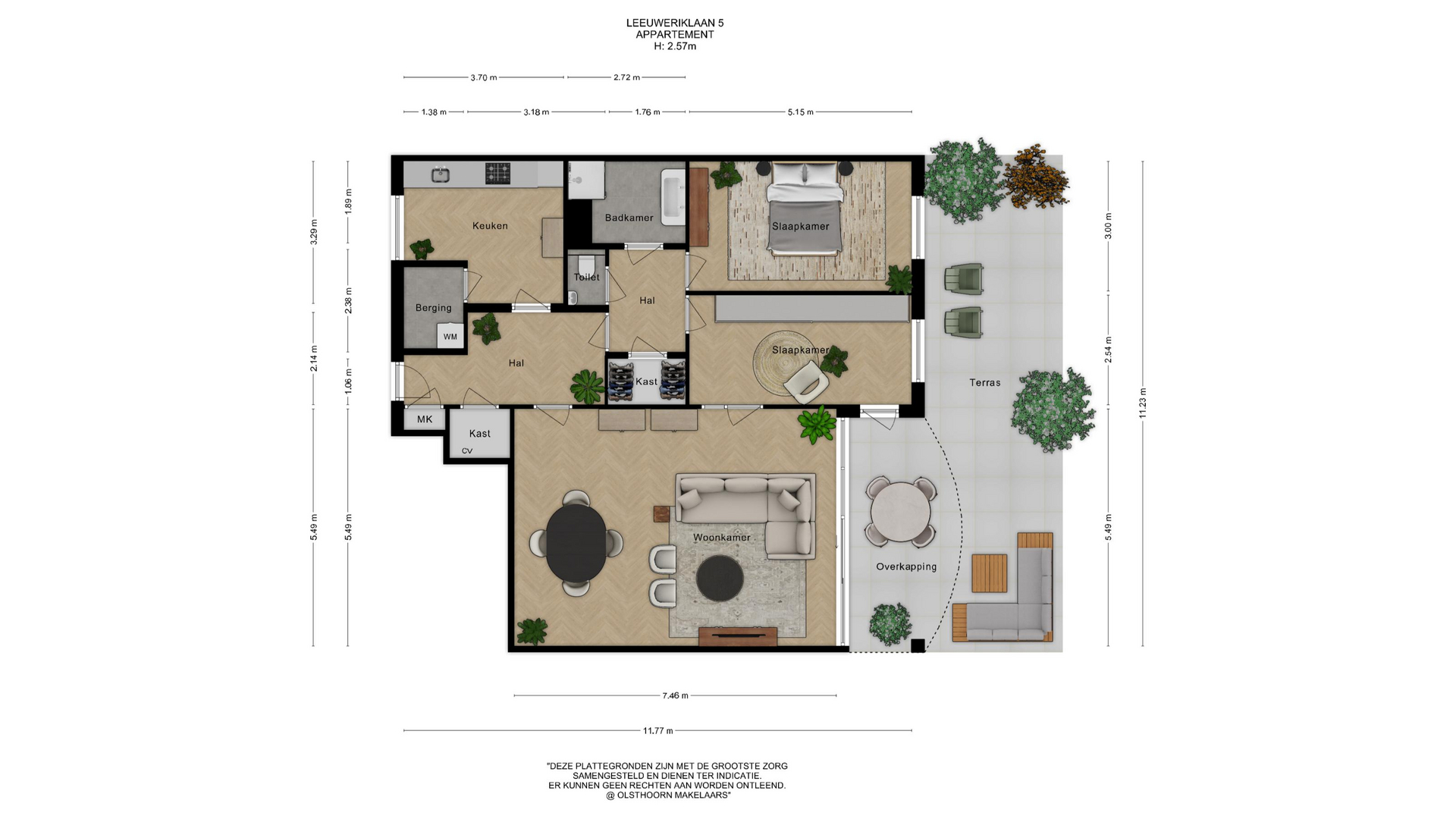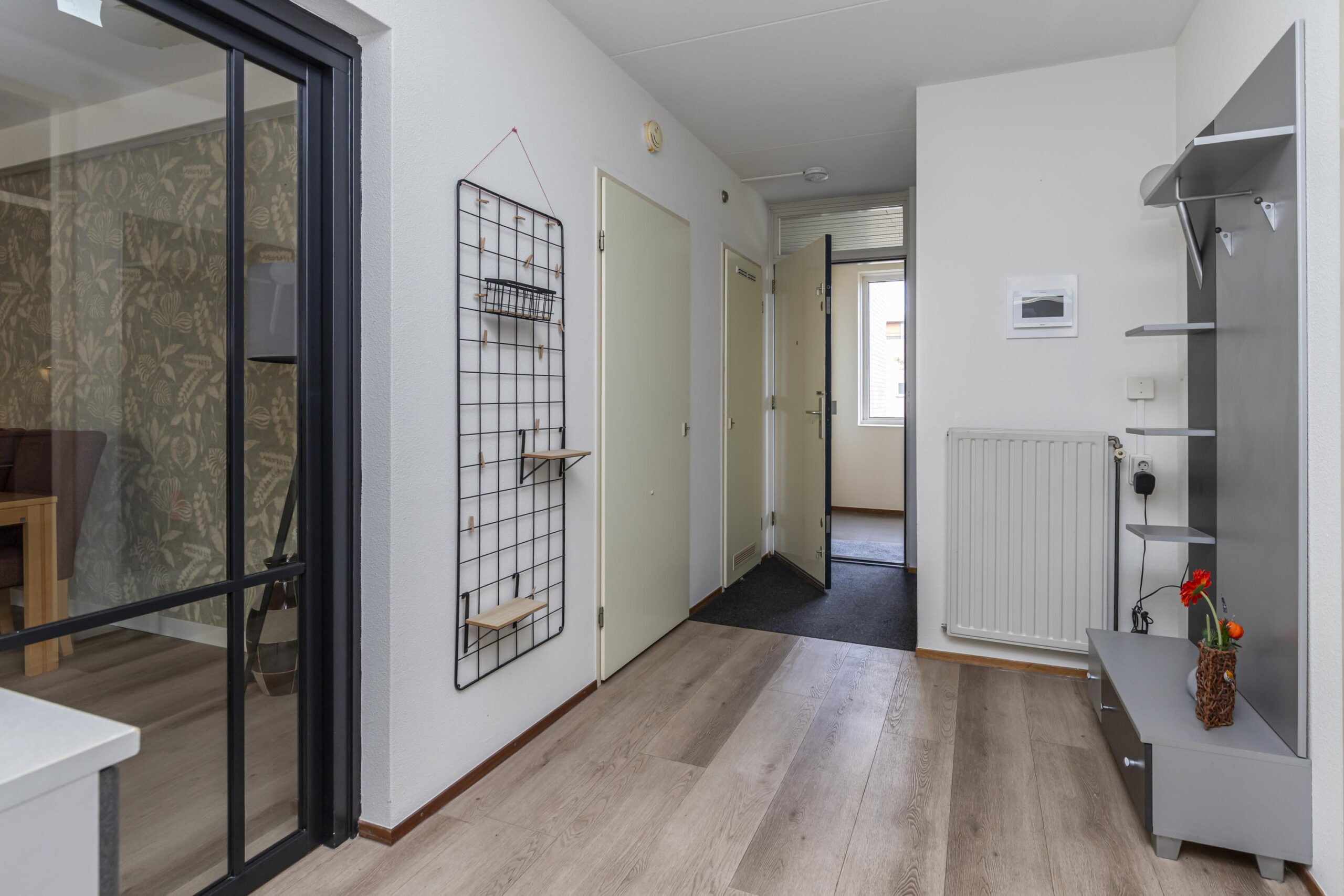 Je komt binnen in een ruime hal met garderobe, meterkast en een aparte kast met de cv-installatie. Vanuit hier stap je de centrale gang in, die toegang geeft tot de rest van het appartement.