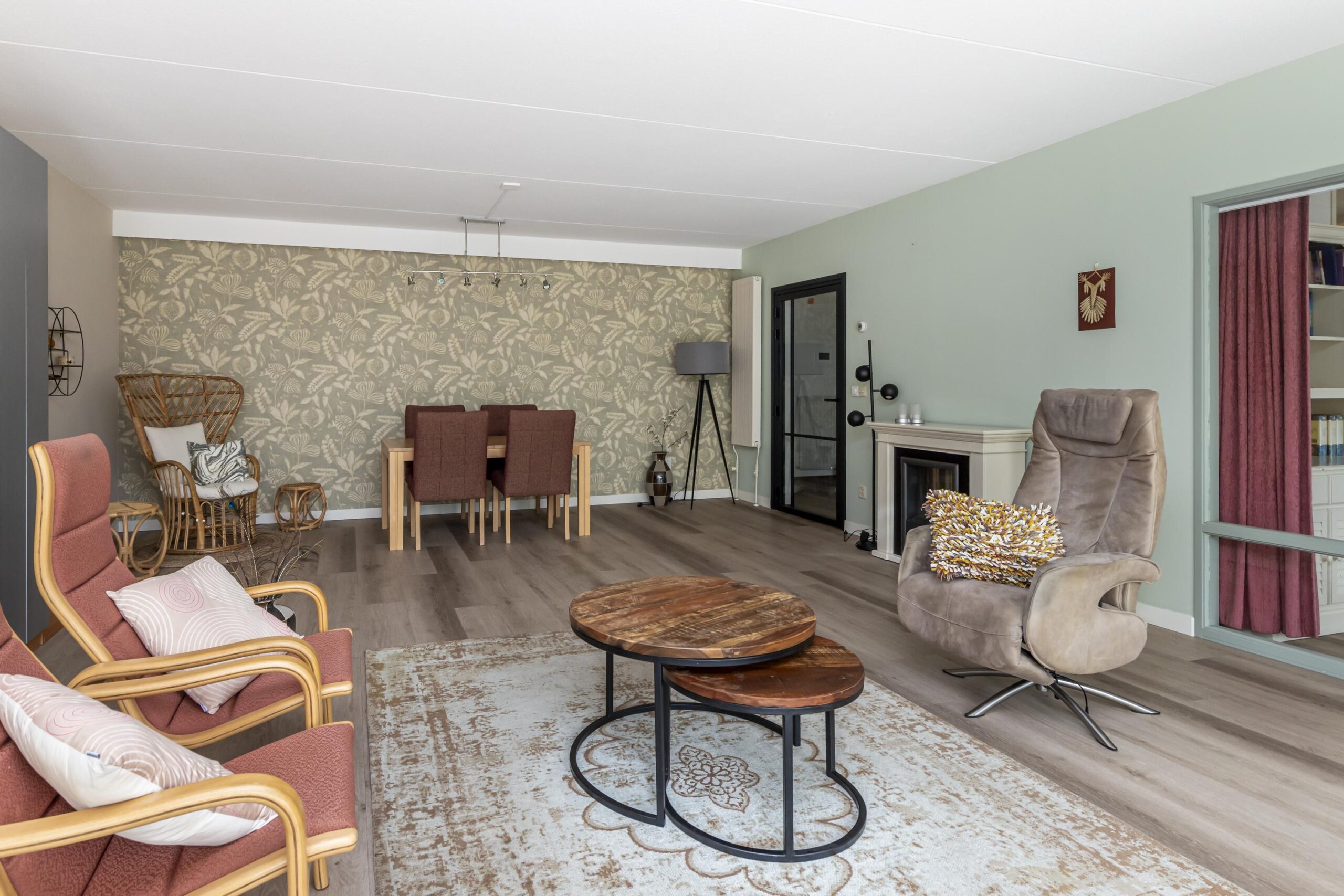 Aan de voorzijde ligt de lichte woonkamer, met meer dan genoeg ruimte voor een zit- én eethoek. Grote ramen zorgen voor veel daglicht en via de schuifpui bereik je de overkapte buitenruimte die doorloopt naar een ruim terras. Hier kun je de hele dag van de zon en het uitzicht op het omliggende groen.