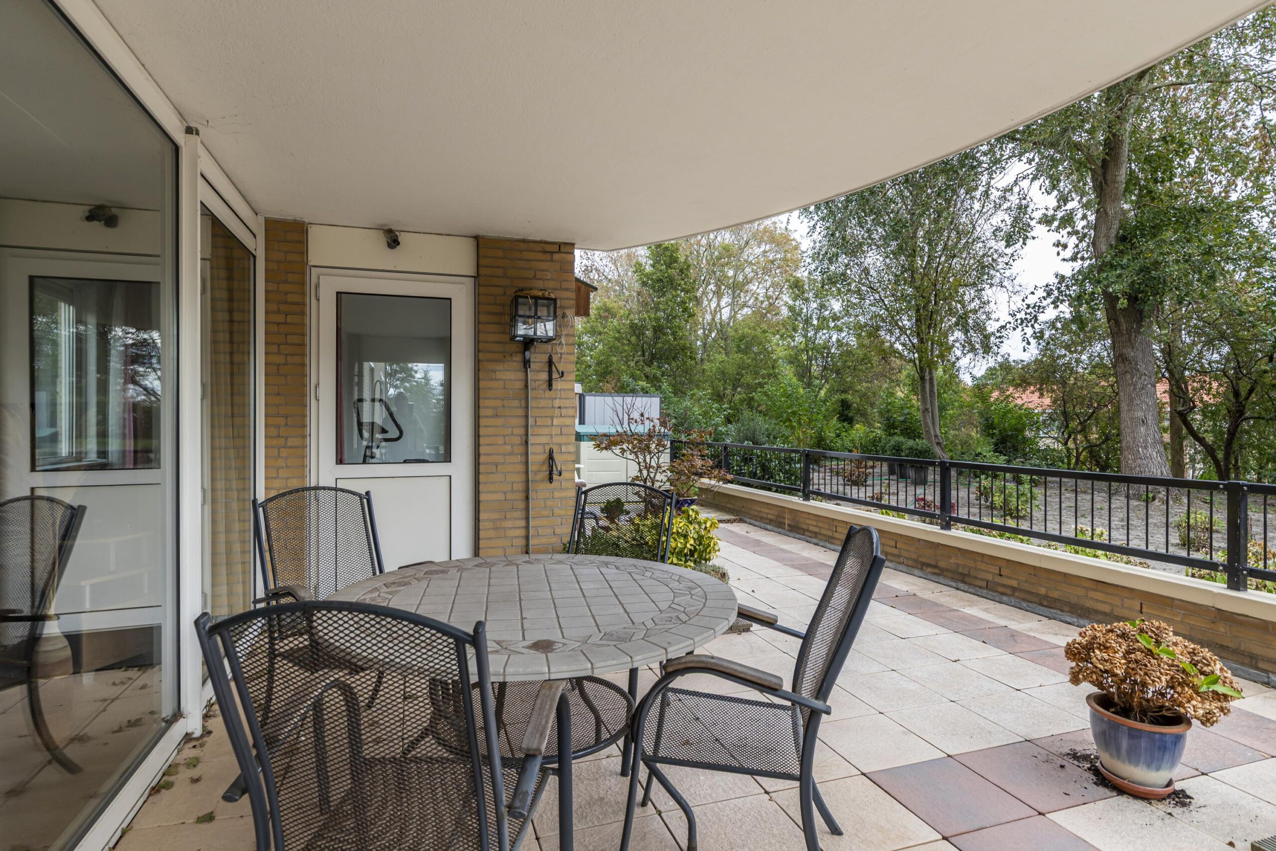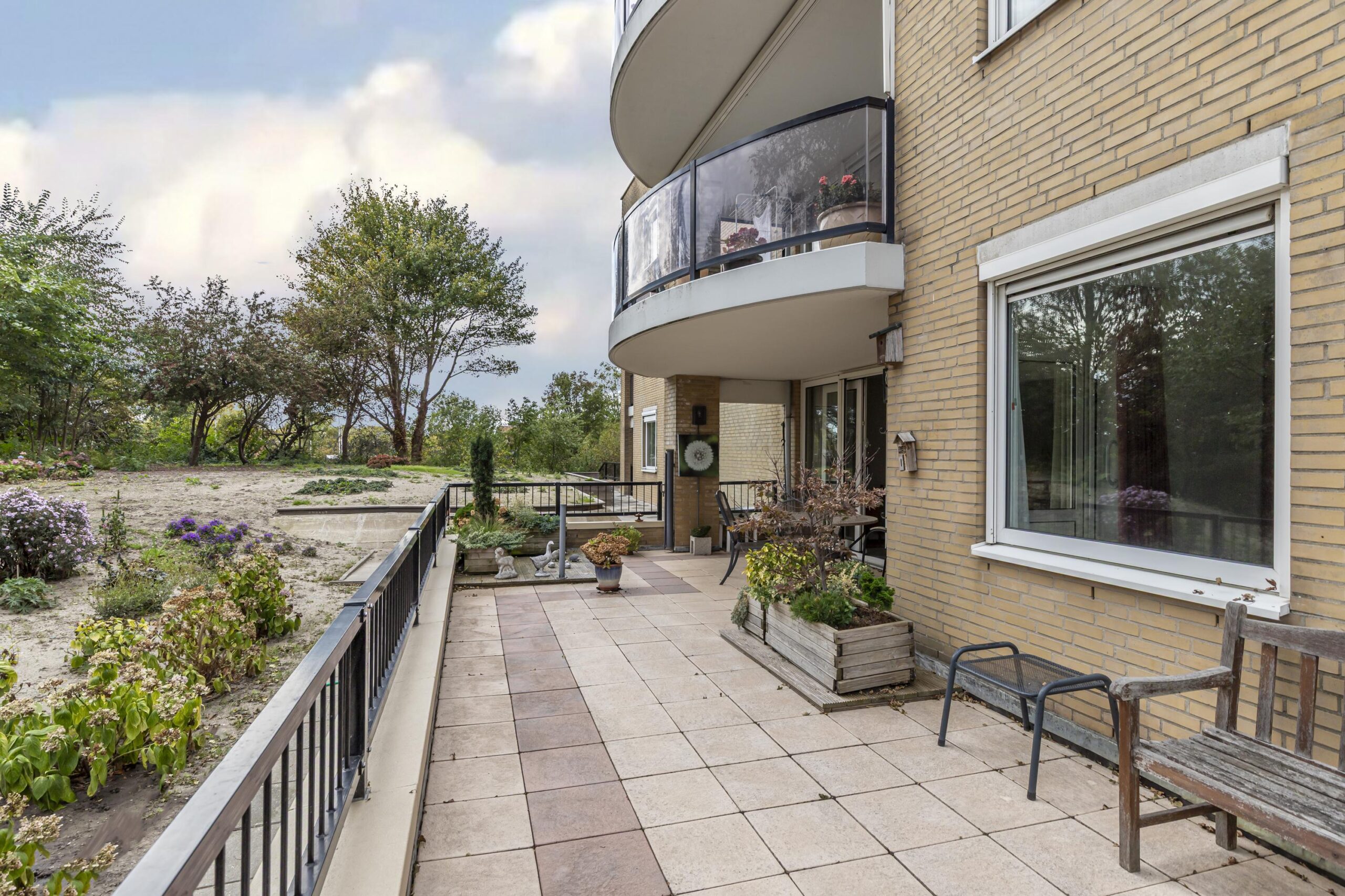 Het dakterras is ruim en deels overkapt — een fijne buitenplek die direct vanuit de woonkamer en slaapkamer te betreden is. Dankzij de ligging op het zuiden en direct grenzend aan een groenvoorziening (bovenop de bunker) geniet je hier de hele dag van de zon.