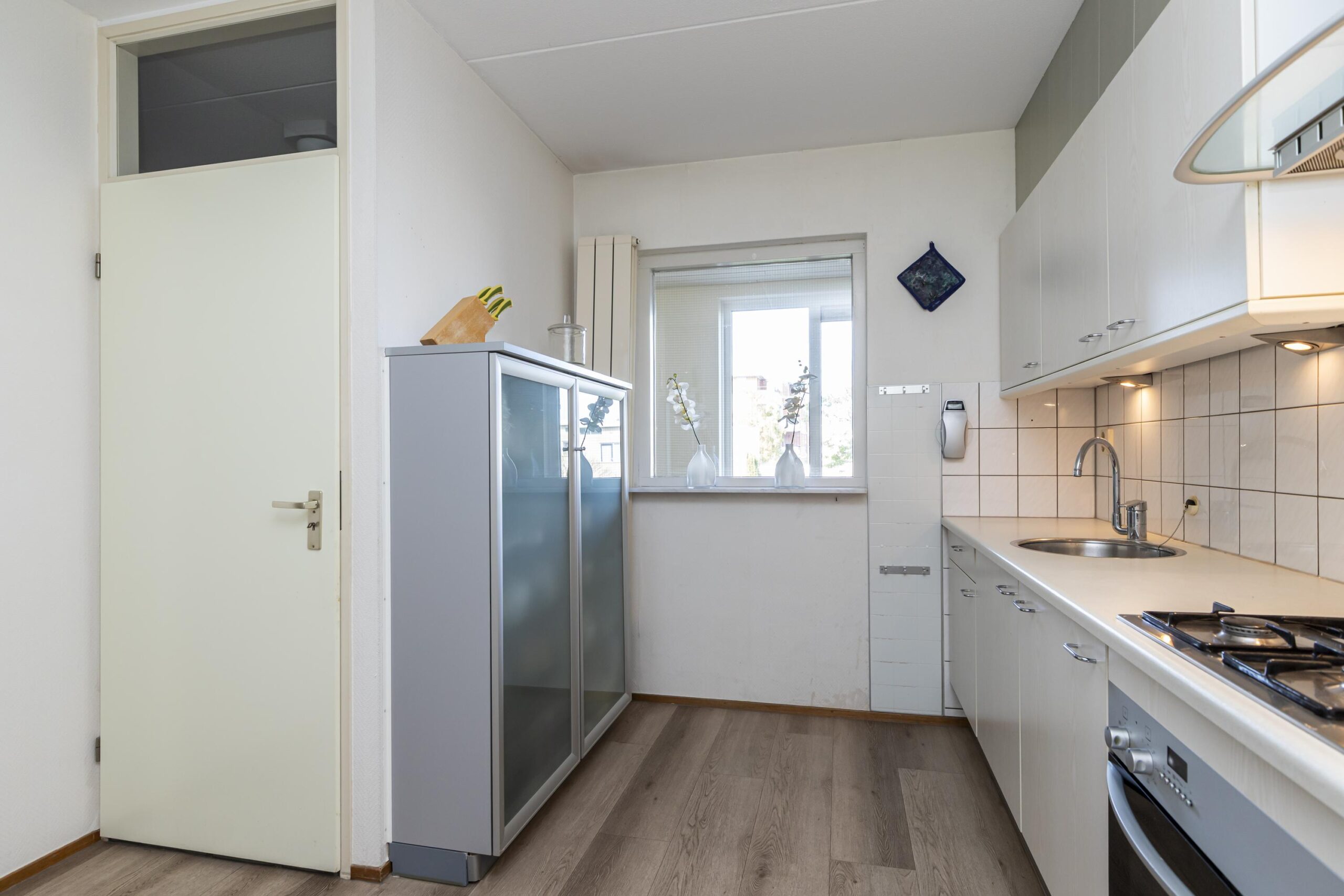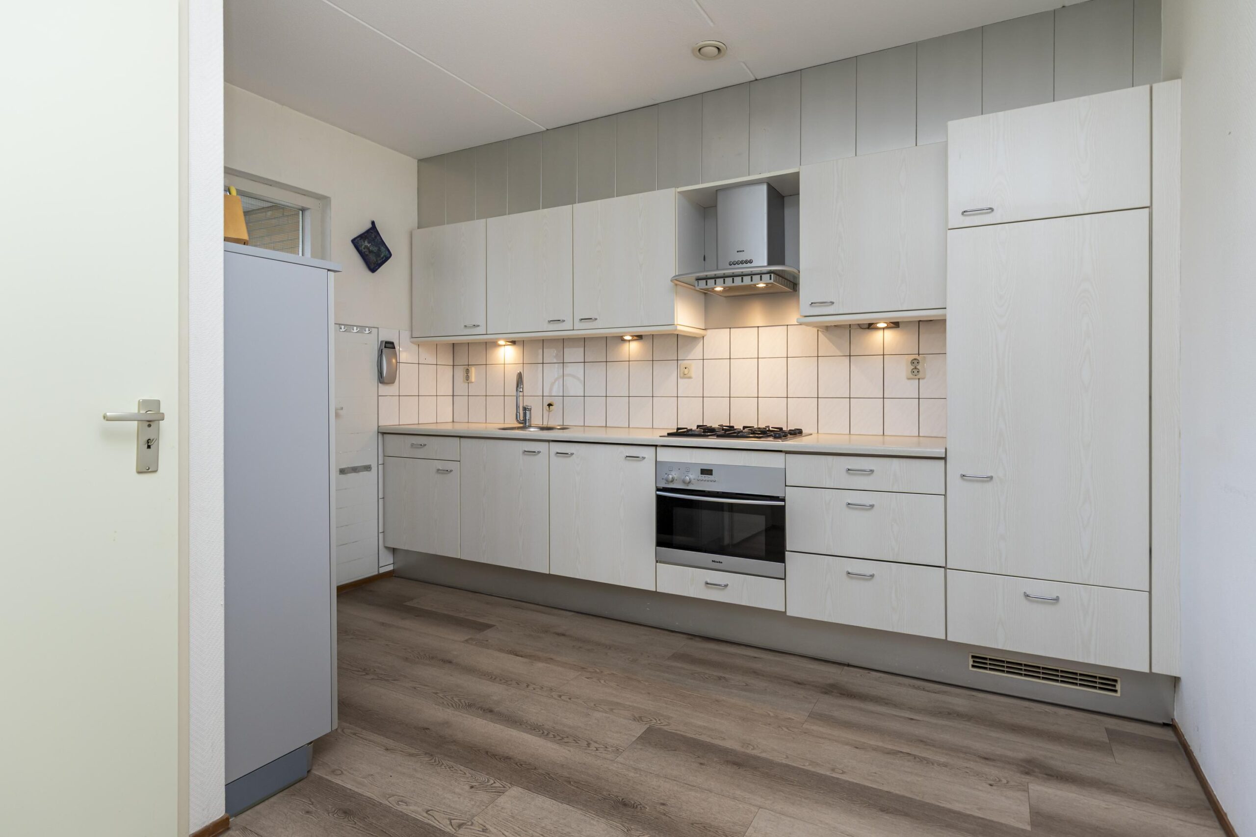 De dichte keuken bevindt zich aan de voorzijde en is voorzien van verschillende inbouwapparatuur en beschikt over een groot aanrechtblad. Aansluitend is er een bijkeuken/berging met aansluiting voor wasmachine en droger — ideaal als wasruimte of extra opslag.