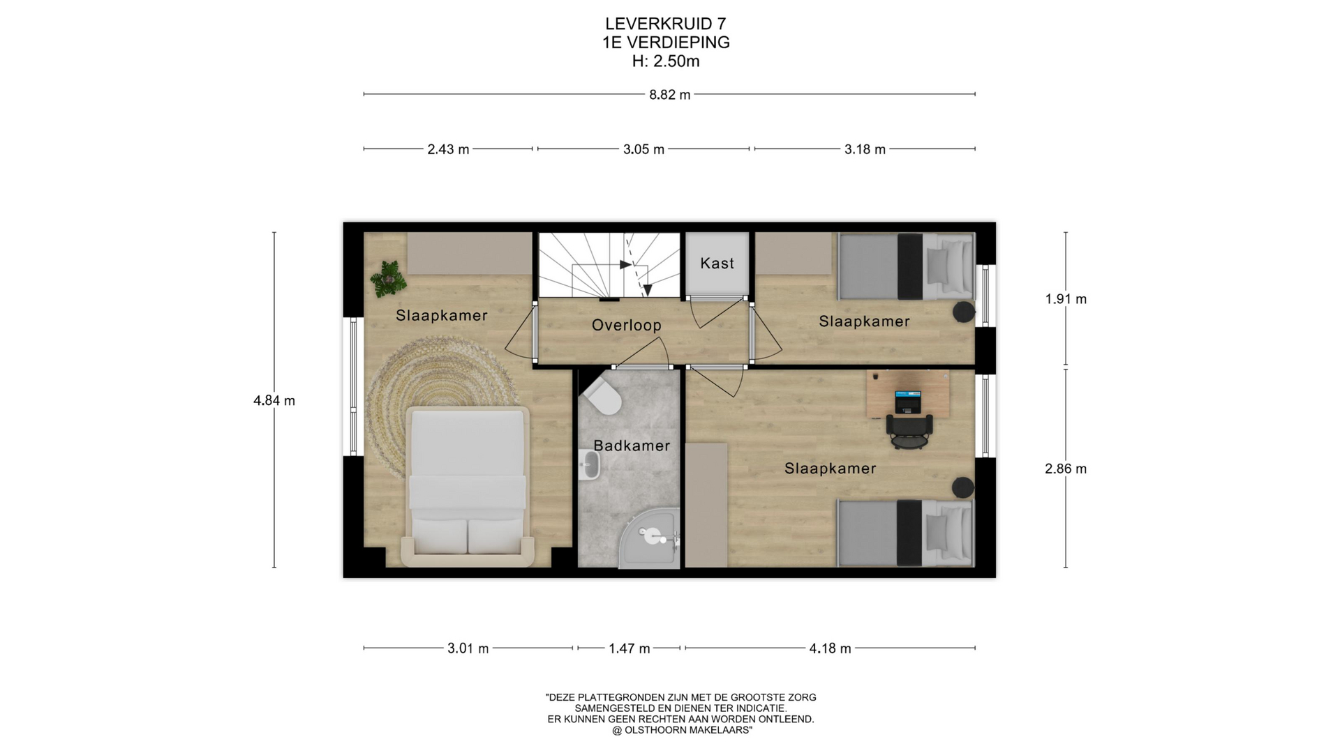 Op de eerste verdieping bevinden zich drie goed ingedeelde slaapkamers. De grootste kamer ligt aan de voorzijde en is zeer geschikt als hoofdslaapkamer, met ruimte voor een tweepersoonsbed en een kledingkast. Aan de achterzijde vind je nog twee slaapkamers die ideaal zijn als kinderkamer, logeerkamer of thuiswerkplek. Op deze verdieping bevindt zich ook de badkamer voorzien van een wastafelmeubel, douchecabine, toilet en een handdoekradiator.