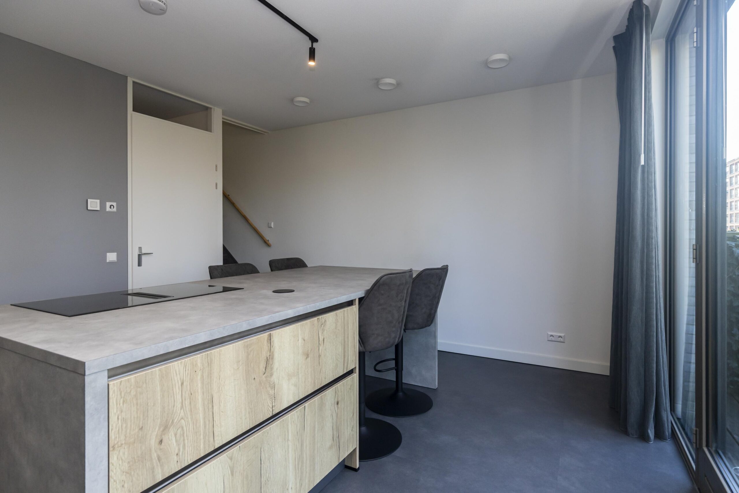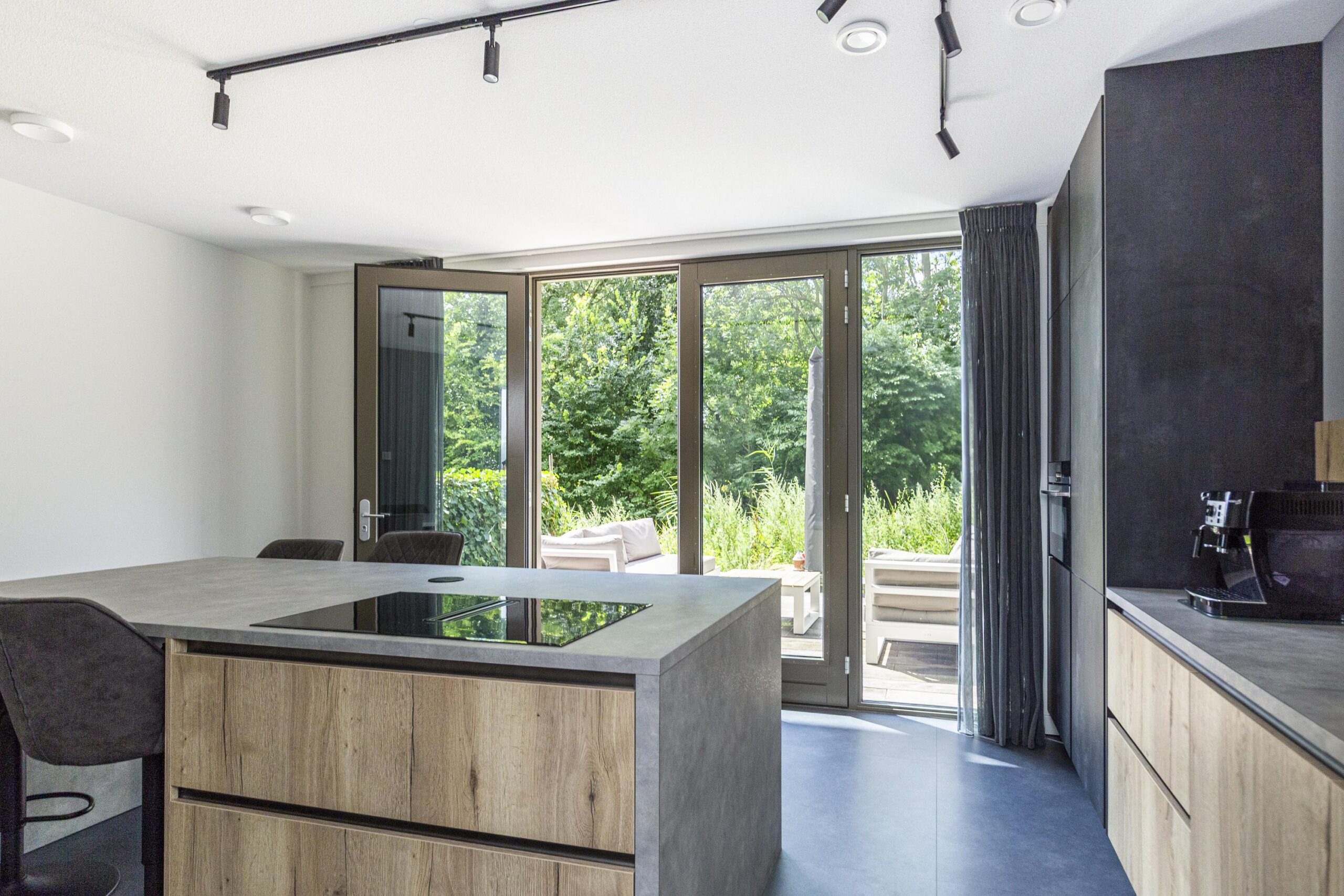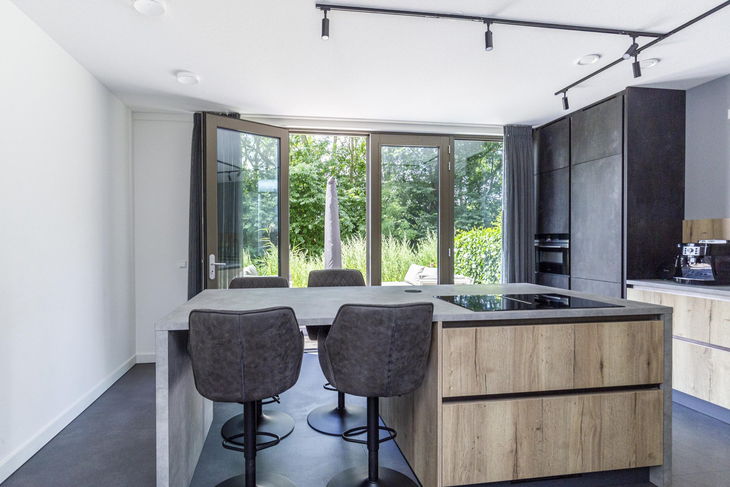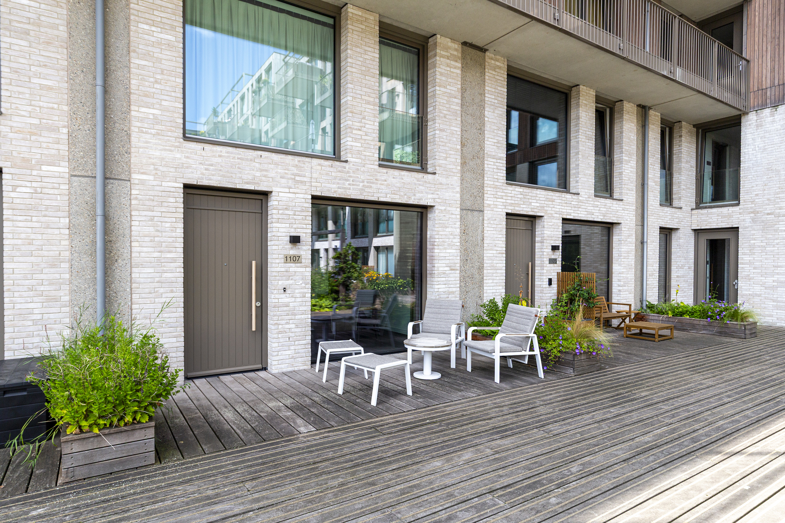 You park your car in your own space in the communal covered garage and enter the house through the indoor entrance. The kitchen on this floor is a wonderful place to cook and enjoy yourself. The luxurious kitchen has a cooking island with an induction hob and integrated extractor fan. This kitchen island can comfortably seat four people. The kitchen is spacious and equipped with many drawers and various high-quality built-in appliances. French doors lead to a spacious, cosy deck terrace with plenty of privacy, facing west. This floor also has a toilet with washbasin, two practical built-in cupboards and an extra (bicycle) storage room next to the parking space.