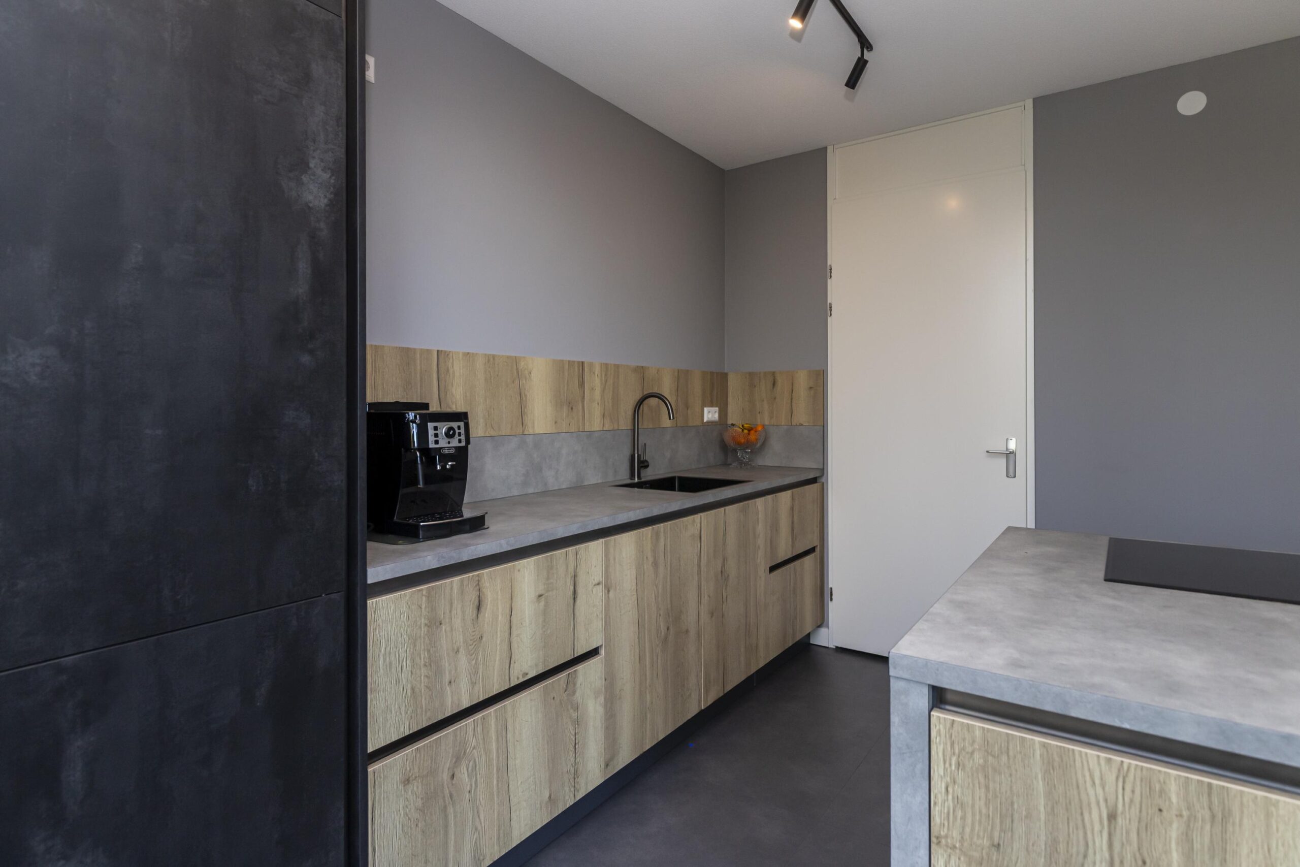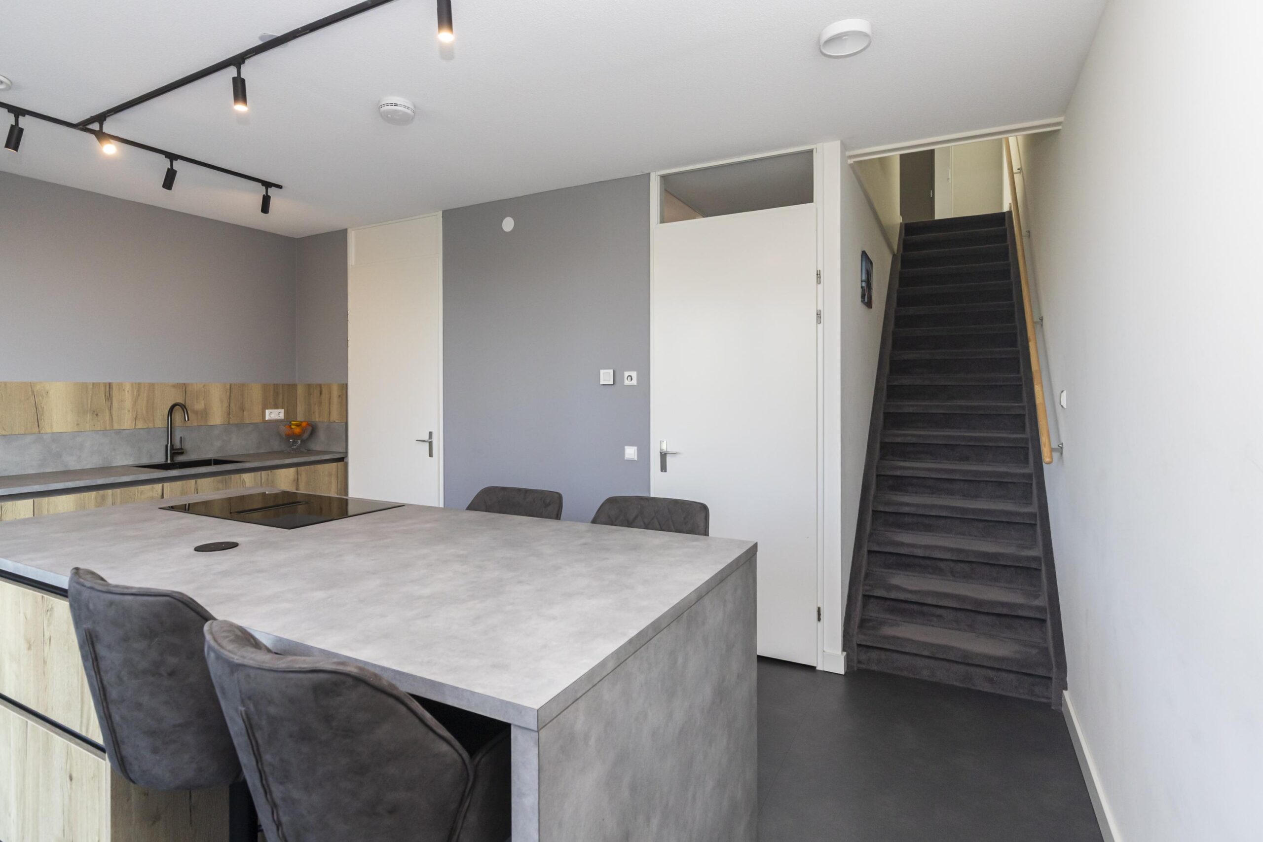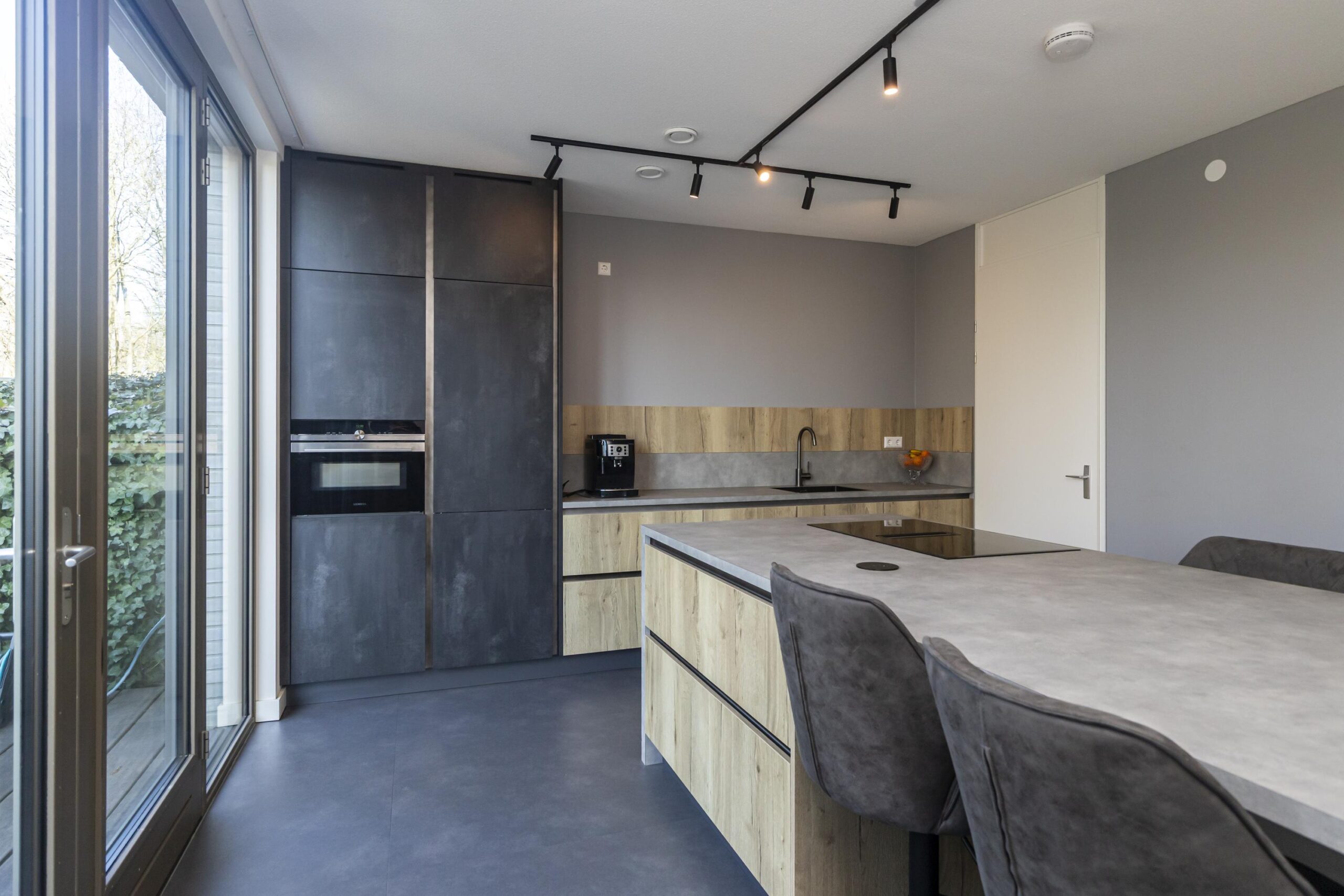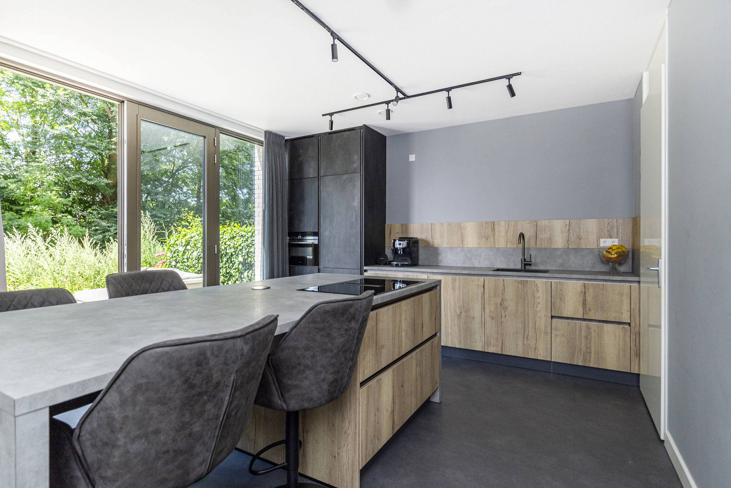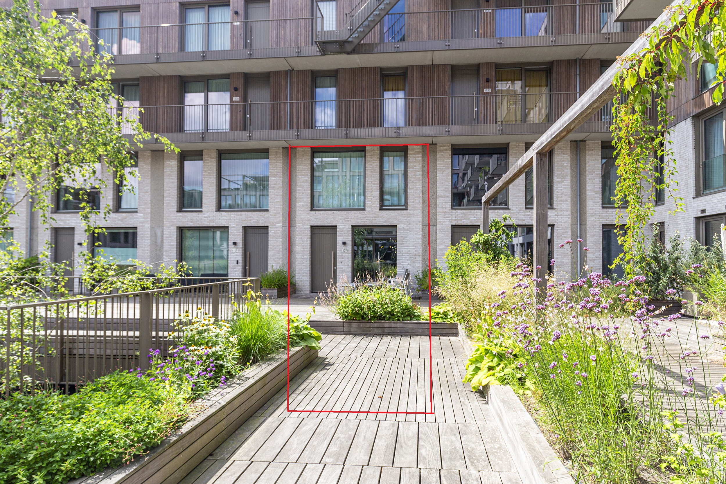 You park your car in your own space in the communal covered garage and enter the house through the indoor entrance. The kitchen on this floor is a wonderful place to cook and enjoy yourself. The luxurious kitchen has a cooking island with an induction hob and integrated extractor fan. This kitchen island can comfortably seat four people. The kitchen is spacious and equipped with many drawers and various high-quality built-in appliances. French doors lead to a spacious, cosy deck terrace with plenty of privacy, facing west. This floor also has a toilet with washbasin, two practical built-in cupboards and an extra (bicycle) storage room next to the parking space.