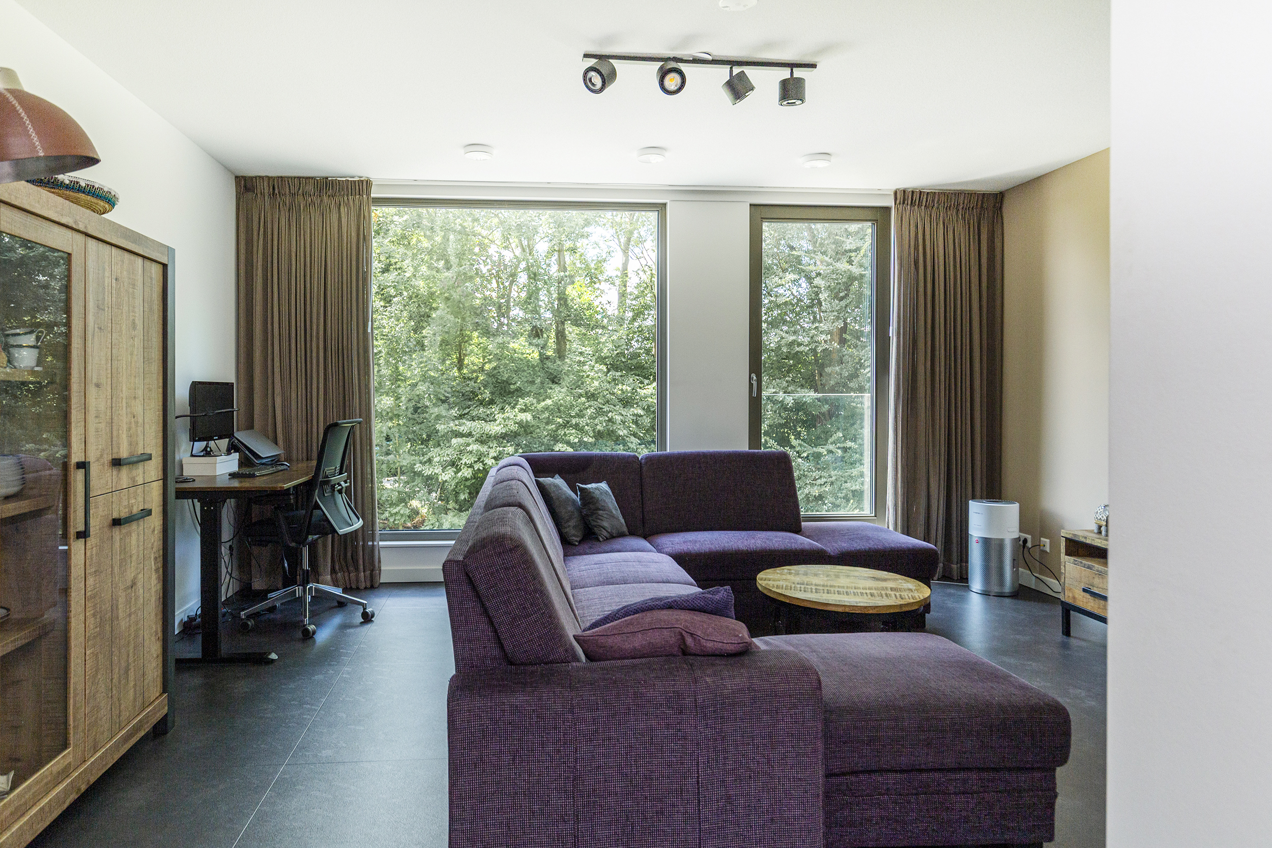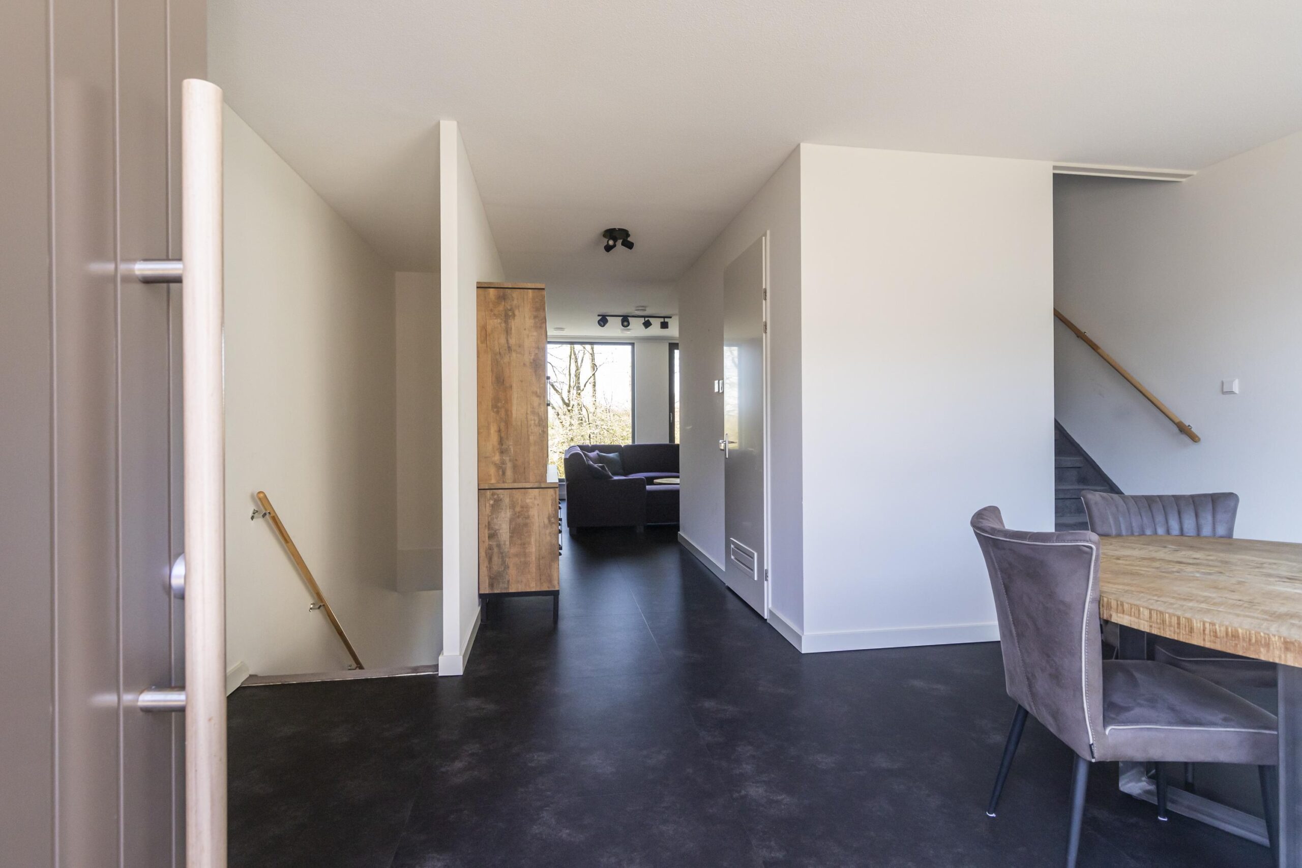 The stairs lead to the first floor, where you enter a bright and spacious front room, the ideal place for a dining table. From this room, you can walk directly into the beautifully landscaped courtyard garden, where you can enjoy the morning sun. This floor also features the technical room with the heat pump and boiler, plenty of storage space and a handy stair cupboard. At the rear of the house is the sitting area, where a pleasant workspace has also been created.