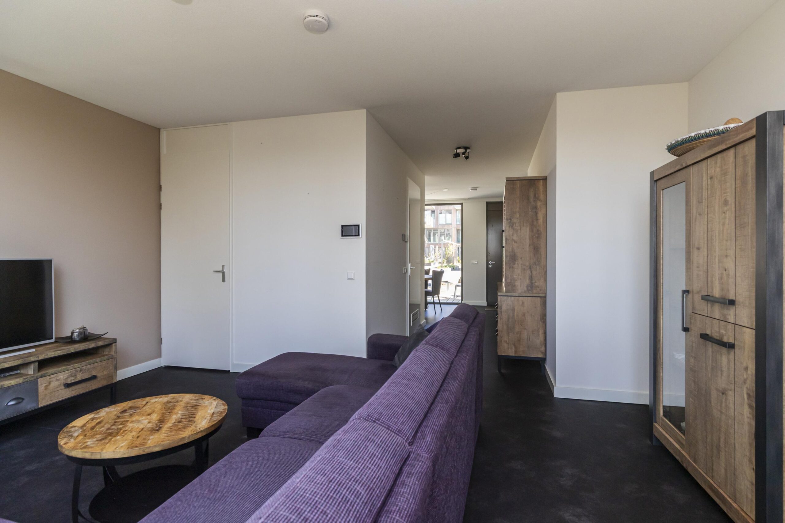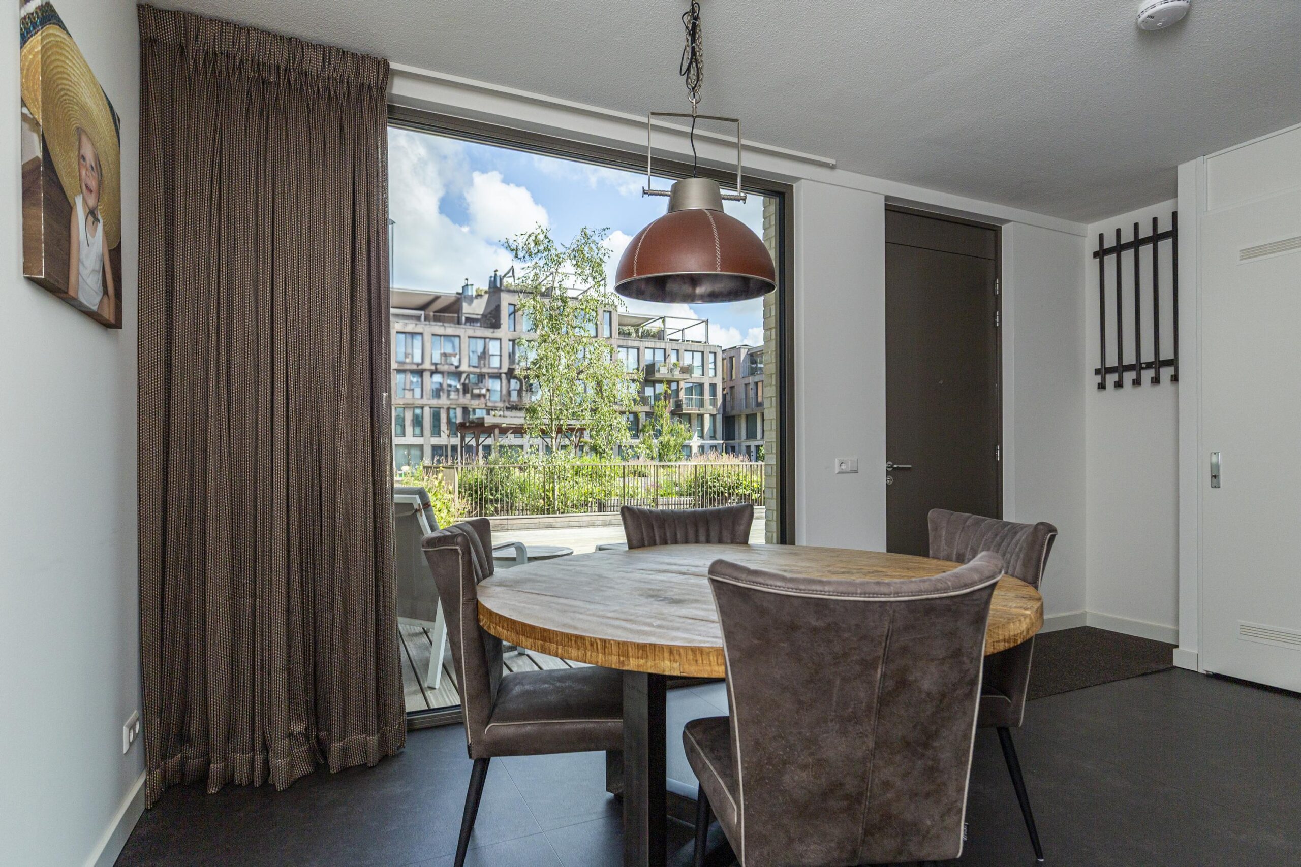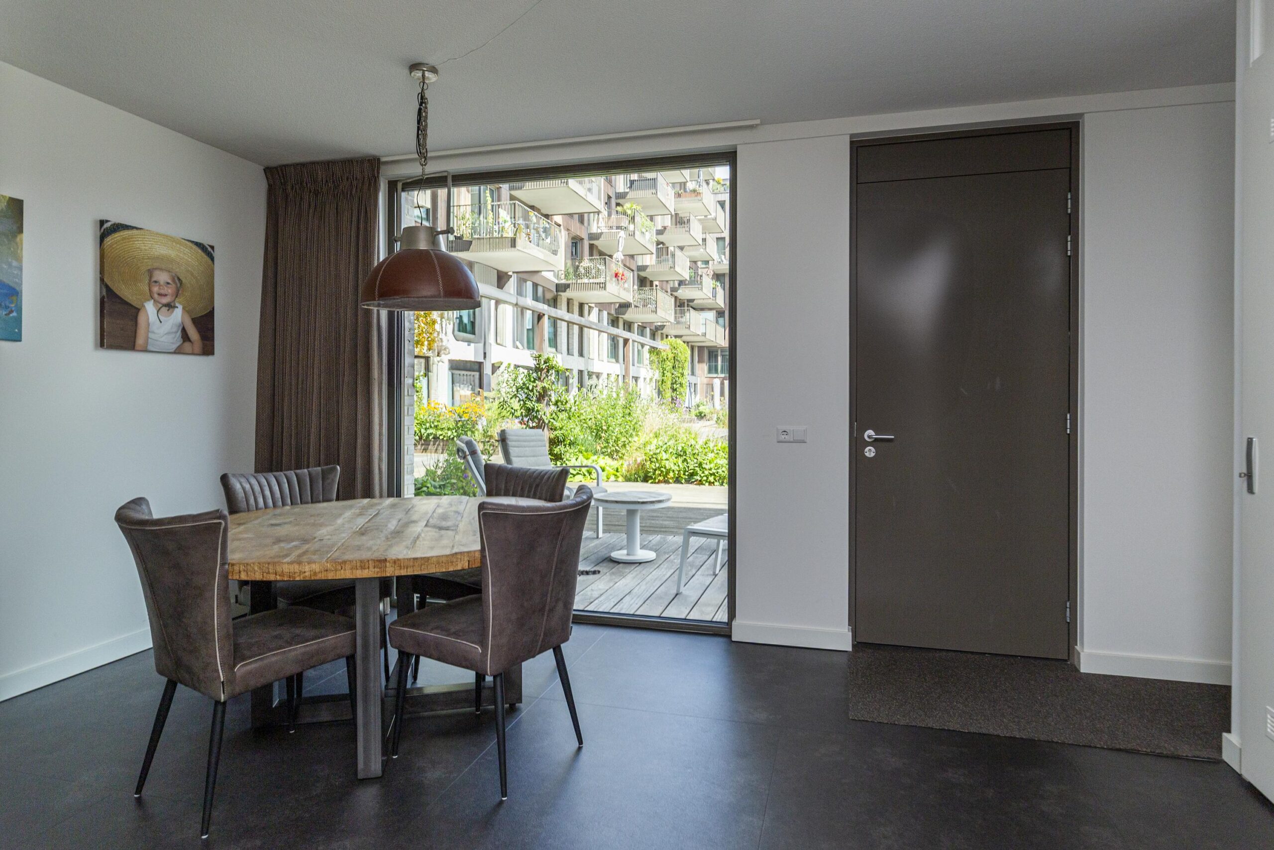 With the stairs you reach the second floor where you enter a bright and spacious front room. Here the residents have placed the dining table. From this room you step directly into the beautifully landscaped courtyard where you can sit in the sun in the morning. On this floor is also the technical room with the heat pump and boiler as well as plenty of storage space. At the rear of the house is the sitting area where also a workplace is created.
