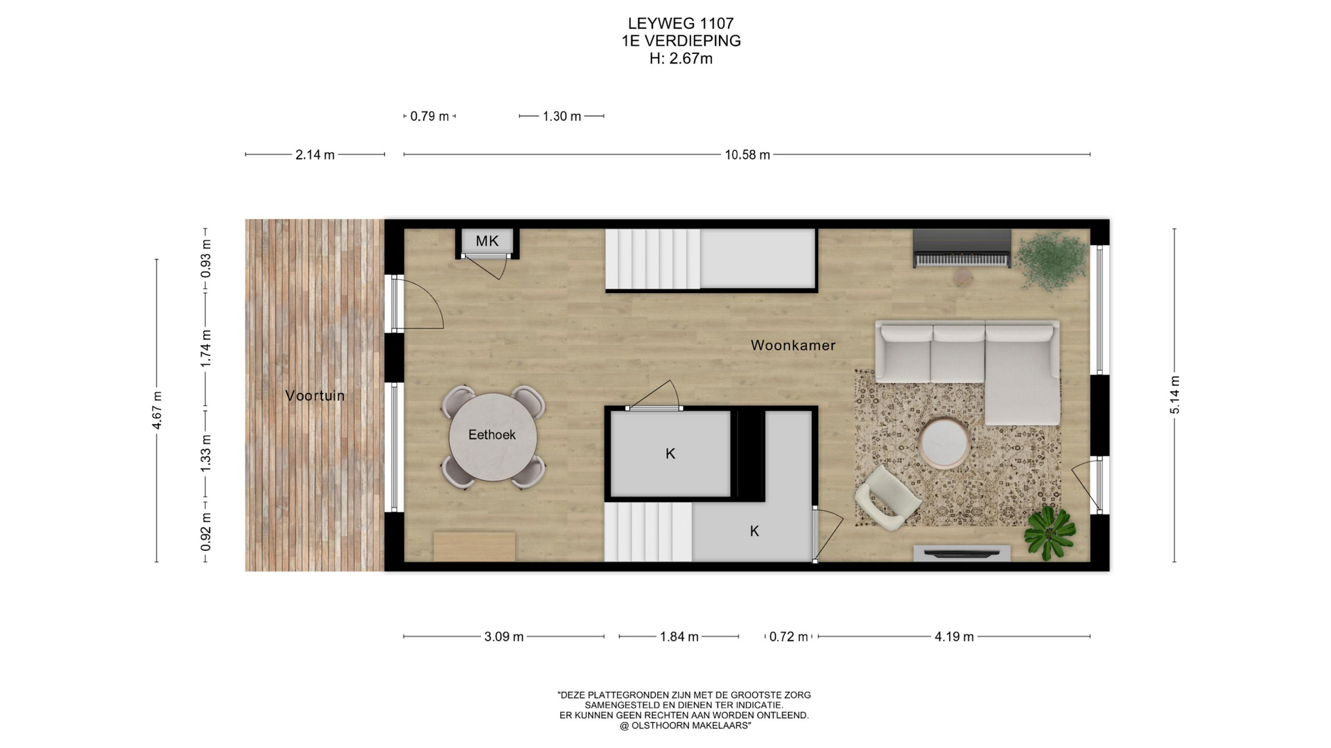Via de trap kom je op de eerste verdieping waar je binnenstapt in een lichte en ruime voorkamer, de ideale plek voor een eettafel. Vanuit deze ruimte loop je direct de fraai aangelegde binnentuin in waar je ’s ochtends heerlijk in de zon zit. Verder vind je op deze verdieping de technische ruimte met de warmtepomp en boiler, volop bergruimte én een handige trapkast. Aan de achterzijde van de woning bevindt zich het zitgedeelte waar ook een fijne werkplek is gecreëerd.