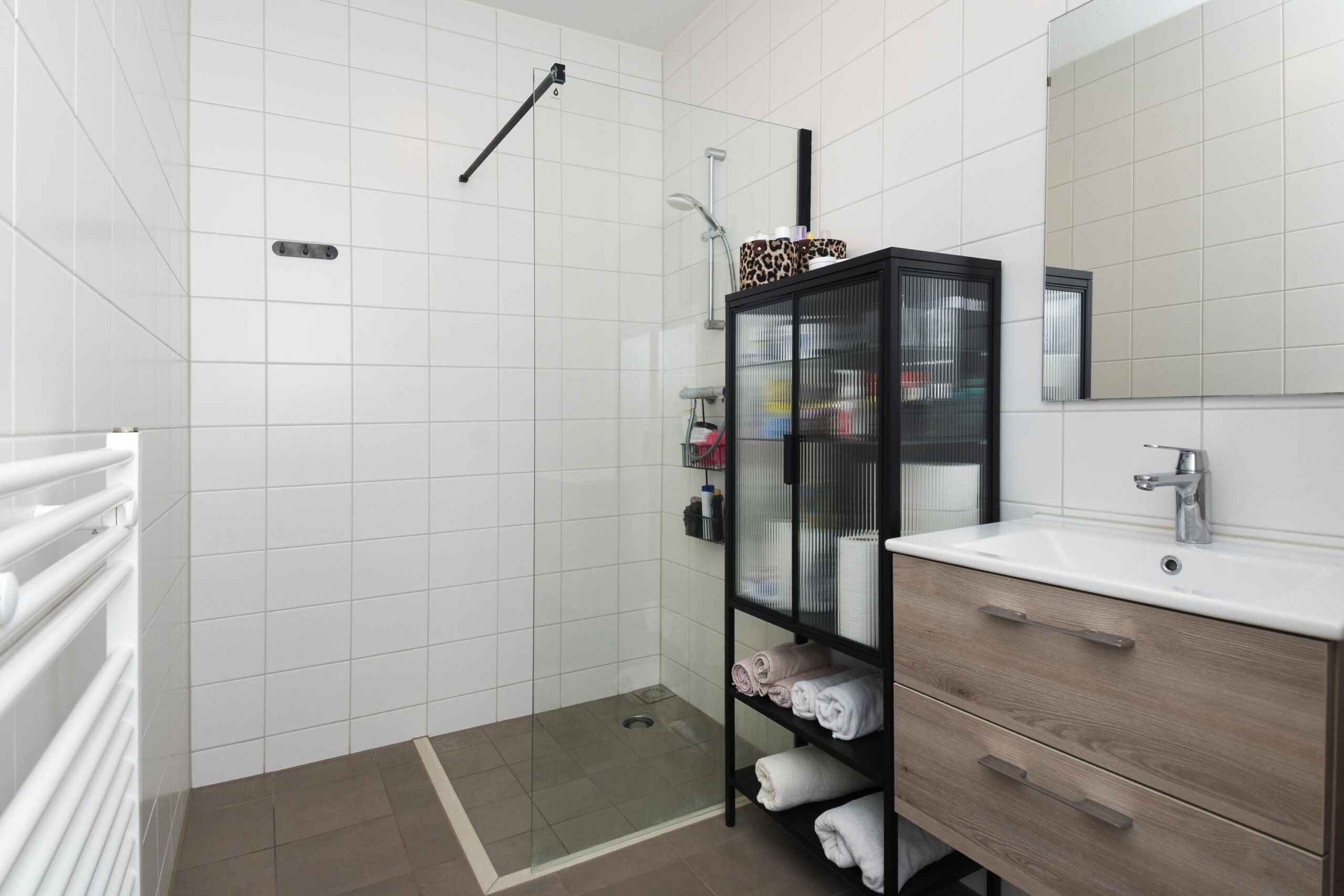 De moderne badkamer is uitgerust met een inloopdouche en een wastafelmeubel.