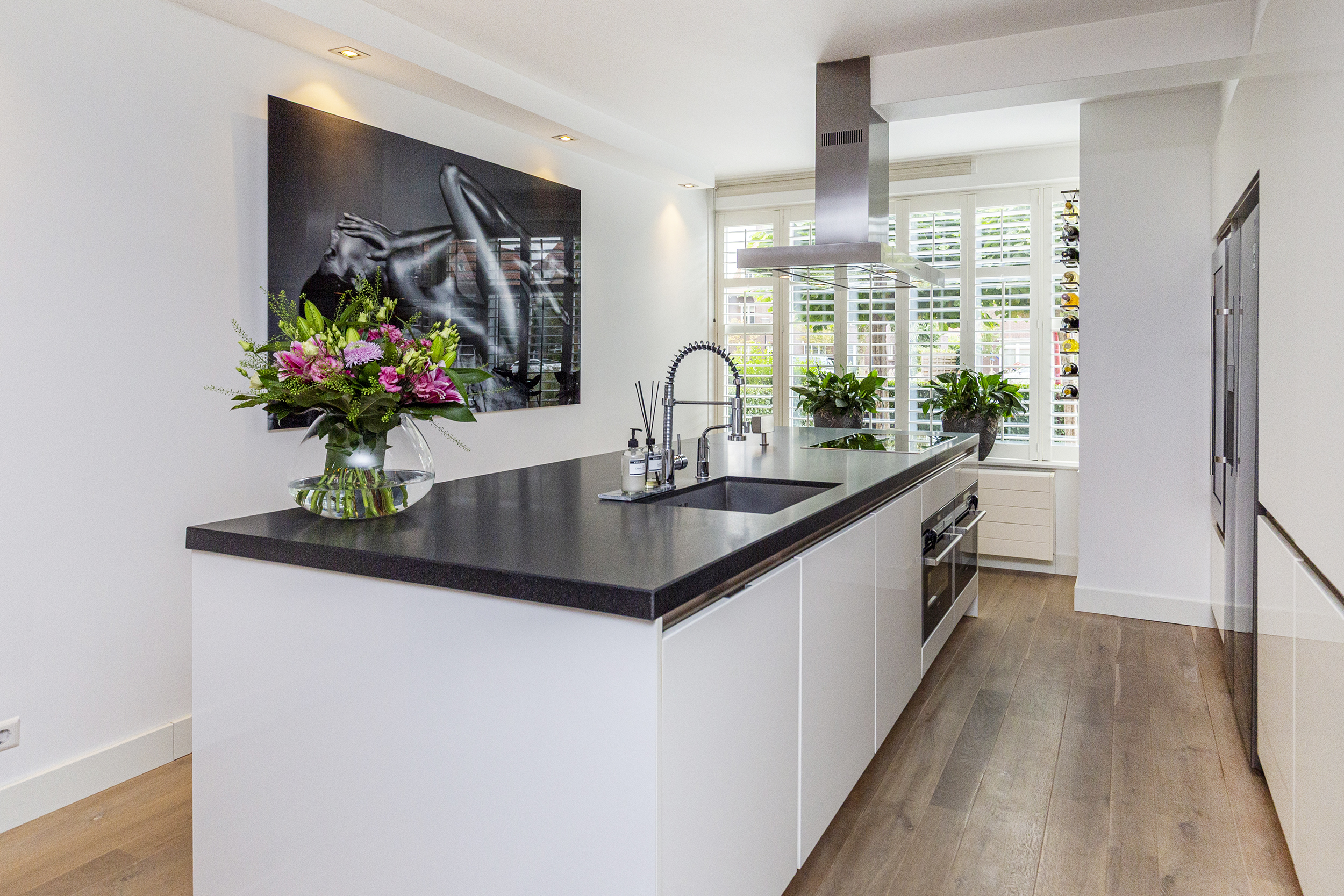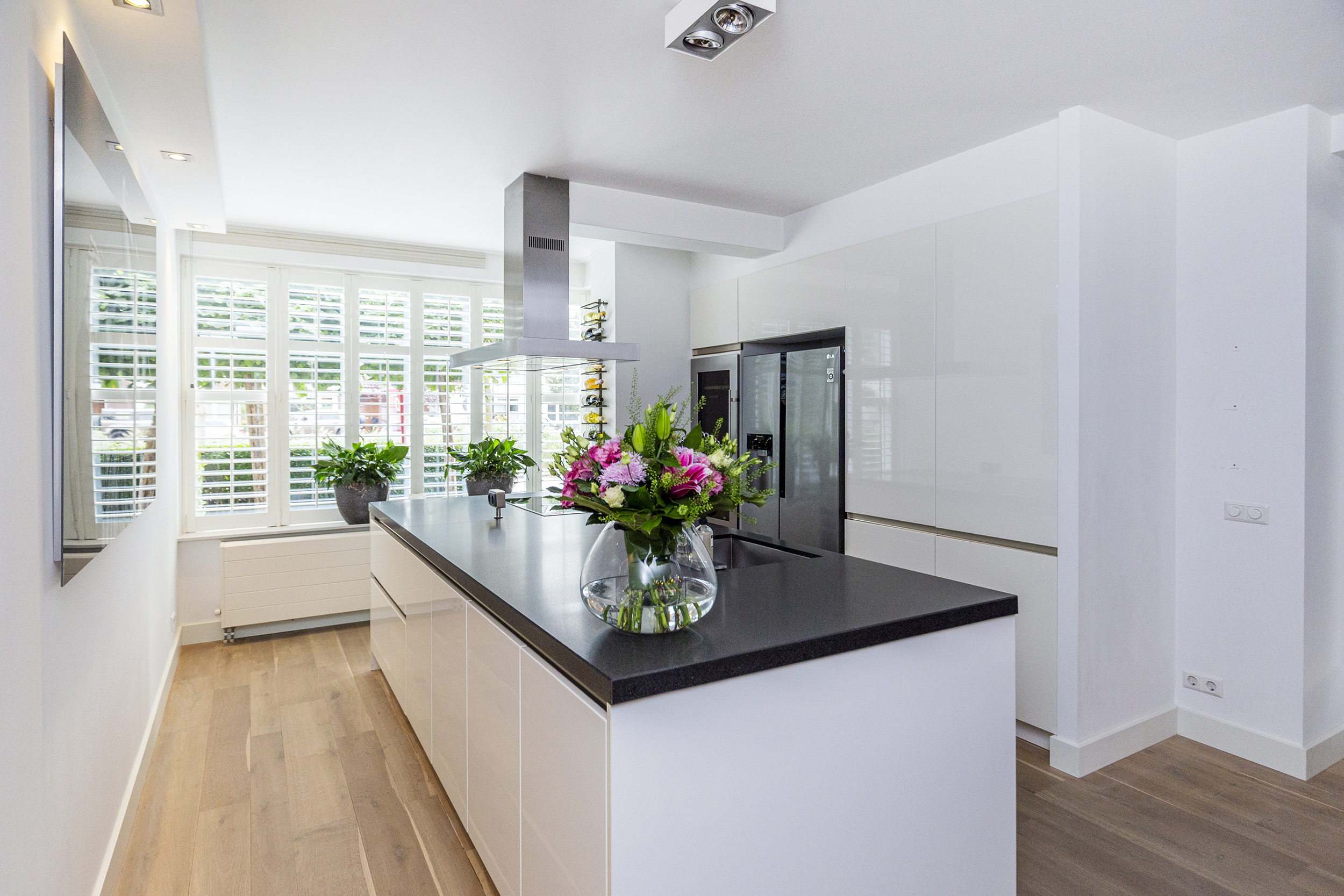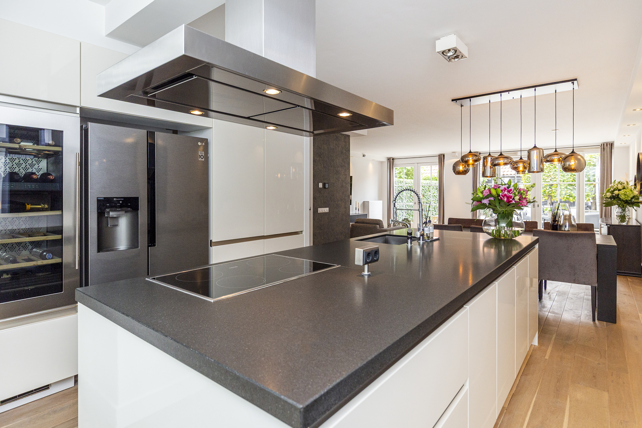 Voortuin met oprit voor eigen auto. Entree woning, hal met meterkast, modern toilet met fonteintje en trapkast. Aan de voorzijde een luxe woonkeuken met riant kookeiland en hoogwaardige inbouwapparatuur: 4-pits inductiekookplaat, RVS schouw, stoomoven, combi-magnetron, vaatwasser en wijnkoelkast. De keuken is afgewerkt met een stijlvol composiet aanrechtblad.