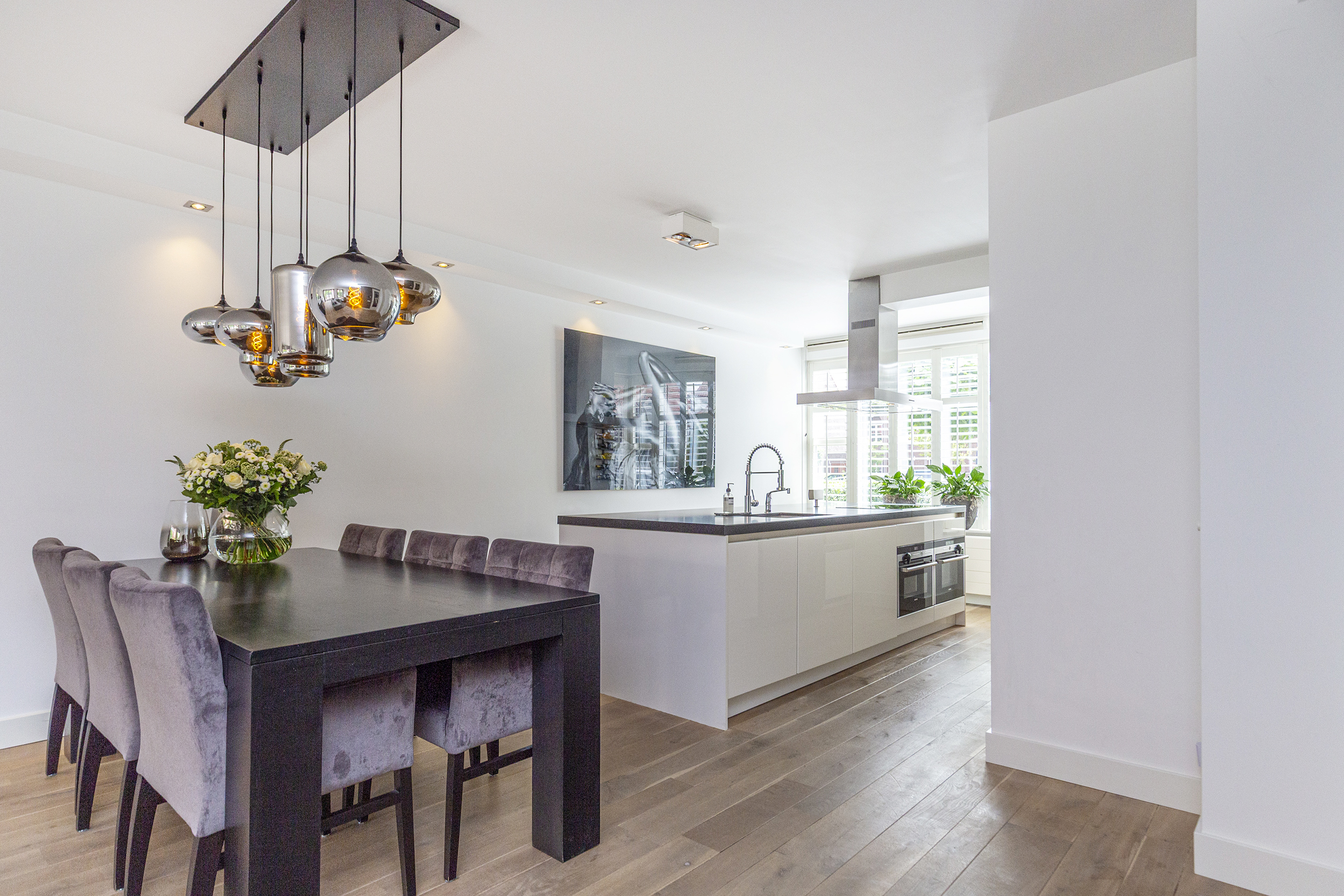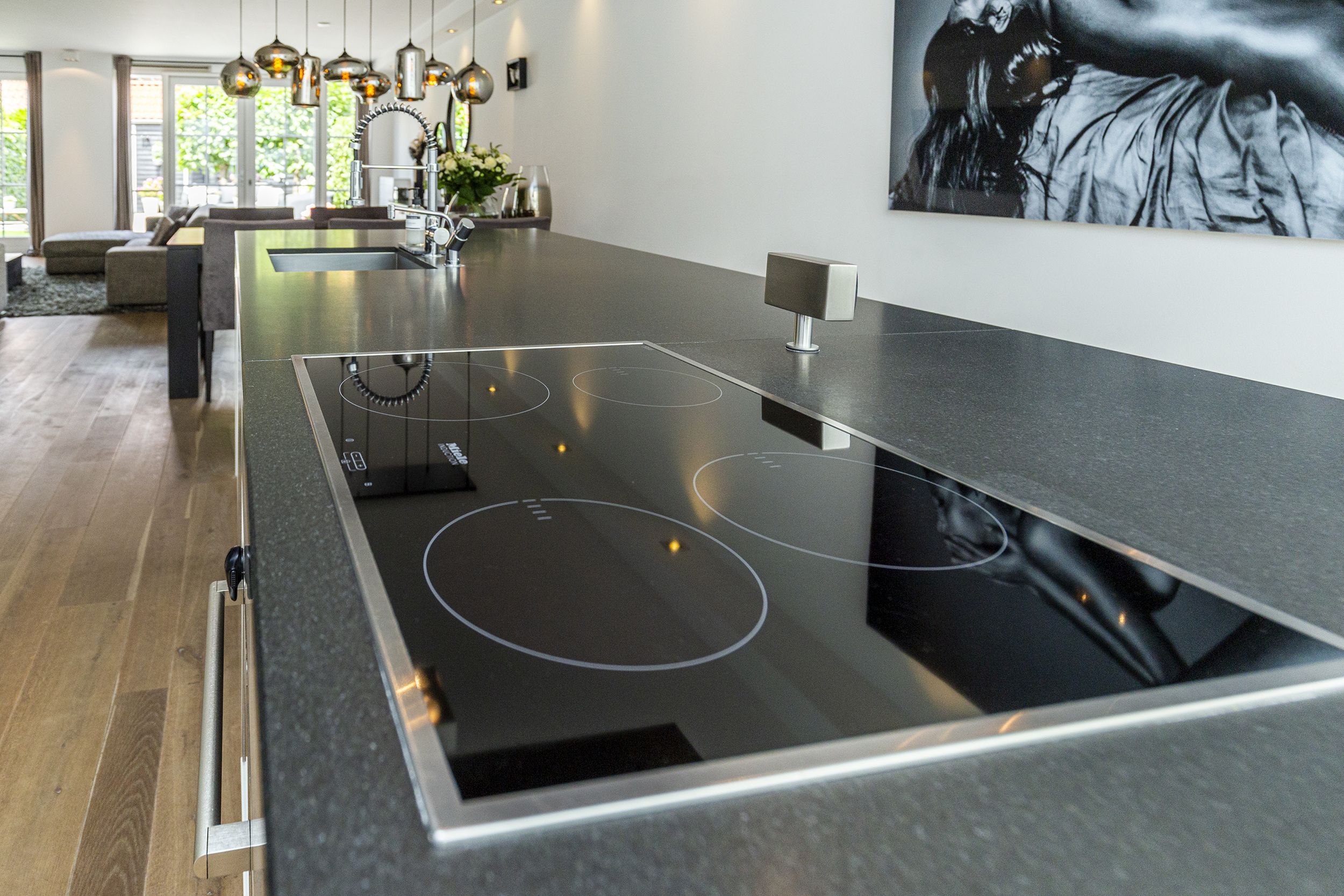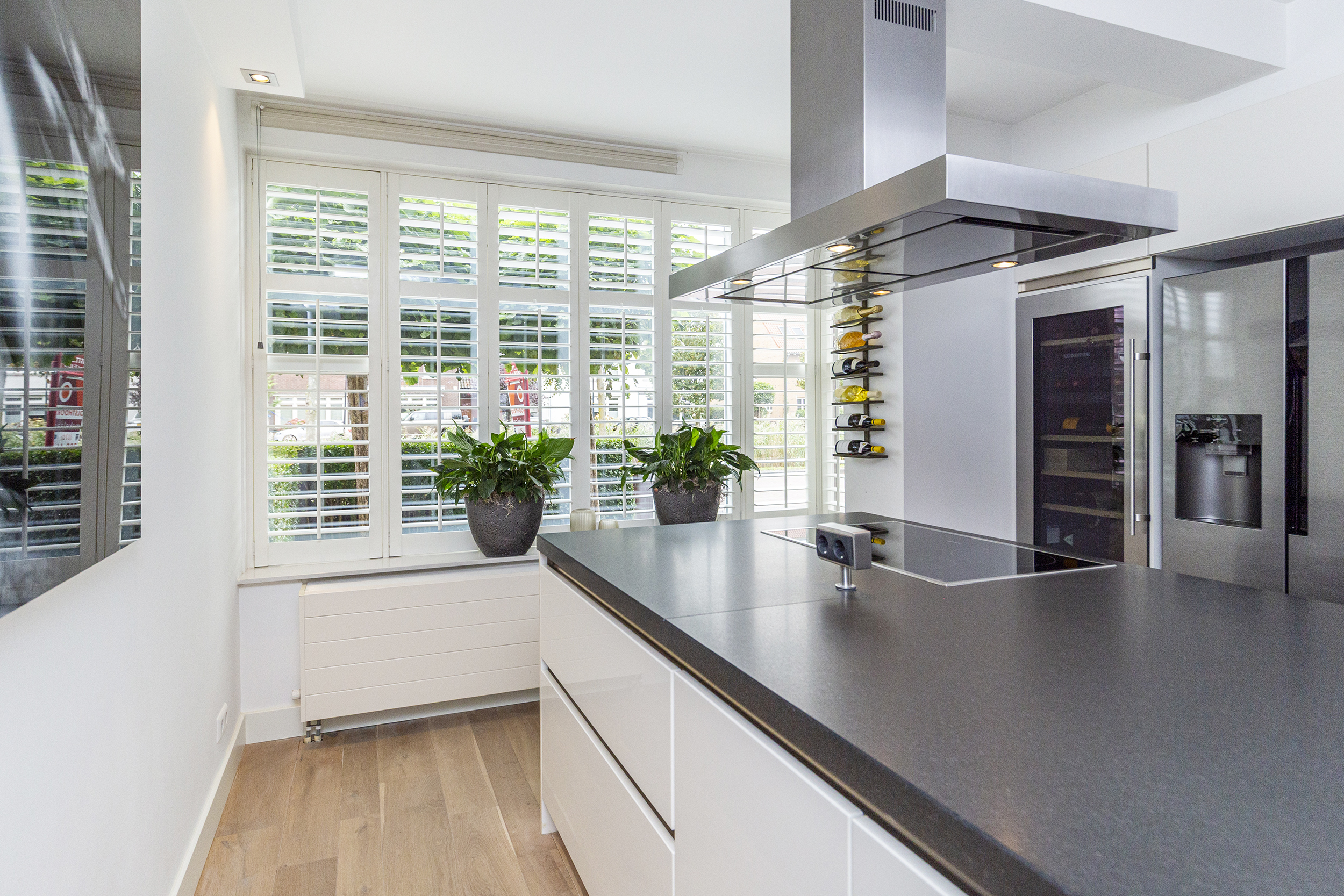 Voortuin met oprit voor eigen auto. Entree woning, hal met meterkast, modern toilet met fonteintje en trapkast. Aan de voorzijde een luxe woonkeuken met riant kookeiland en hoogwaardige inbouwapparatuur: 4-pits inductiekookplaat, RVS schouw, stoomoven, combi-magnetron, vaatwasser en wijnkoelkast. De keuken is afgewerkt met een stijlvol composiet aanrechtblad.