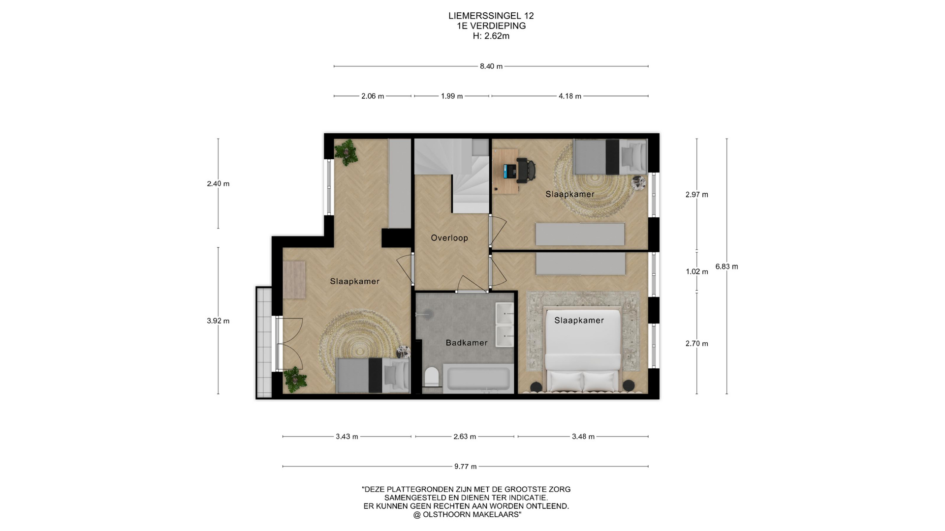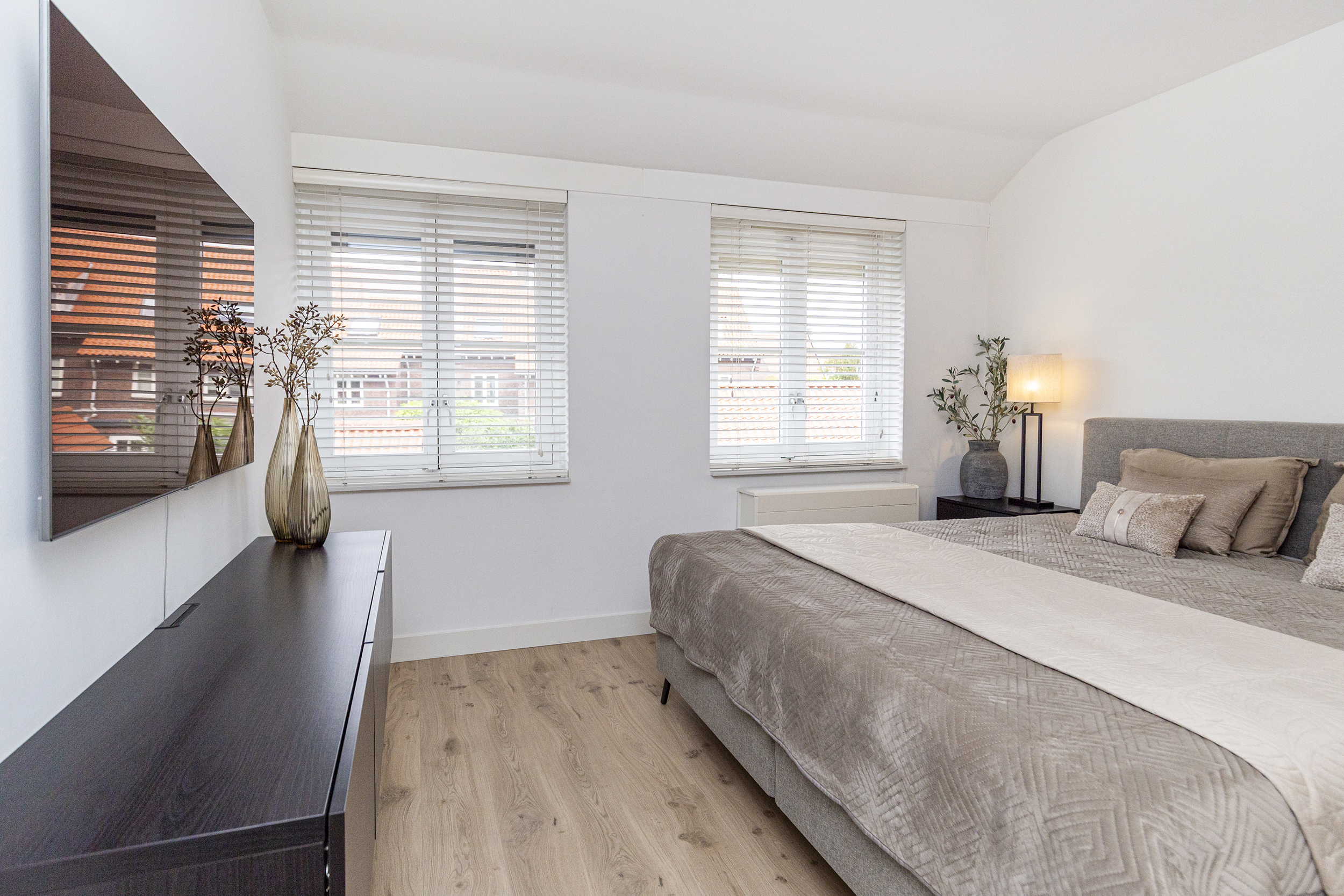 Overloop met toegang tot drie slaapkamers en een moderne badkamer. De hoofdslaapkamer aan de voorzijde heeft een eigen balkon. Aan de achterzijde bevinden zich nog twee kamers. De luxe badkamer is voorzien van een ruime inloopdouche, ligbad, dubbele wastafel met meubel, elektrische vloerverwarming en strak afgewerkte inbouwverlichting.