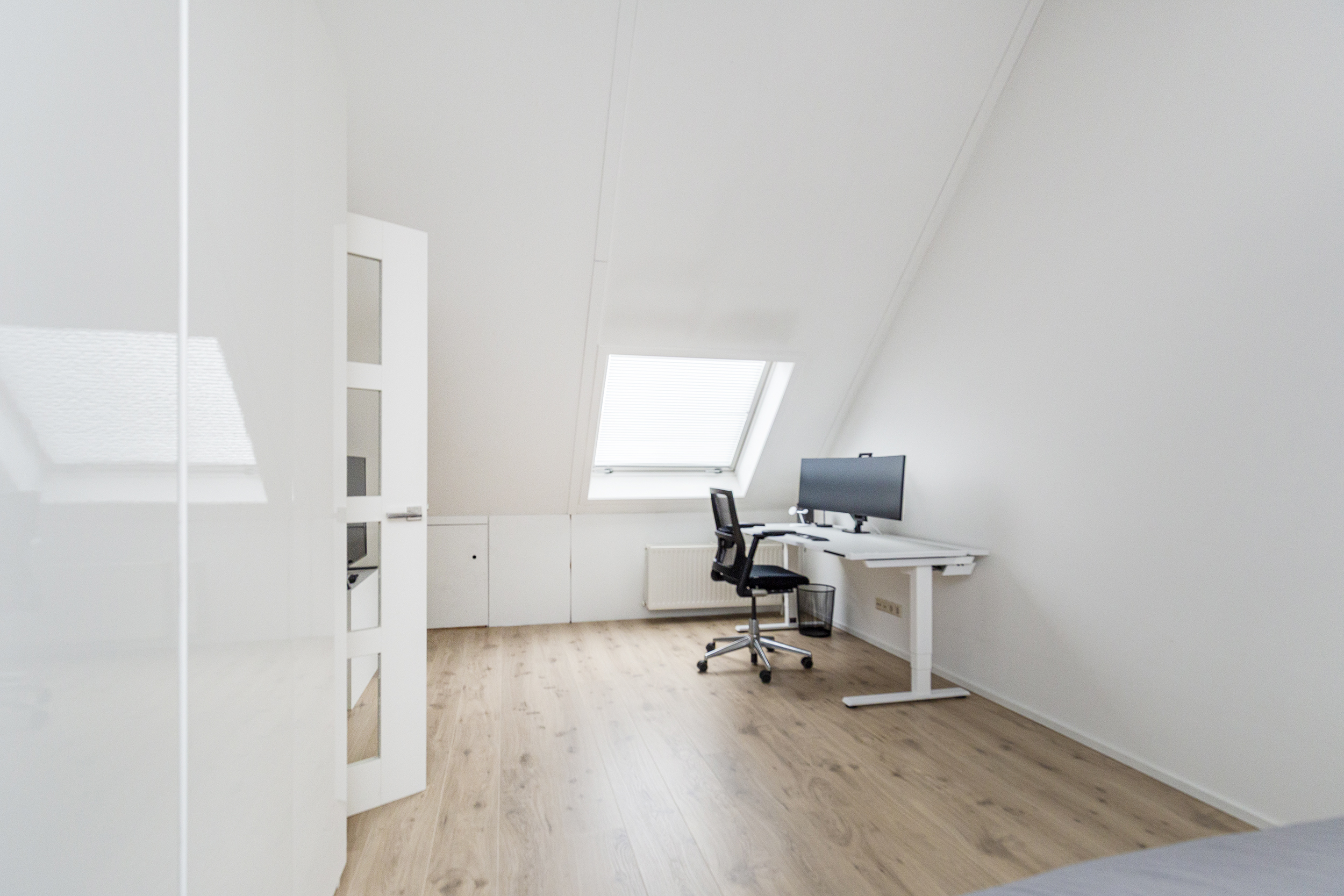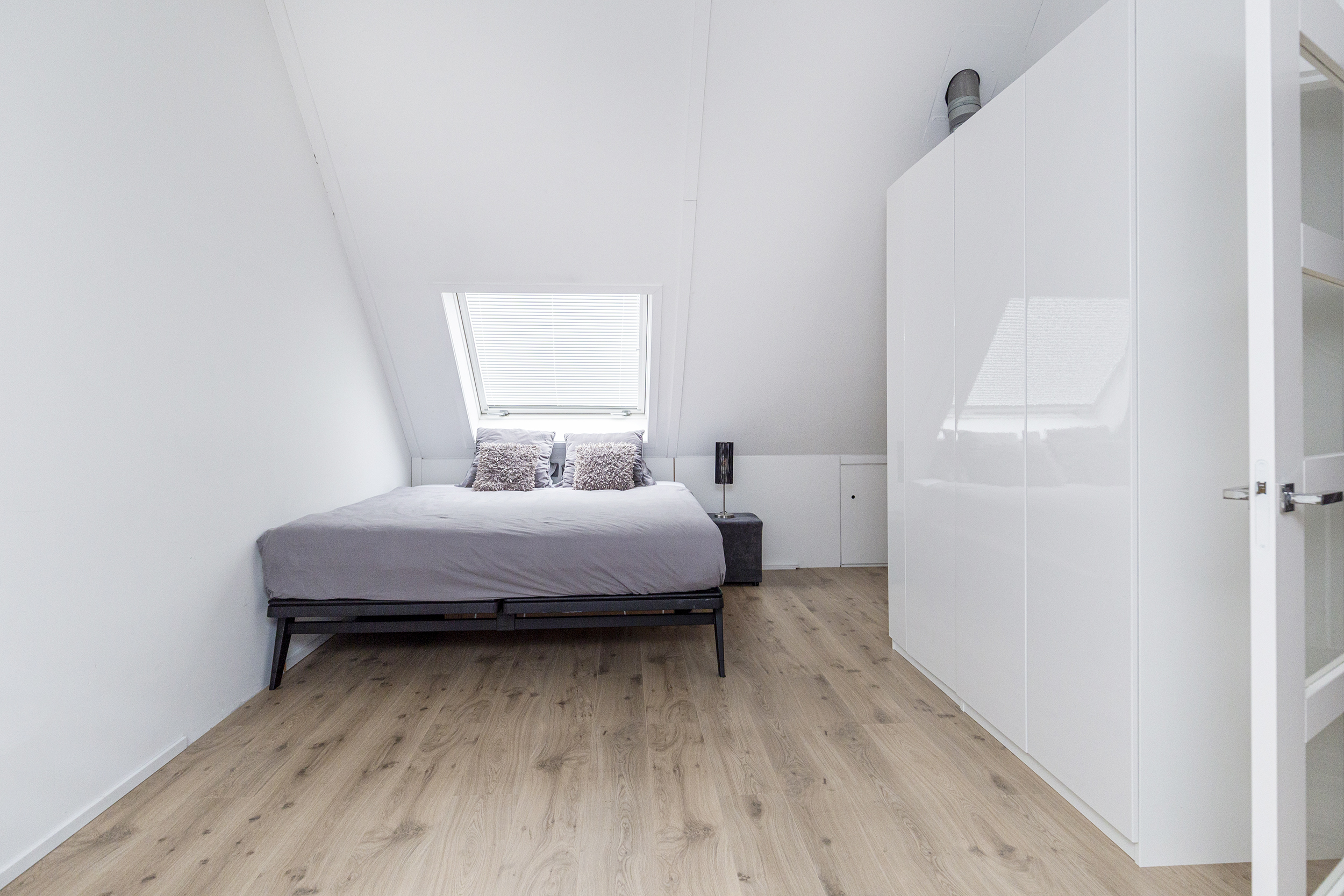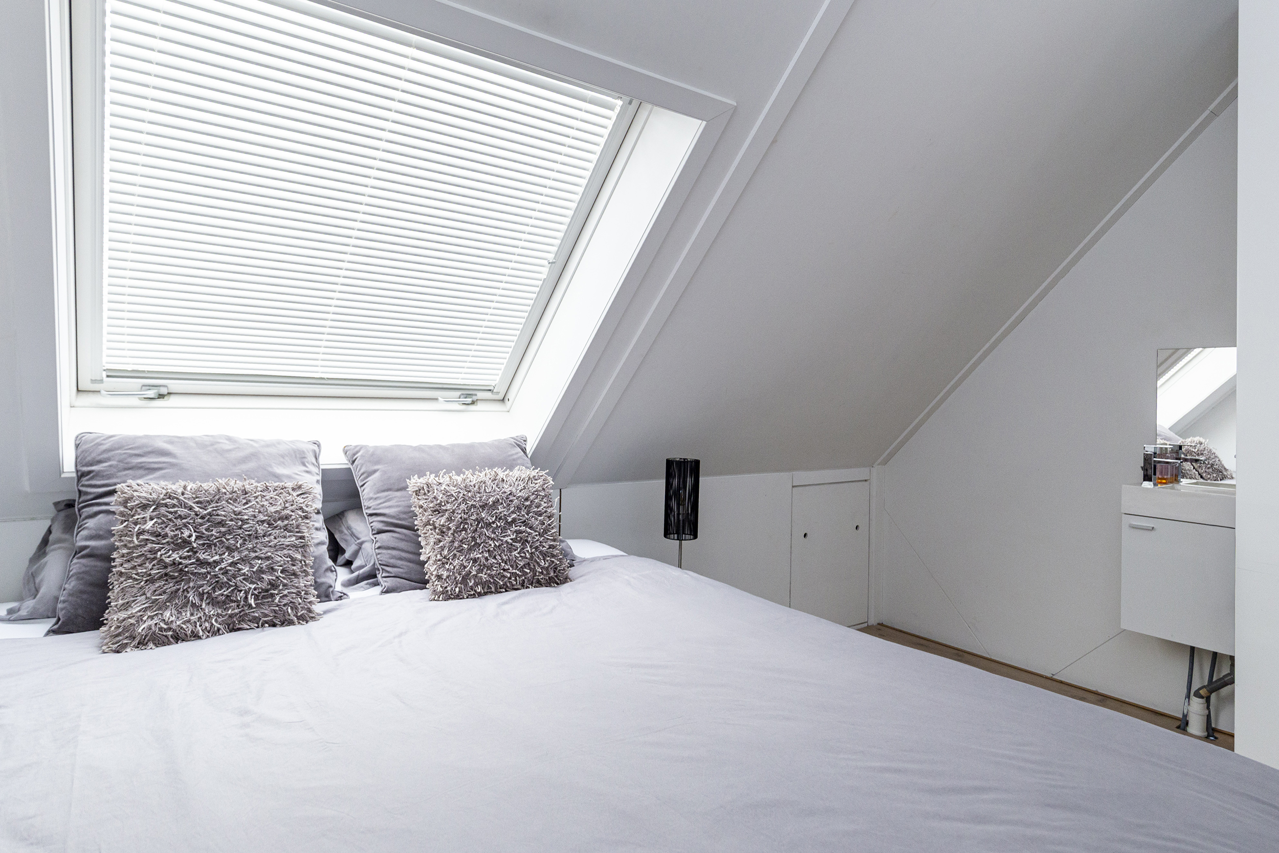 Ruime overloop met toegang tot de wasruimte met dakraam en opstelplaats voor mechanische ventilatie. Vierde slaapkamer met dakramen en eigen wastafel. Achter de knieschotten is extra bergruimte aanwezig.