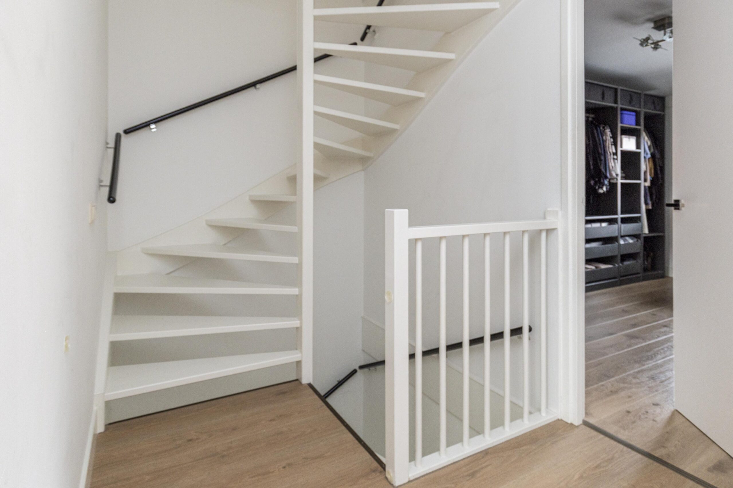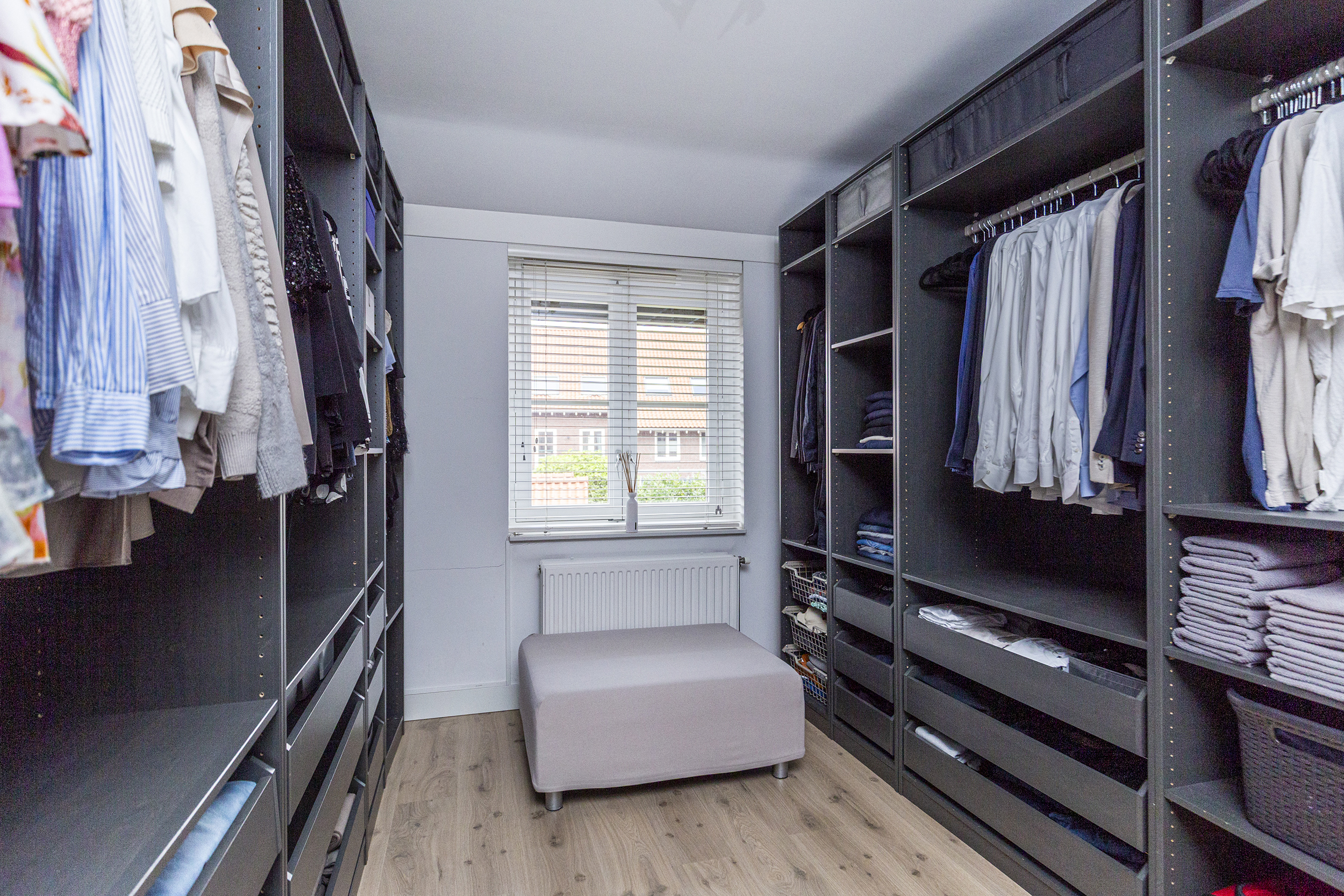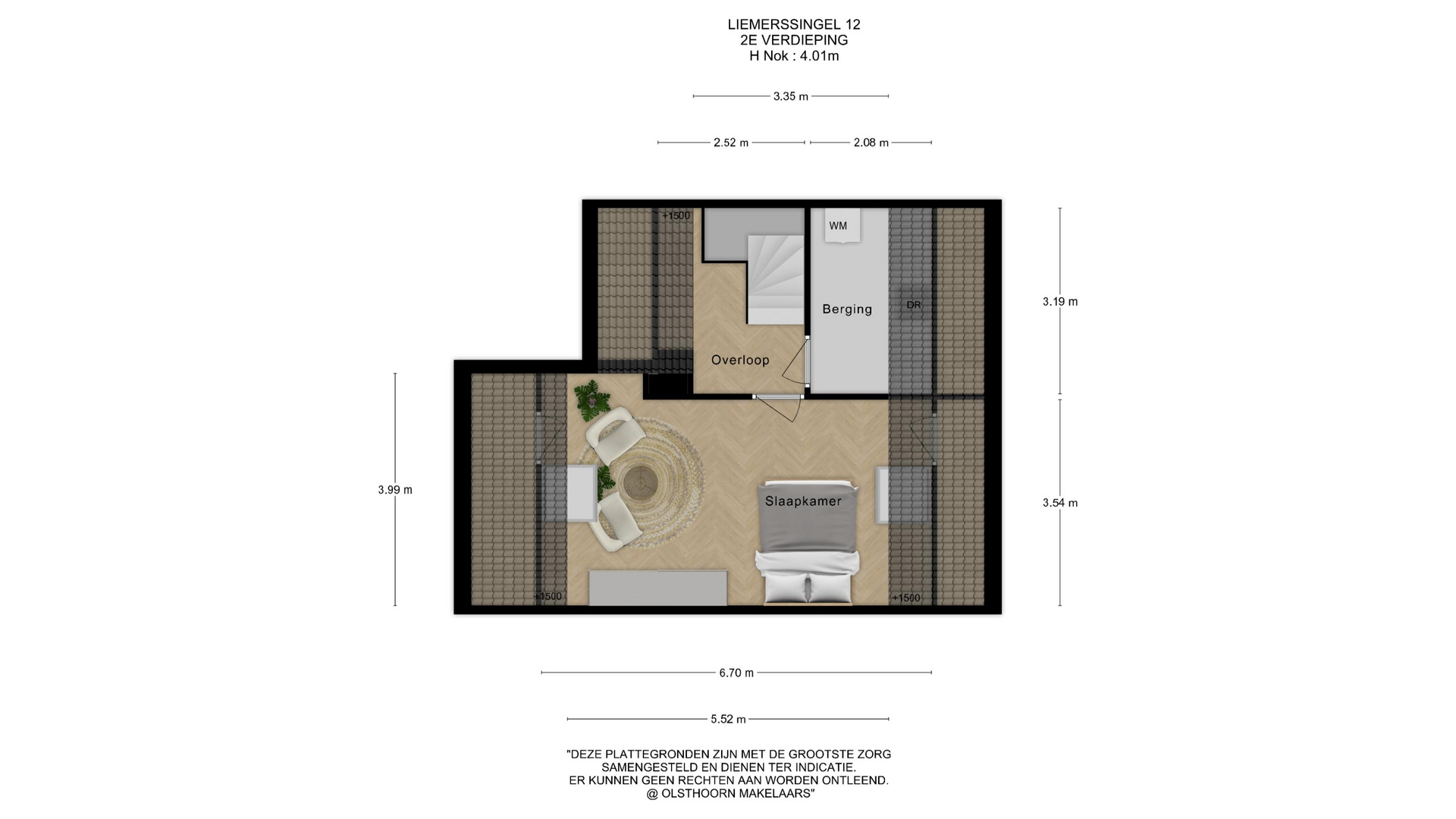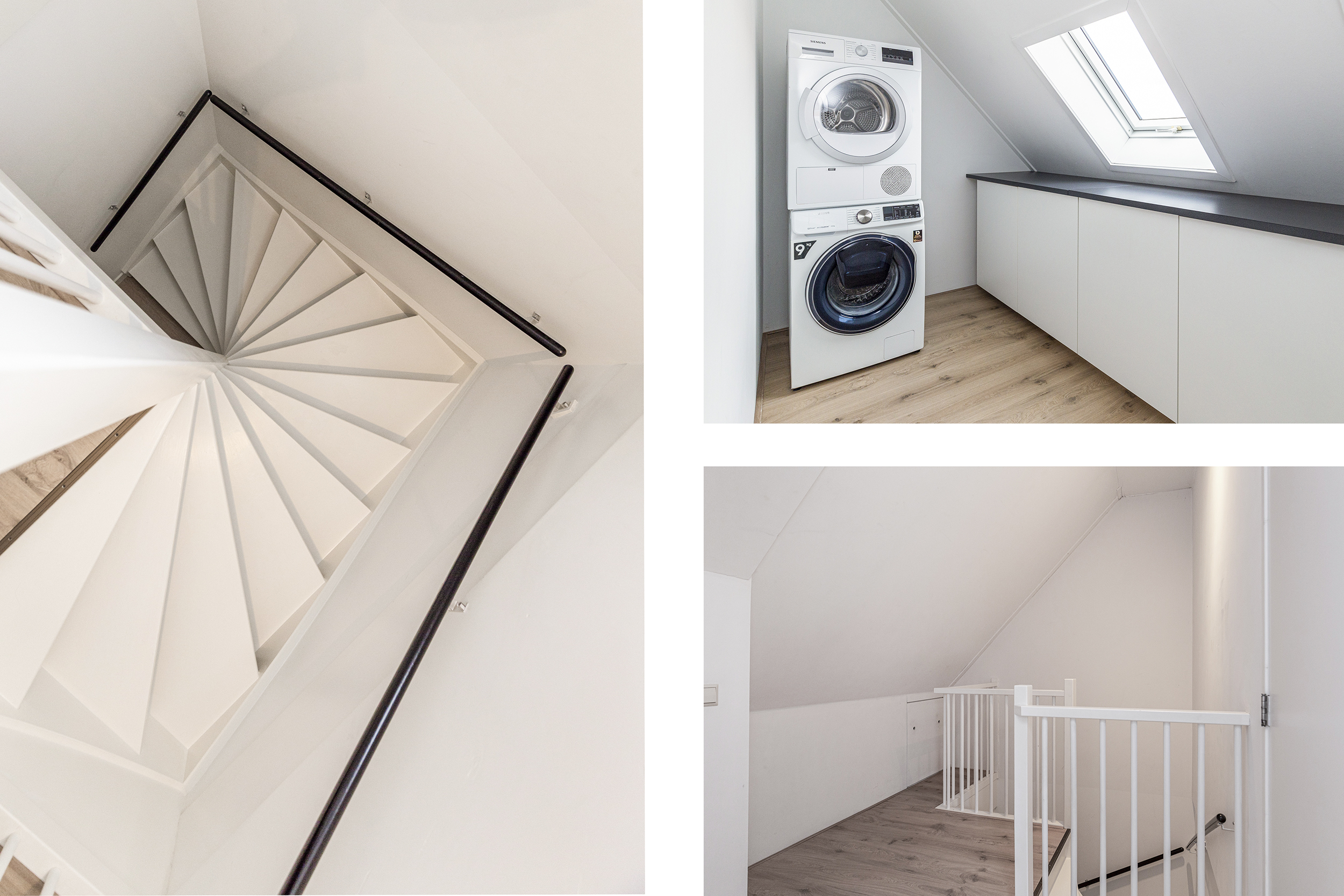 Ruime overloop met toegang tot de wasruimte met dakraam en opstelplaats voor mechanische ventilatie. Vierde slaapkamer met dakramen en eigen wastafel. Achter de knieschotten is extra bergruimte aanwezig.