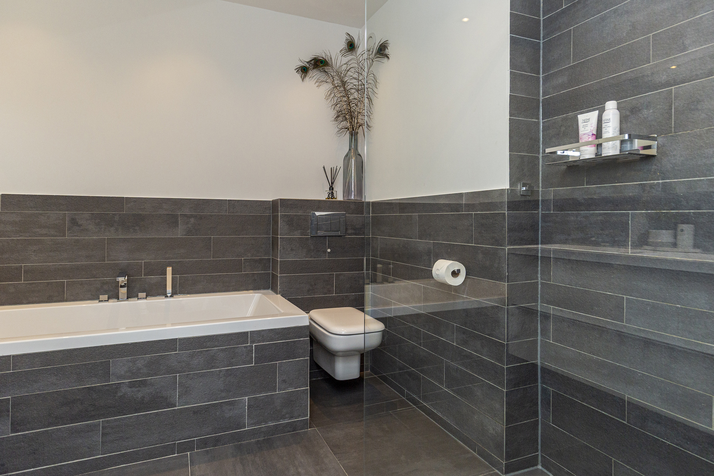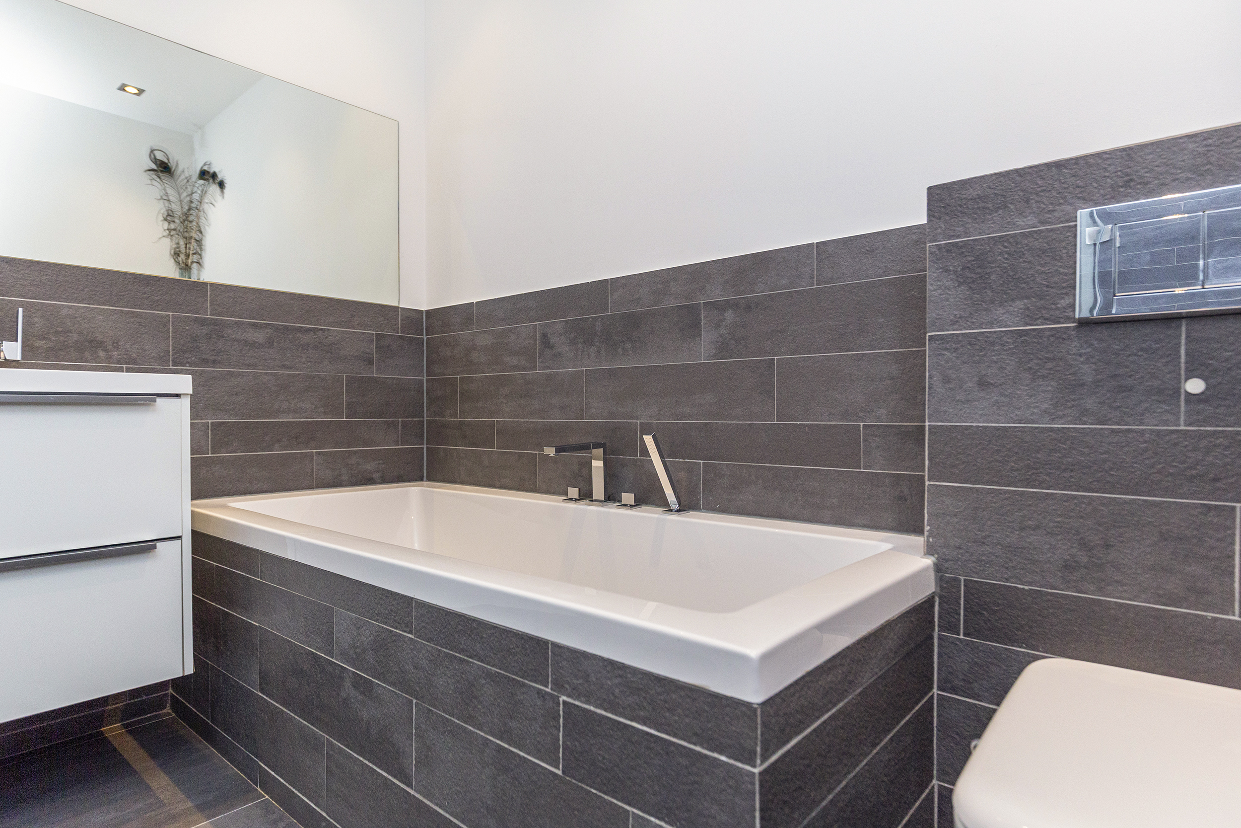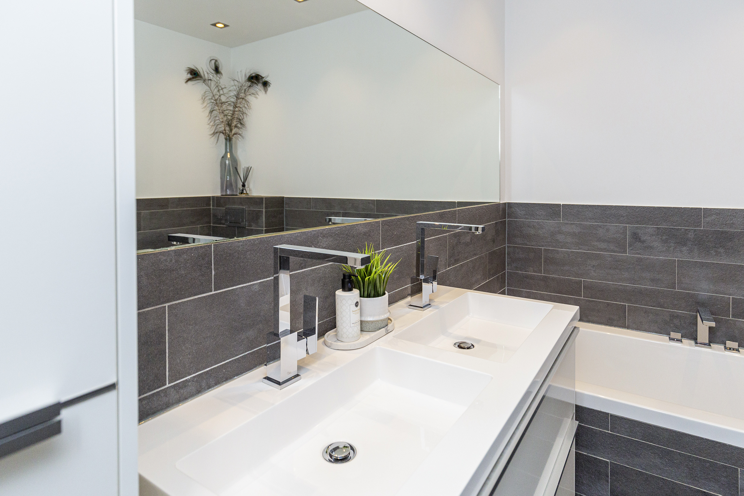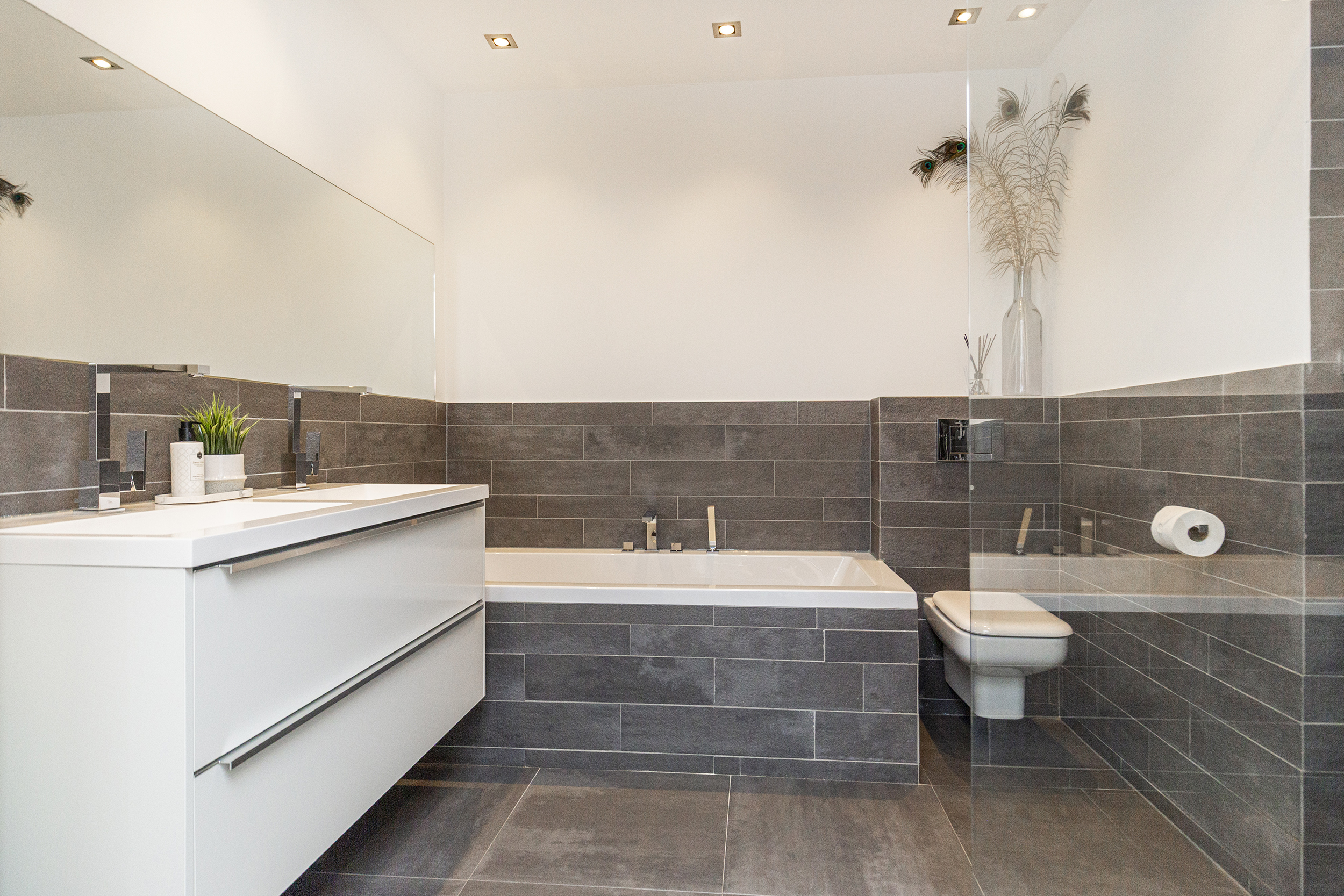 - Badkamervoorzieningen Ligbad, toilet, dubbele wastafel, wastafelmeubel, inloopdouche