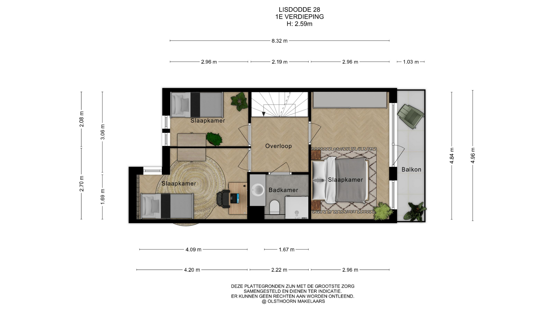 Op de eerste verdieping vind je drie ruime slaapkamers en de badkamer. De grote slaapkamer aan de achterzijde heeft toegang tot een balkon. De badkamer is voorzien van een inloopdouche, een tweede toilet en een badkamermeubel. De andere twee slaapkamers aan de voorzijde zijn ook ruim en kunnen naar wens worden ingericht, bijvoorbeeld als extra slaapkamer of werkruimte.