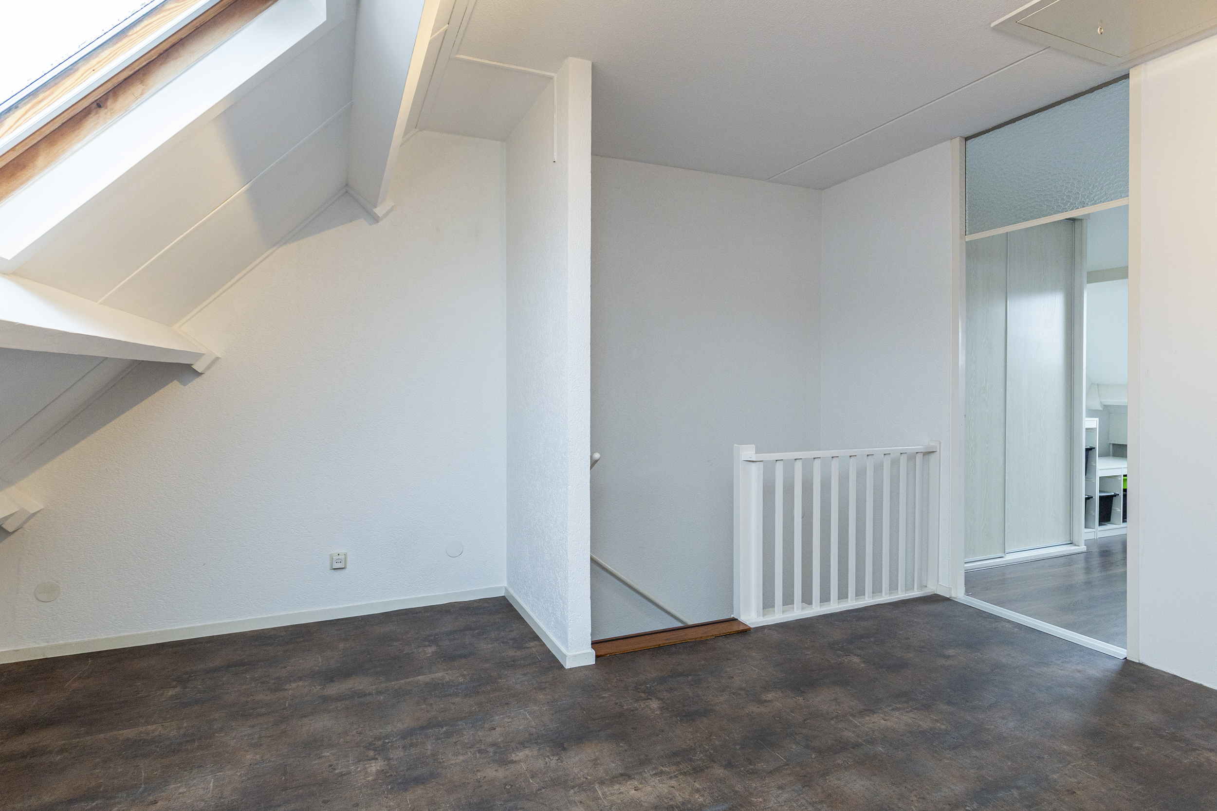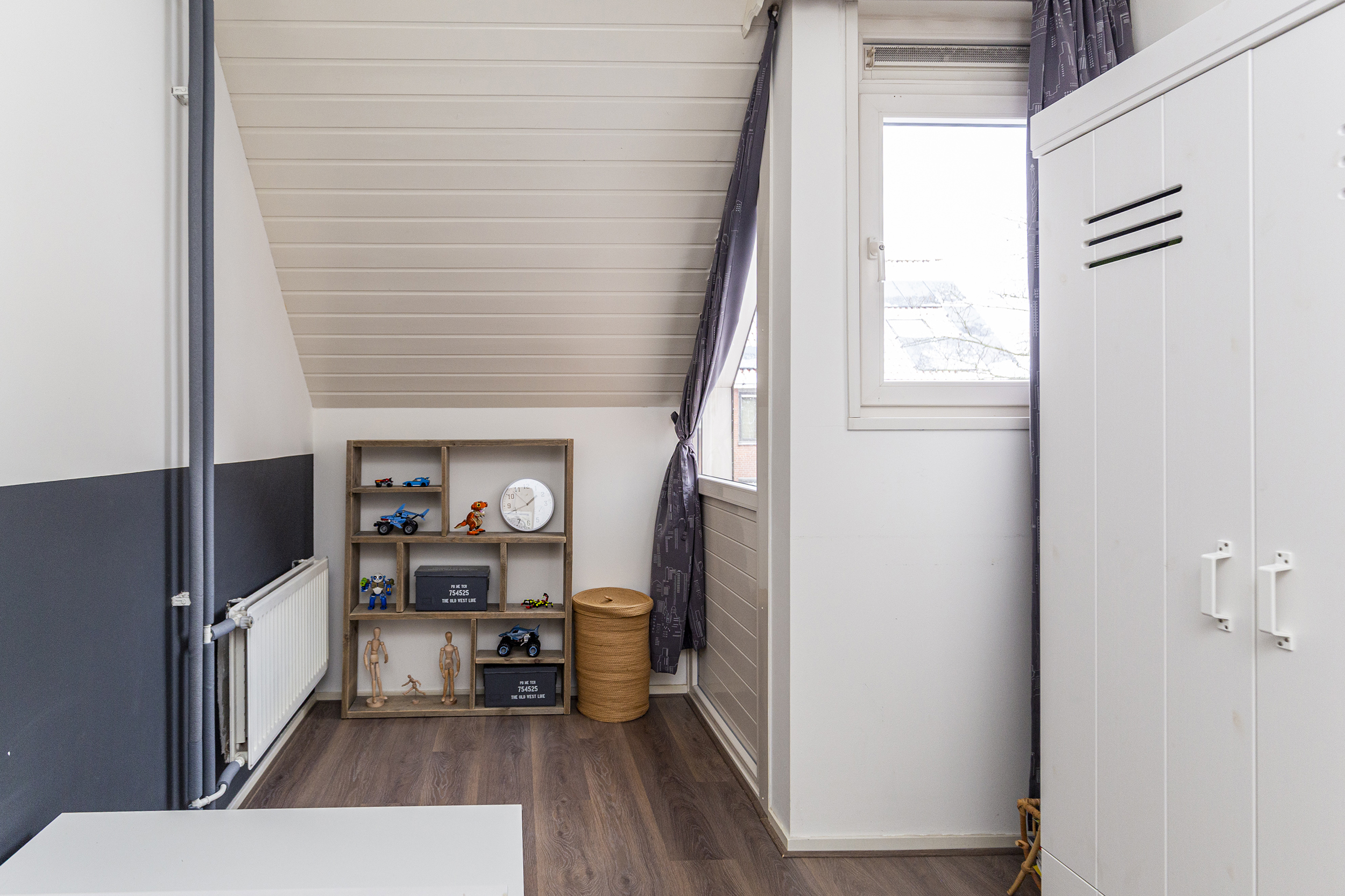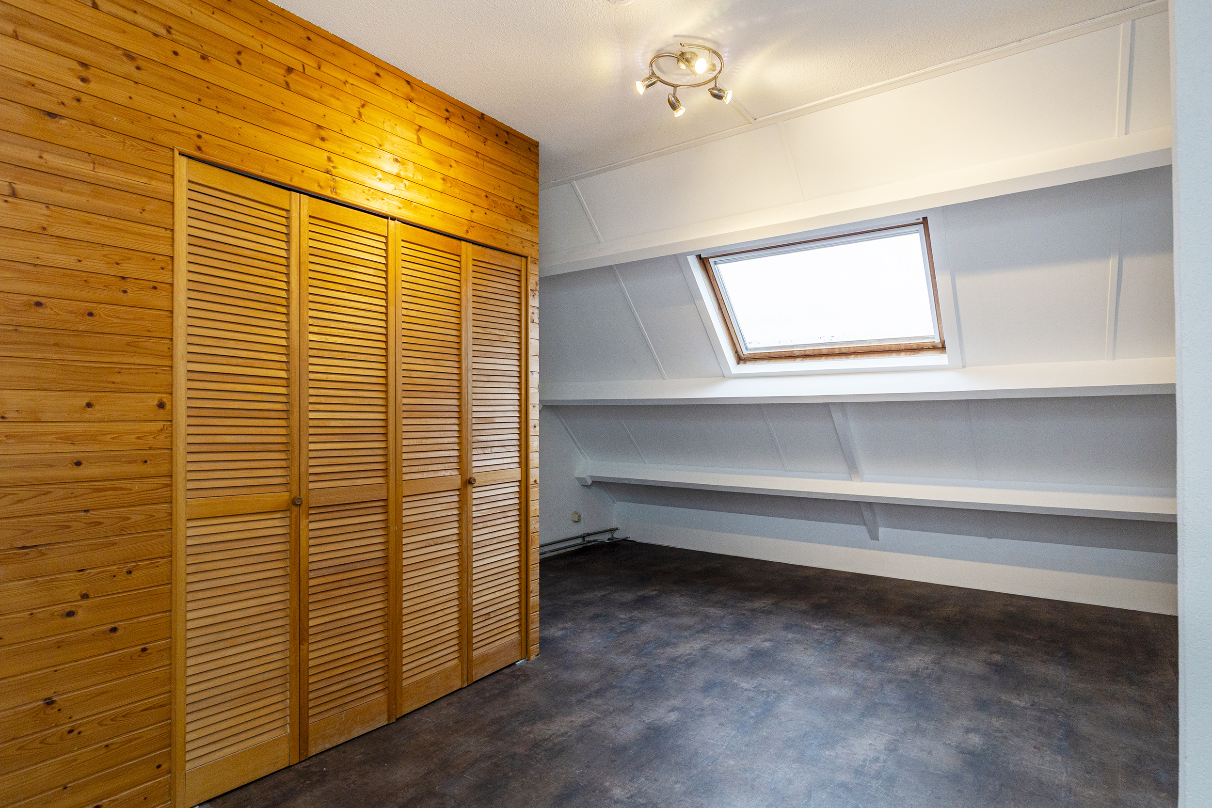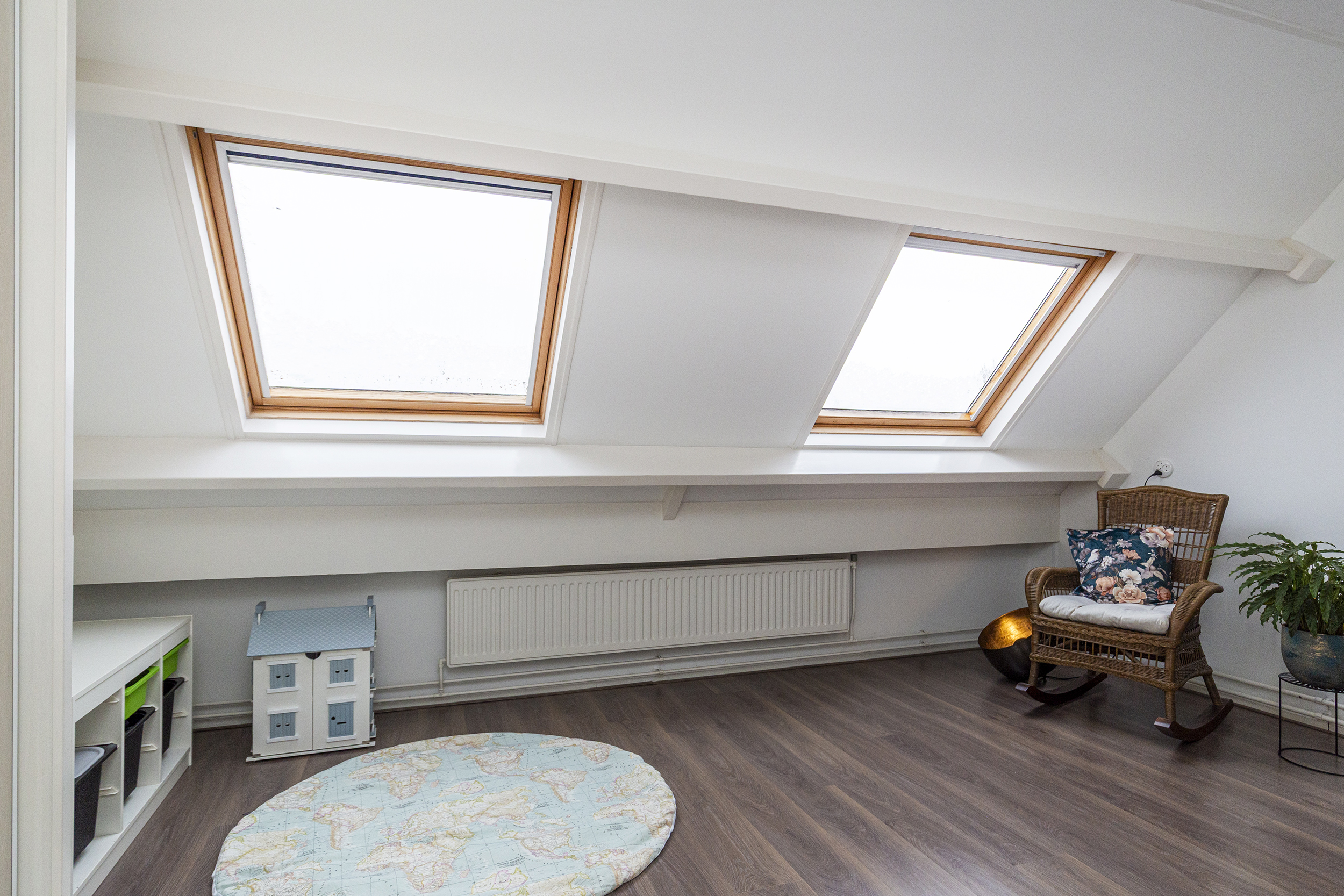 De tweede verdieping beschikt over een grote overloop met berging, waar de wasmachine en droger kunnen worden geplaatst. Tevens bevindt zich hier een technische ruimte waar de aansluitingen van de c.v.-combiketel en de opstelplaats van de mechanische ventilatie unit zijn geïnstalleerd. Vanaf de overloop is de bergvliering bereikbaar middels een vlizotrap. De vierde slaapkamer, gelegen aan de achterzijde van de woning, is voorzien van een wastafel, twee Velux dakramen die zorgen voor veel natuurlijk licht, en een ingebouwde kast, wat de kamer extra functionaliteit en comfort biedt.