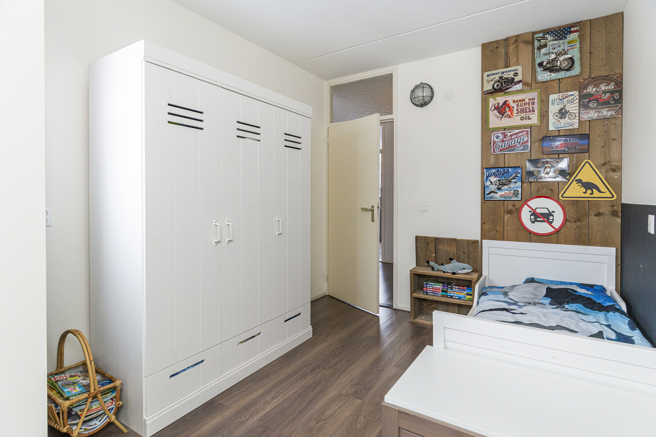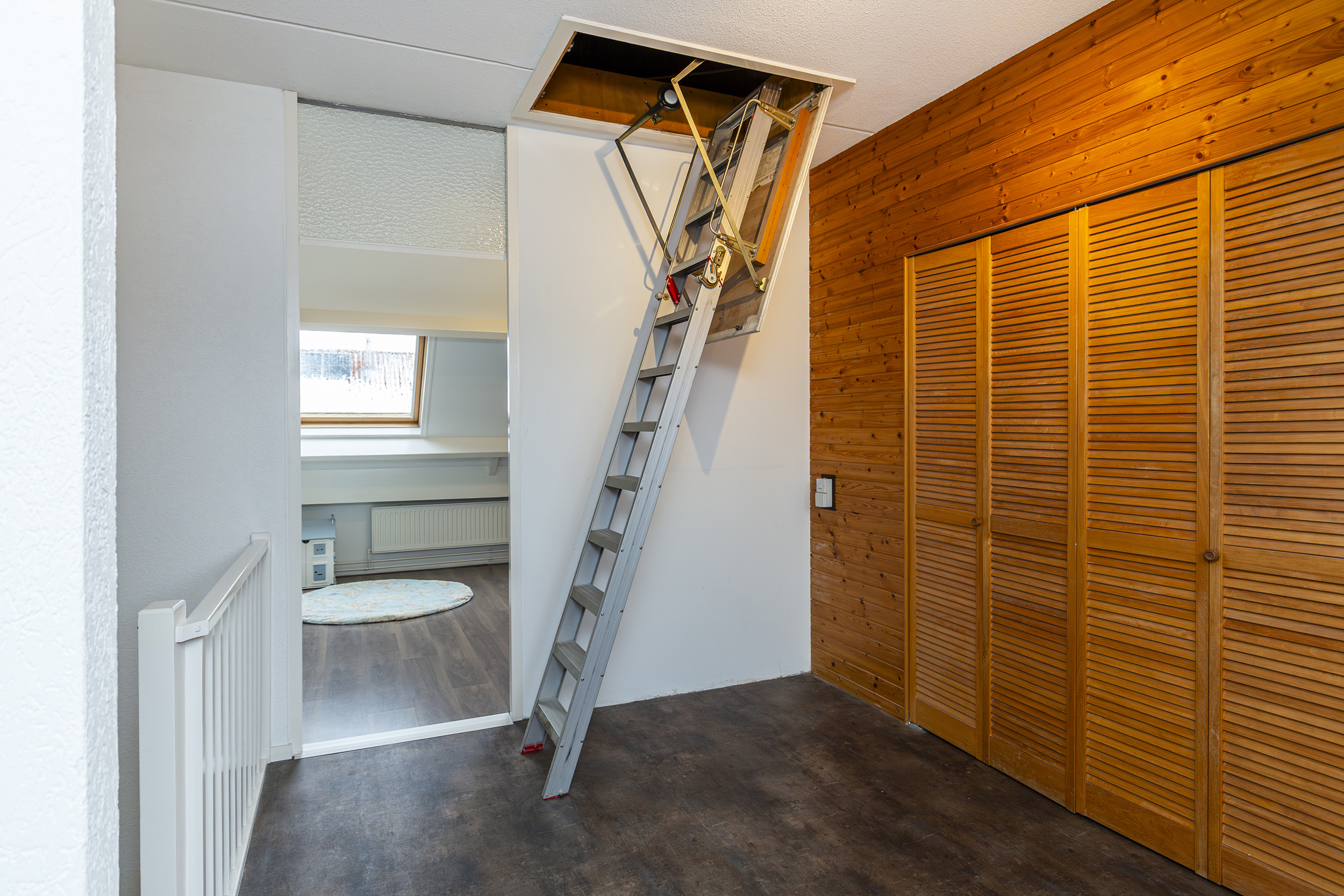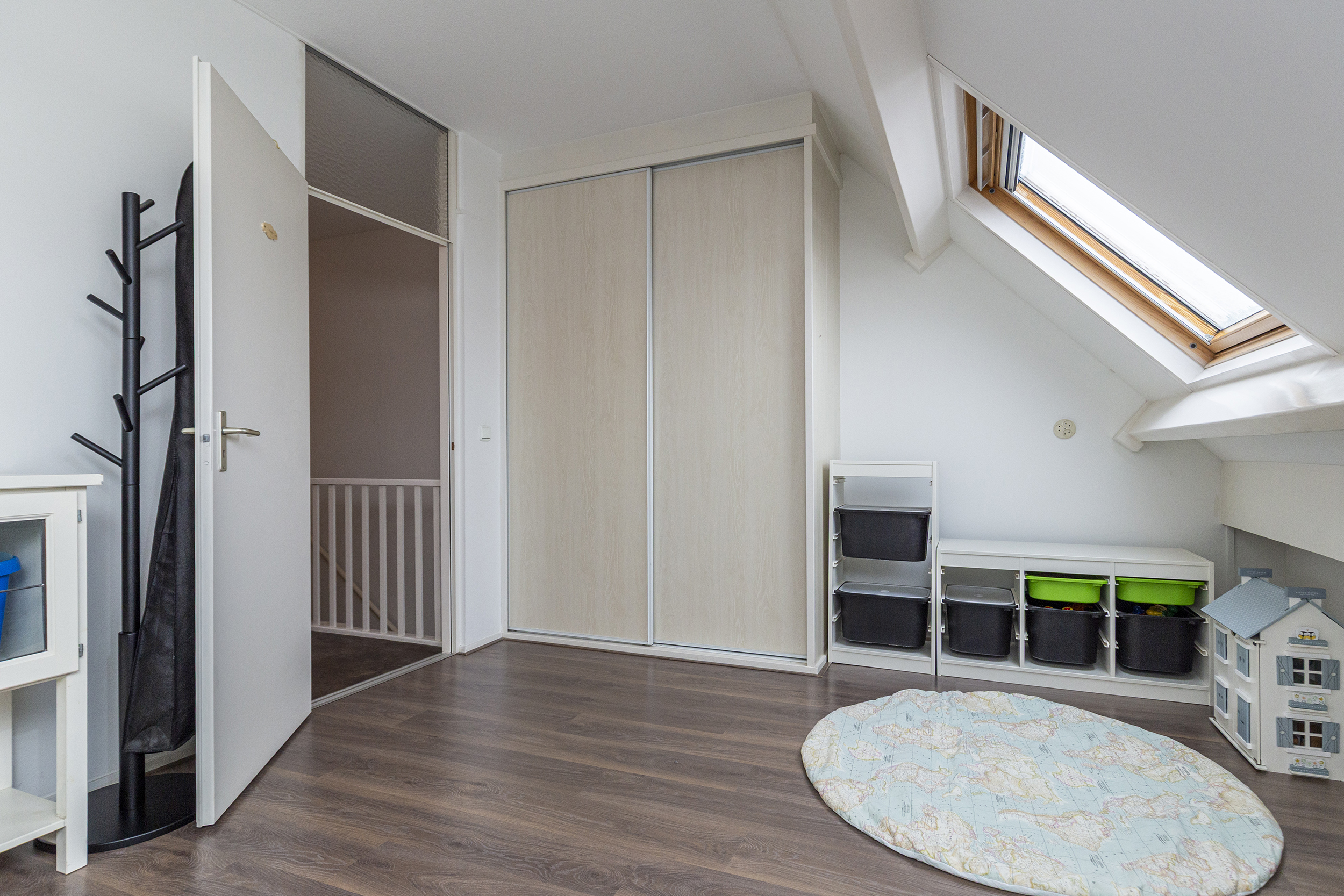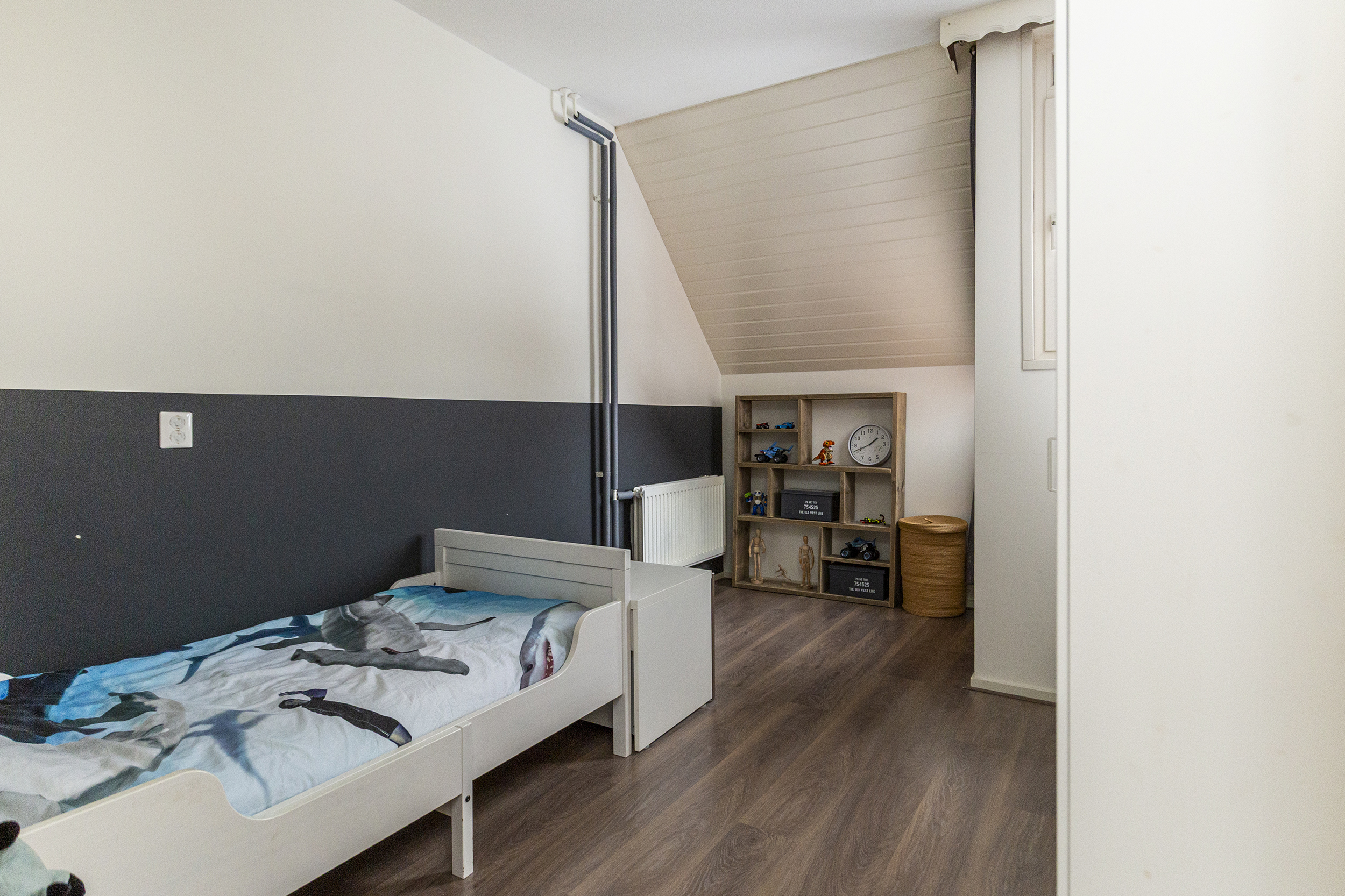 De tweede verdieping beschikt over een grote overloop met berging, waar de wasmachine en droger kunnen worden geplaatst. Tevens bevindt zich hier een technische ruimte waar de aansluitingen van de c.v.-combiketel en de opstelplaats van de mechanische ventilatie unit zijn geïnstalleerd. Vanaf de overloop is de bergvliering bereikbaar middels een vlizotrap. De vierde slaapkamer, gelegen aan de achterzijde van de woning, is voorzien van een wastafel, twee Velux dakramen die zorgen voor veel natuurlijk licht, en een ingebouwde kast, wat de kamer extra functionaliteit en comfort biedt.