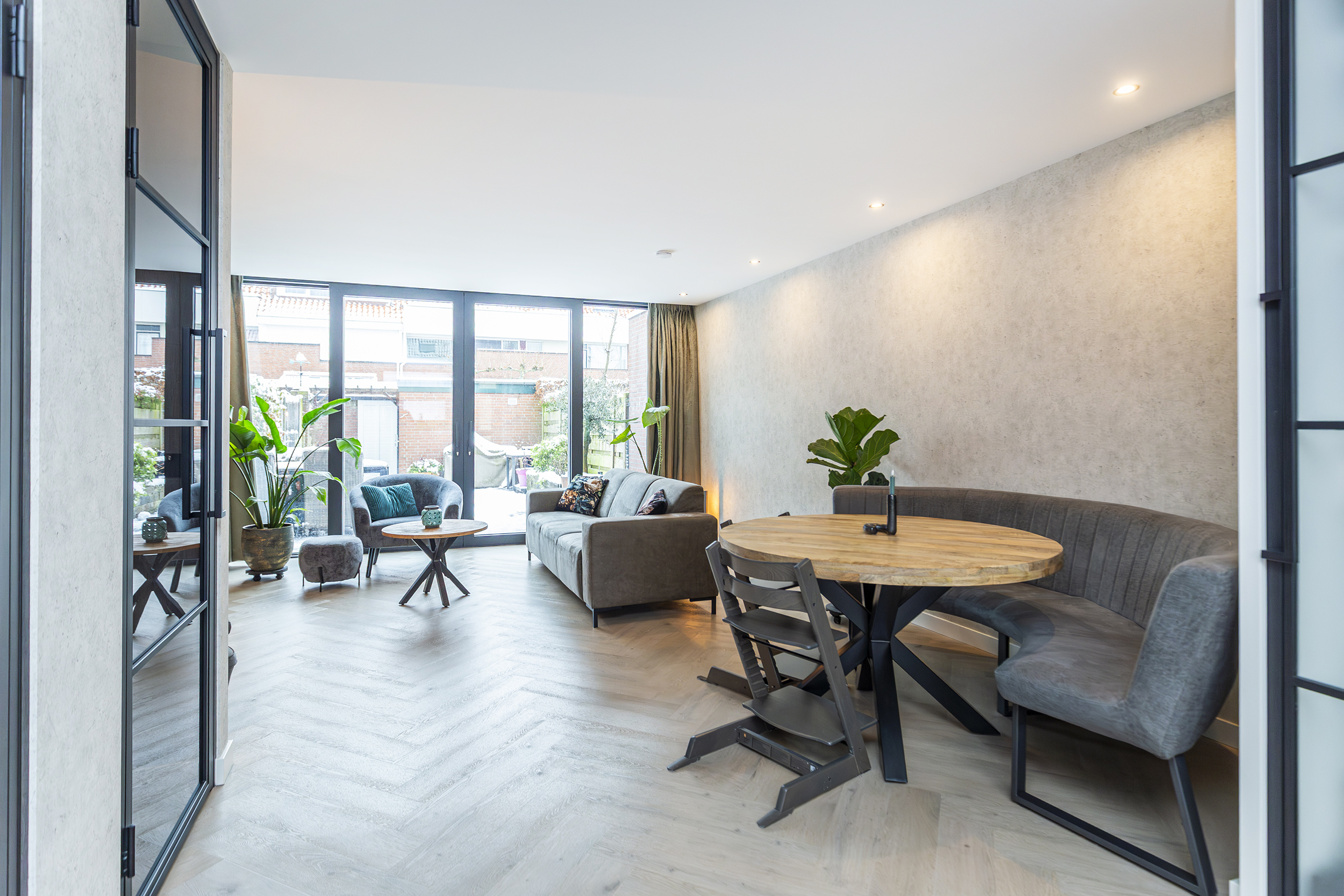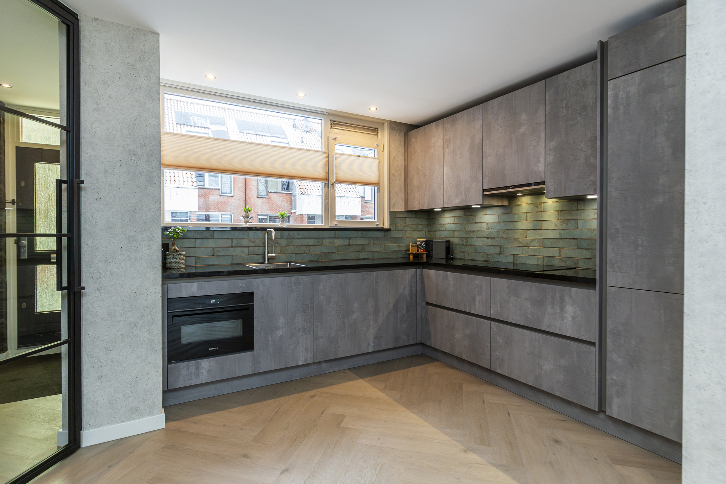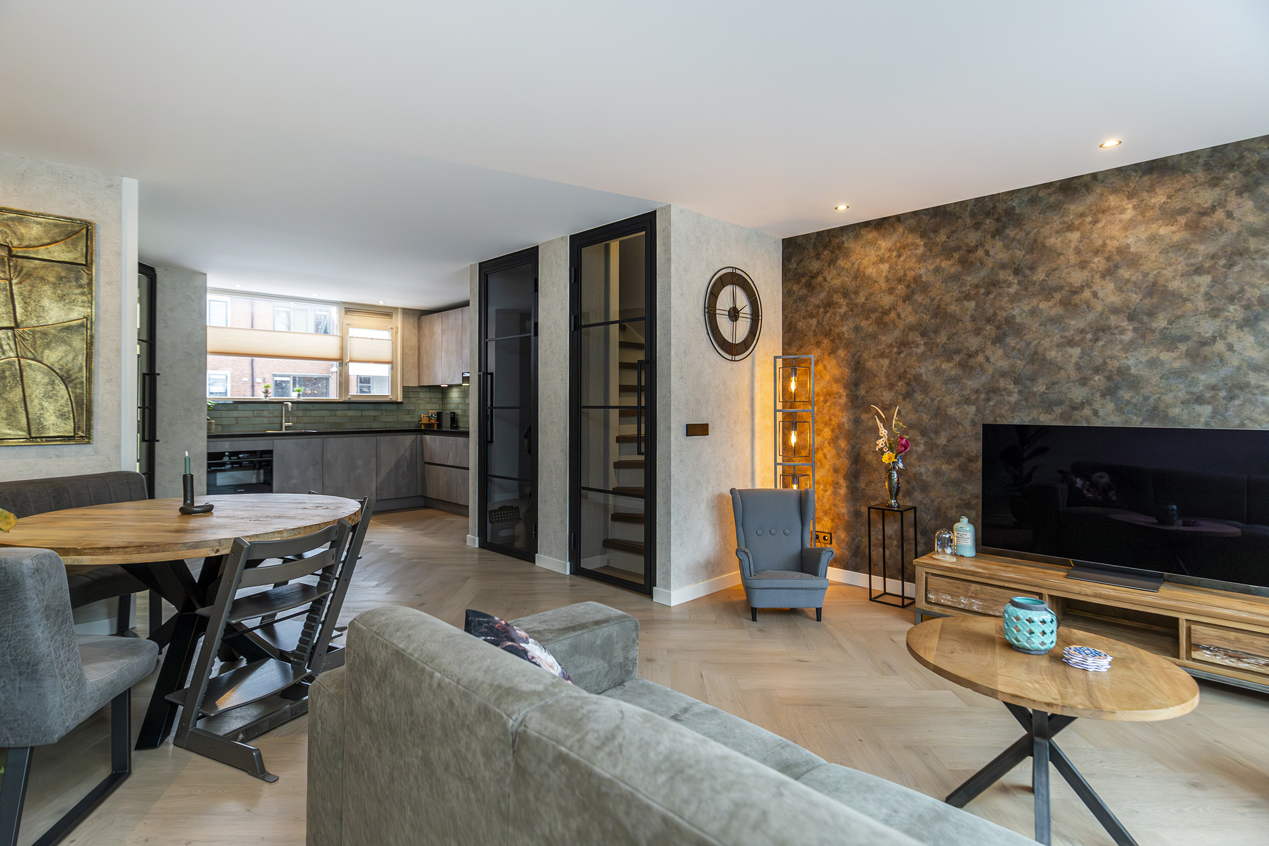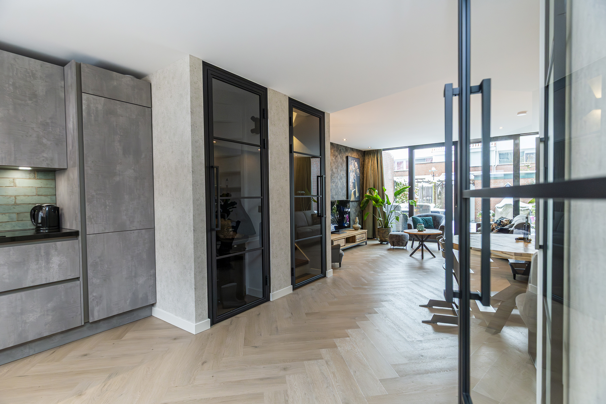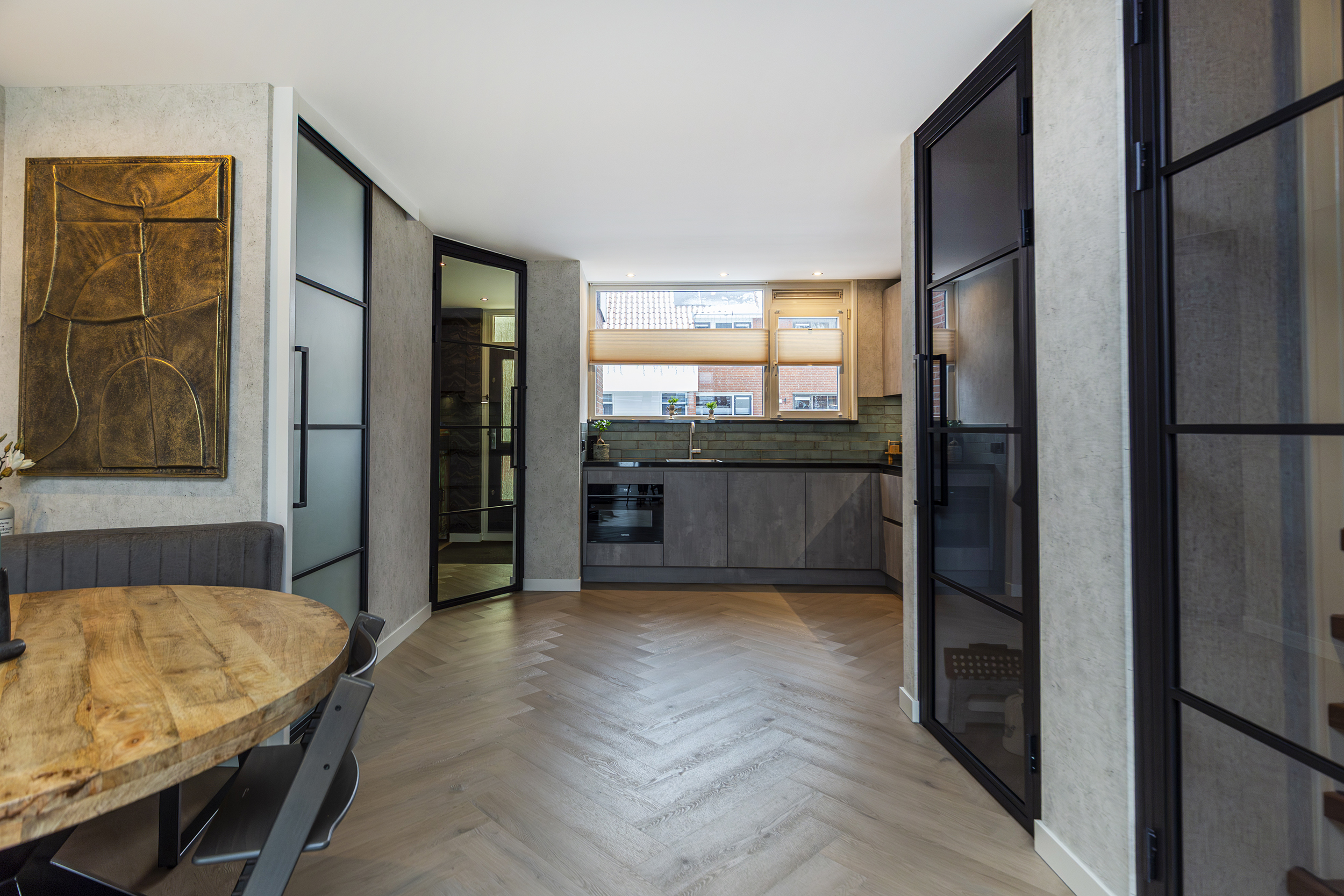 De begane grond van deze woning is in het najaar van 2024 grondig gerenoveerd en voorzien van hoogwaardige afwerkingen. De nieuwe, moderne keuken is uitgerust met inbouwapparatuur en biedt veel werkruimte. Verder is de vloer op de begane grond vervangen door een prachtige PVC vissengraatvloer, die samen met de vloerverwarming zorgt voor zowel luxe als comfort. Alle binnendeuren zijn vervangen door stijlvolle stalen deuren met glas, wat een industriële uitstraling geeft aan de ruimte. Het verlaagde plafond is voorzien van ingebouwde spots, wat zorgt voor een strakke, moderne sfeer. De grote glazen achterpui met triple glas en aluminium kozijnen biedt niet alleen veel daglicht, maar zorgt ook voor minder warmteverlies, wat bijdraagt aan de energiezuinigheid van de woning. Vanuit de lichte woonkamer heb je toegang tot de onderhoudsvriendelijke achtertuin, een fijne plek om te ontspannen. Achterin de tuin staat een praktische berging en is er een achterom. De trap naar de eerste verdieping is toegankelijk via een smaakvolle stalen deur, die de industriële uitstraling van de begane grond verder versterkt.